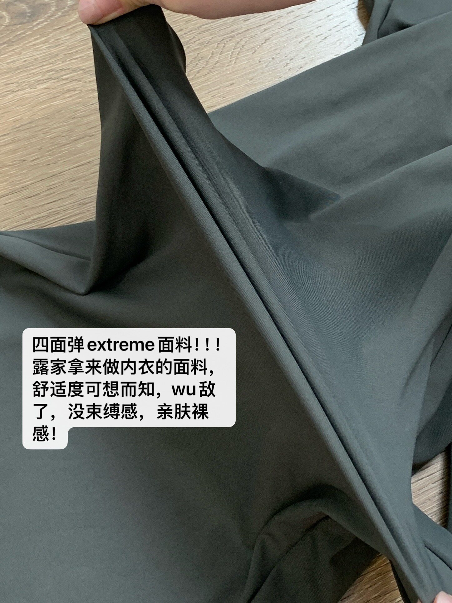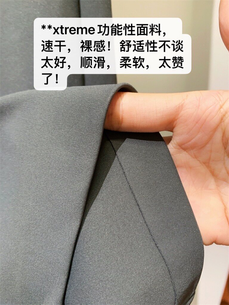 面料特点:柔软四面弹的面料。软,糯,垂,顺。速干、四面弹力、轻薄!4面弹力的LUXTREME面料,比softstreme还好穿还要舒服,触感顺滑,带有四面弹力,同时还添加了Lyvra氨纶,整条裤子没有束缚力,非常非常舒适,无论是横向还是纵向,它的弹性延展性都会比较强大,上身体感舒适无敌。