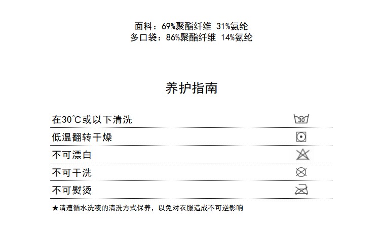 面料洗涤:不可浸泡、不可漂白、低温翻转干燥、不可熨烫、在30℃或以下清洗、不可干洗等