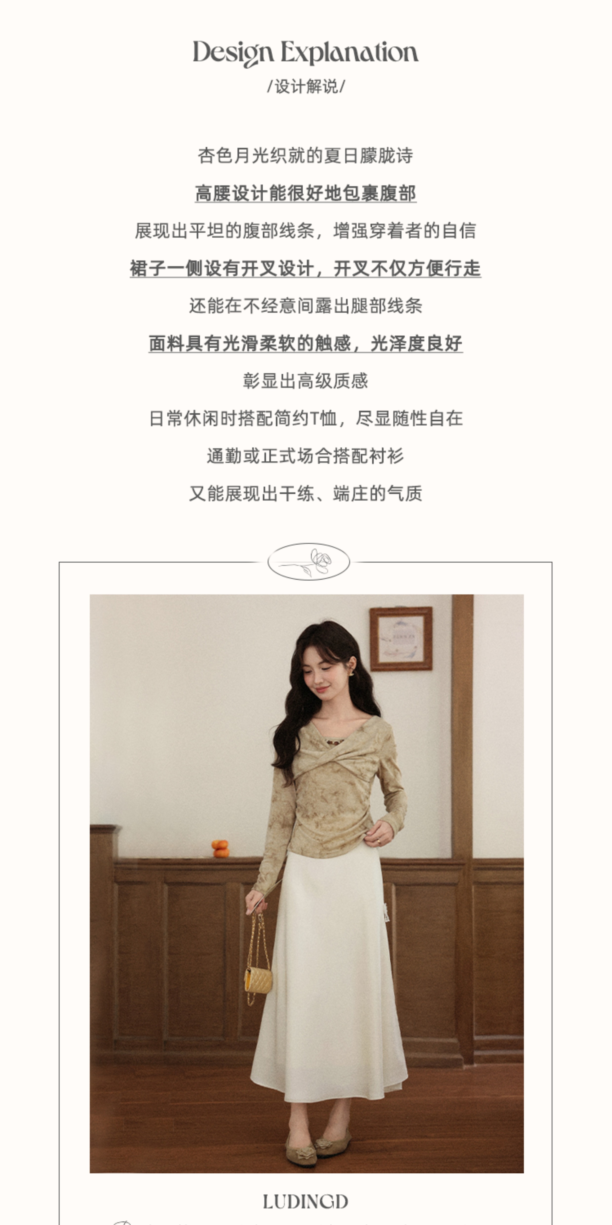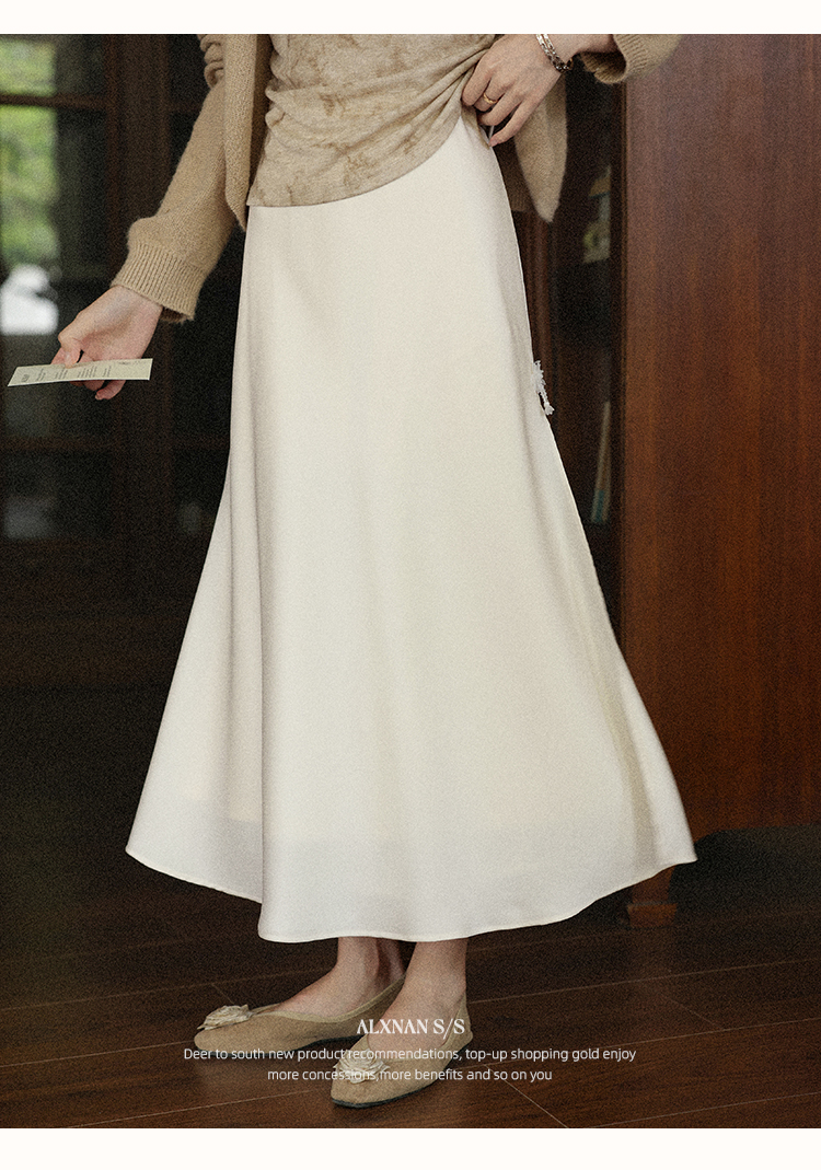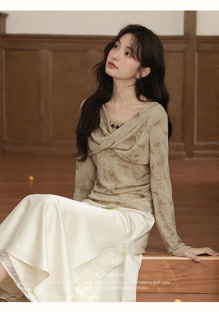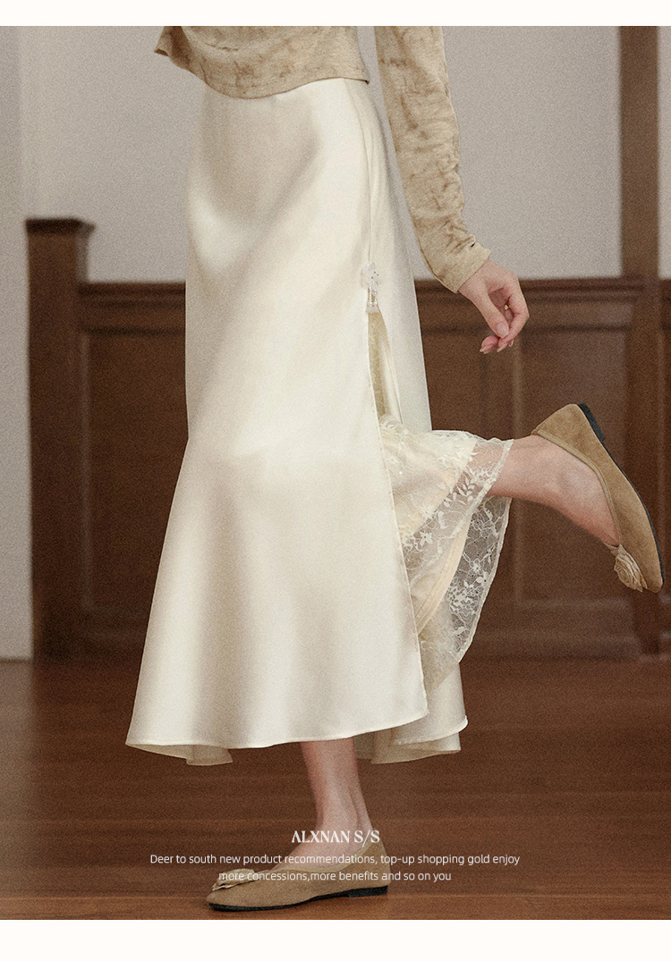 Lu Xiangnan's "Moonlight Dyeing" Apricot-Colored French-Style Skirt for Women, Autumn Satin Skirt with Elegant Lace Splicing