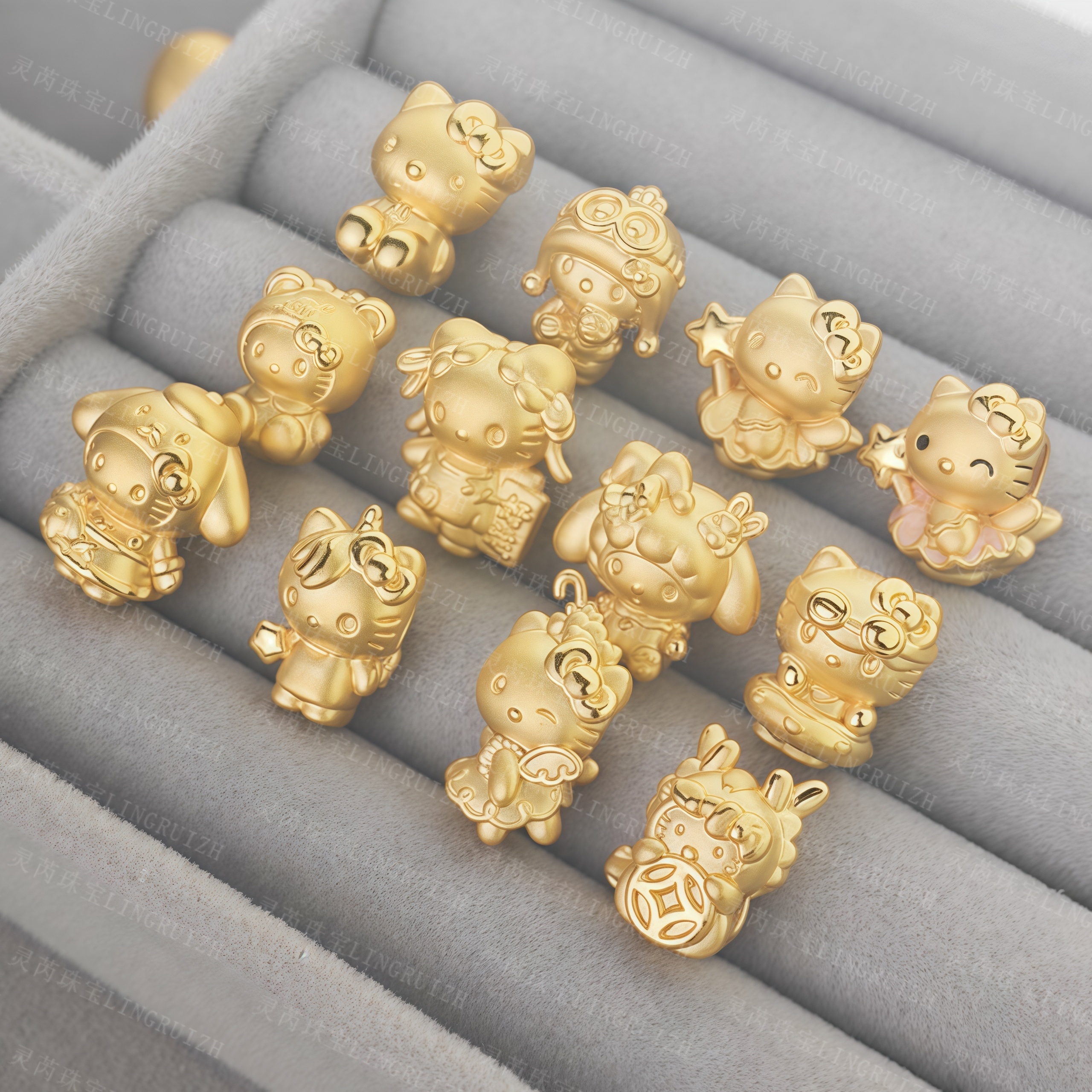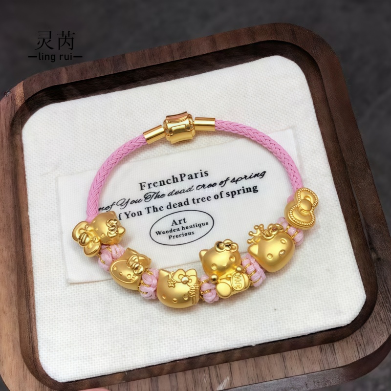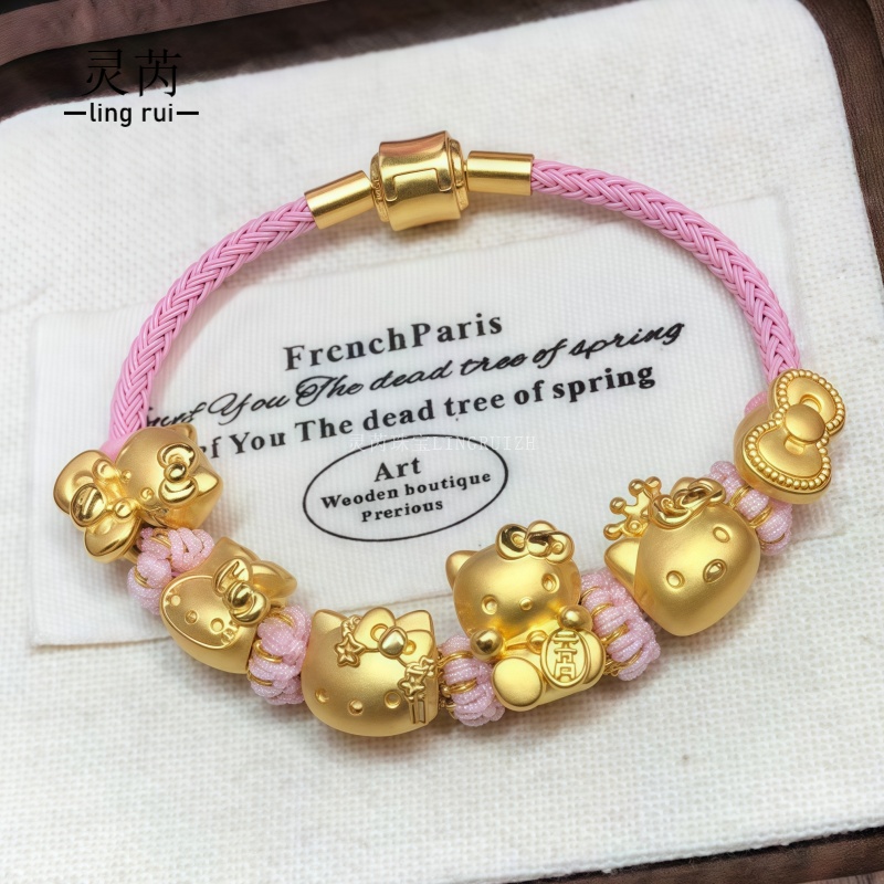Gold 999Kt Hello Kitty Transfer Bead Bracelet Pendant String Bracelet Qixi Birthday Gift for Girlfriend with Bow