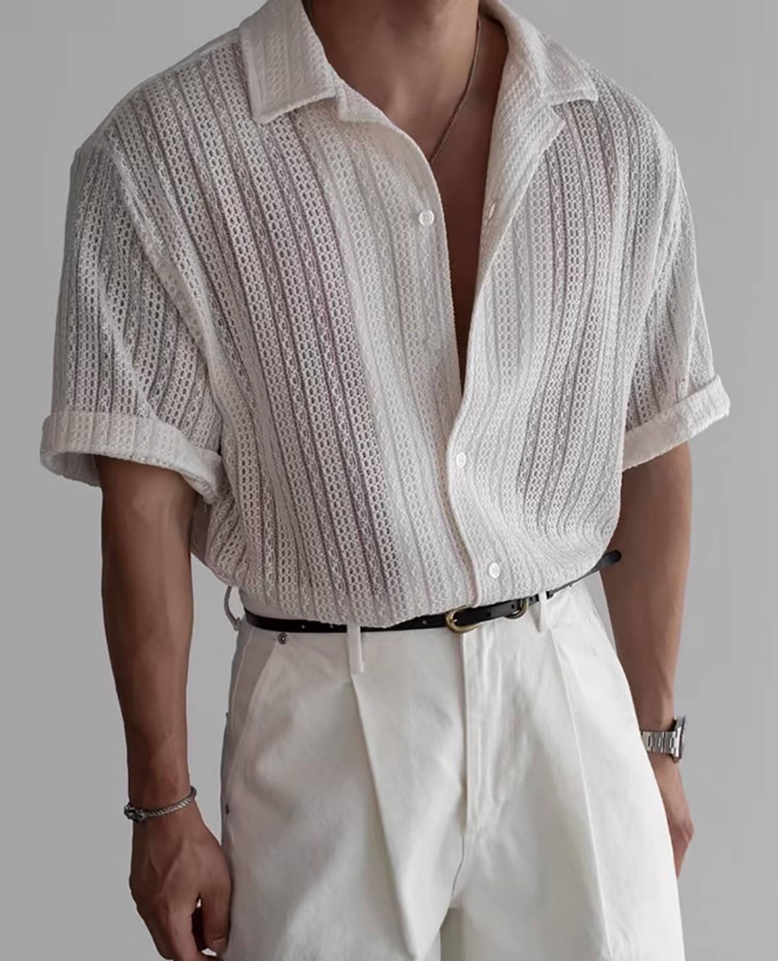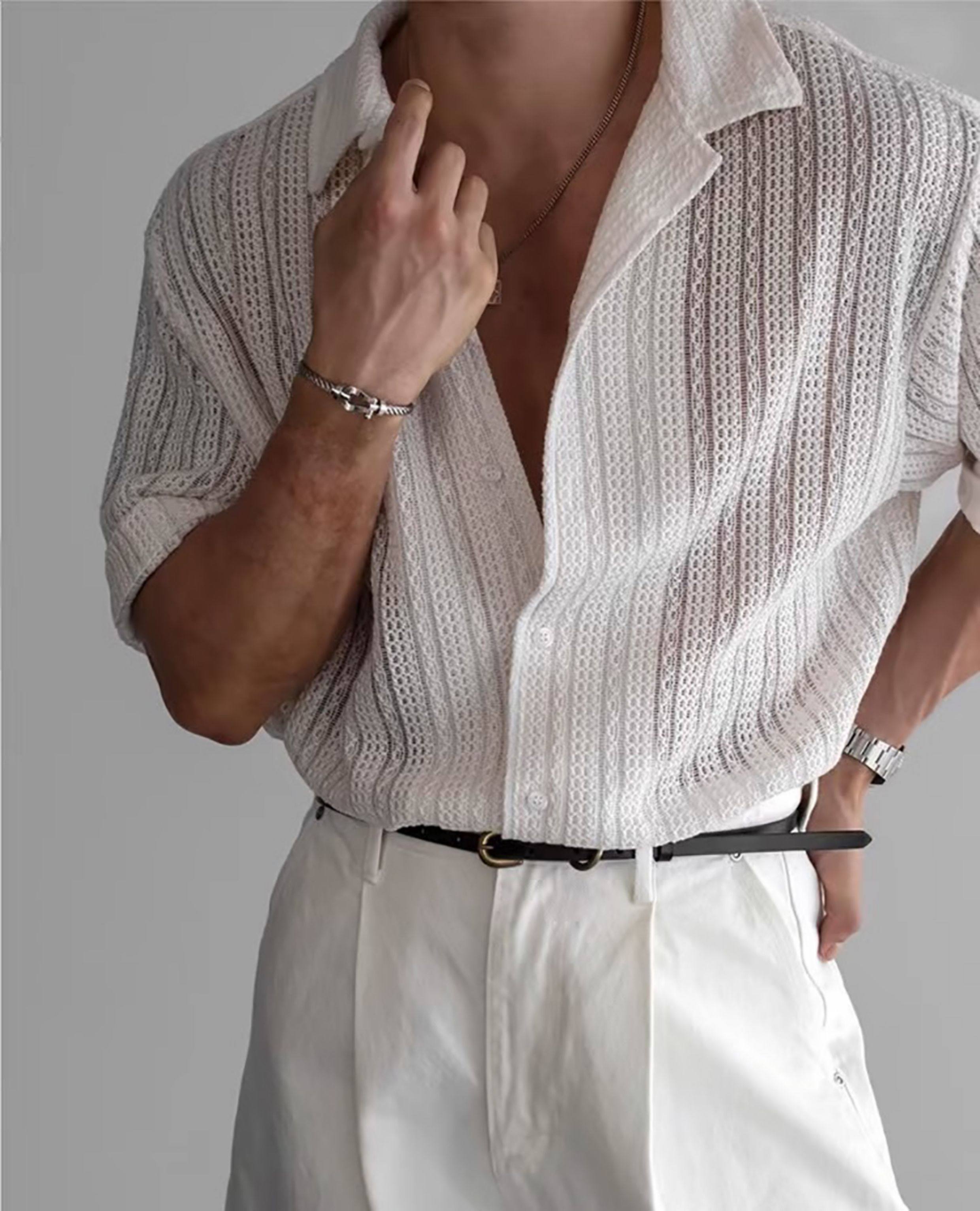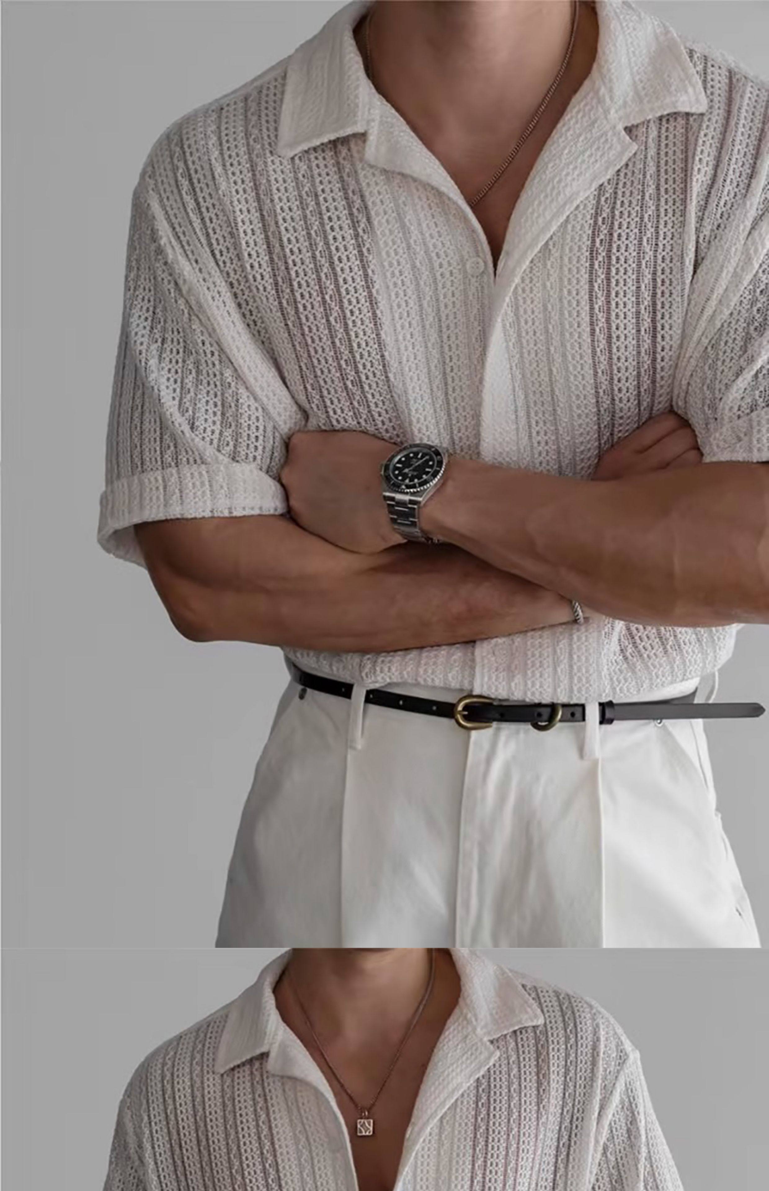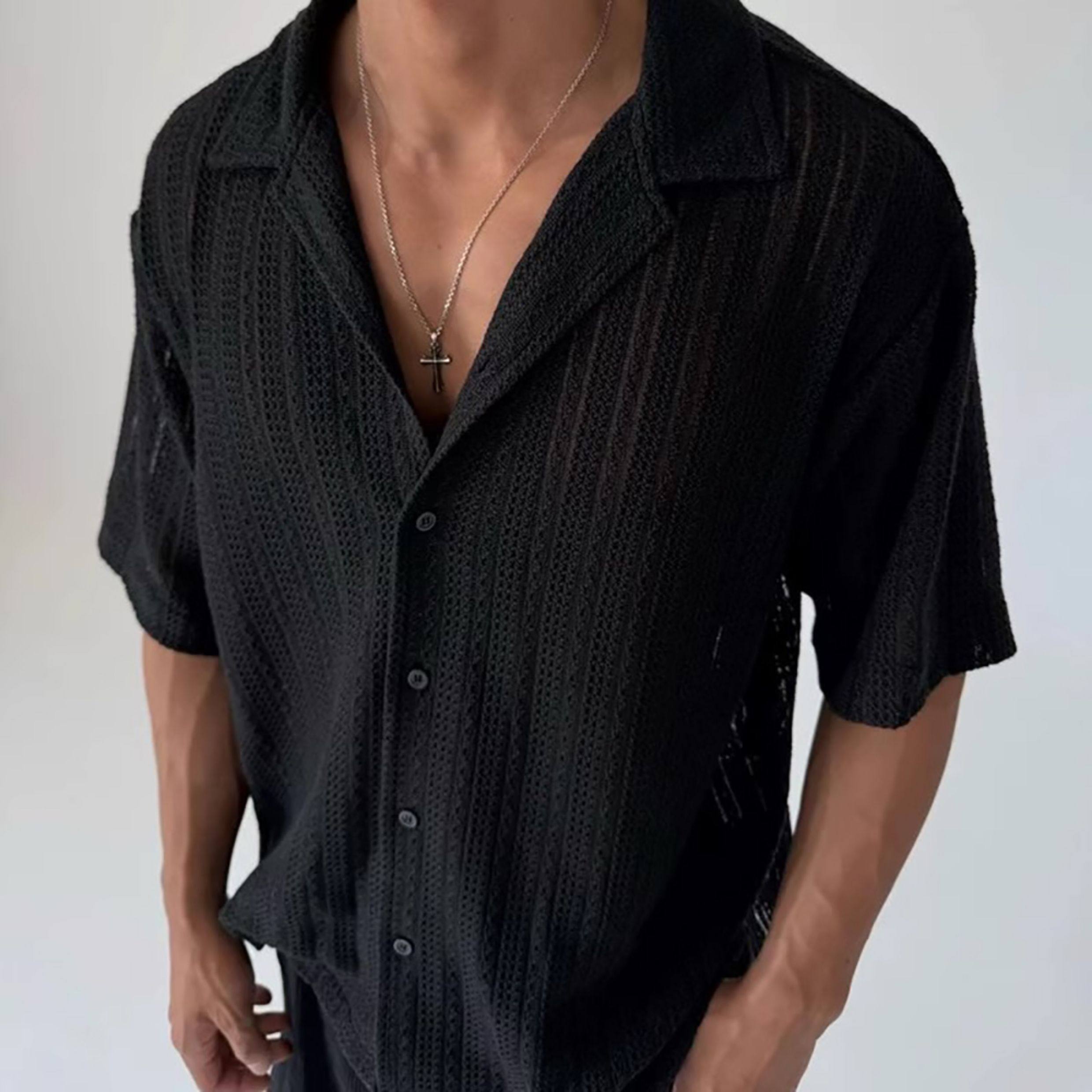 Old Money Style Cuban Collar Hollow Knit Short-Sleeved Shirt for Men, Summer Thin High-End Sun Protection Half-Sleeve Shirt Jacket