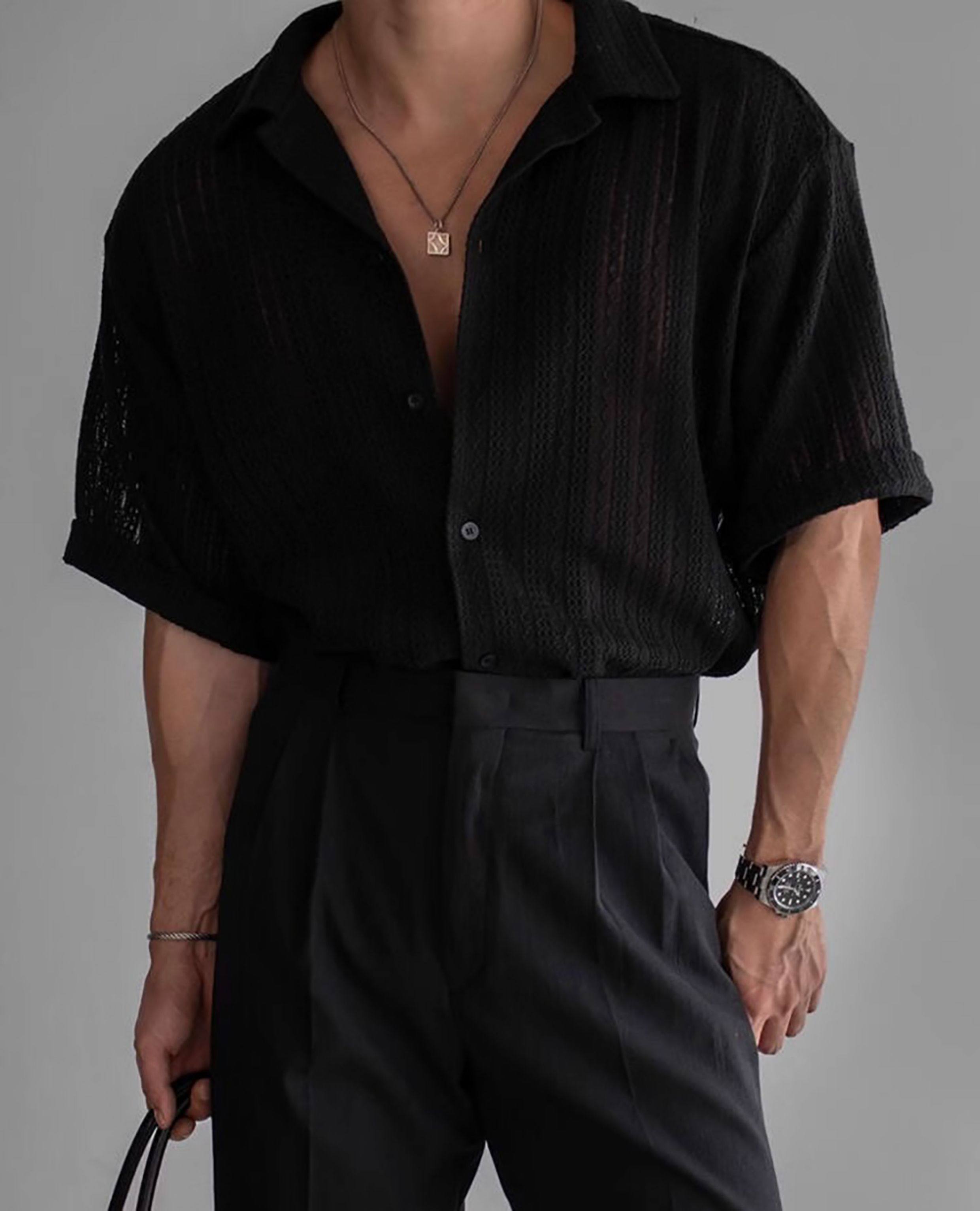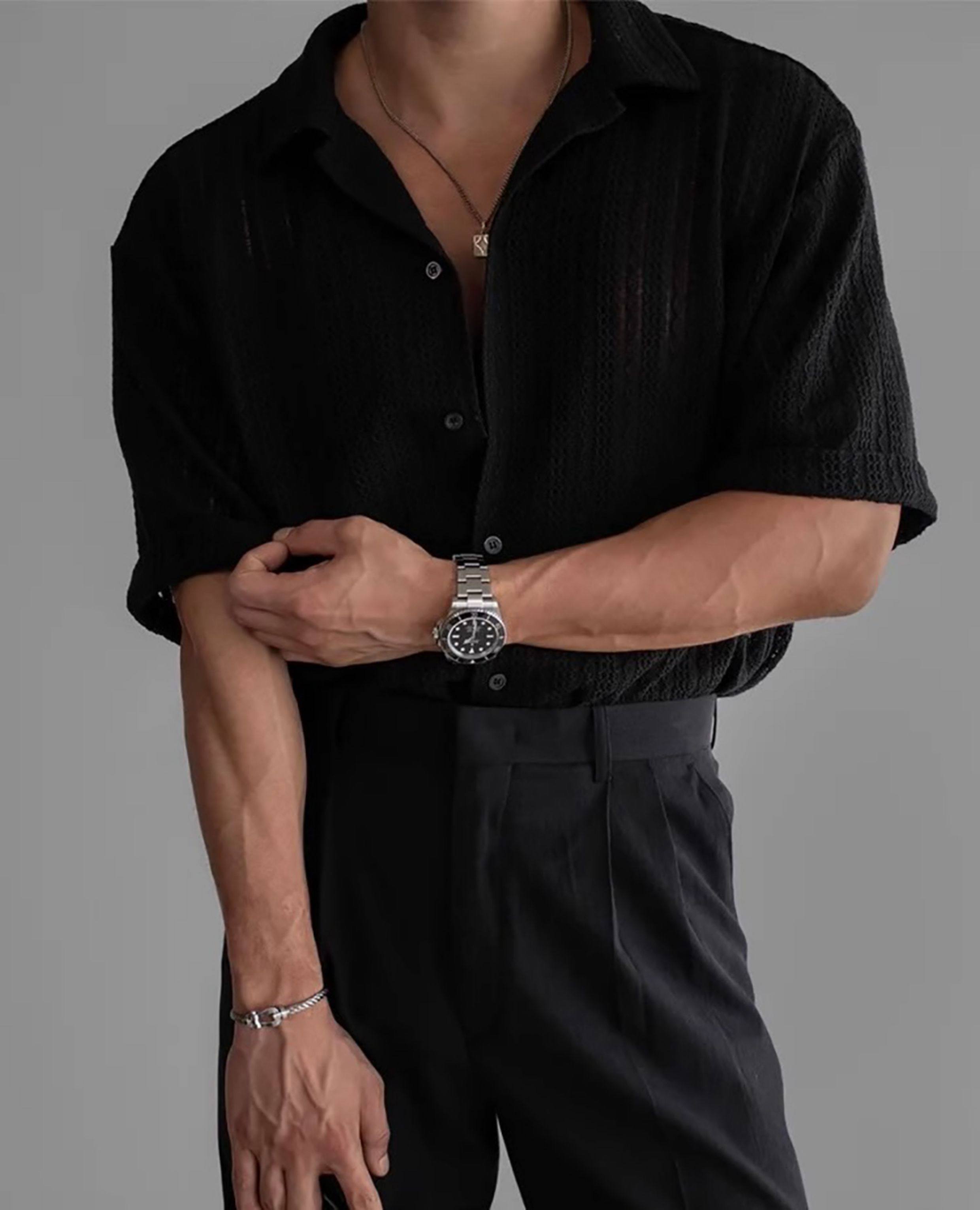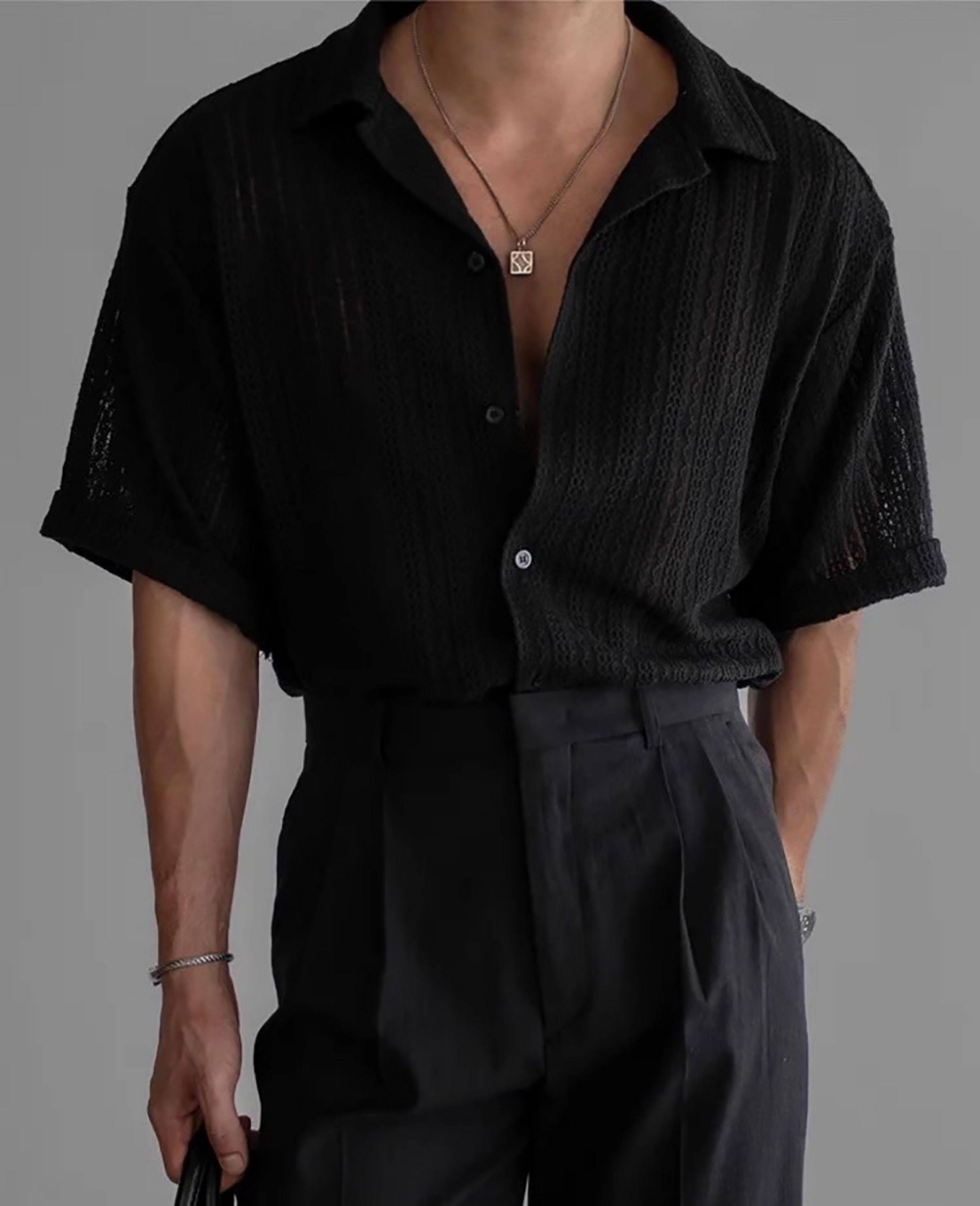 Old Money Style Cuban Collar Hollow Knit Short-Sleeved Shirt for Men, Summer Thin High-End Sun Protection Half-Sleeve Shirt Jacket
