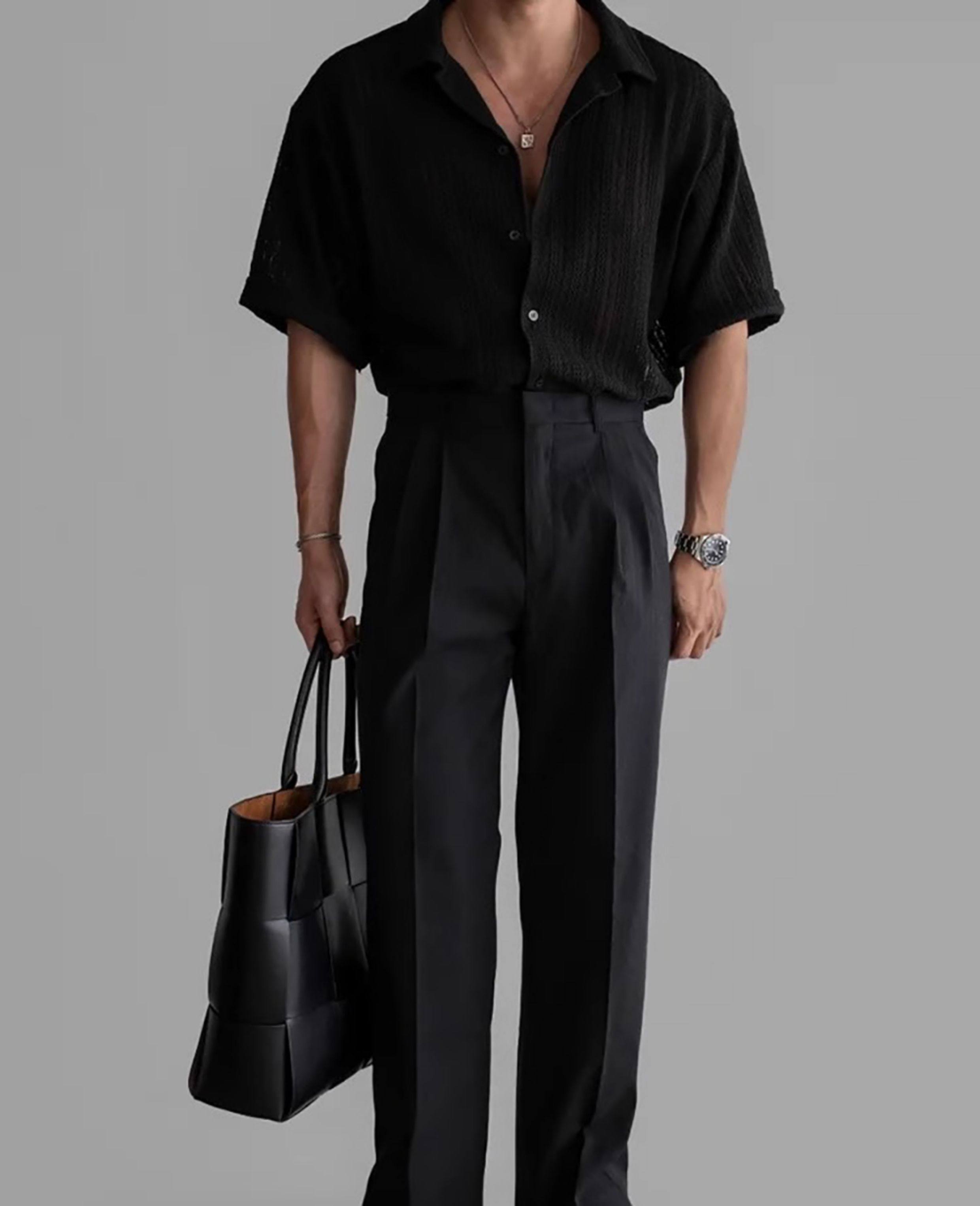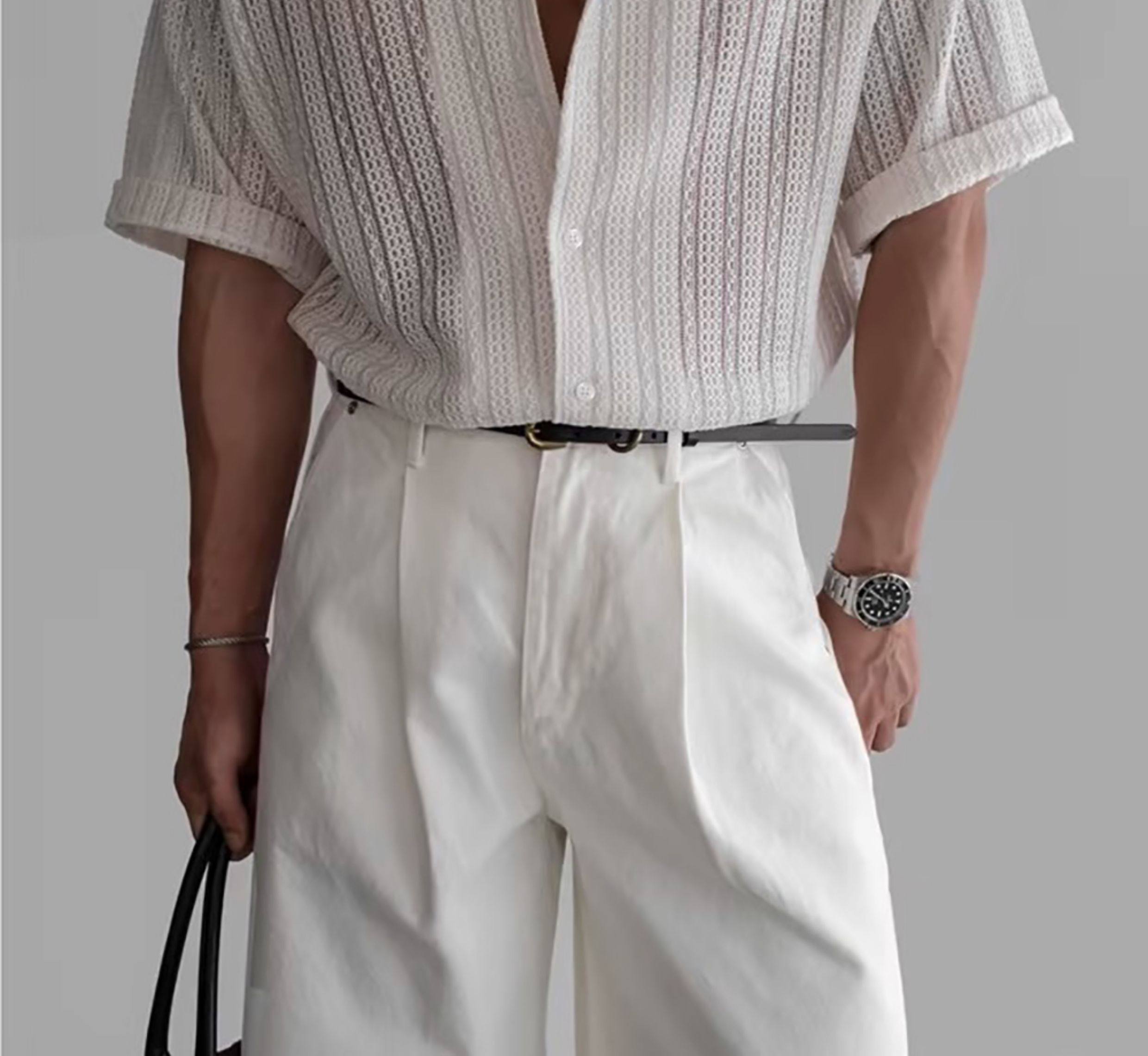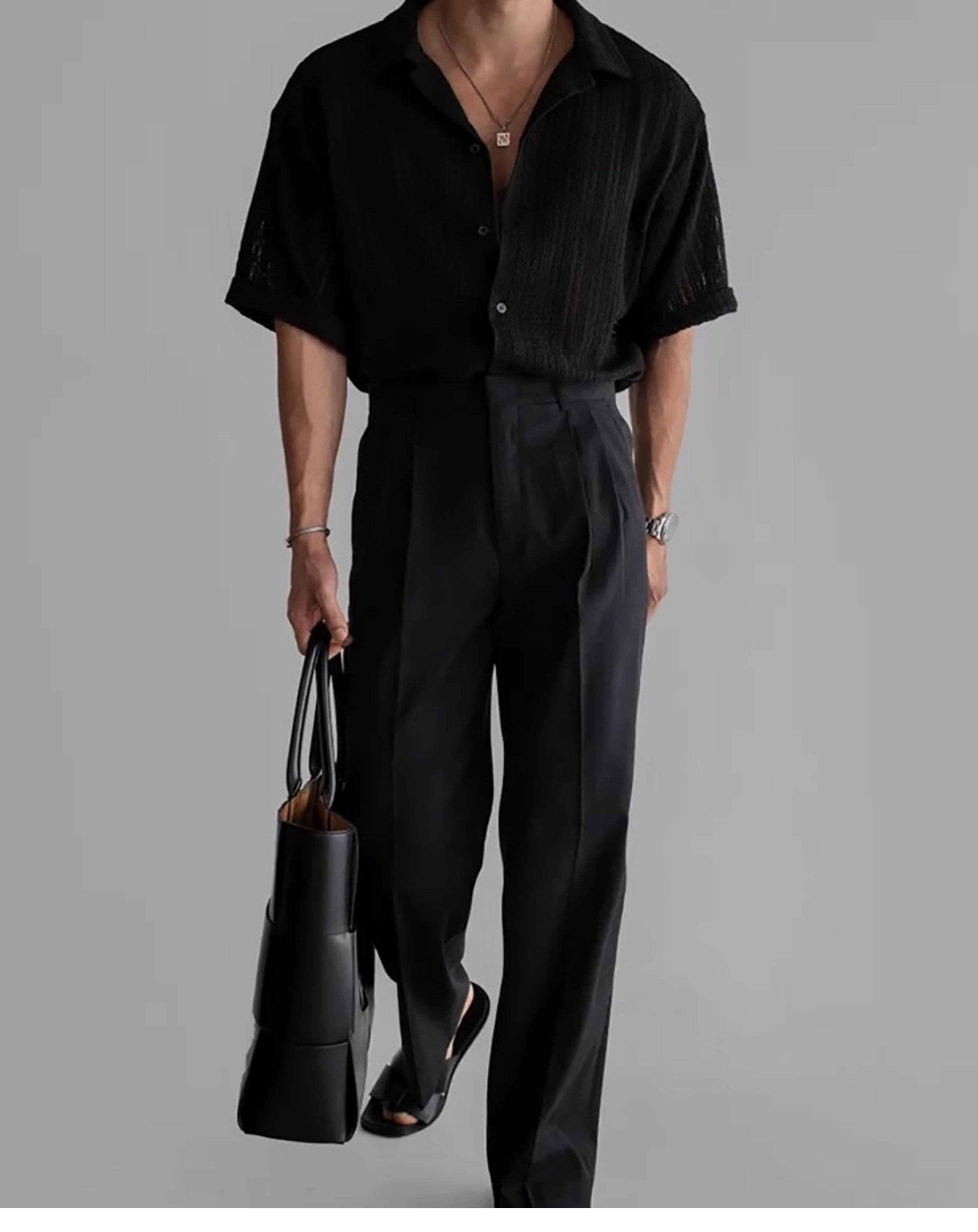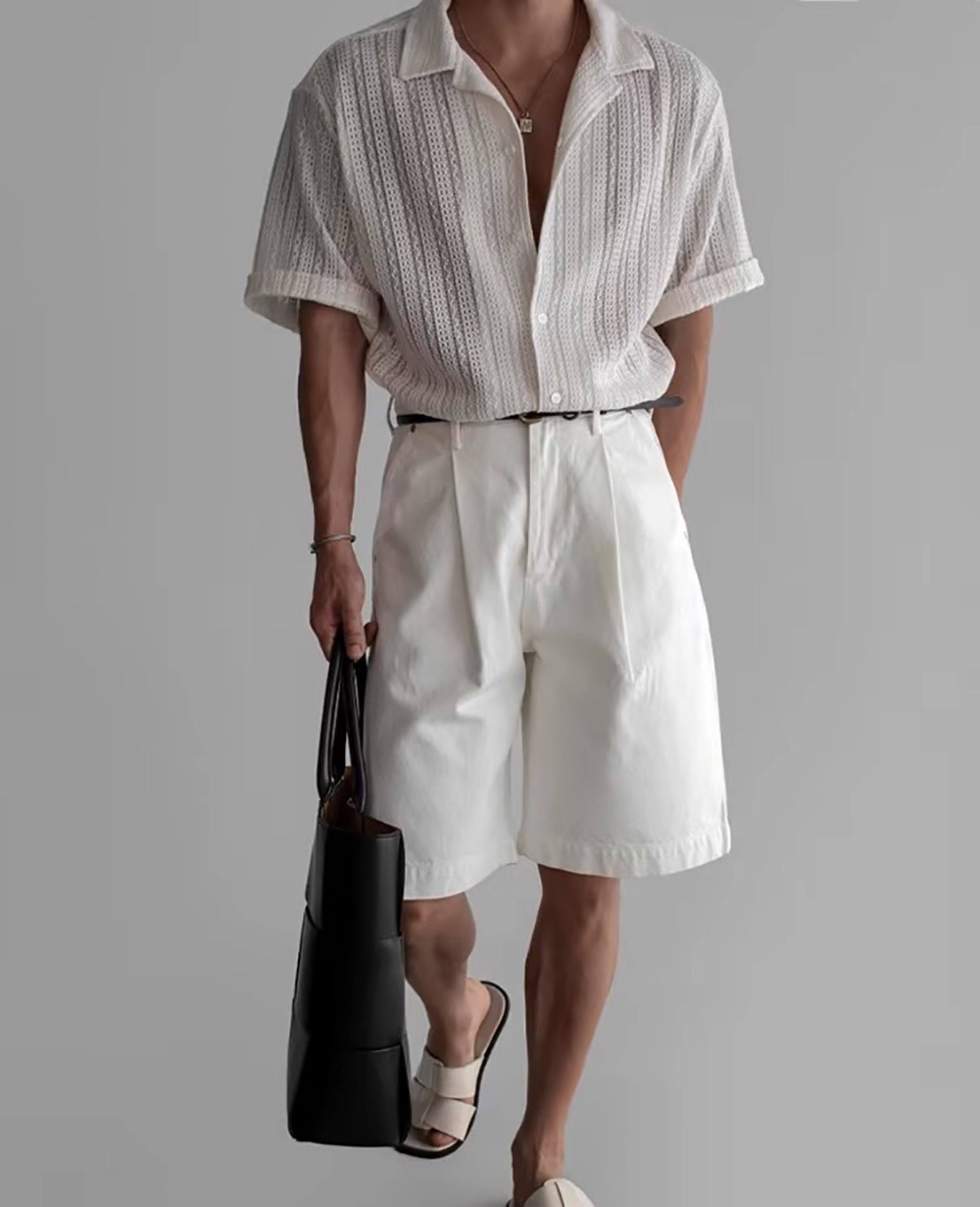 Old Money Style Cuban Collar Hollow Knit Short-Sleeved Shirt for Men, Summer Thin High-End Sun Protection Half-Sleeve Shirt Jacket