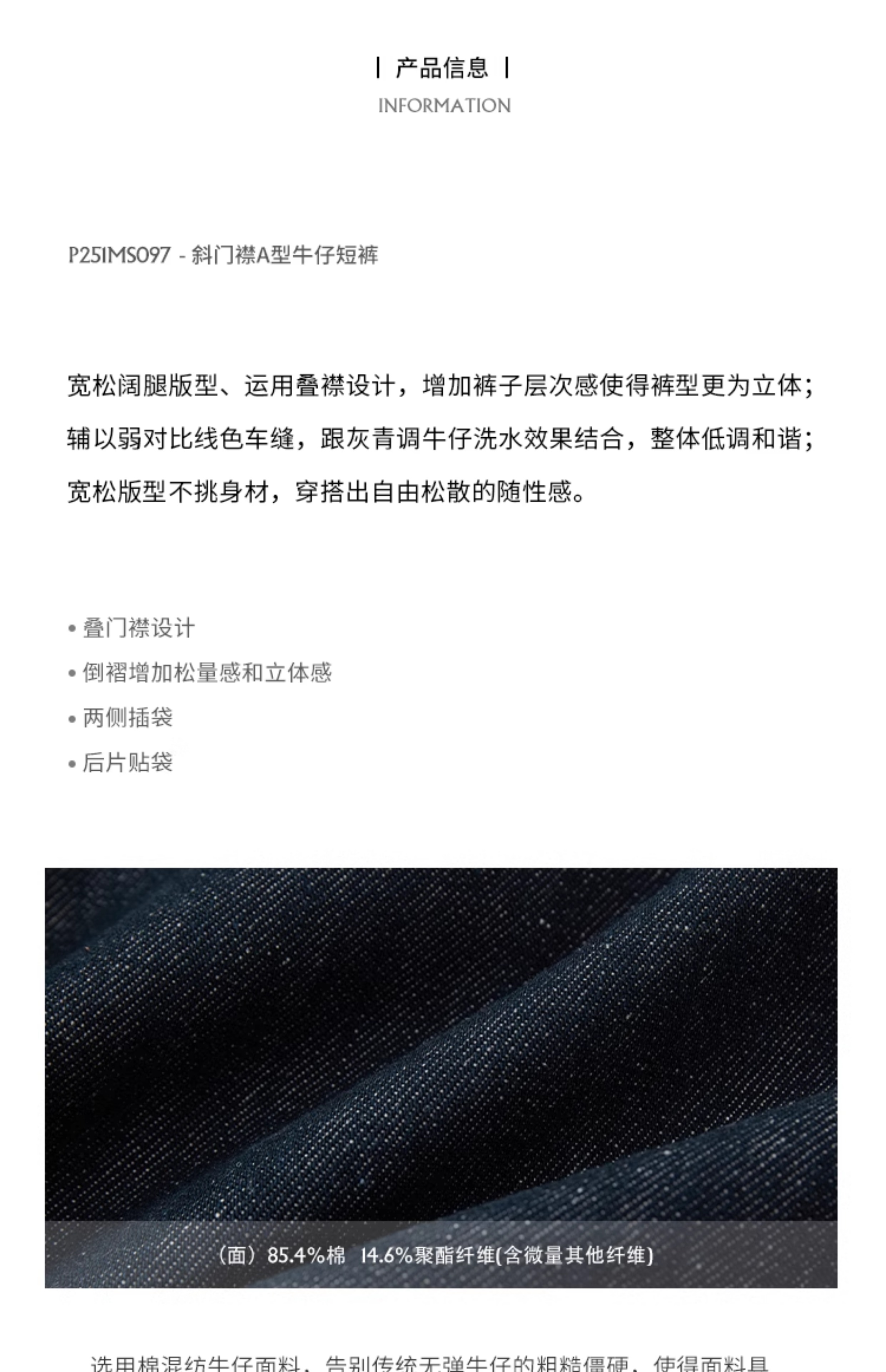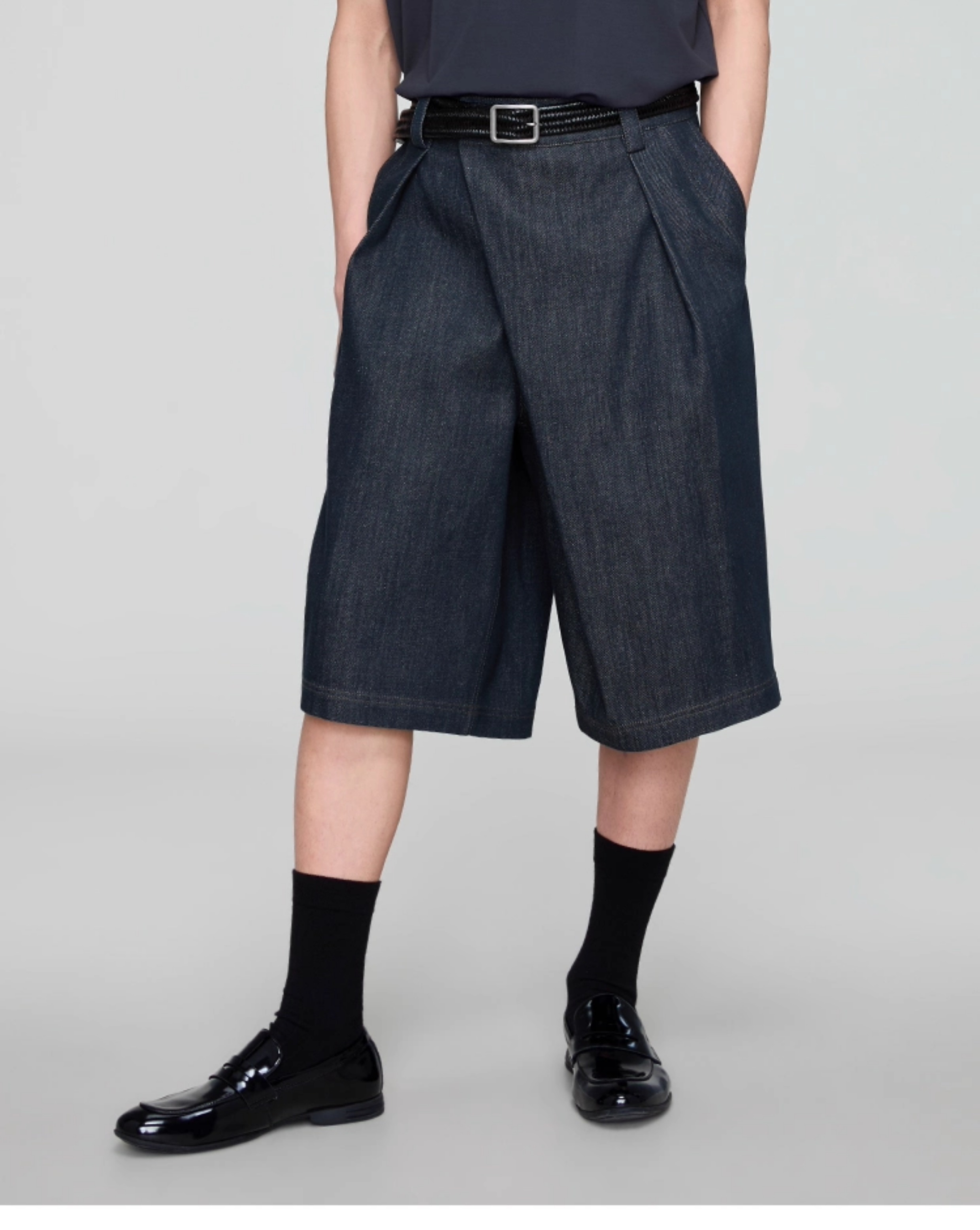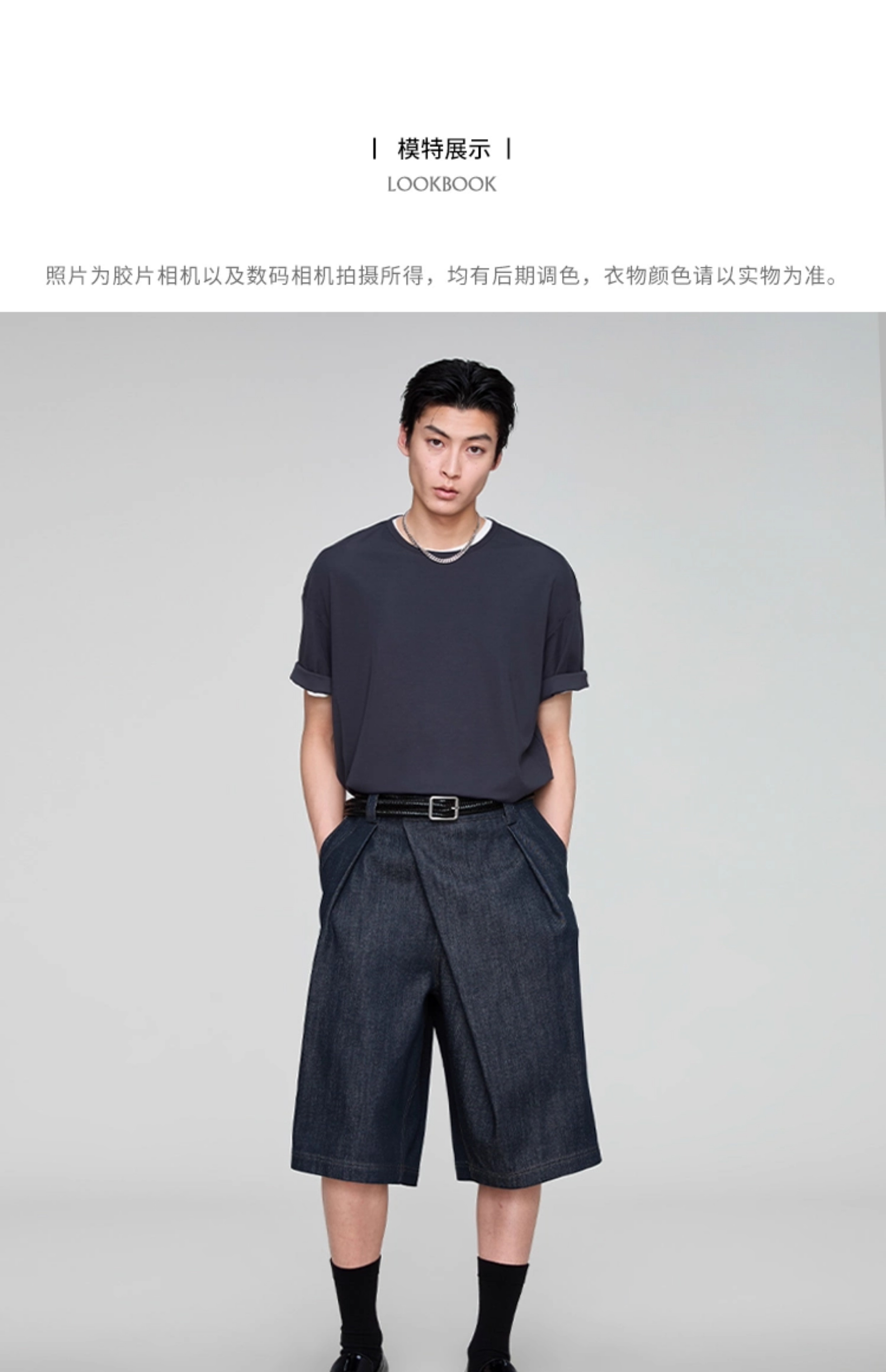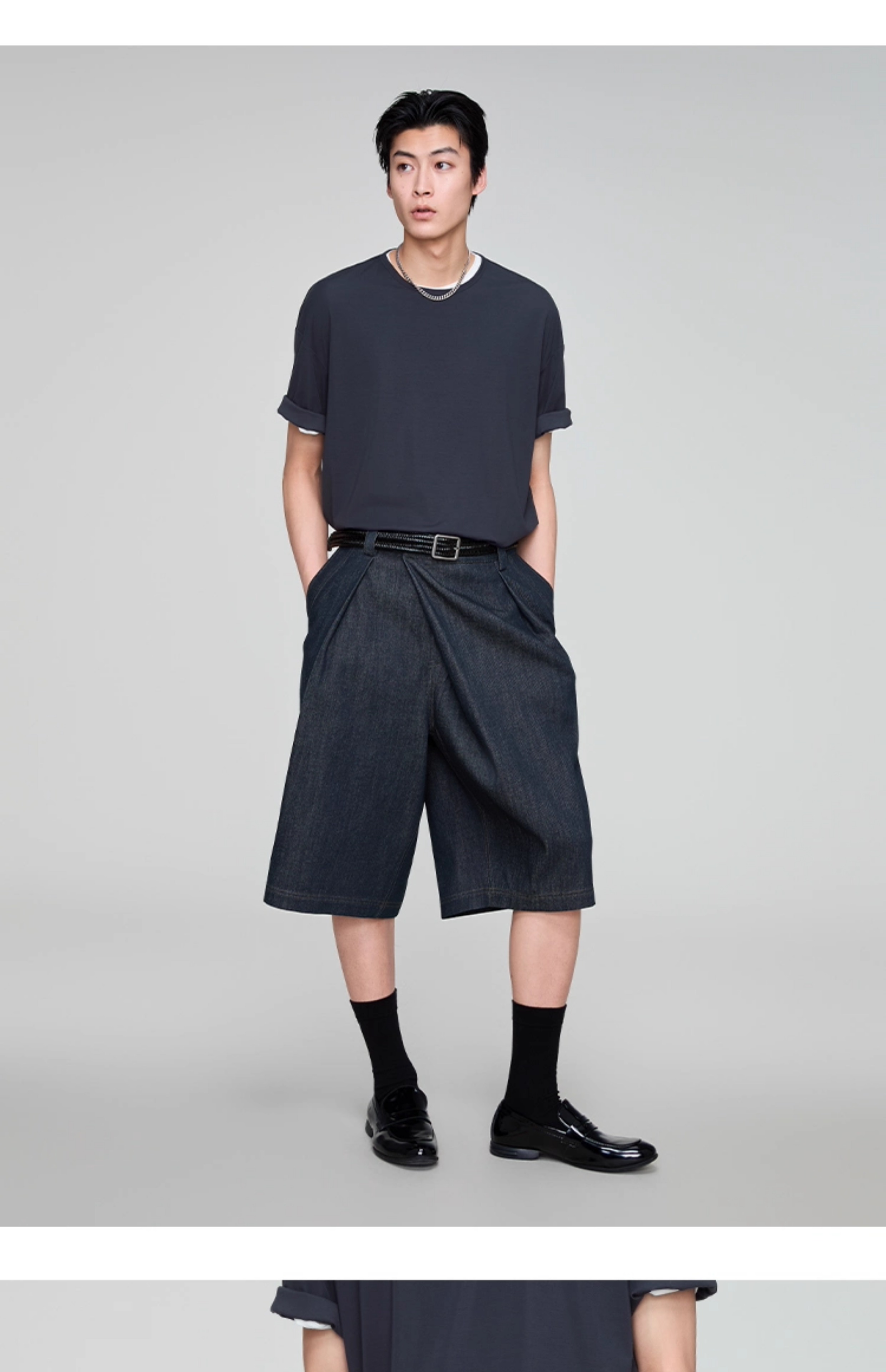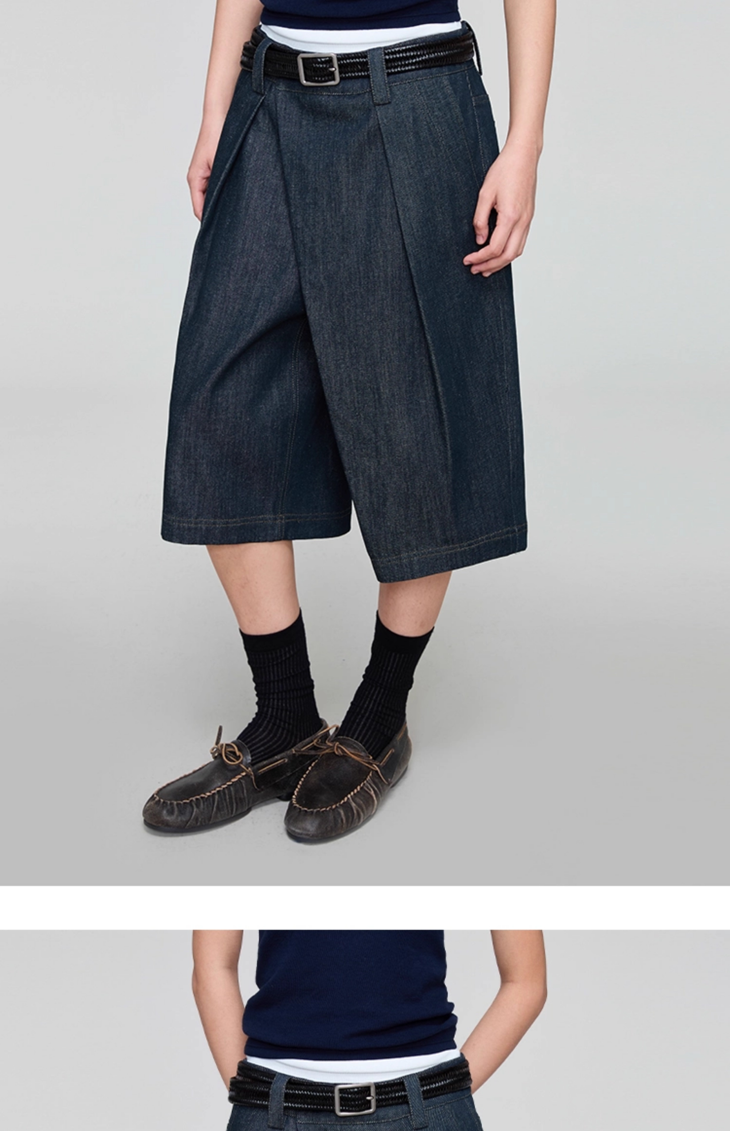 Opicloth/Opic 10.4oz Vintage Washed Diagonal Placket A-Line Loose Wide-Leg Denim Casual Six-Point Pants