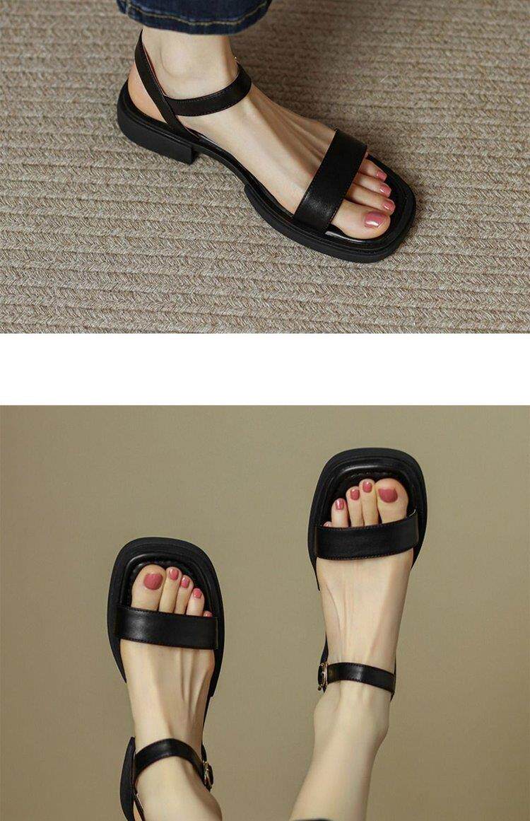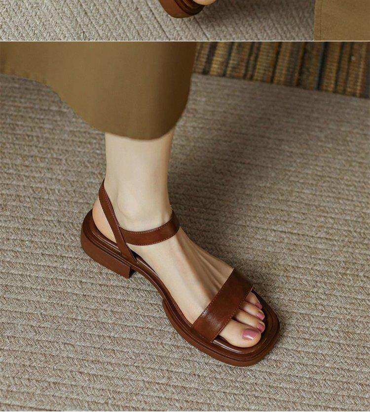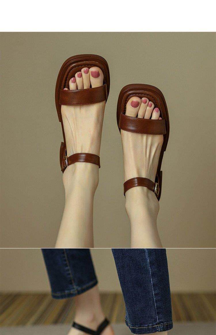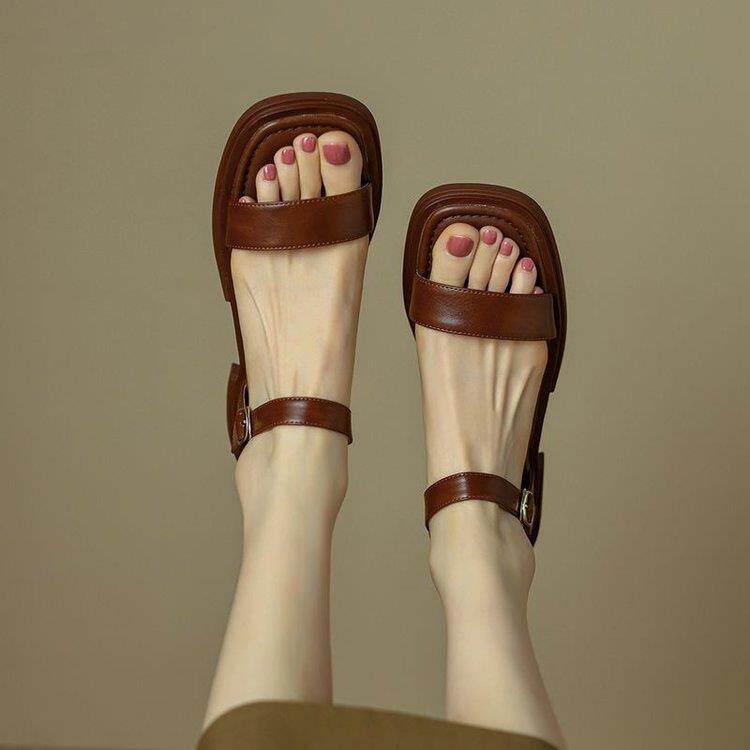 Foreign Trade Large Size French Retro Brown Sandals Low-Heeled Roman Shoes Open-Toe Strap Simple Comfortable Flat Women's Shoes