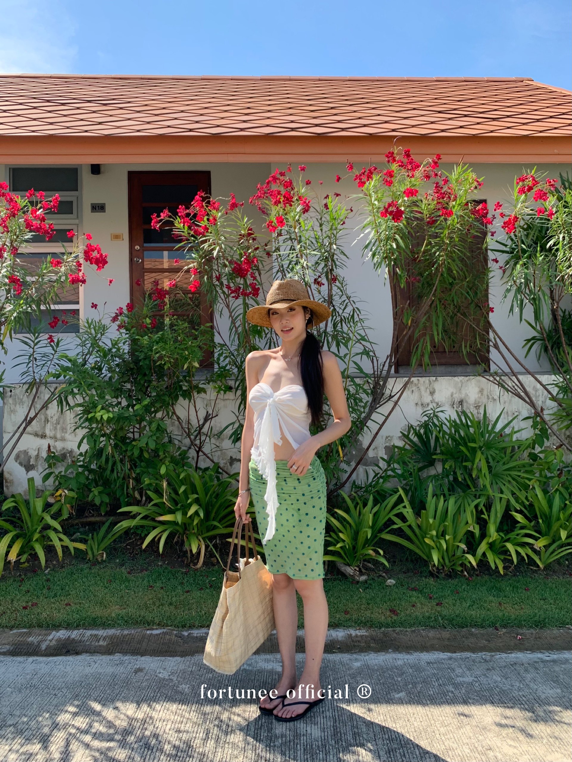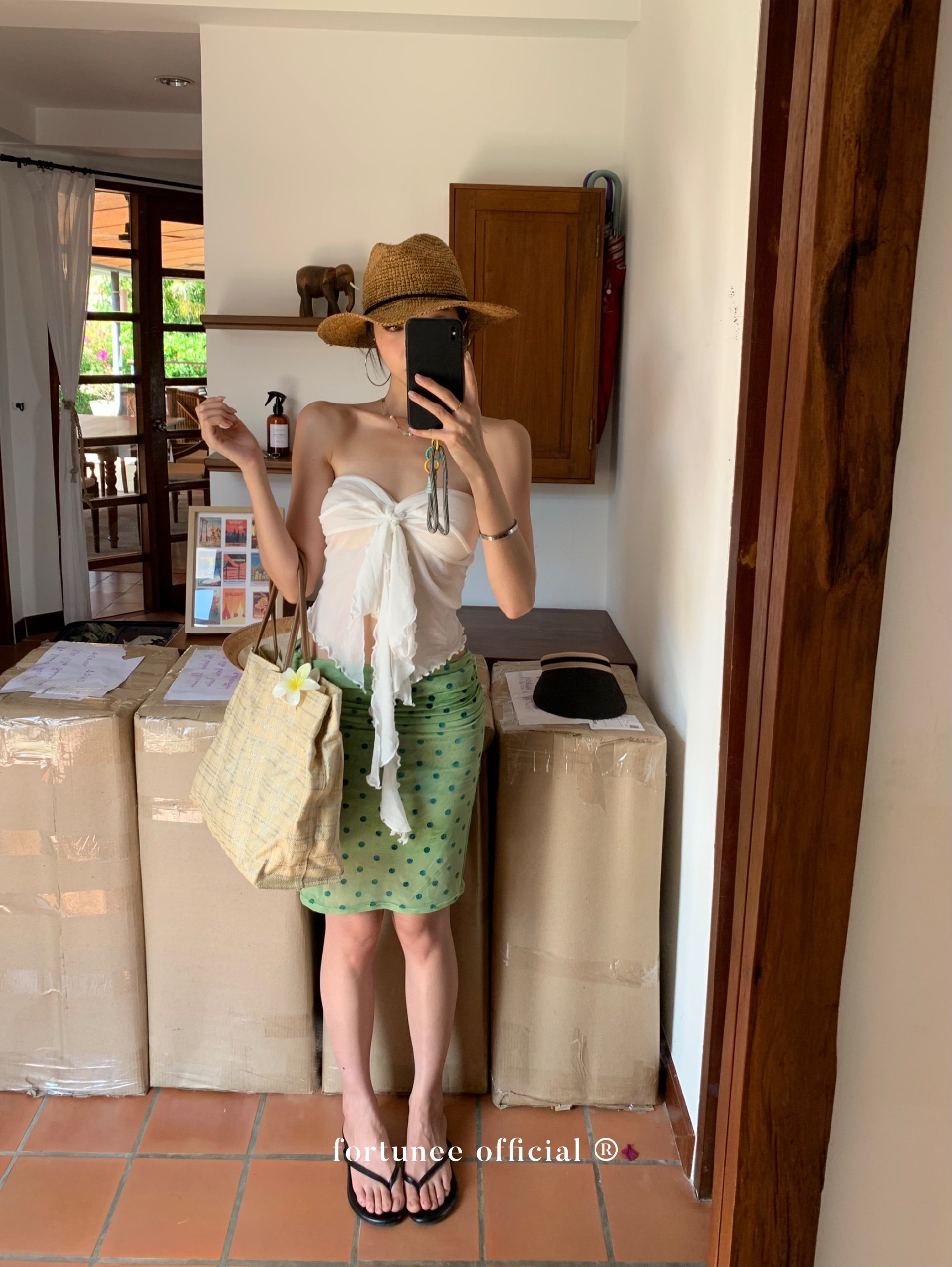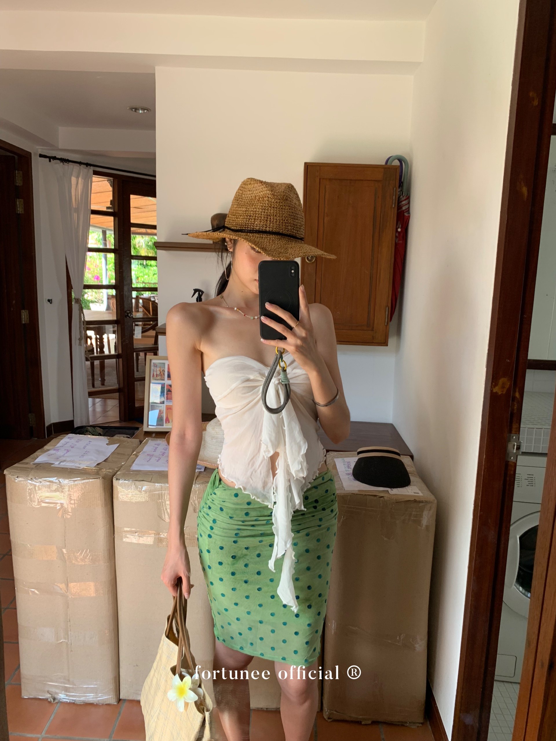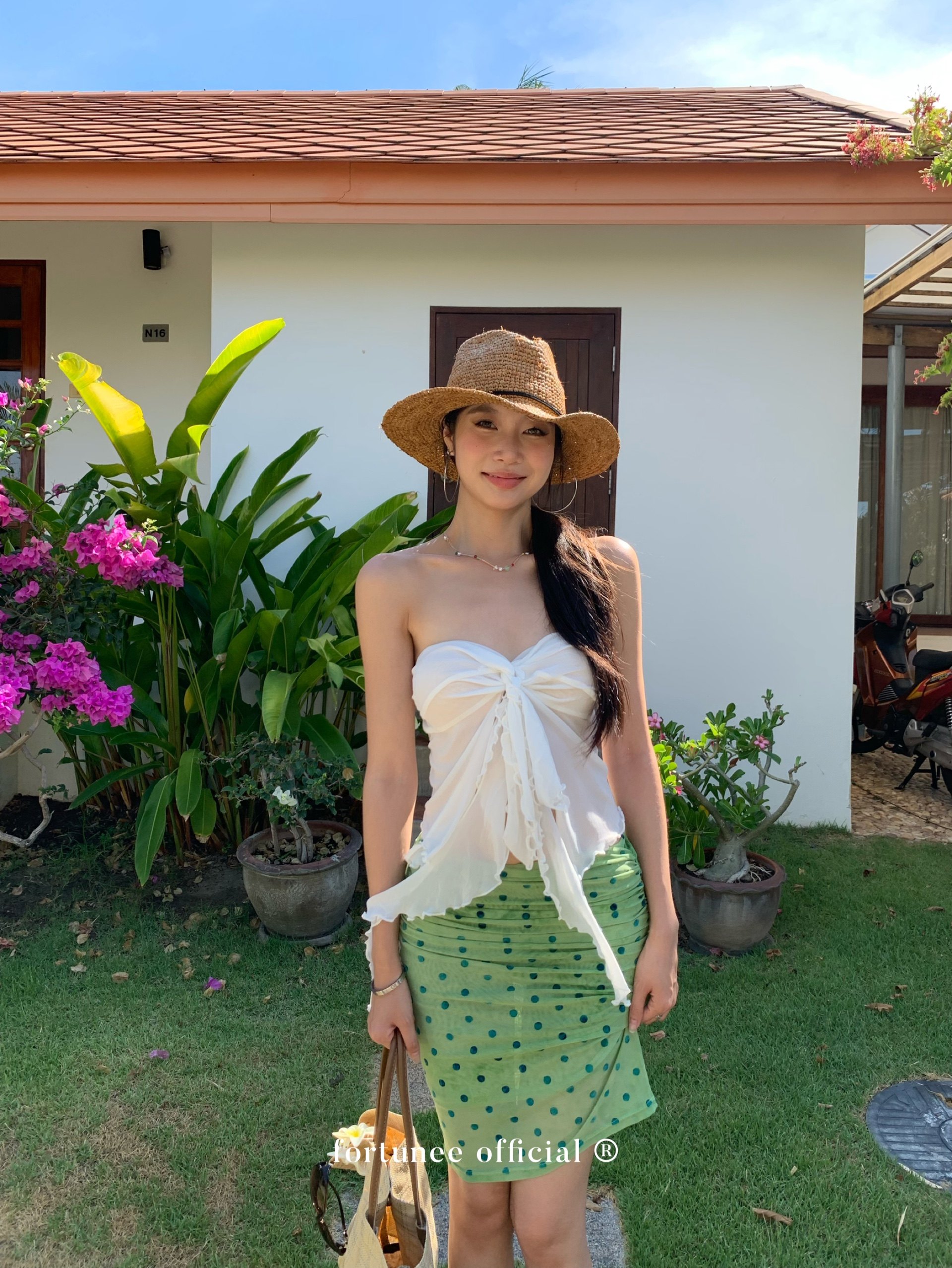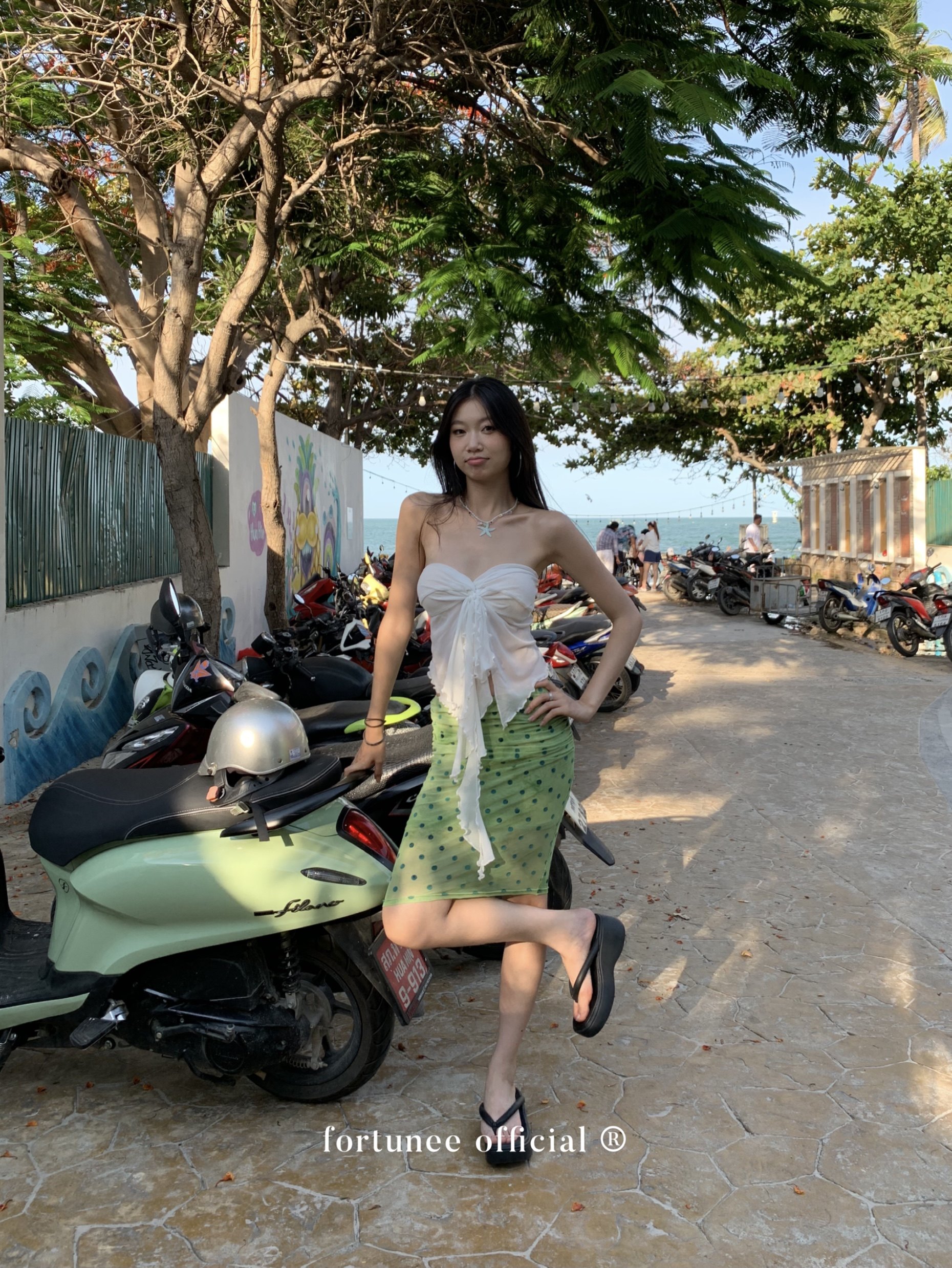 Fortunee 2025 Summer Vacation Style Tie-Dye Flocked Green Mesh Pleated Skirt Bodycon Skirt