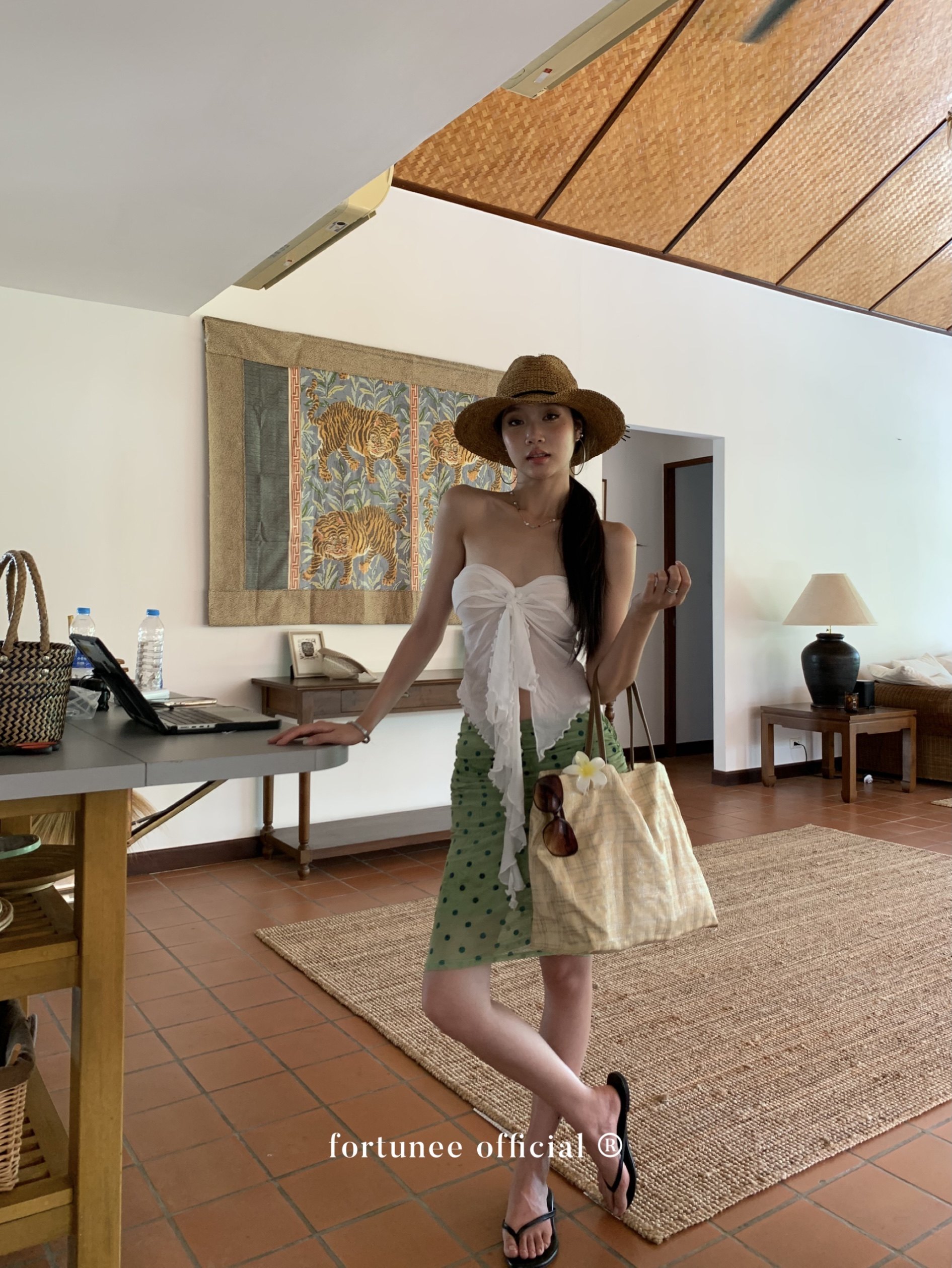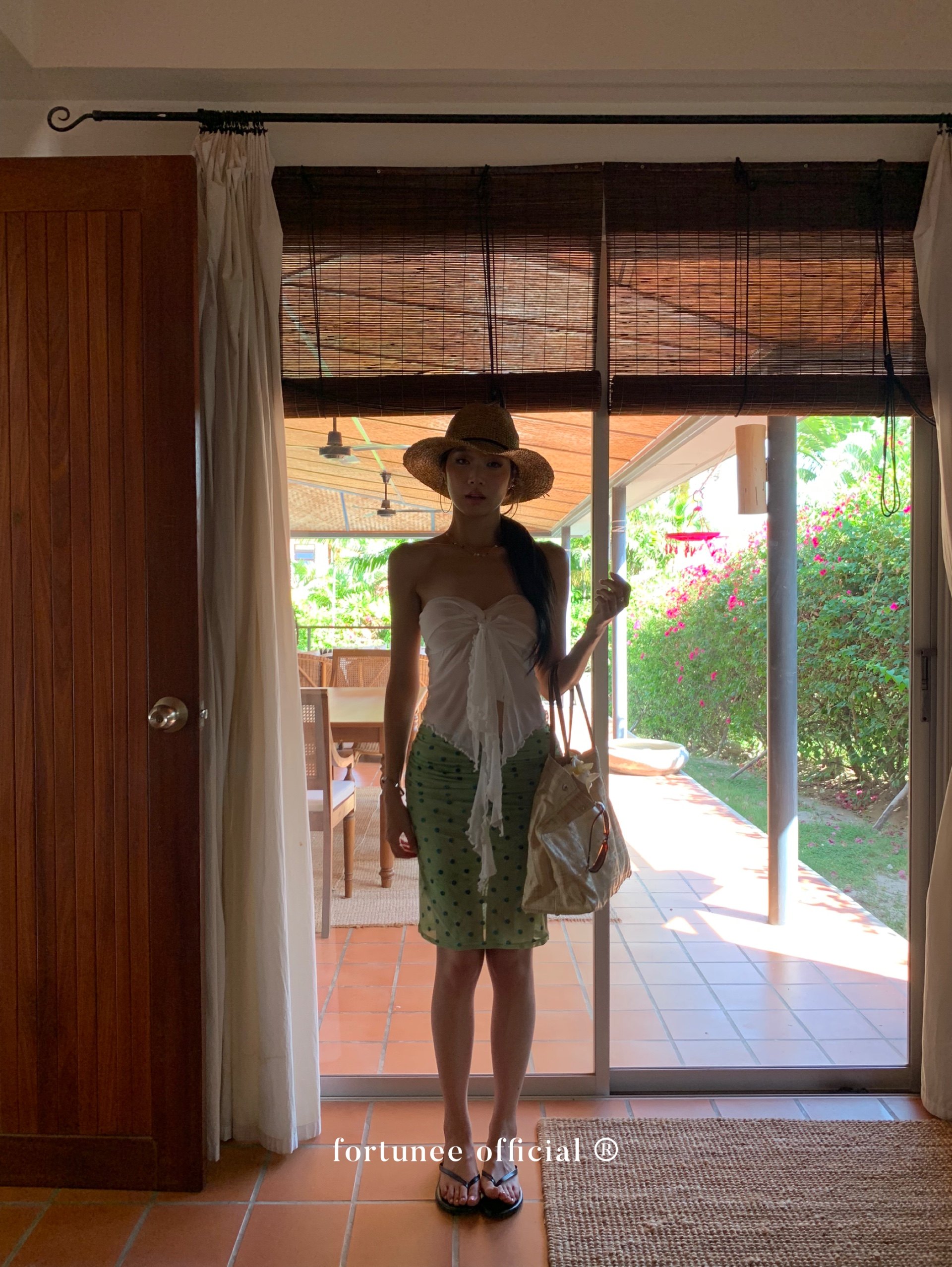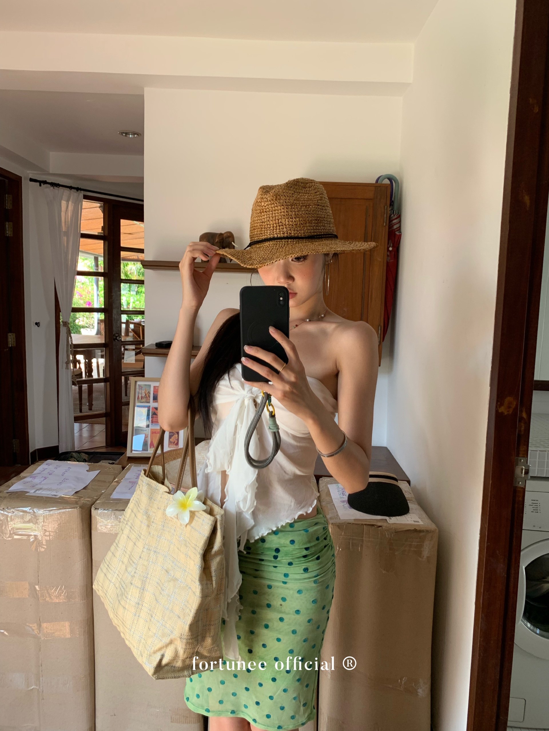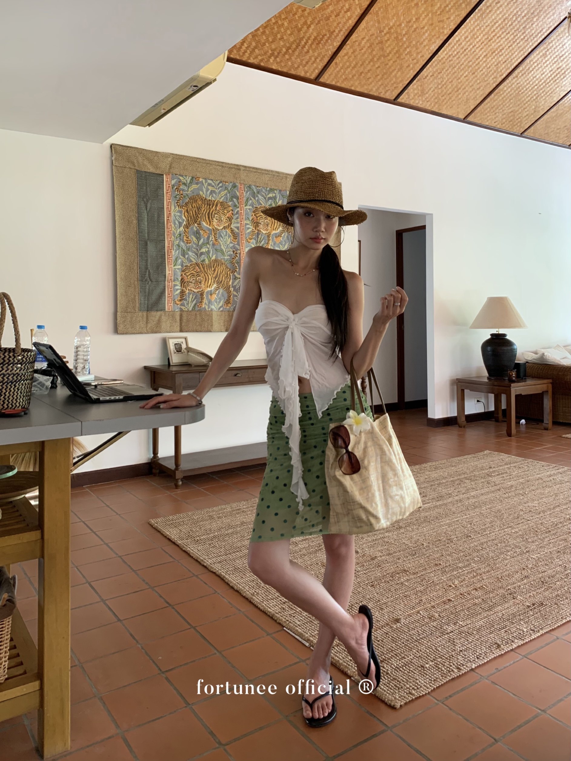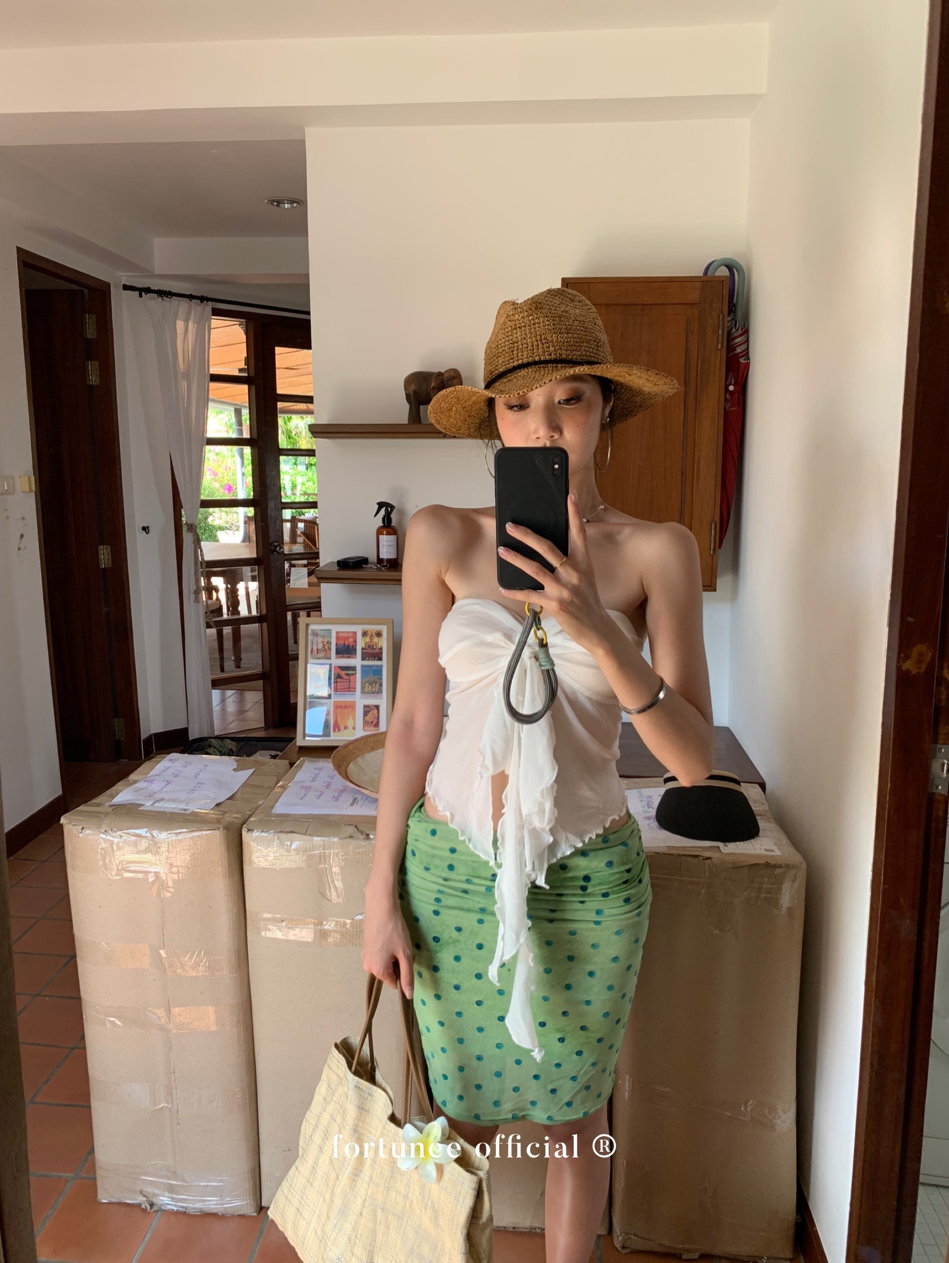 Fortunee 2025 Summer Vacation Style Tie-Dye Flocked Green Mesh Pleated Skirt Bodycon Skirt