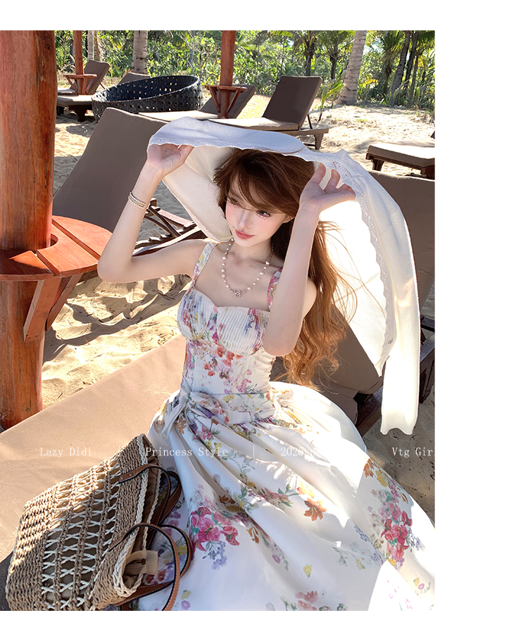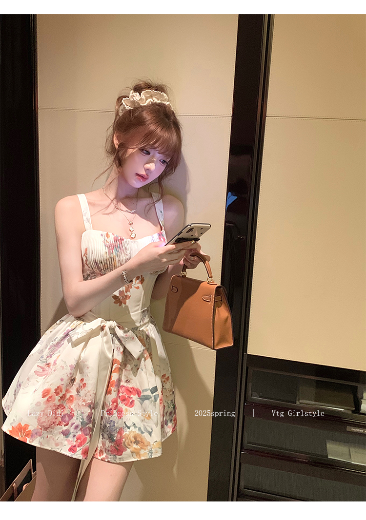 Lazy Didi Foldable Pleated Fishbone Floral Dress, Vintage Tailored U-Neck Sweet Camisole Dress