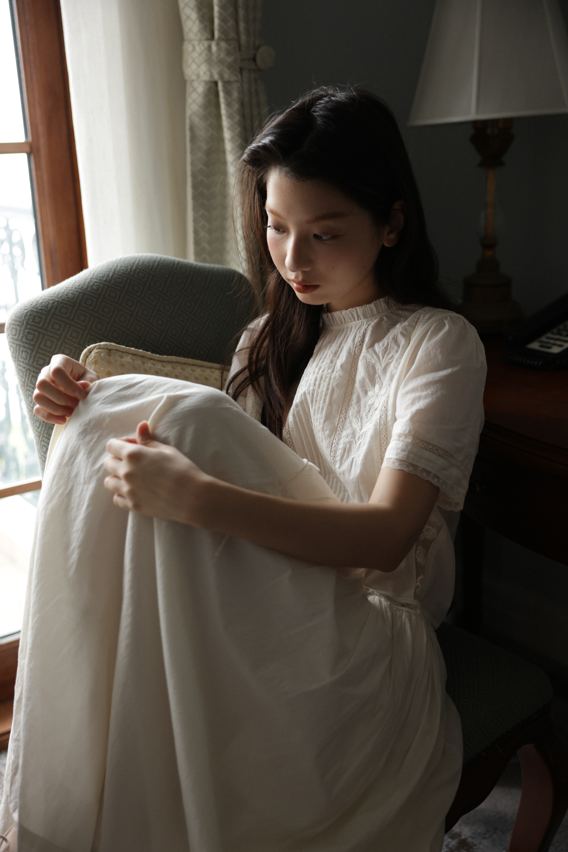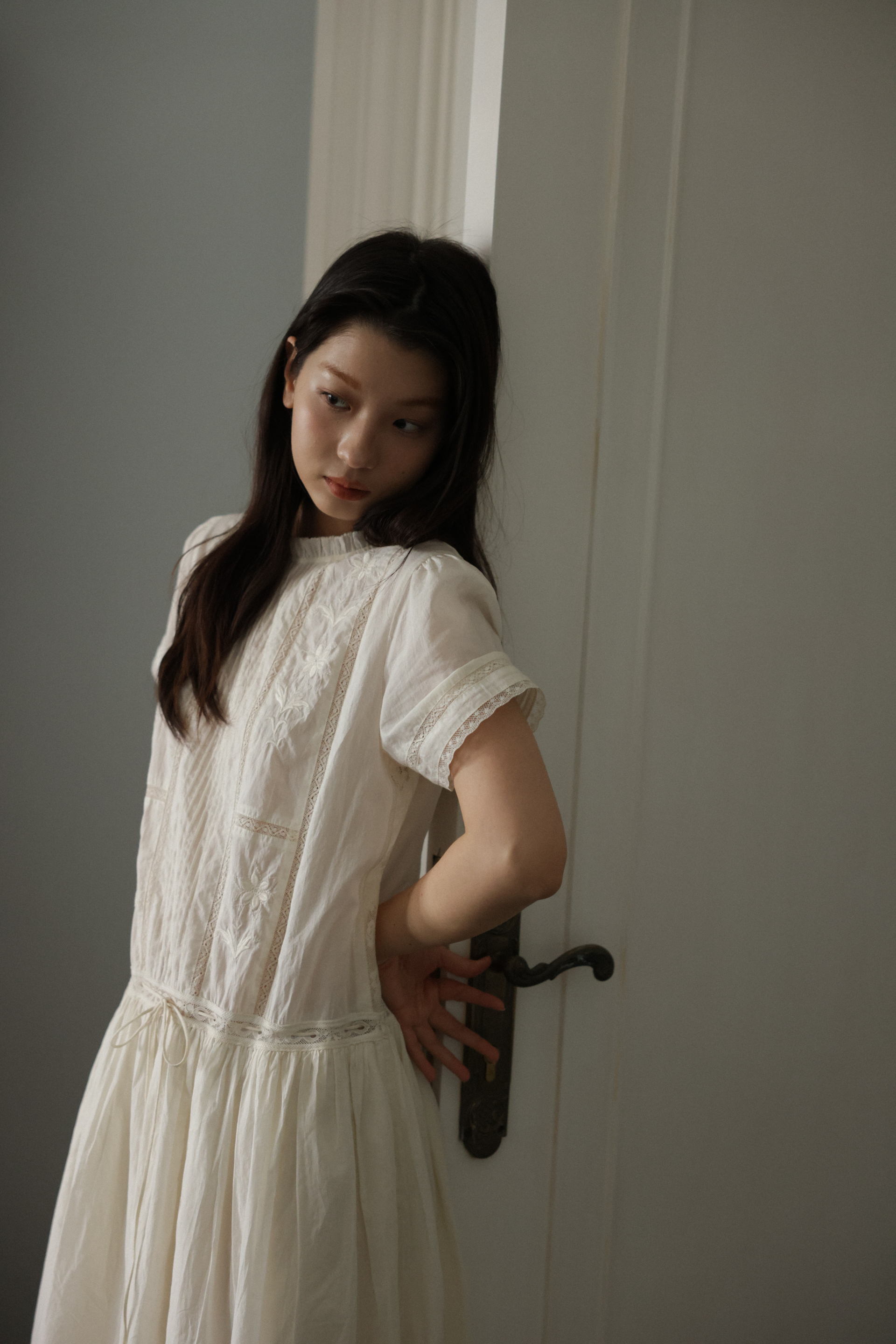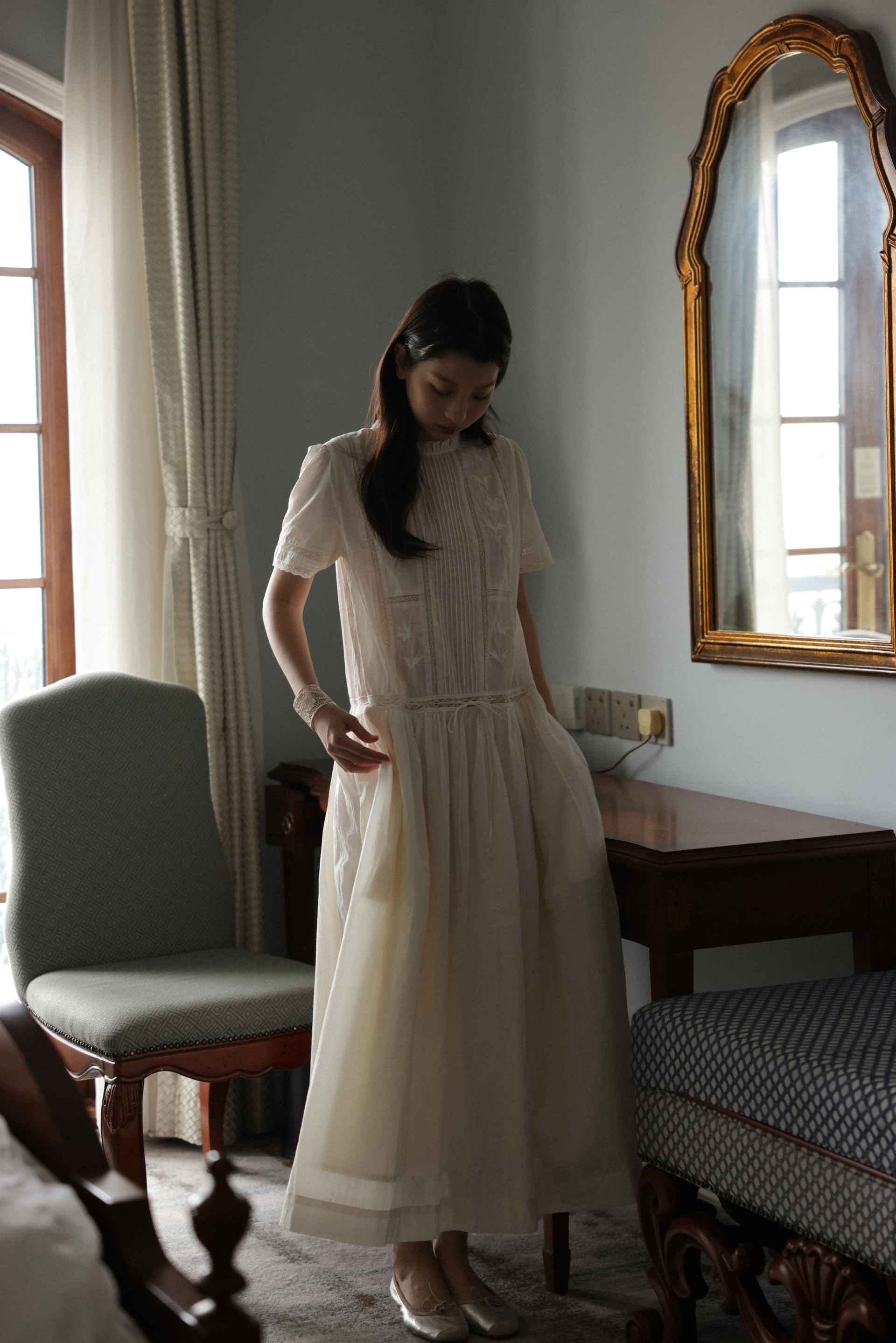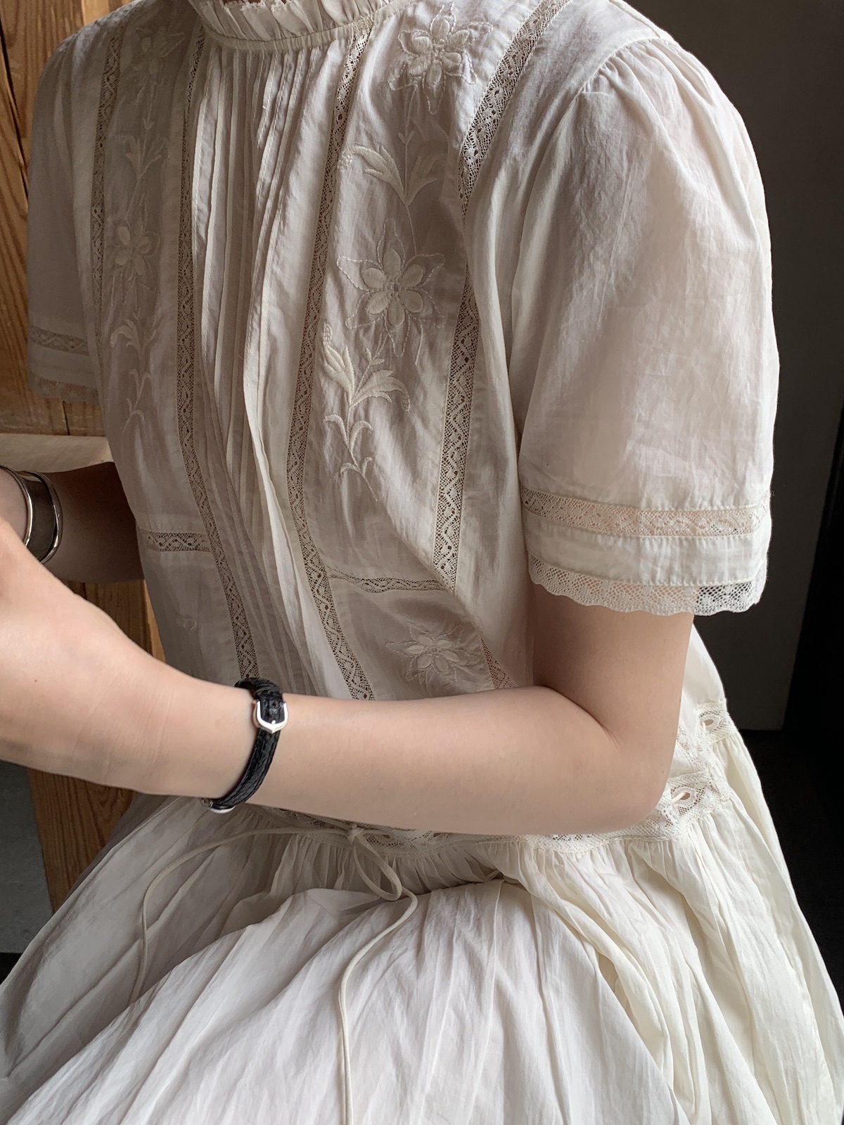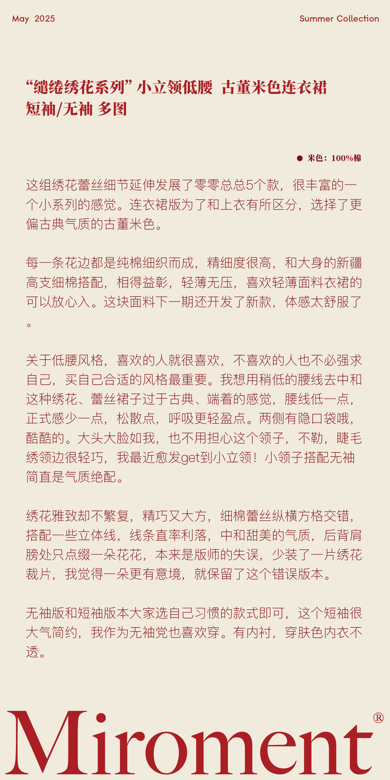 Miroment Delicate Embroidered Small Stand Collar Antique Beige Low-Waist Dress Beige Sleeveless/Short-Sleeve Multiple Images