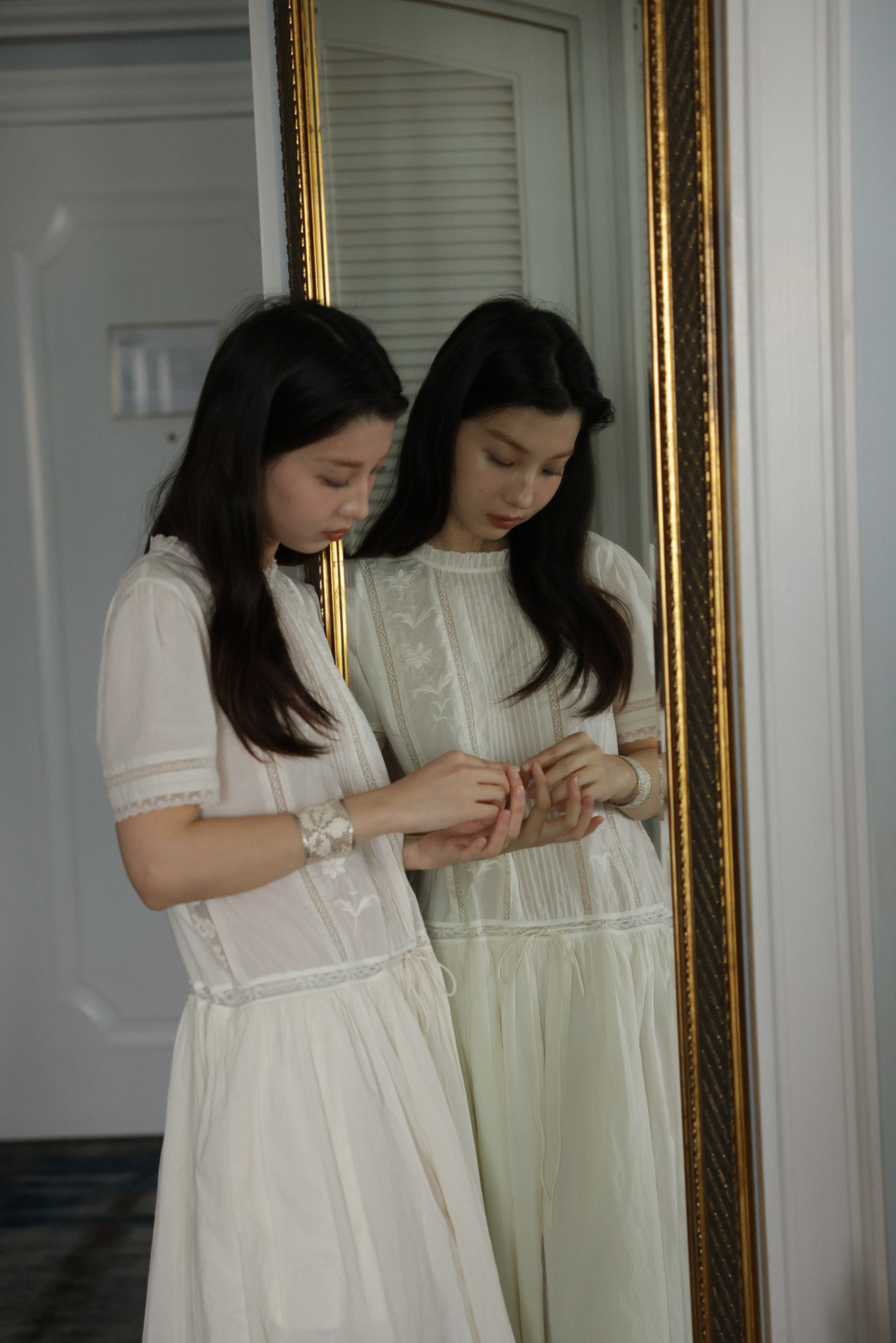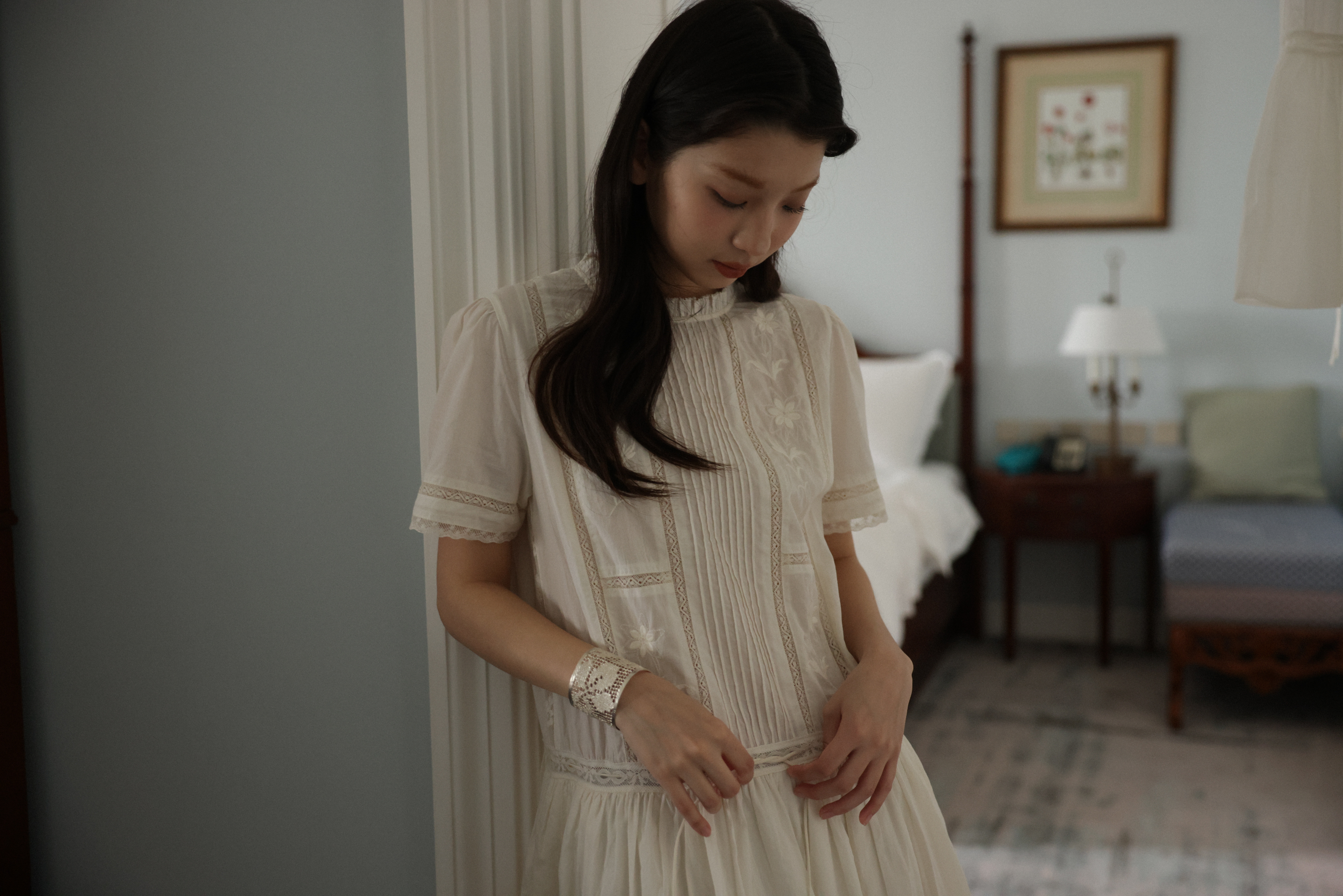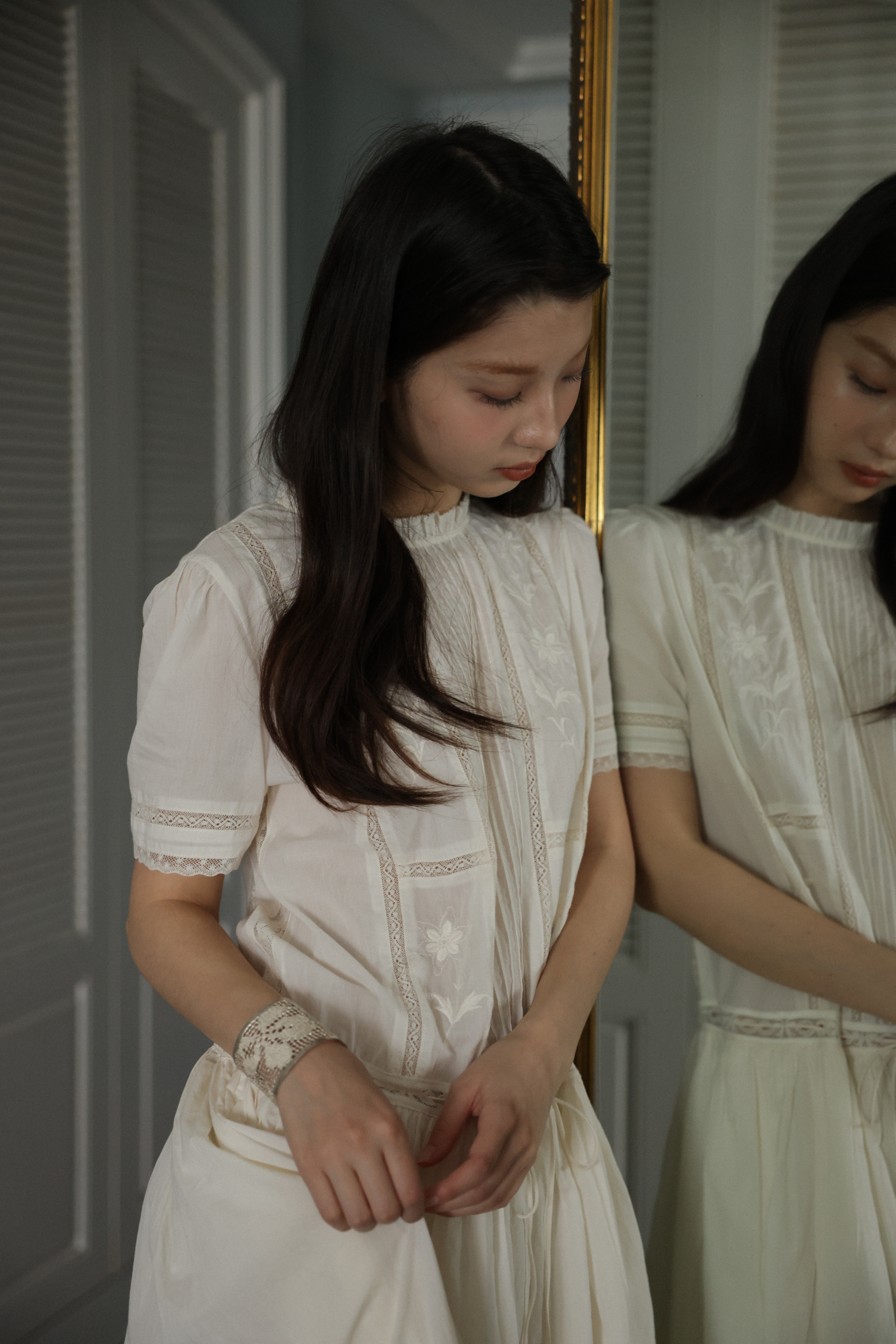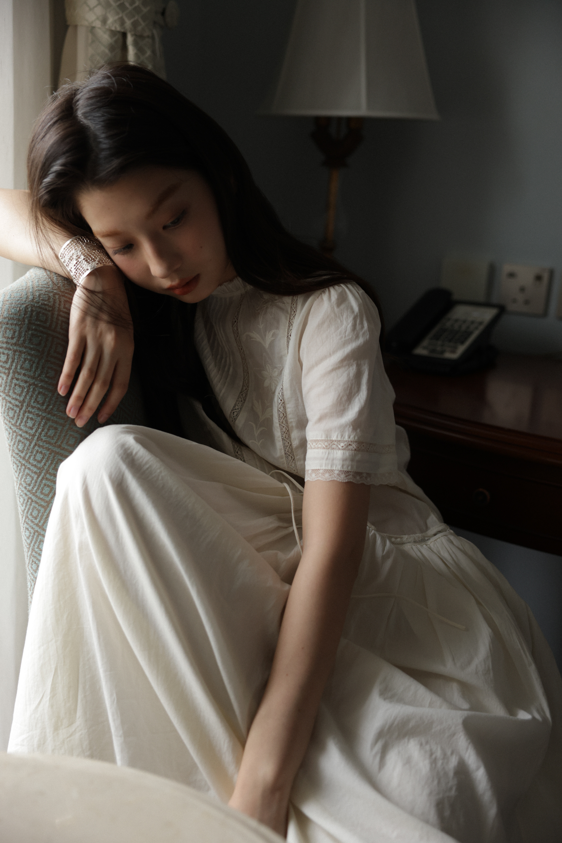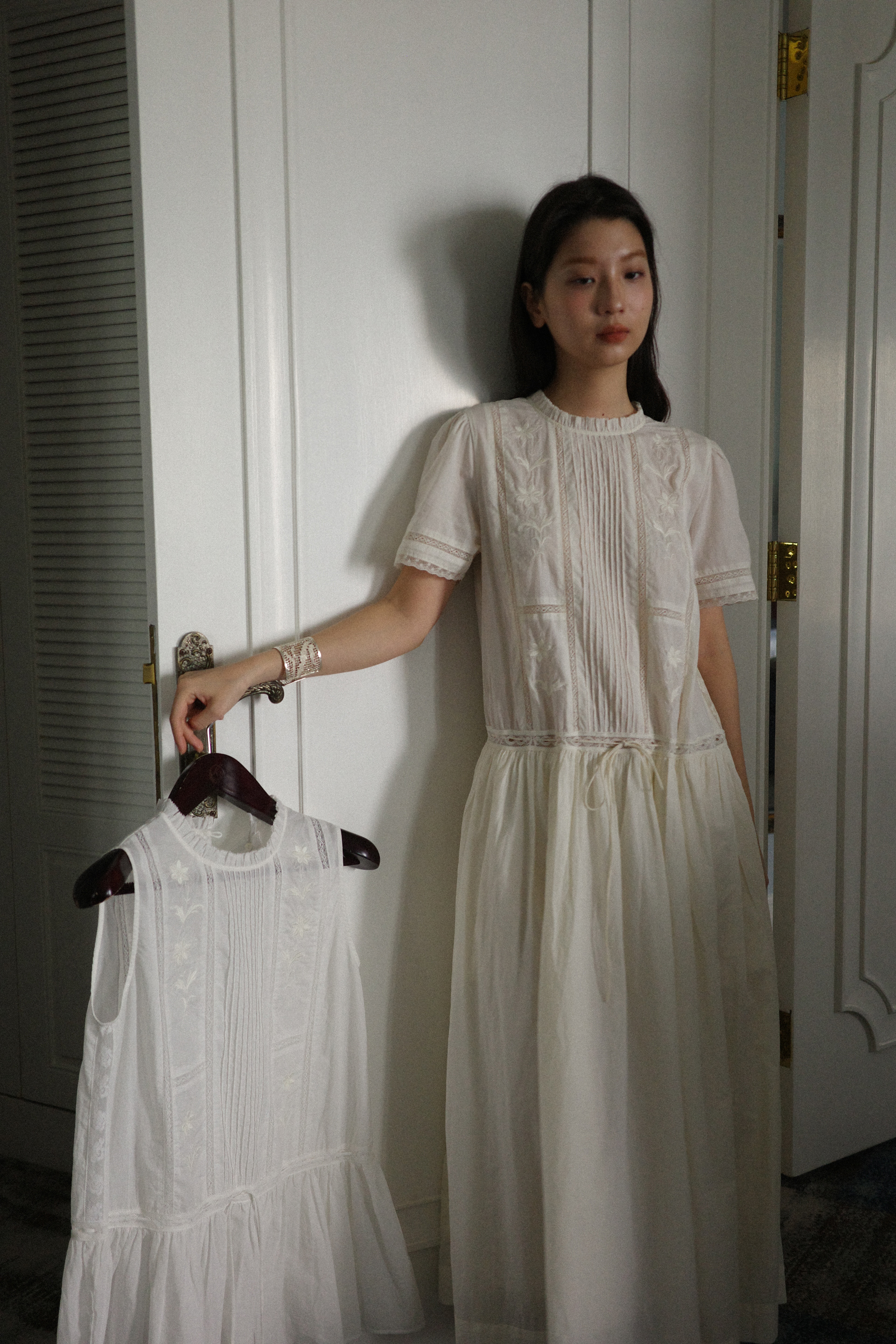 Miroment Delicate Embroidered Small Stand Collar Antique Beige Low-Waist Dress Beige Sleeveless/Short-Sleeve Multiple Images