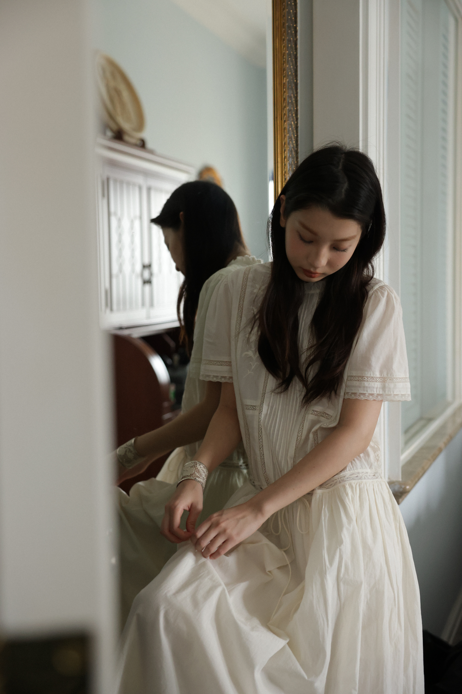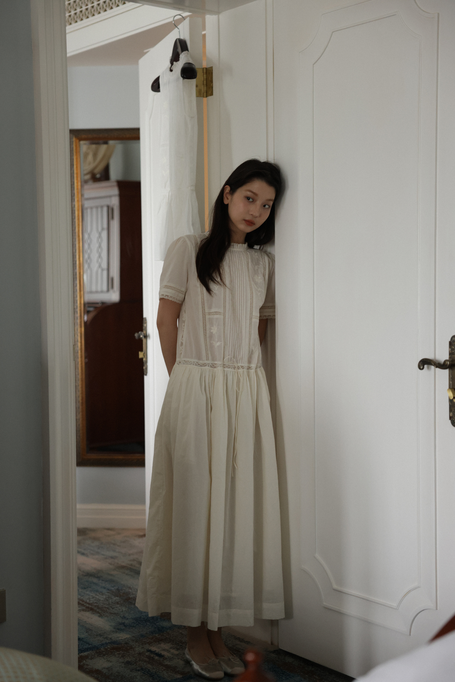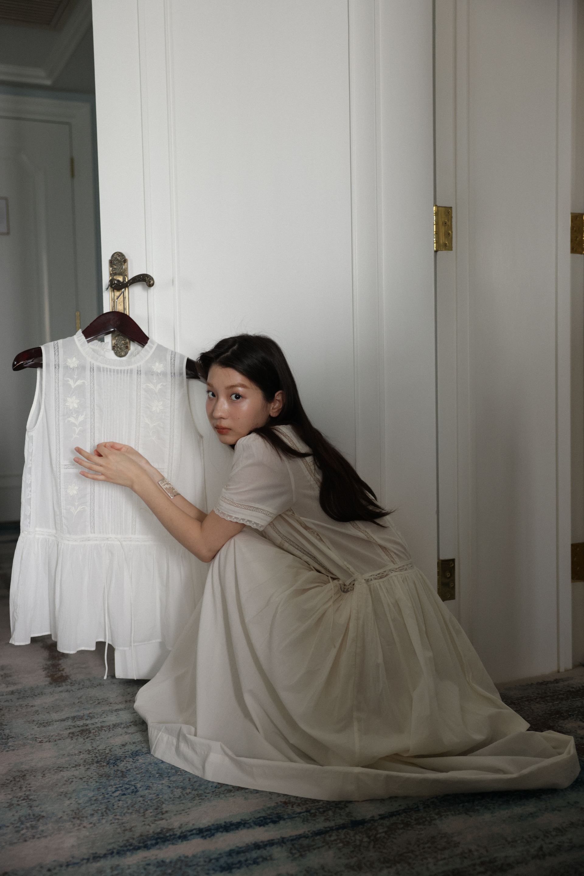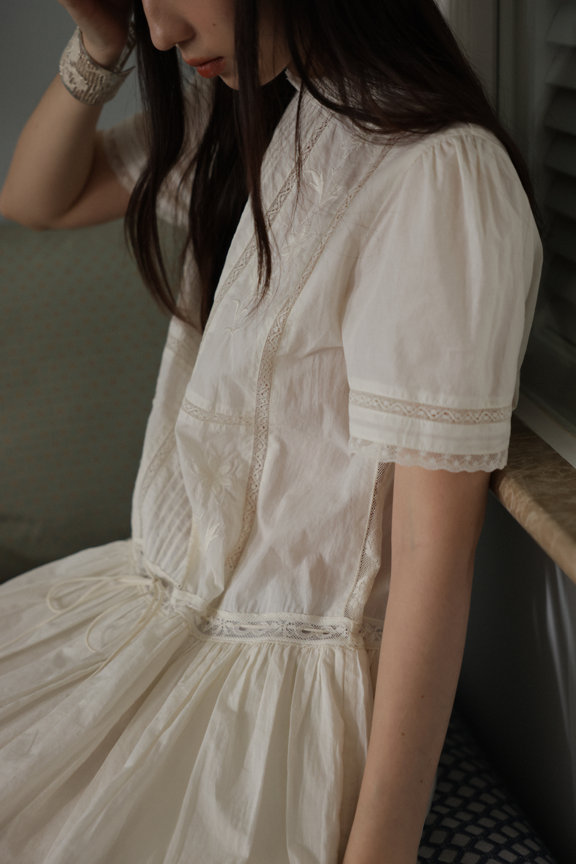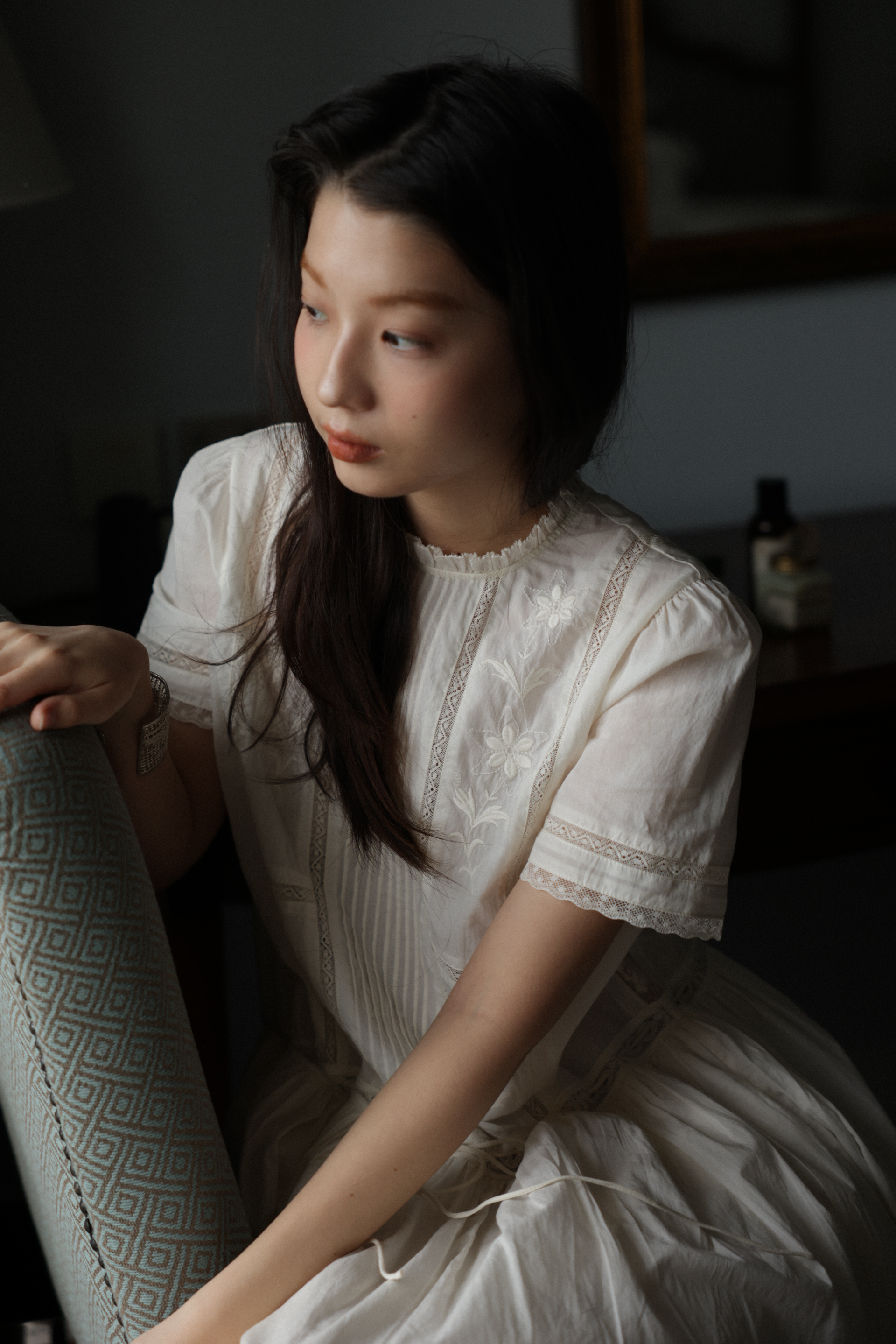 Miroment Delicate Embroidered Small Stand Collar Antique Beige Low-Waist Dress Beige Sleeveless/Short-Sleeve Multiple Images