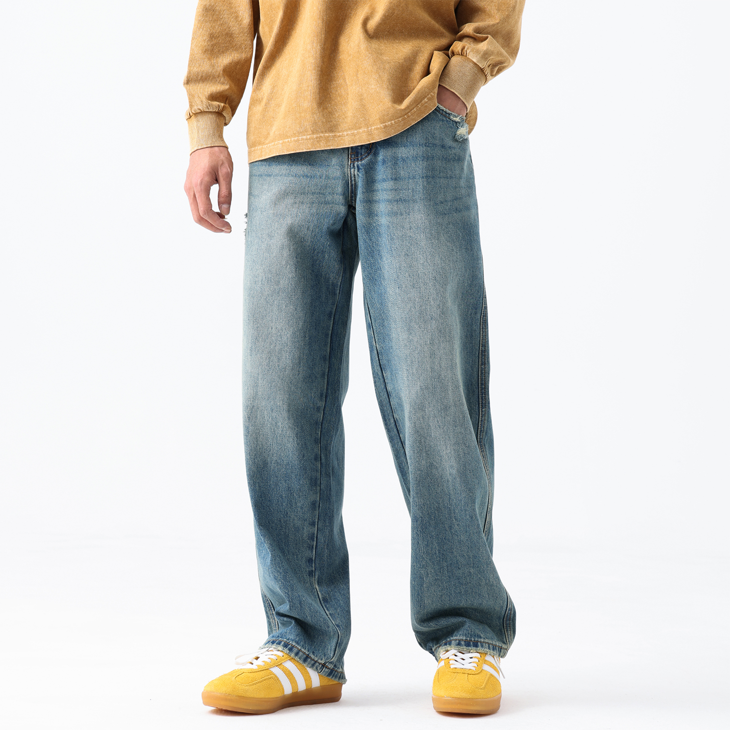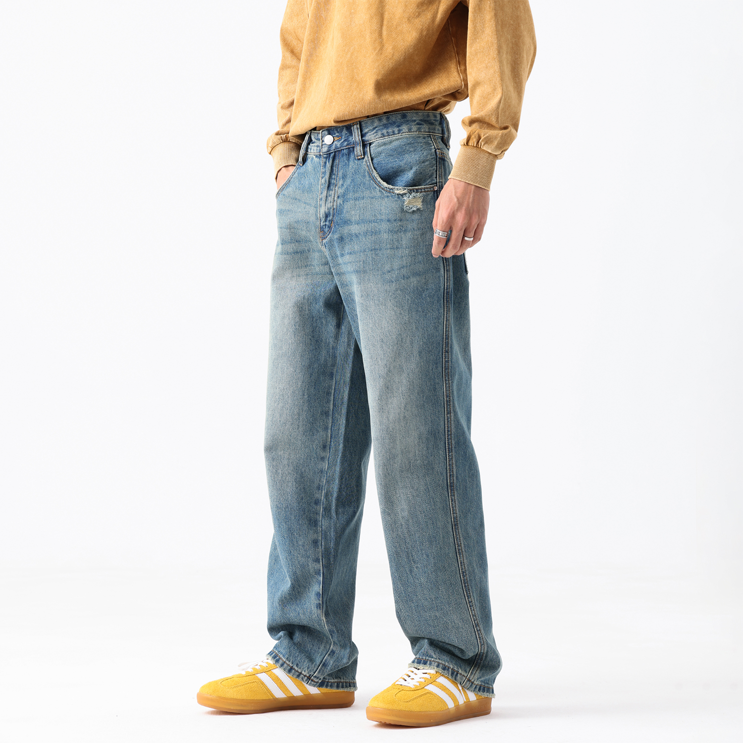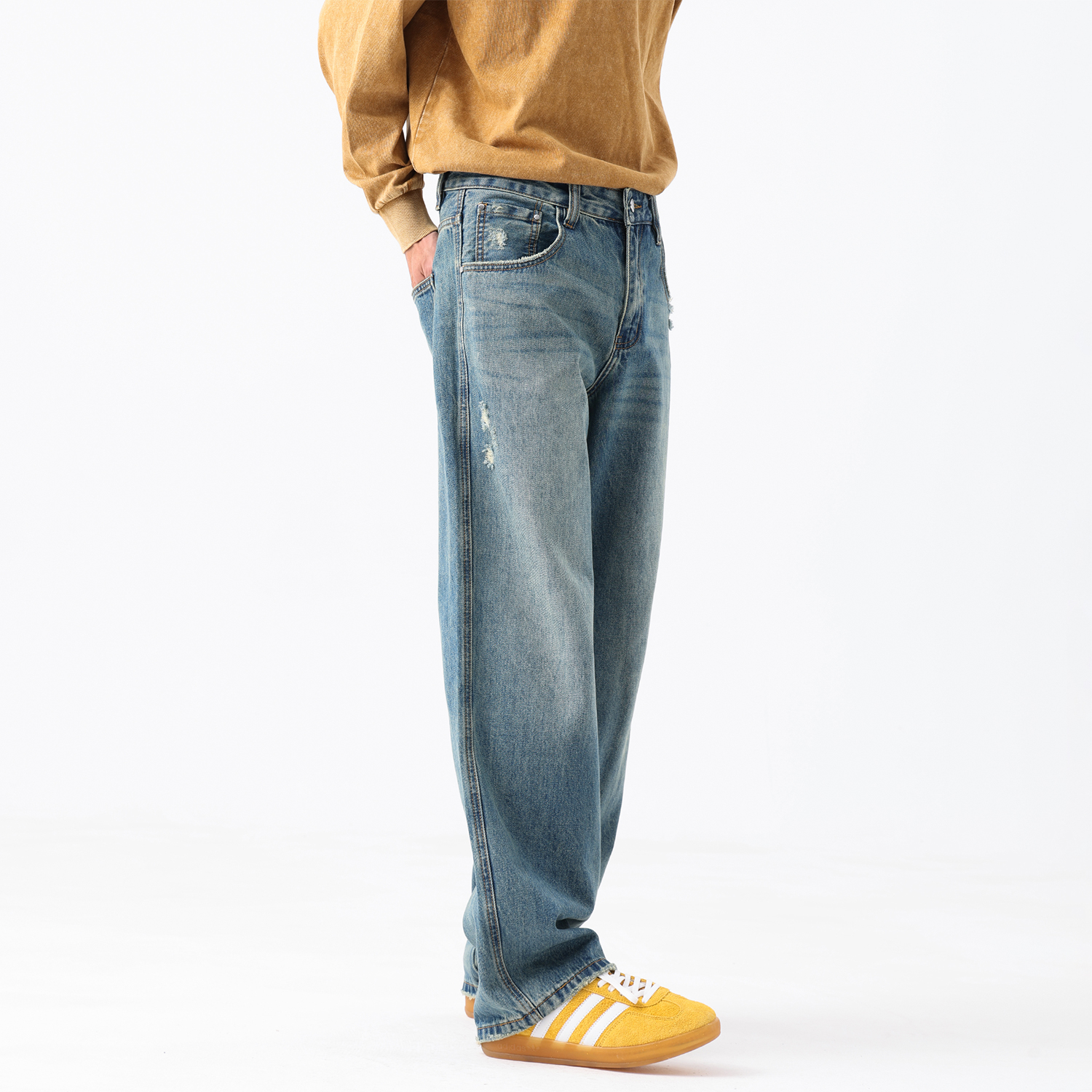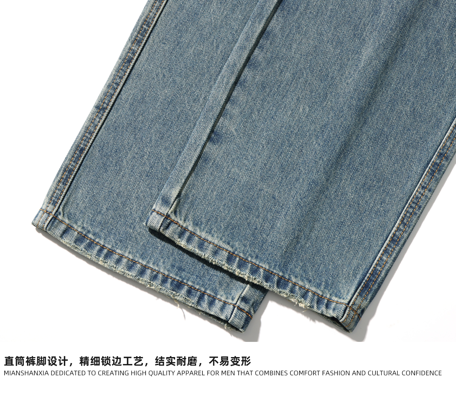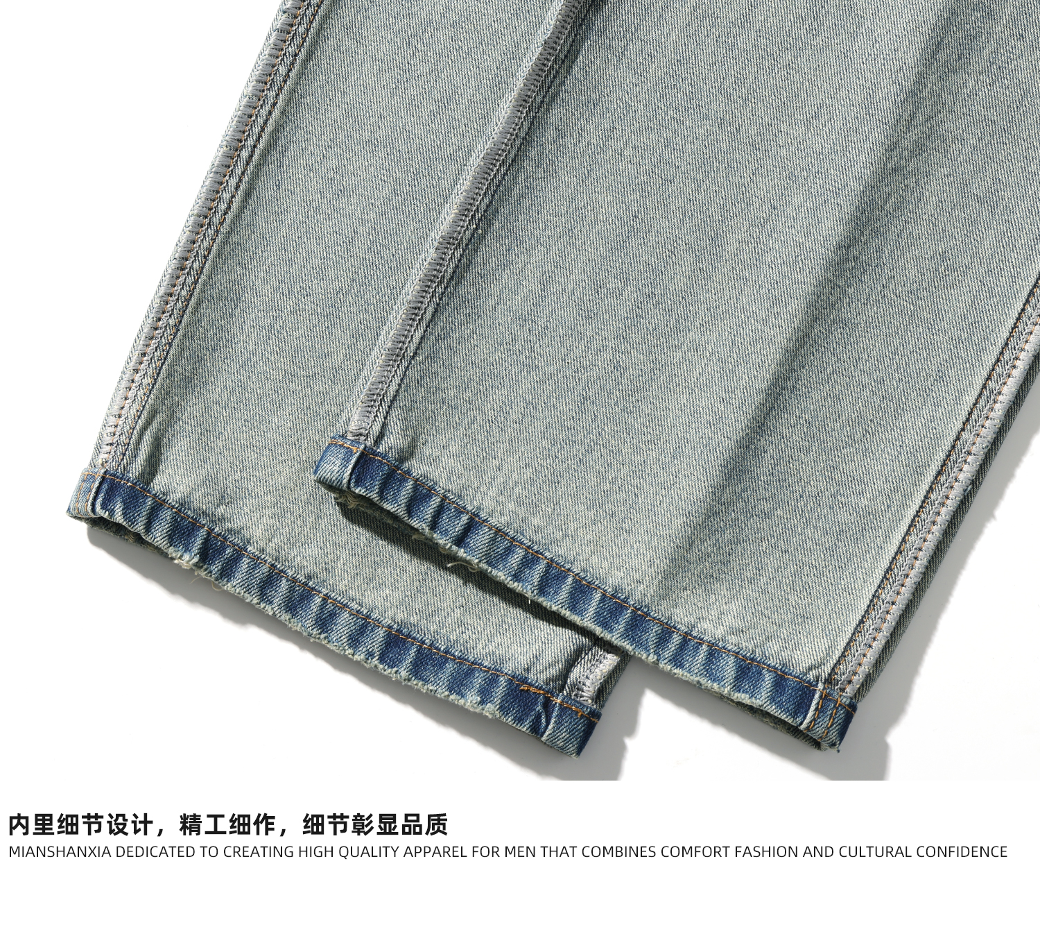 Cotton Mountain Autumn Blue Jeans for Men, Loose Straight Wide-Leg, Plus Size, Vintage New Tang Washed Casual Pants