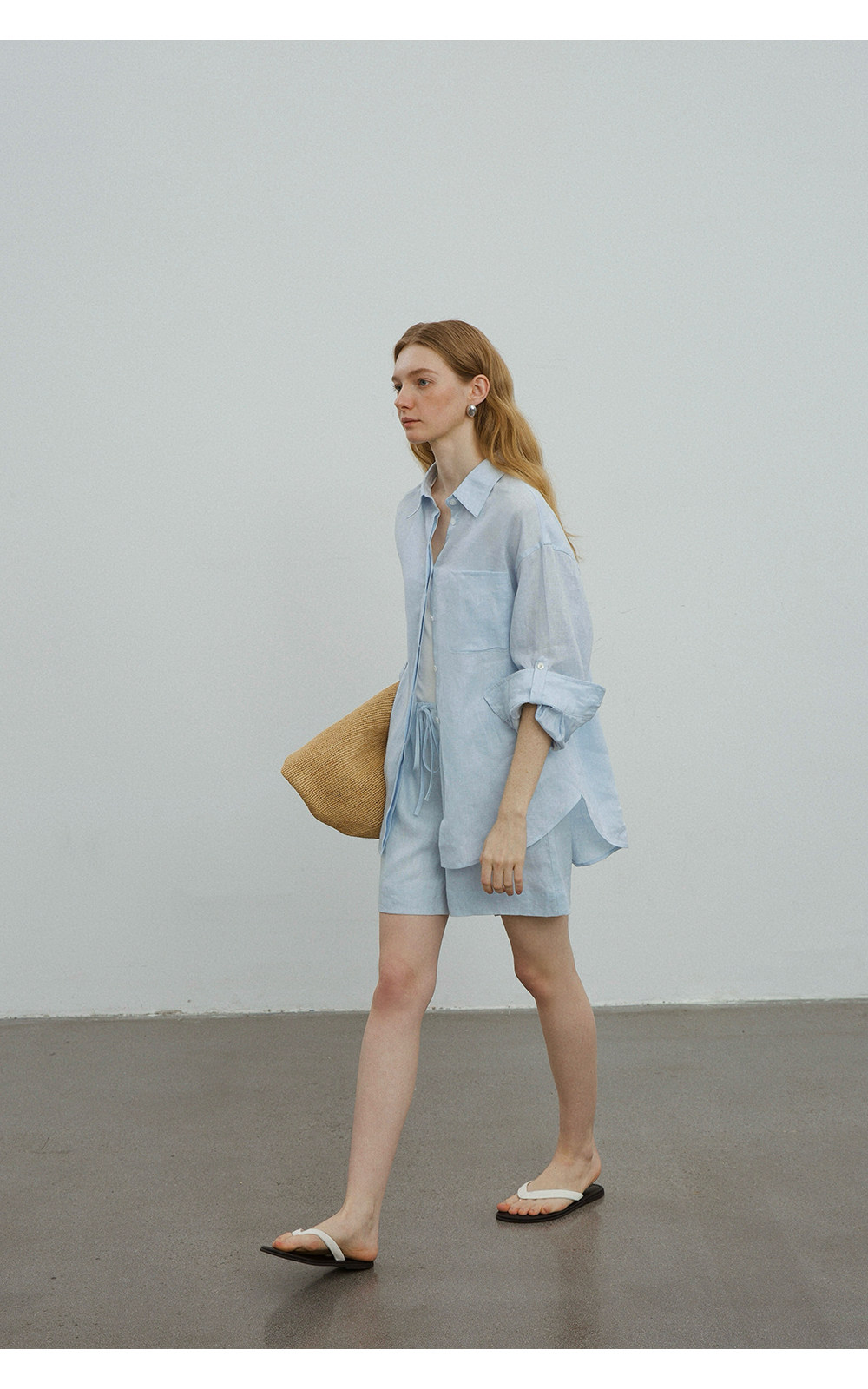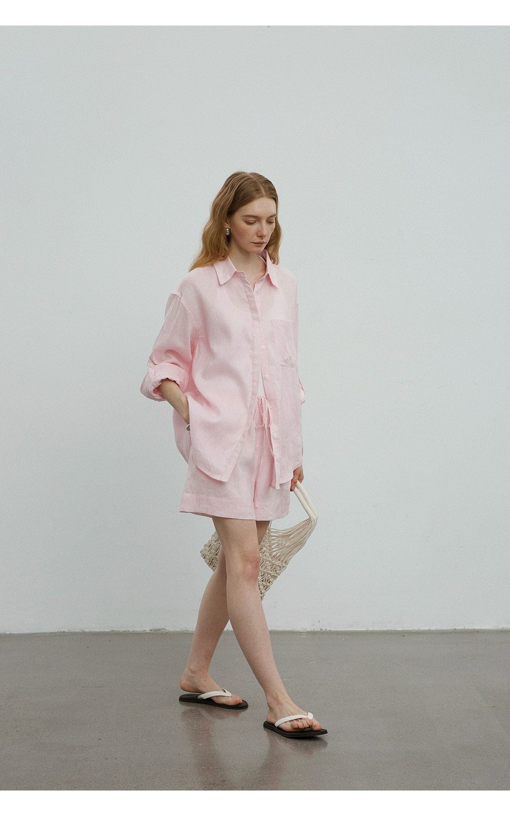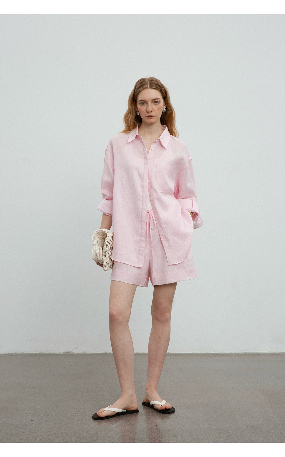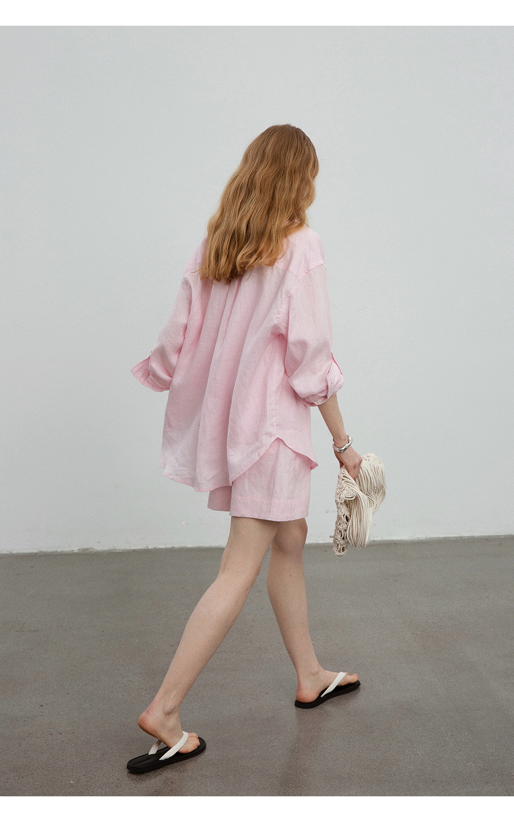 Countonme Relaxed Summer/Lazy Casual Style All-Linen Loose Shirt/Shorts Set