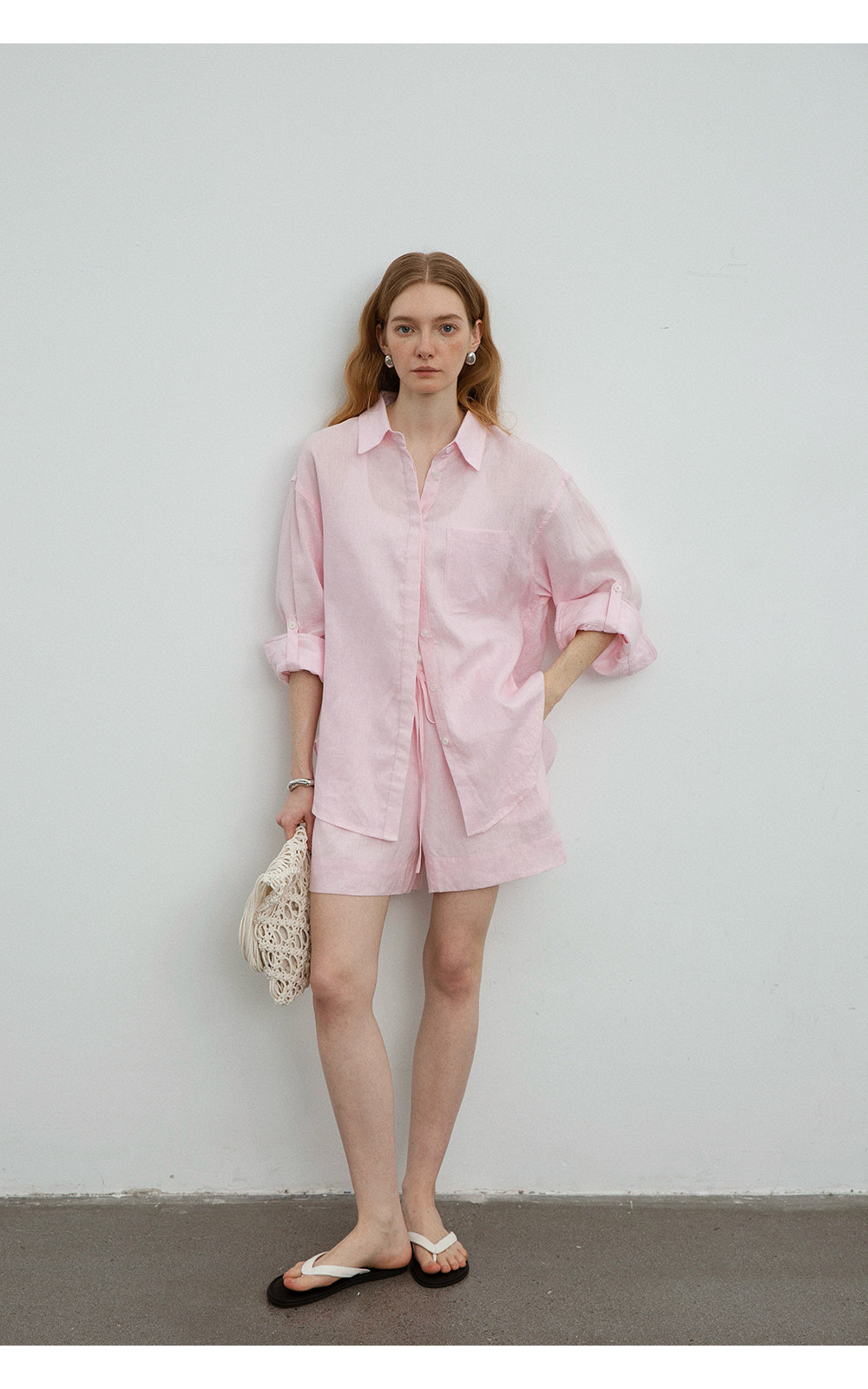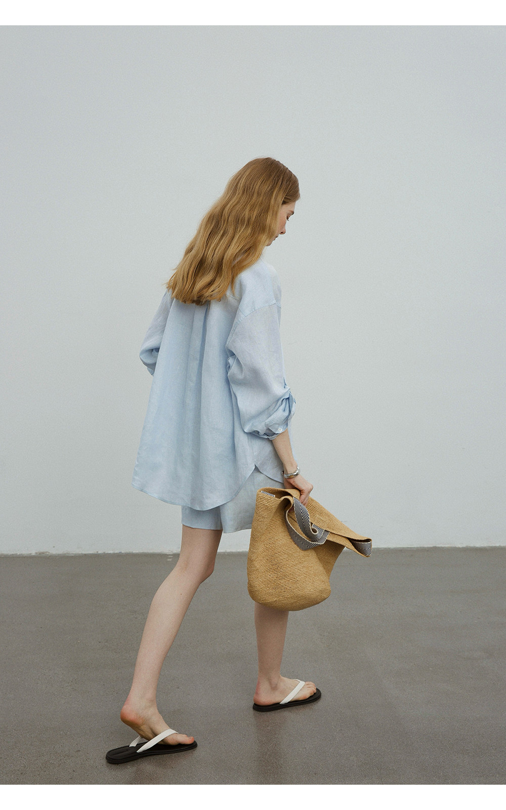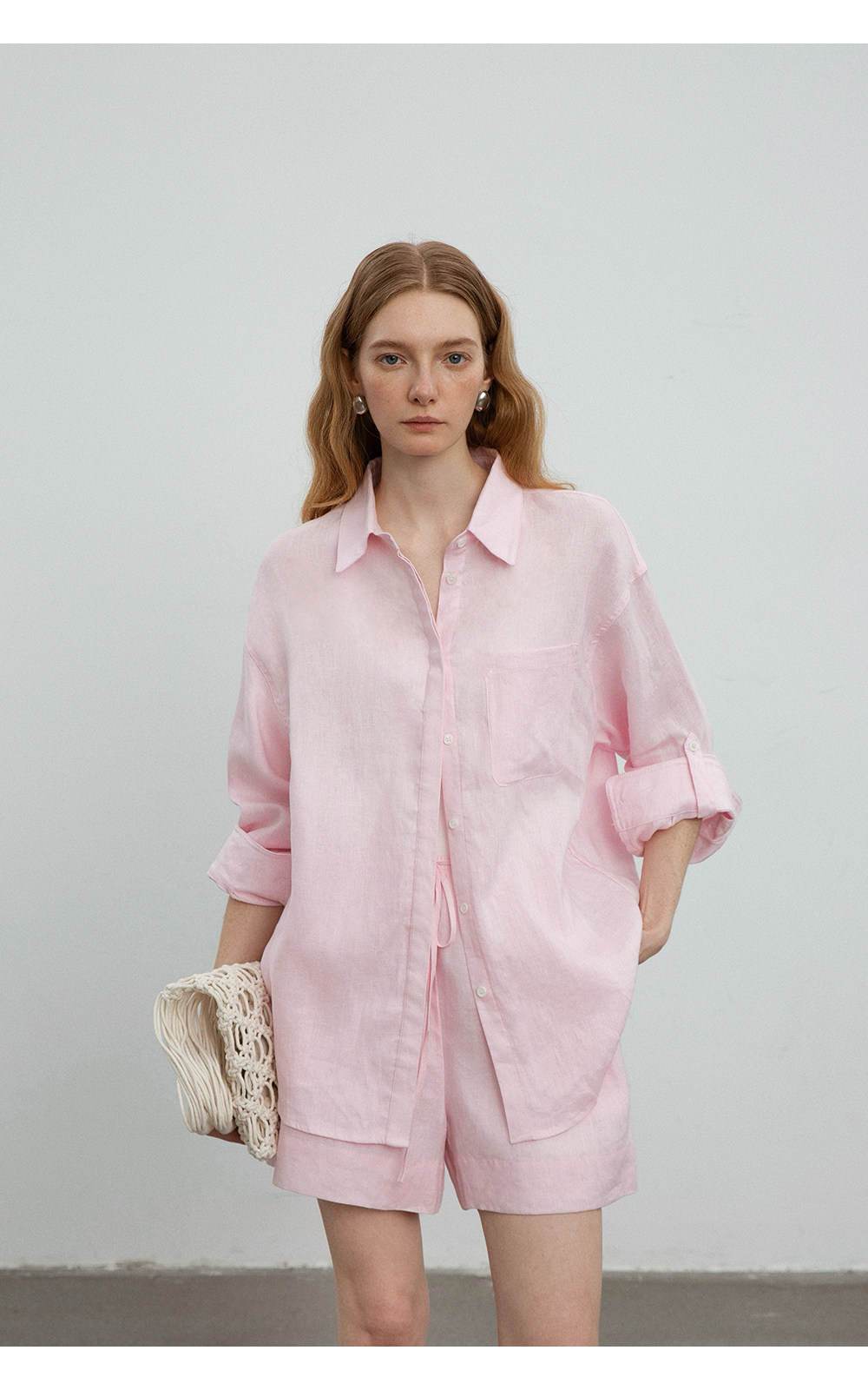 Countonme Relaxed Summer/Lazy Casual Style All-Linen Loose Shirt/Shorts Set