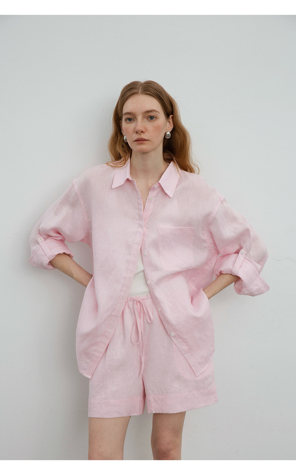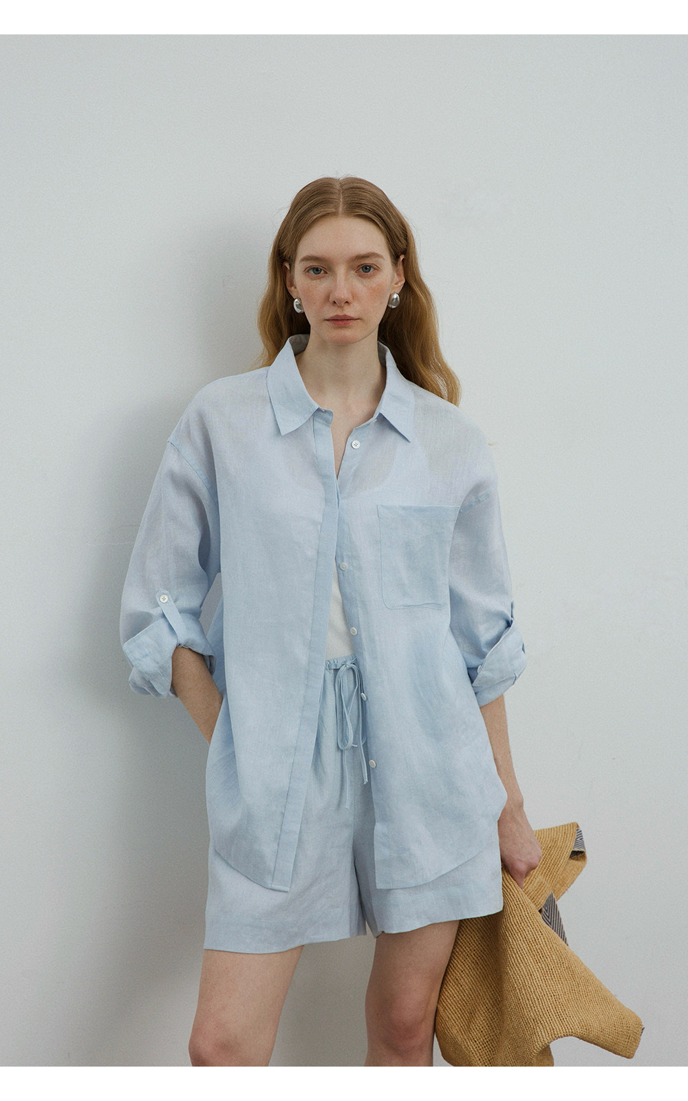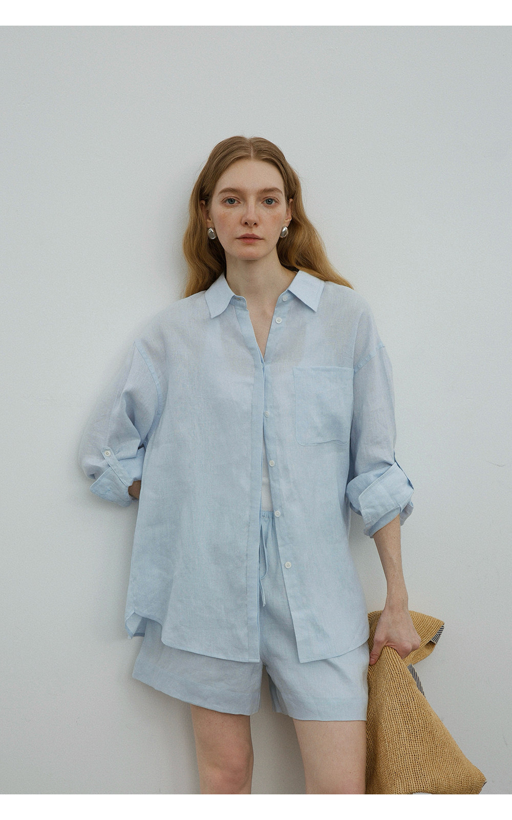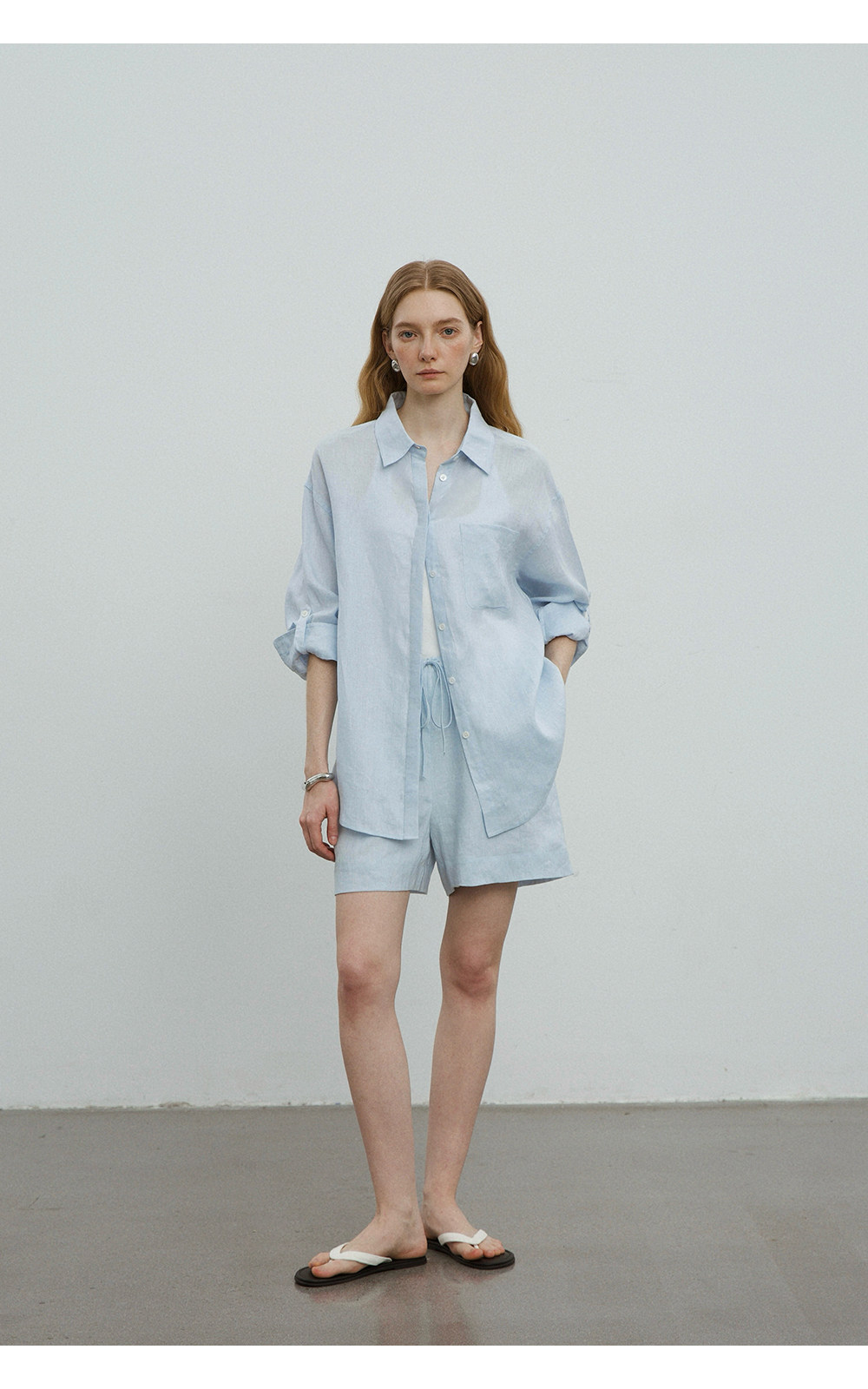 Countonme Relaxed Summer/Lazy Casual Style All-Linen Loose Shirt/Shorts Set