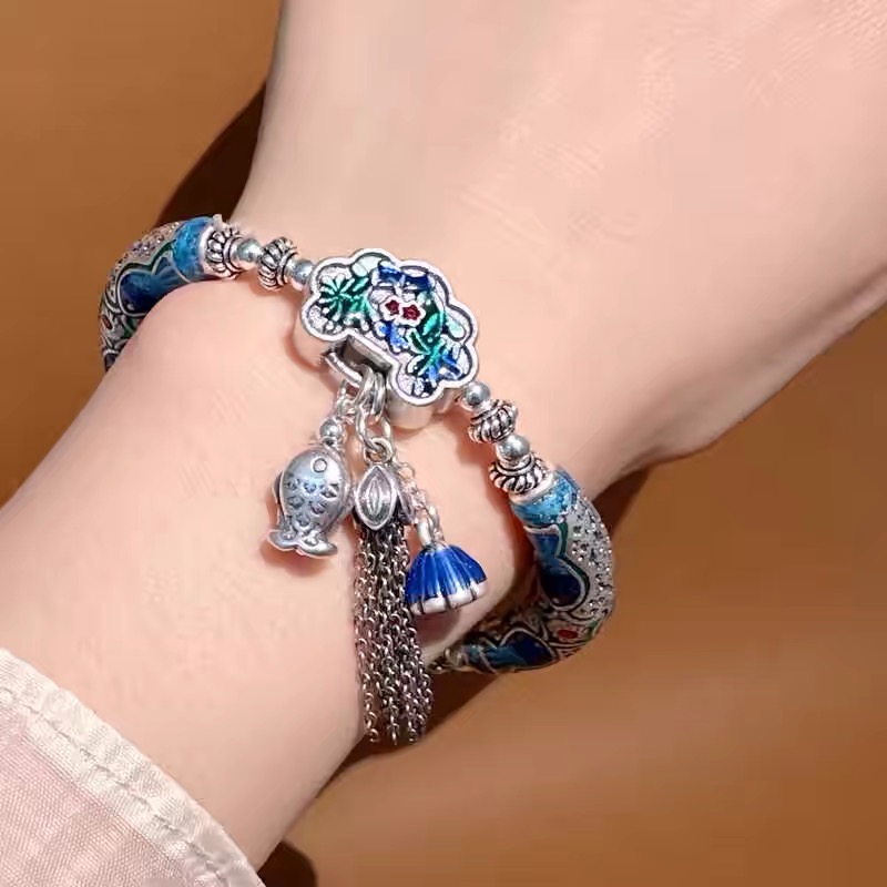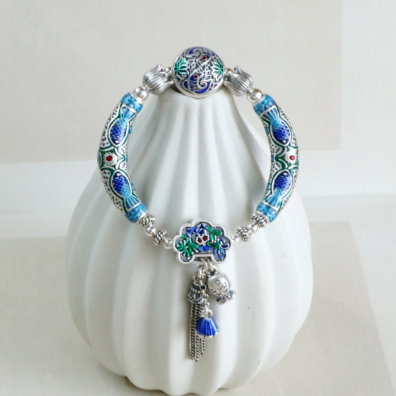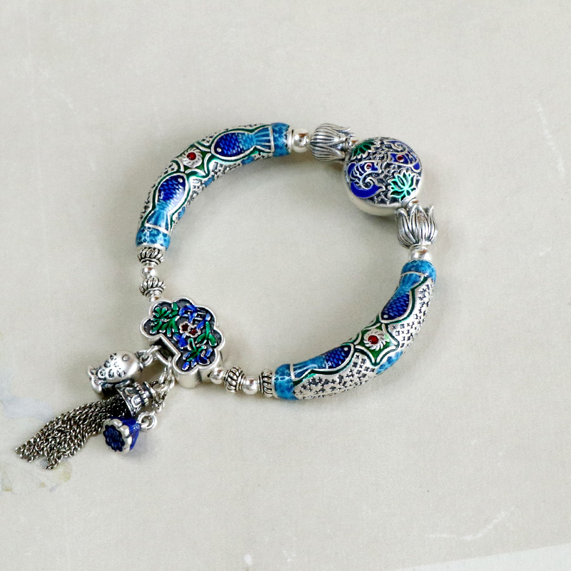 Hua Ying 925 Sterling Silver Double Fish Curved Tube Bracelet with Burnt Blue Craftsmanship, New Chinese Style Accessory Bracelet with Copper Coin Charms, Gift