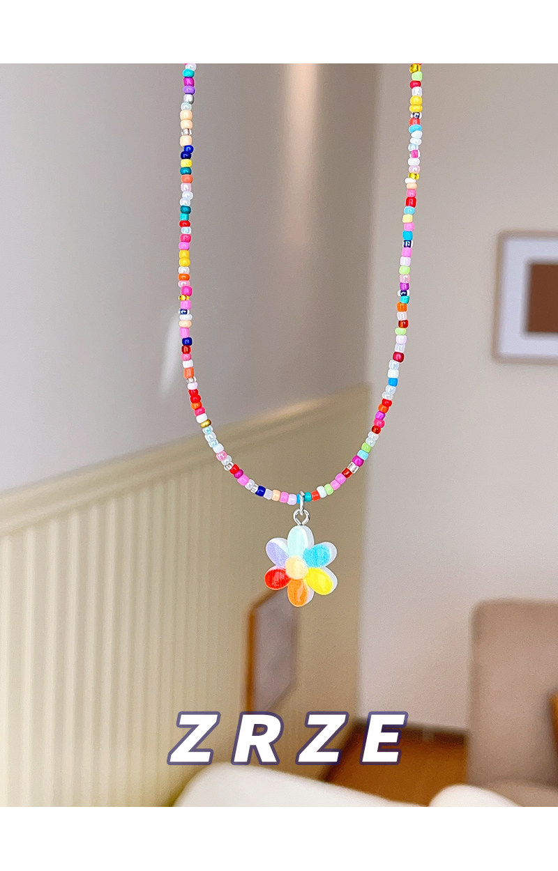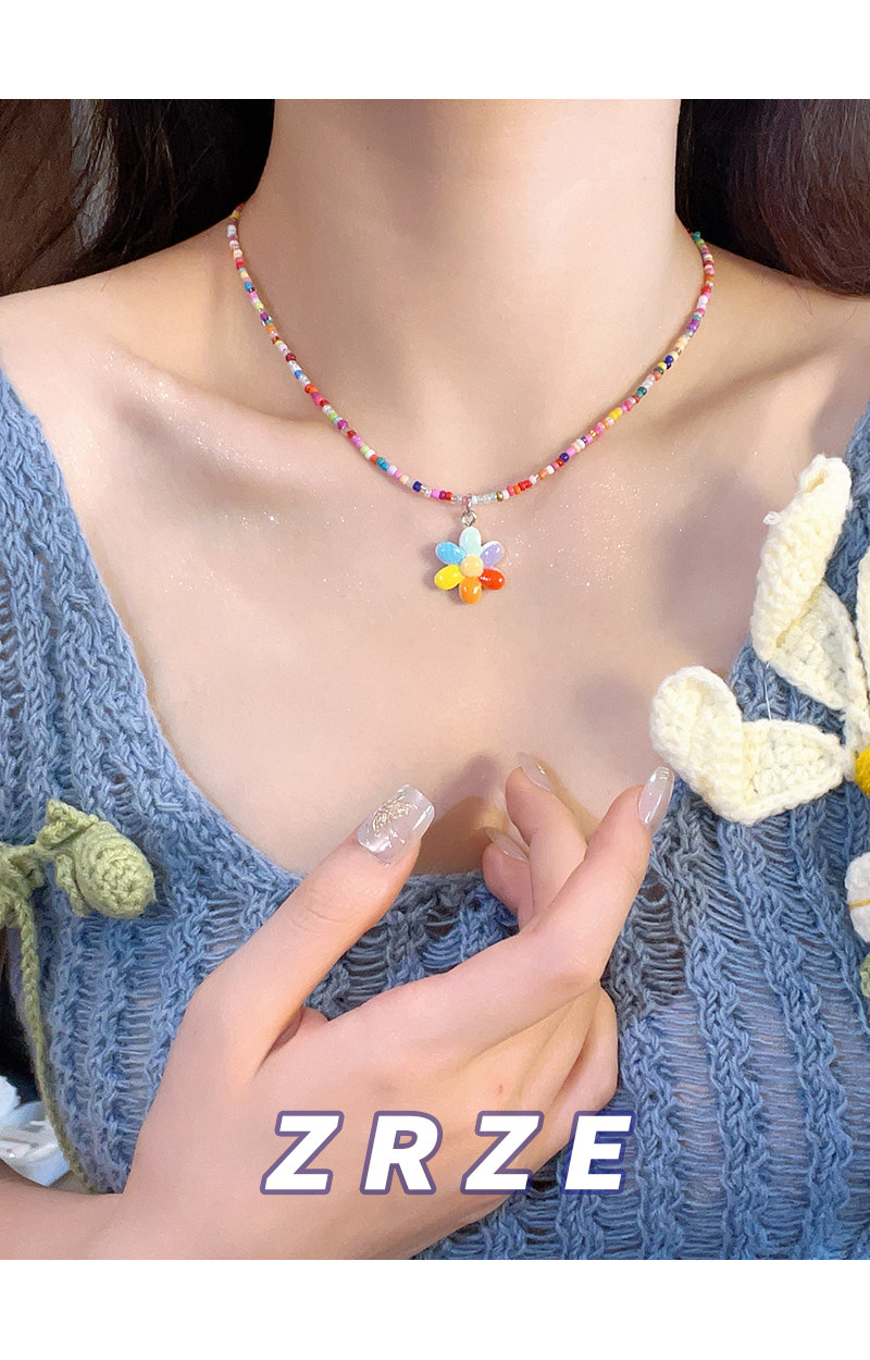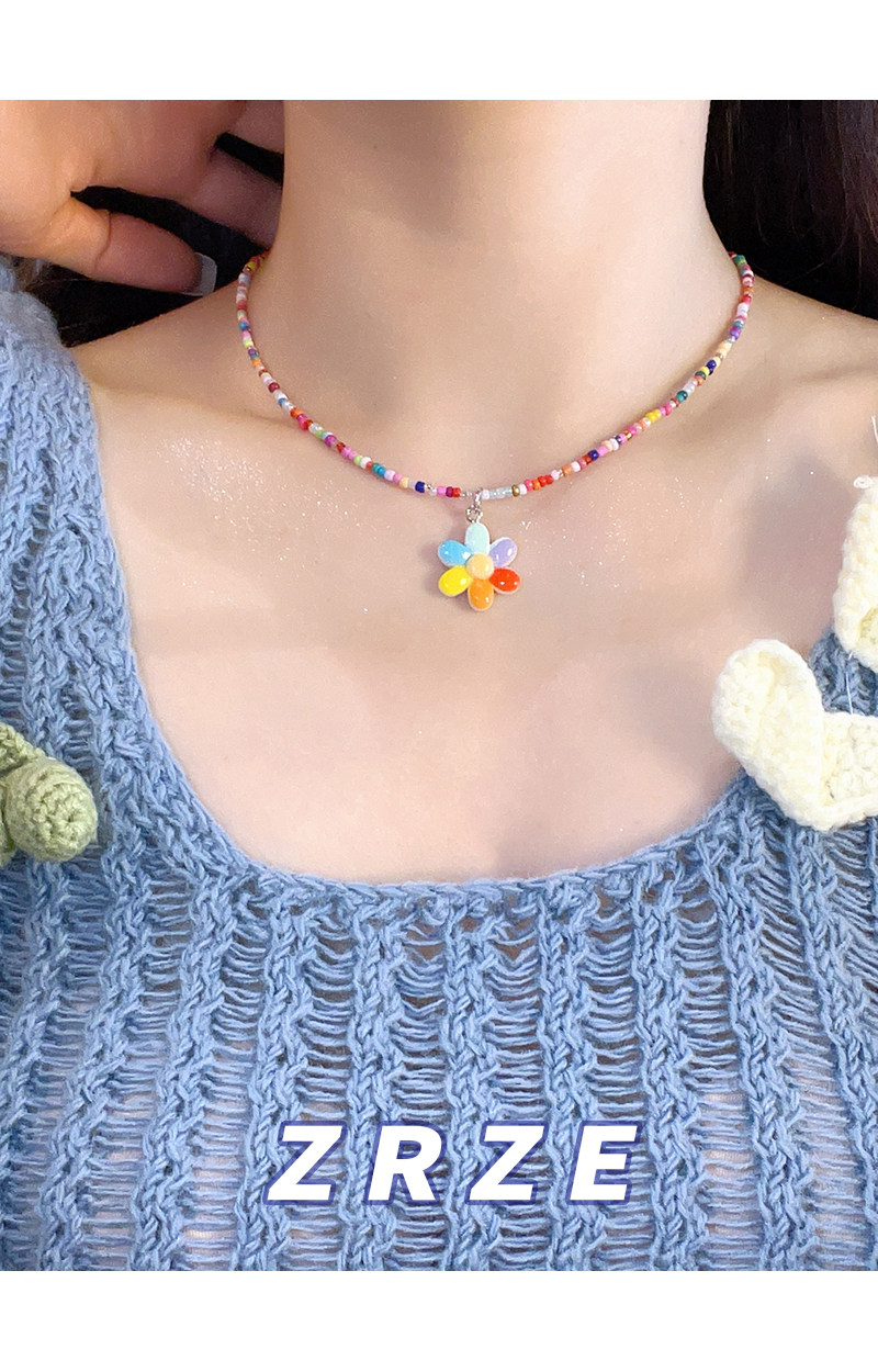 Zrze Summer Dopamine Rainbow Flower Necklace for Women Sweet Colorful Beaded Pendant Cute Girly Heart Clavicle Chain