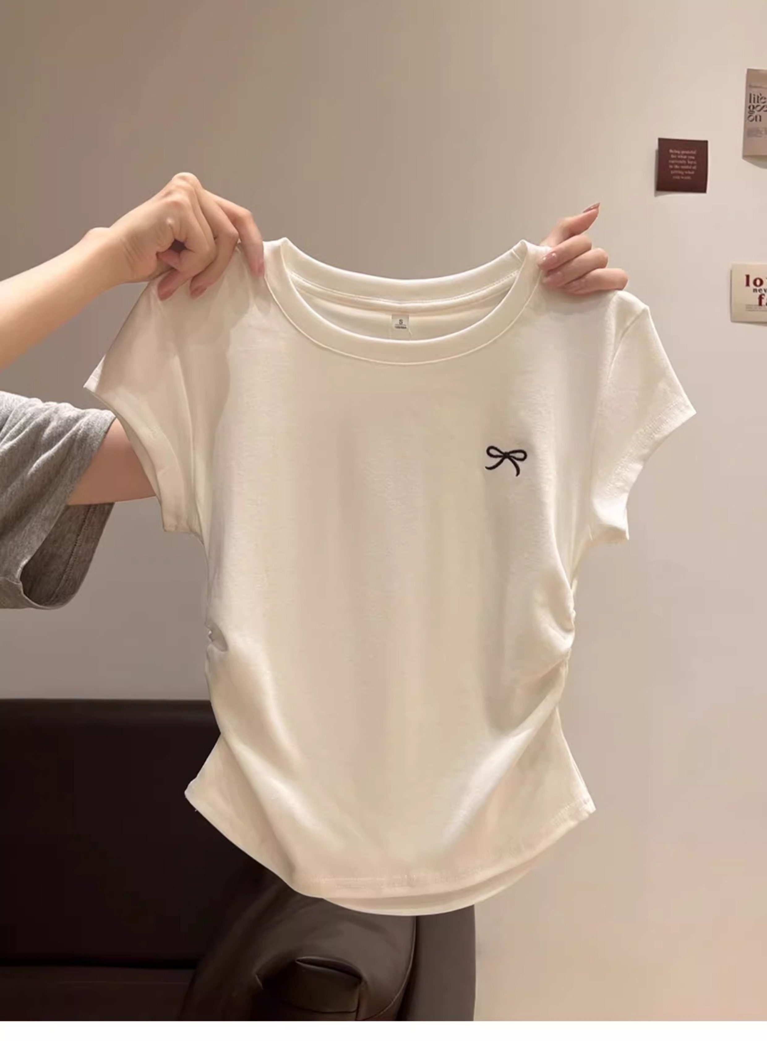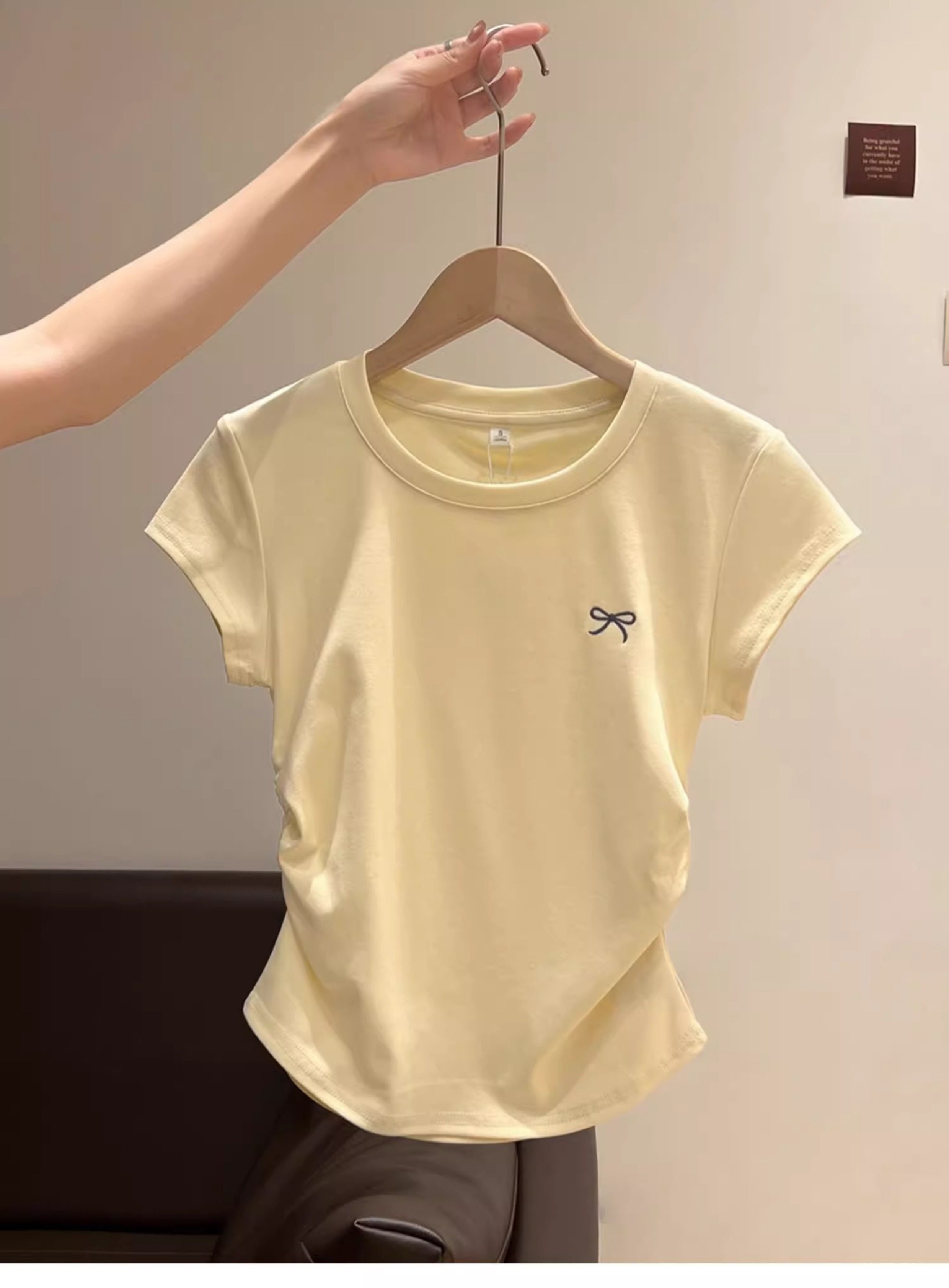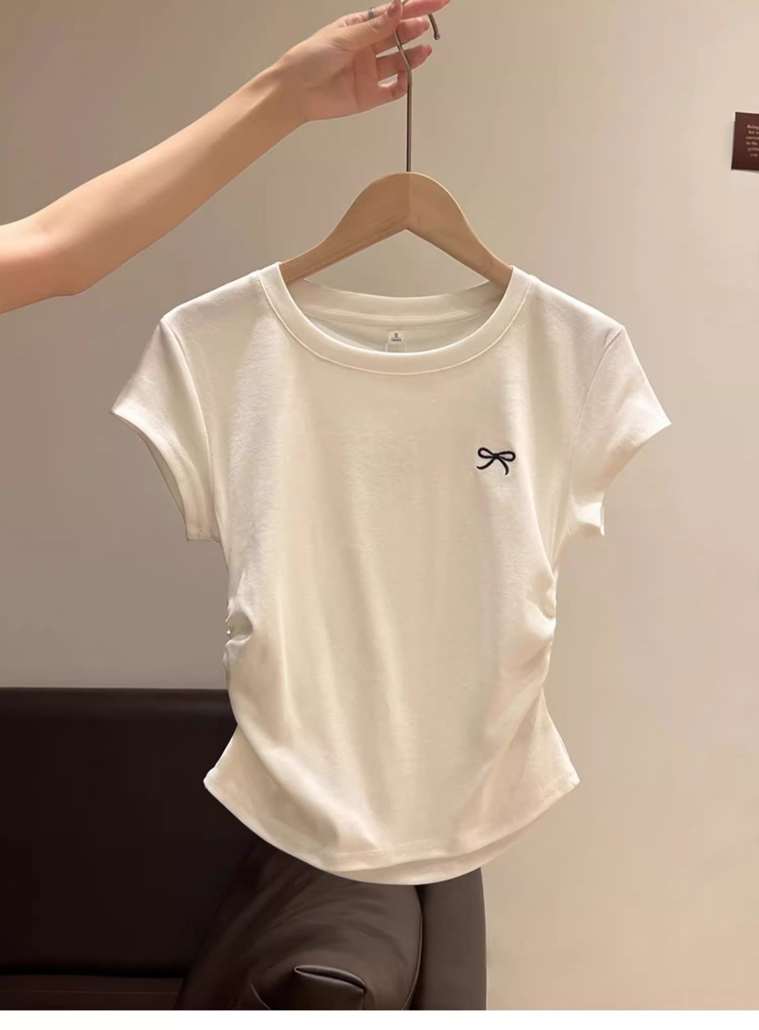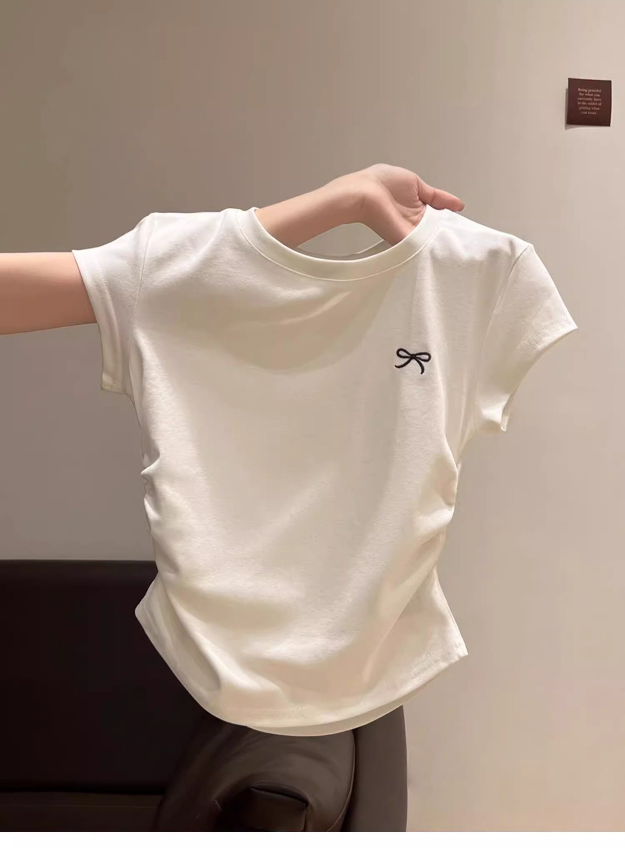 La Chapelle Cream-Colored Short-Sleeve T-Shirt for Women, Summer 2025 New Slim-Fit Ruched Waist Bow Top