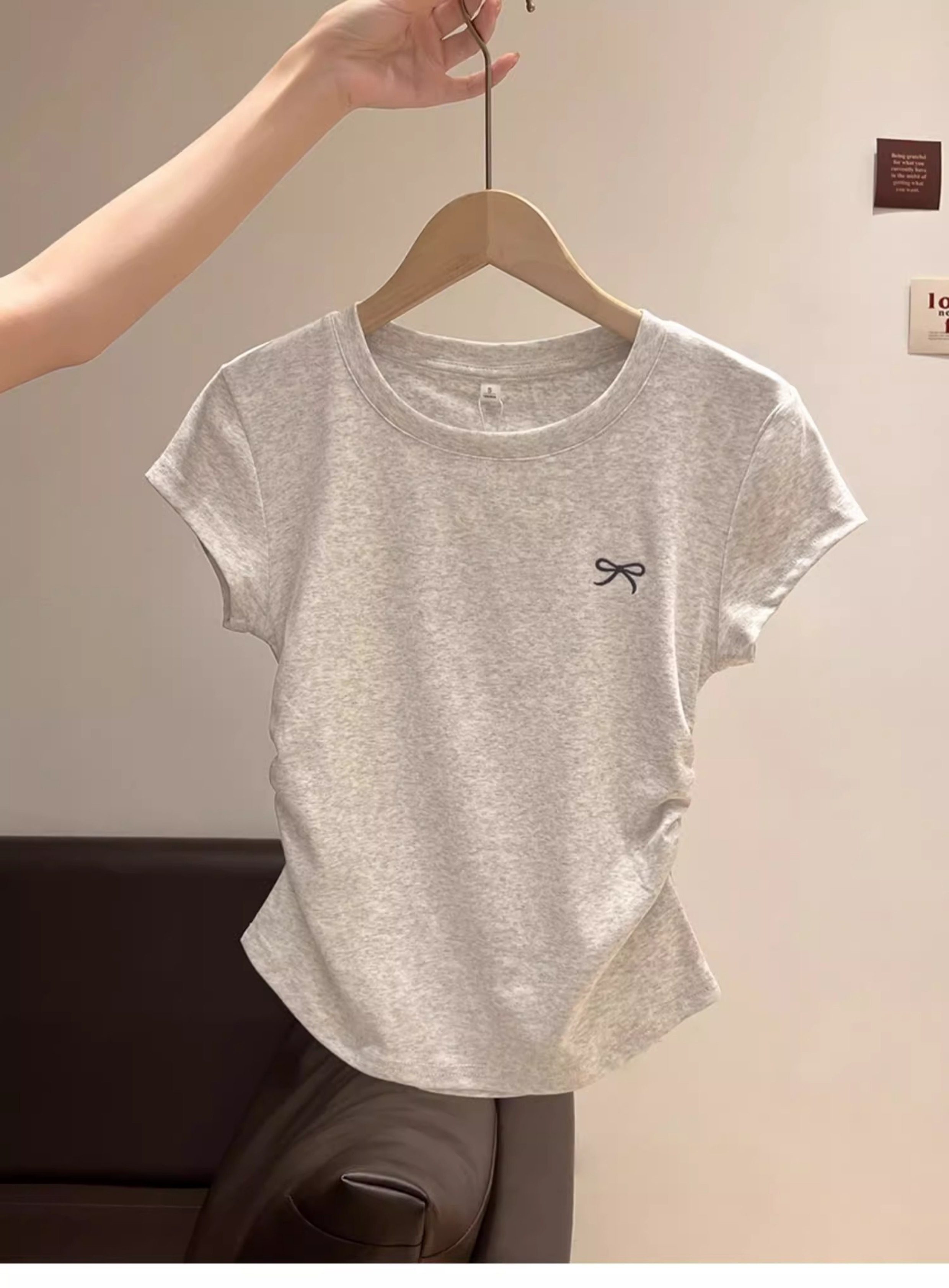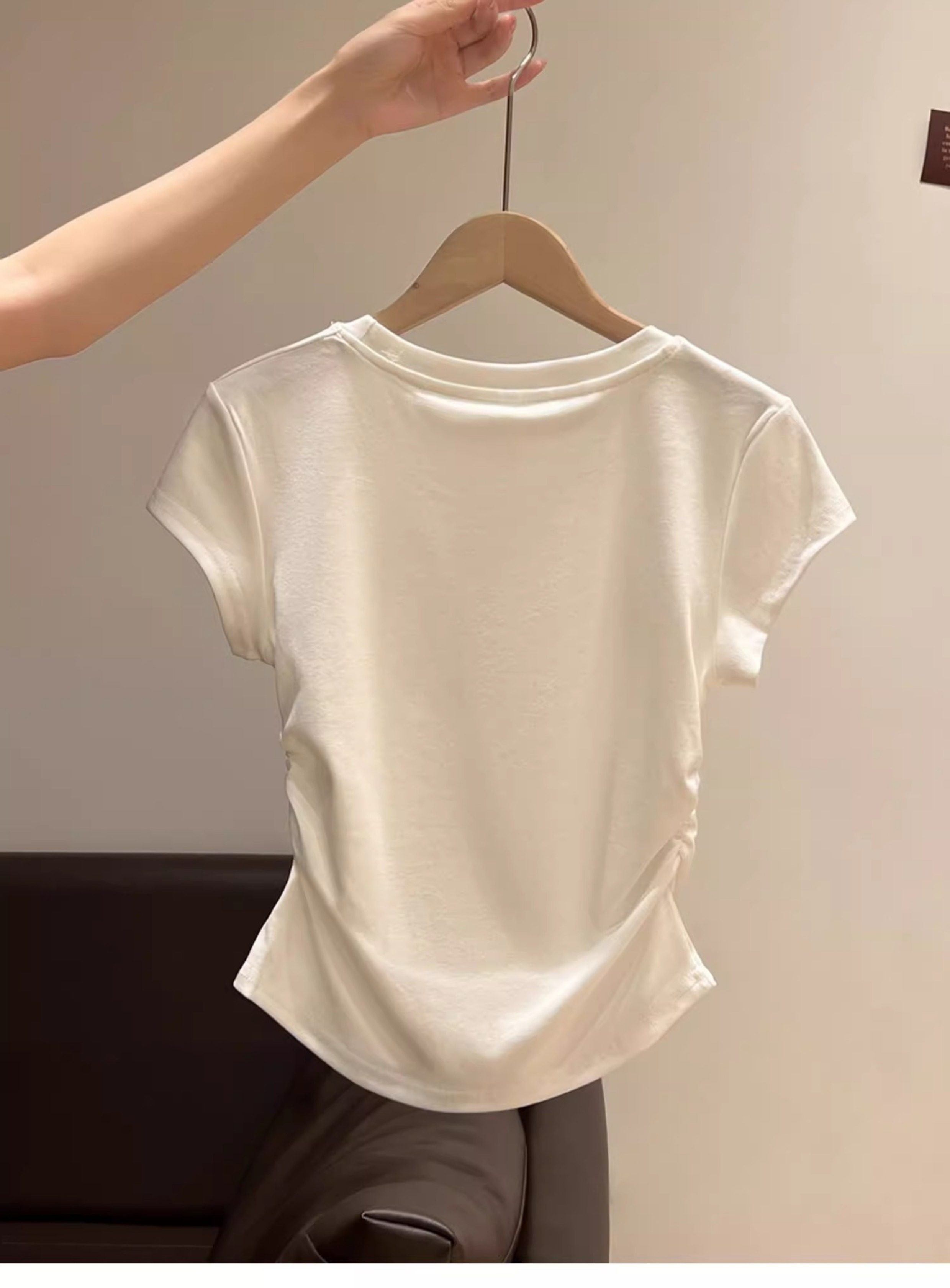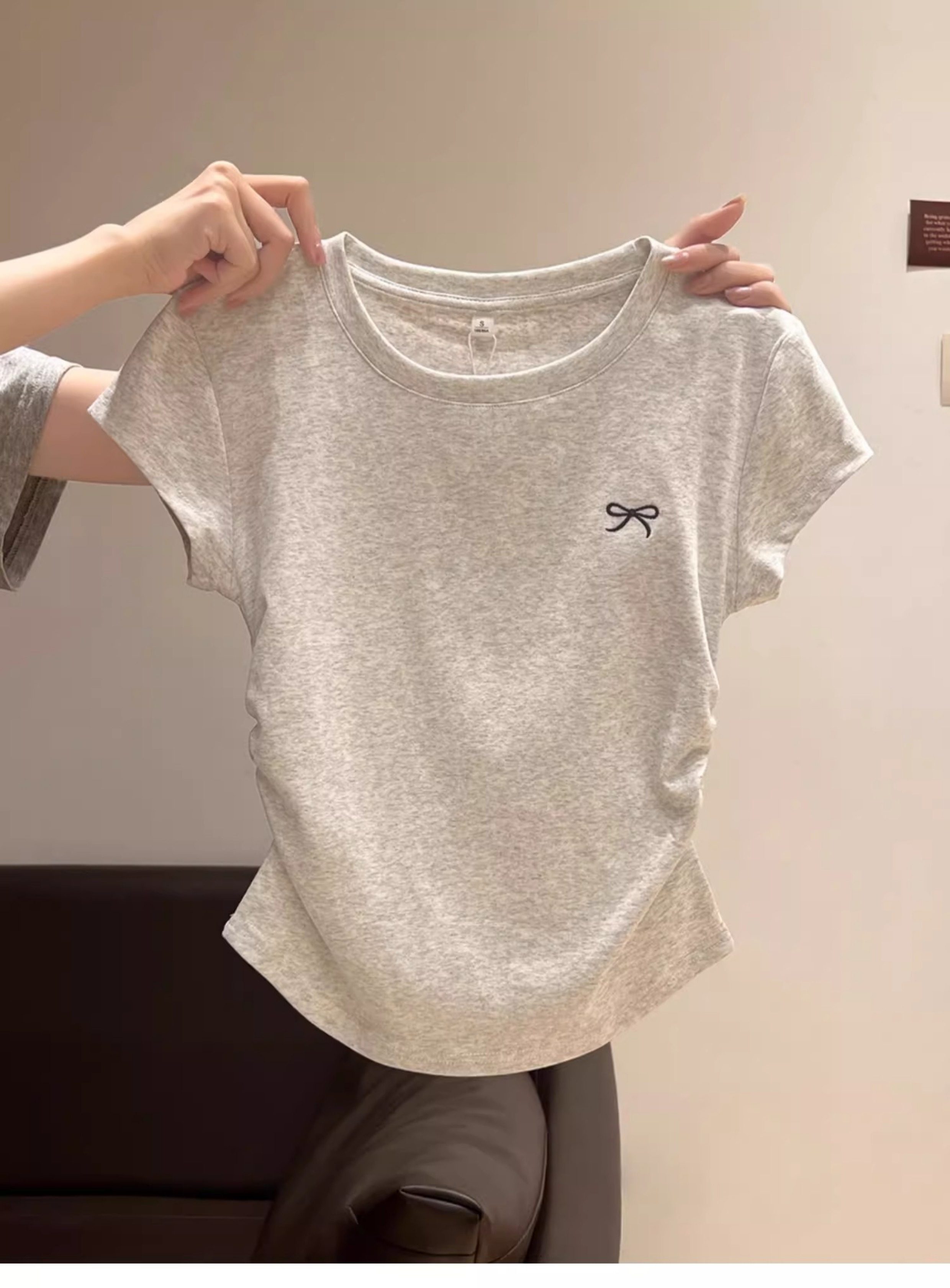 La Chapelle Cream-Colored Short-Sleeve T-Shirt for Women, Summer 2025 New Slim-Fit Ruched Waist Bow Top