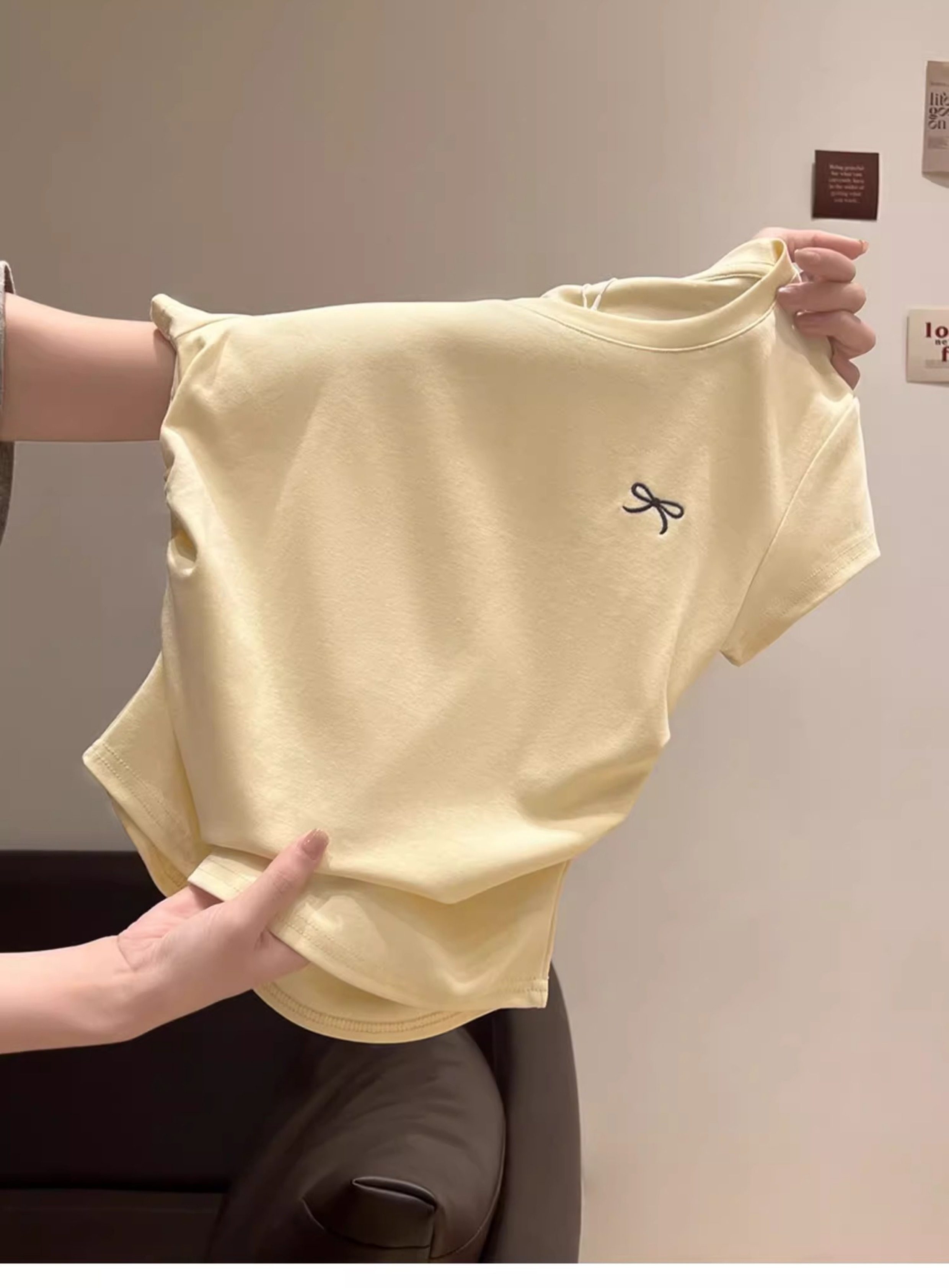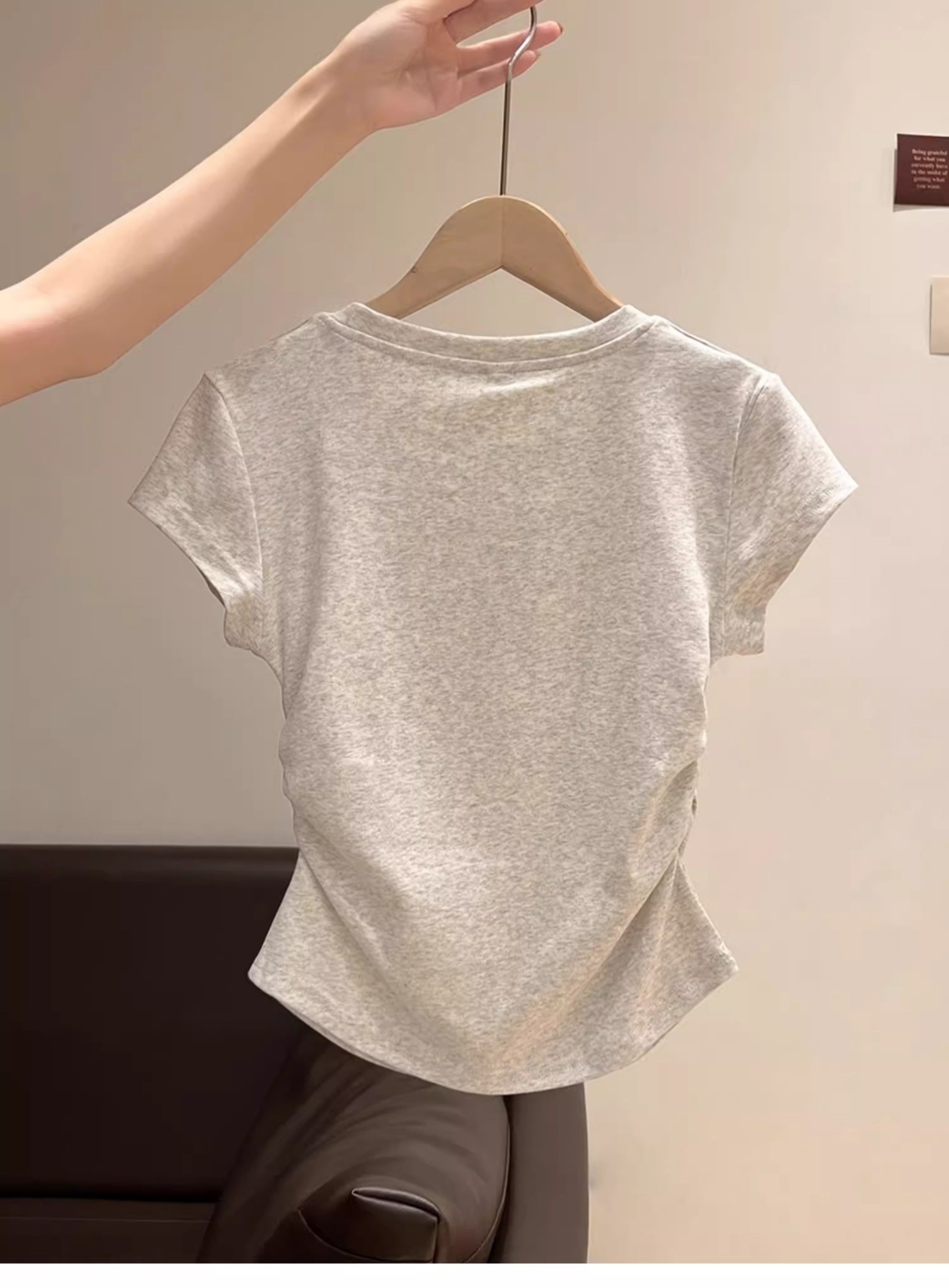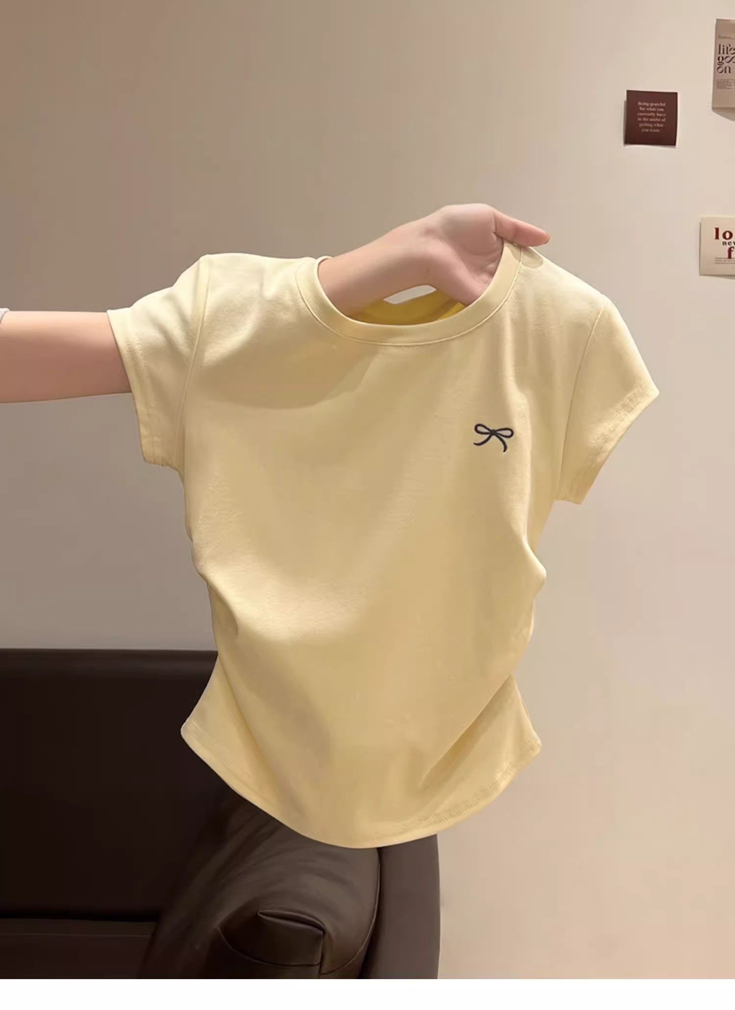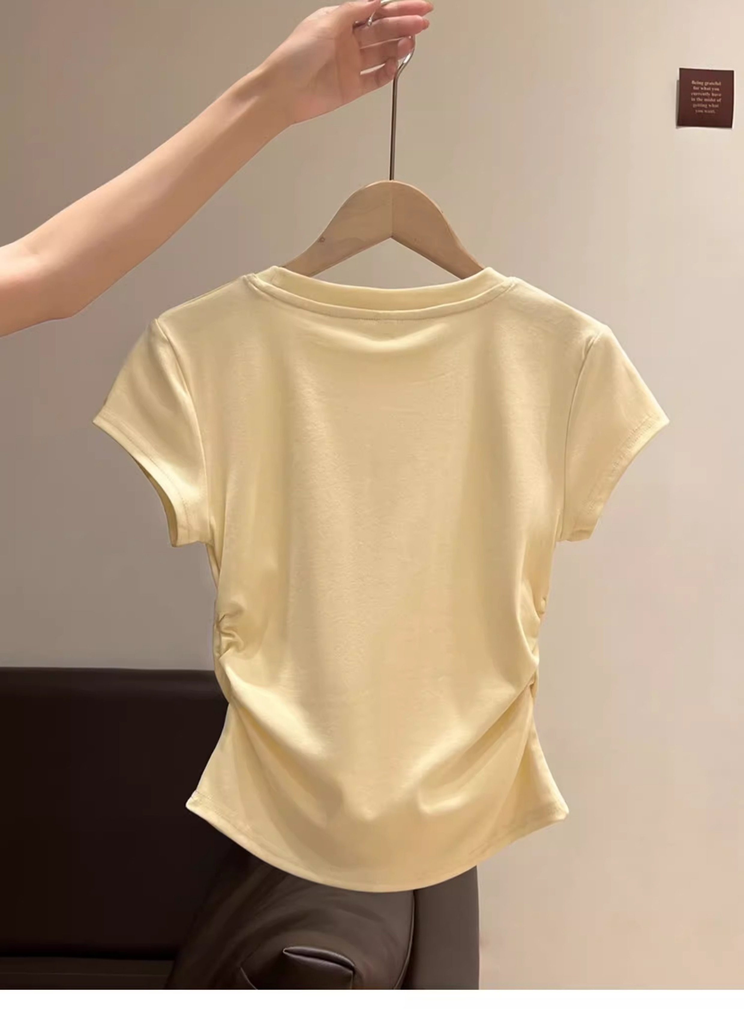 La Chapelle Cream-Colored Short-Sleeve T-Shirt for Women, Summer 2025 New Slim-Fit Ruched Waist Bow Top