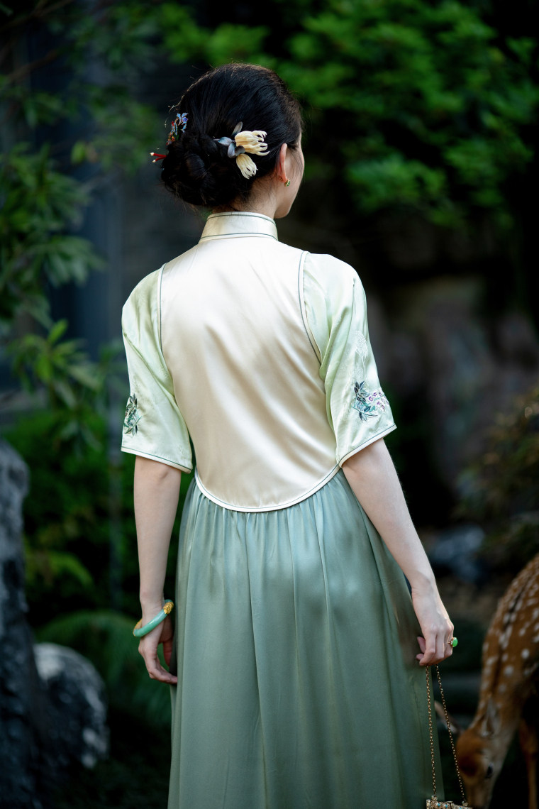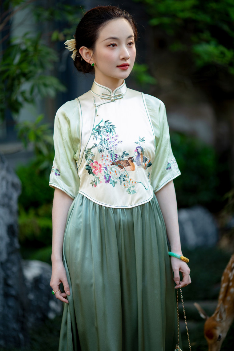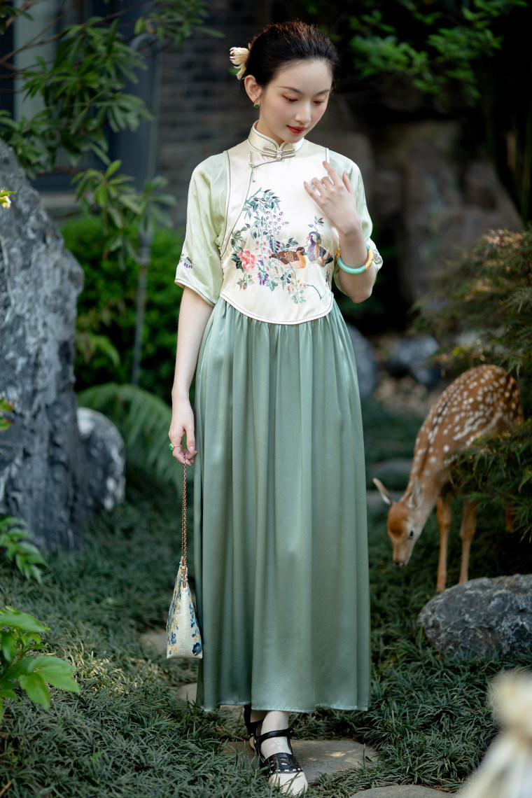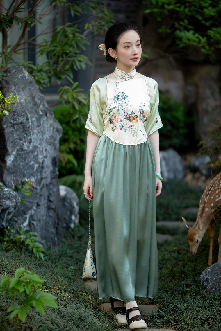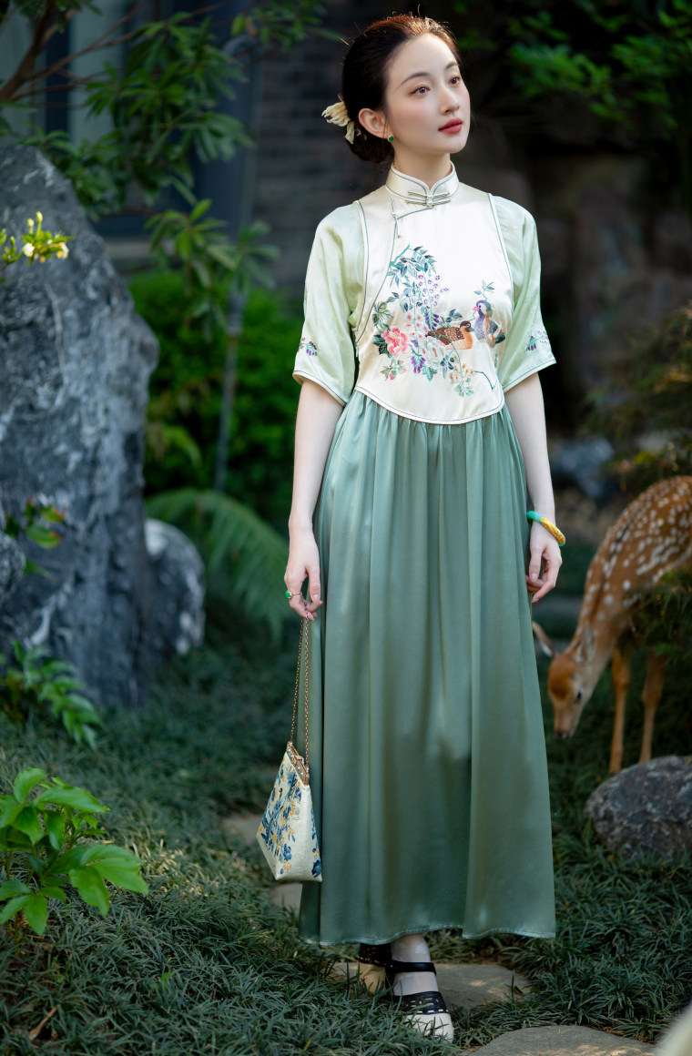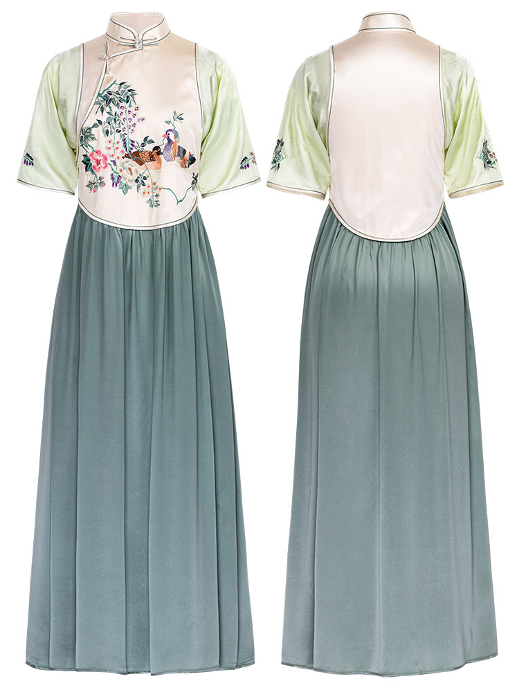 Green Ripple Double-Function | 2025 Summer New Style | Silk Satin Embroidered Fake Three-Piece Cheongsam Chinese Style Dress