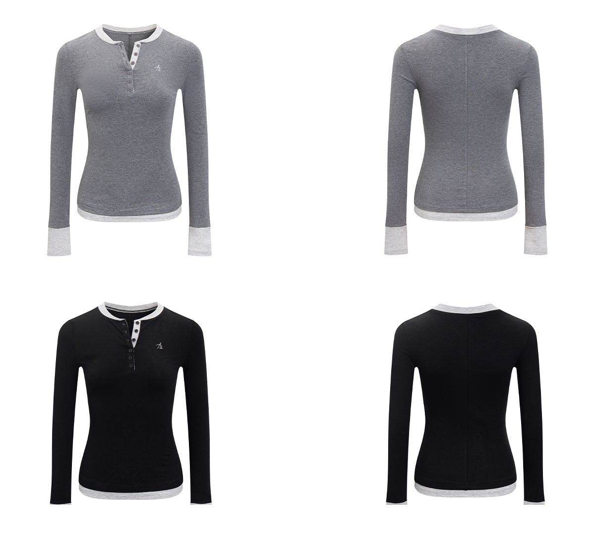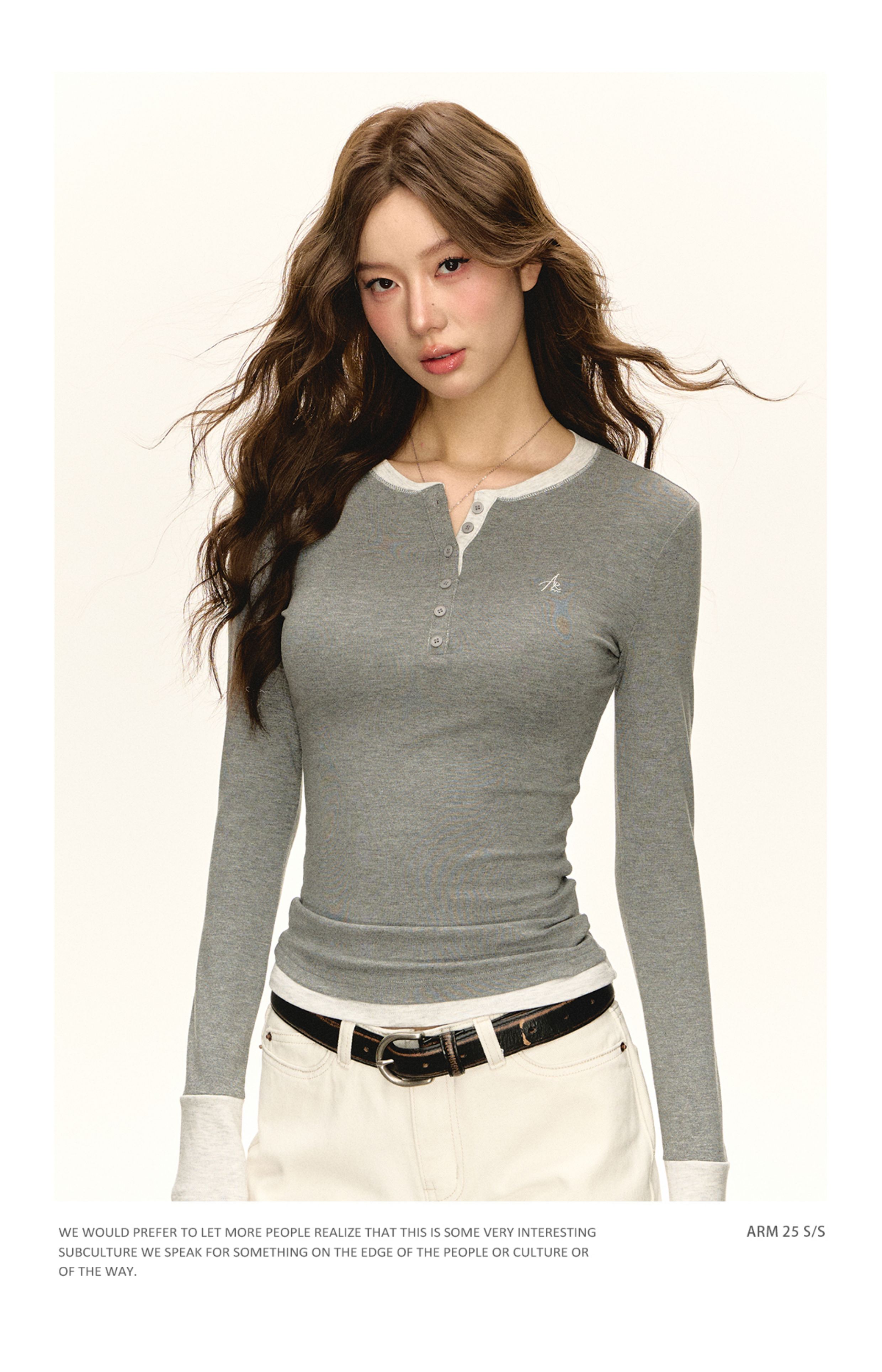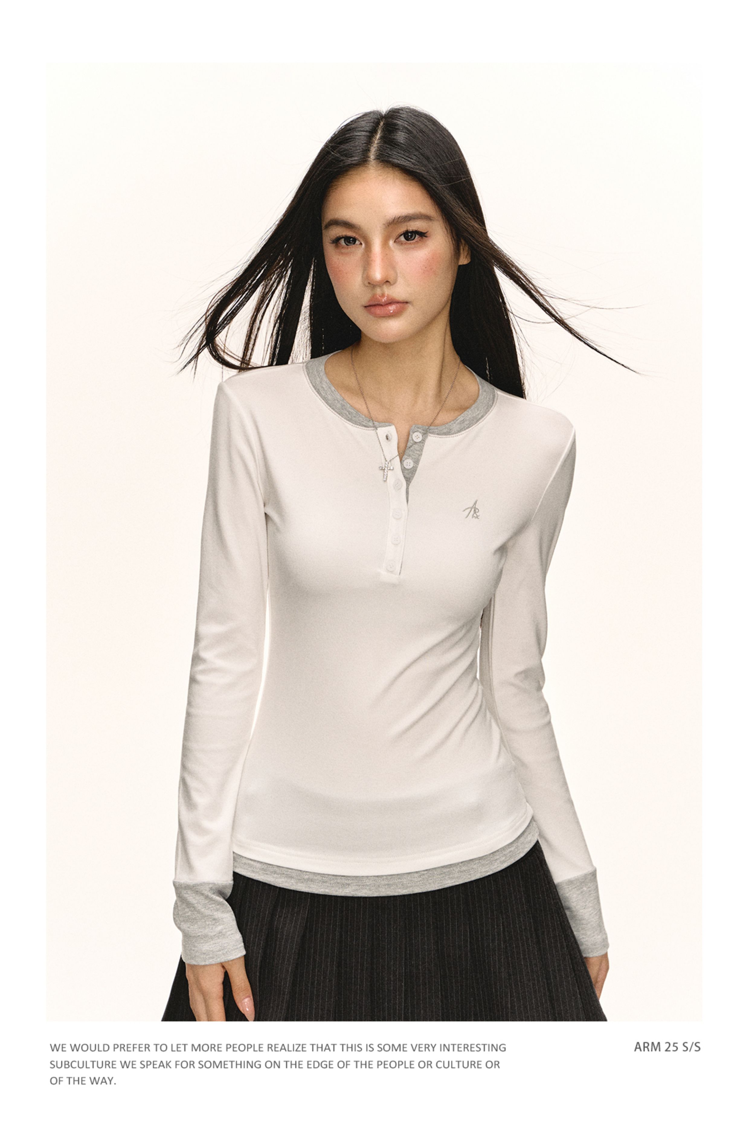 Ariseism American Retro Design Henley Collar Fake Two-Piece Long-Sleeved T-Shirt for Women Autum New Slim Fit Top
