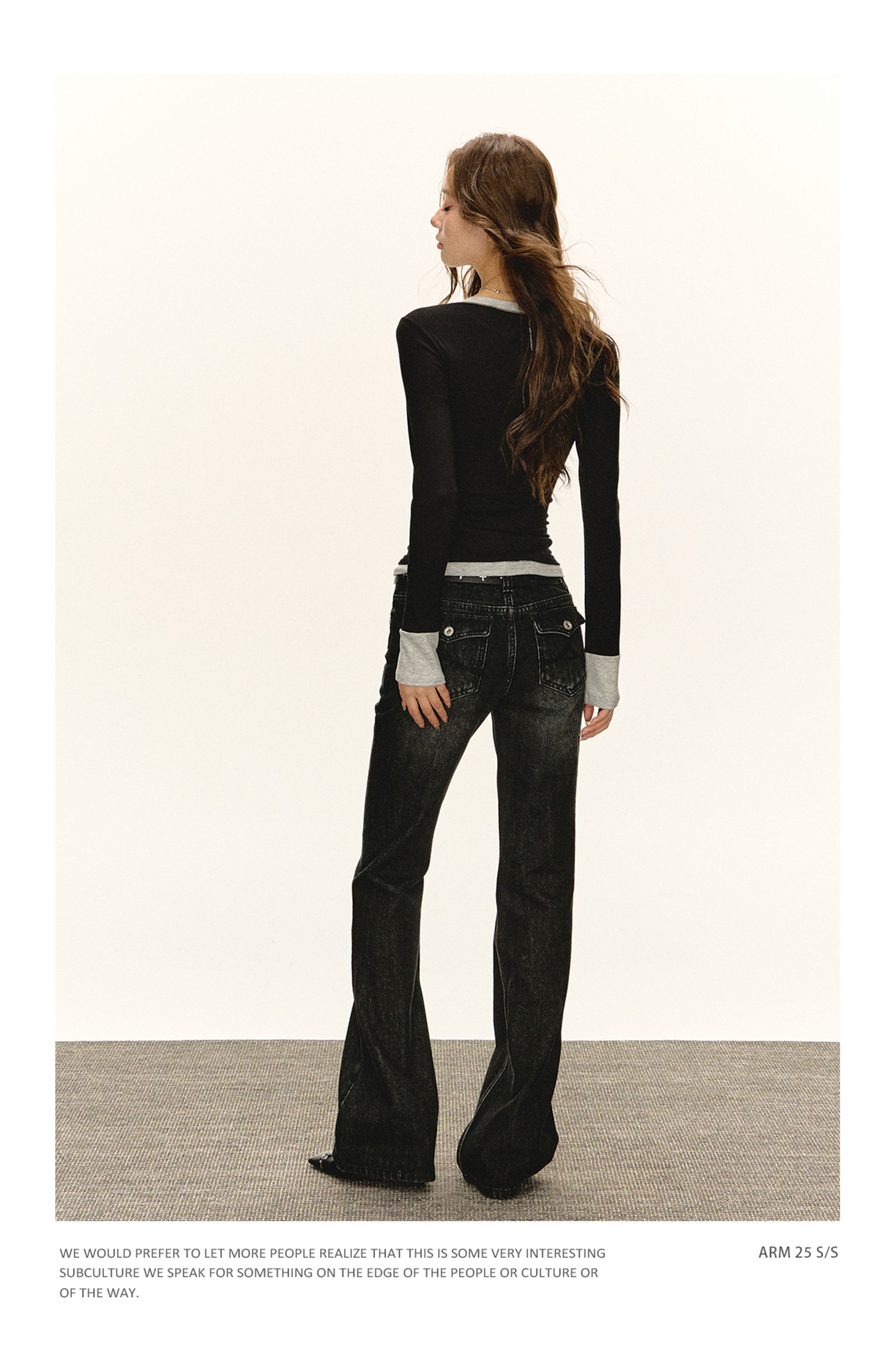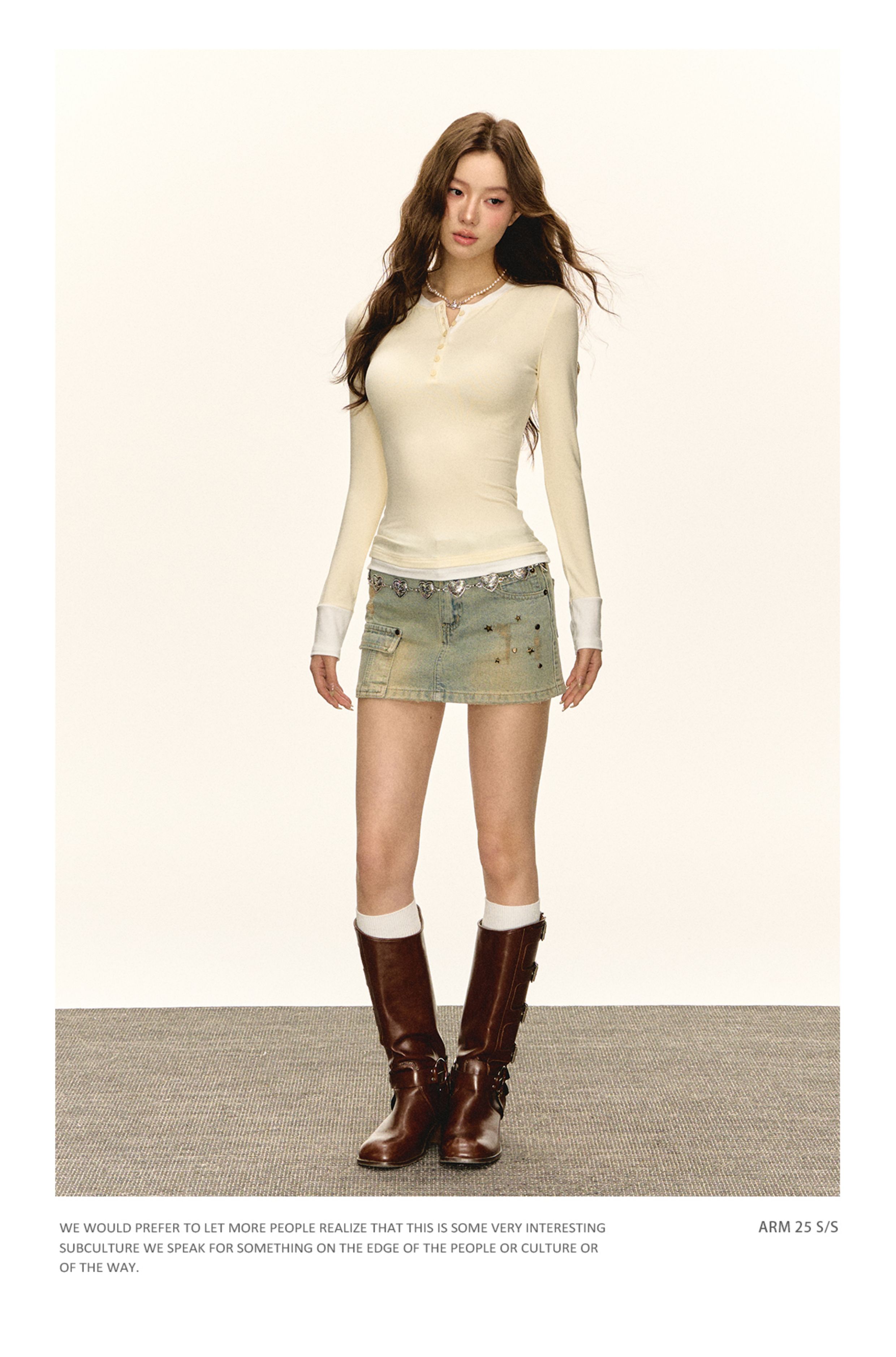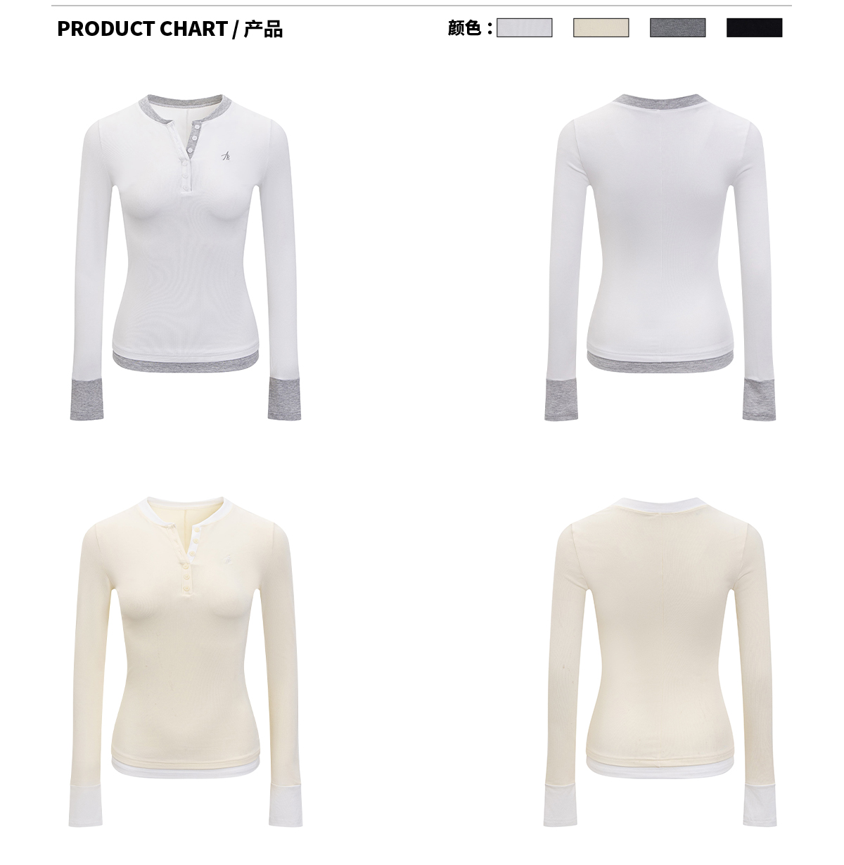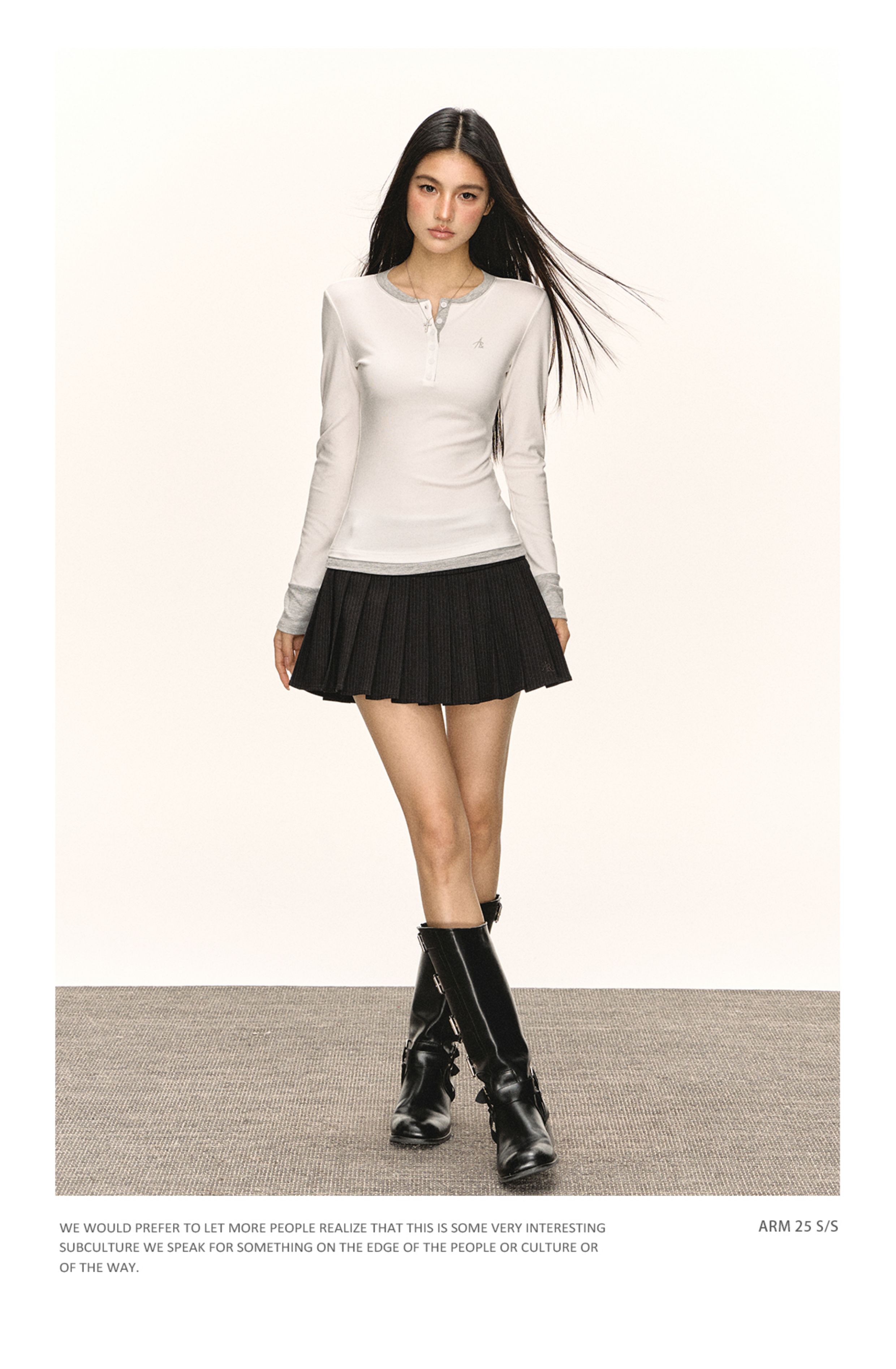 Ariseism American Retro Design Henley Collar Fake Two-Piece Long-Sleeved T-Shirt for Women Autum New Slim Fit Top