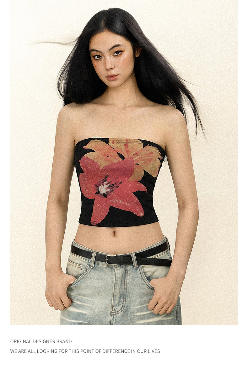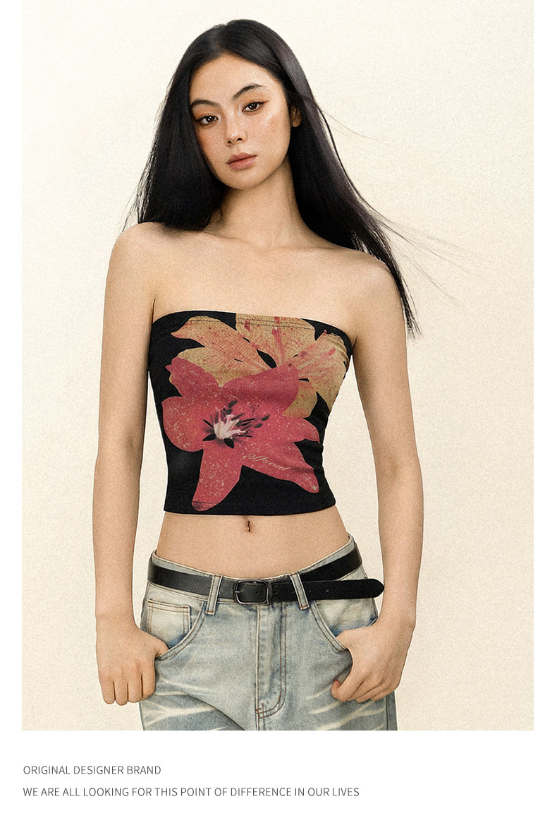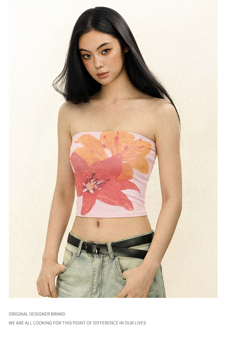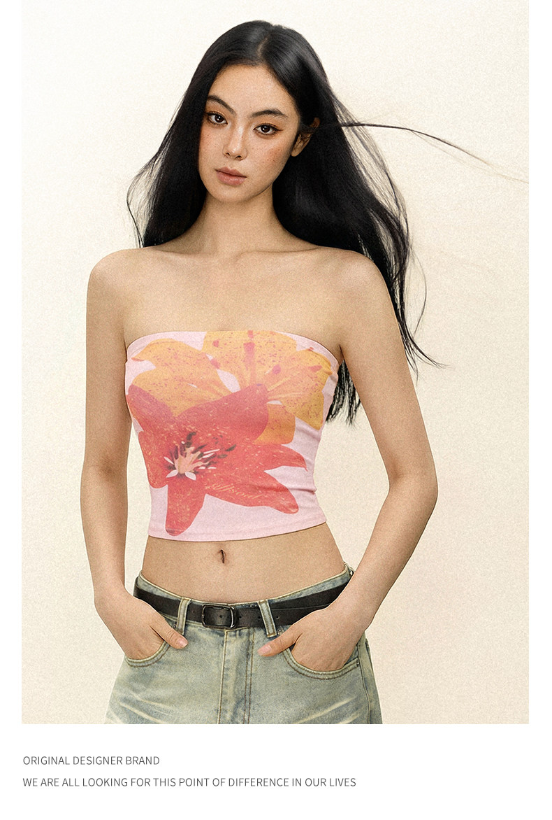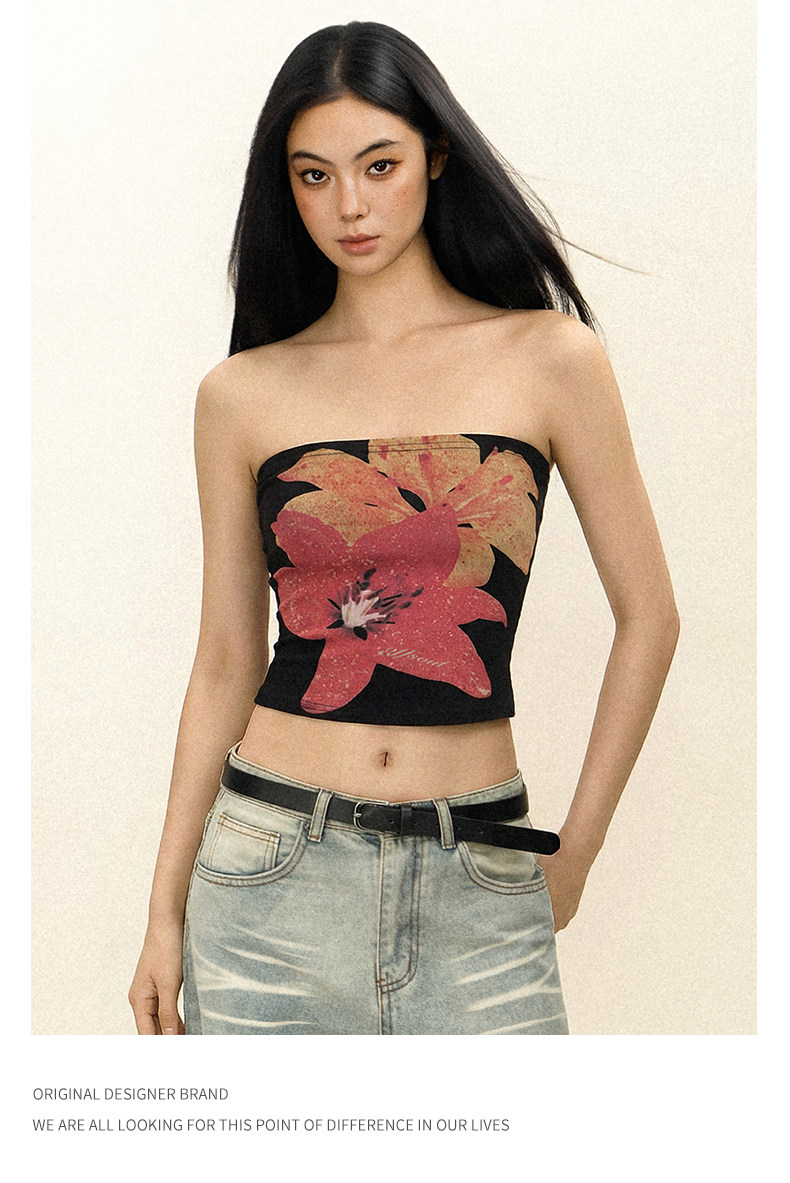 Offsoul American Retro Tropical Flower Tube Top Camisole Summer Island Hottie Tight-Fitting Chest-Wrapped Top for Women