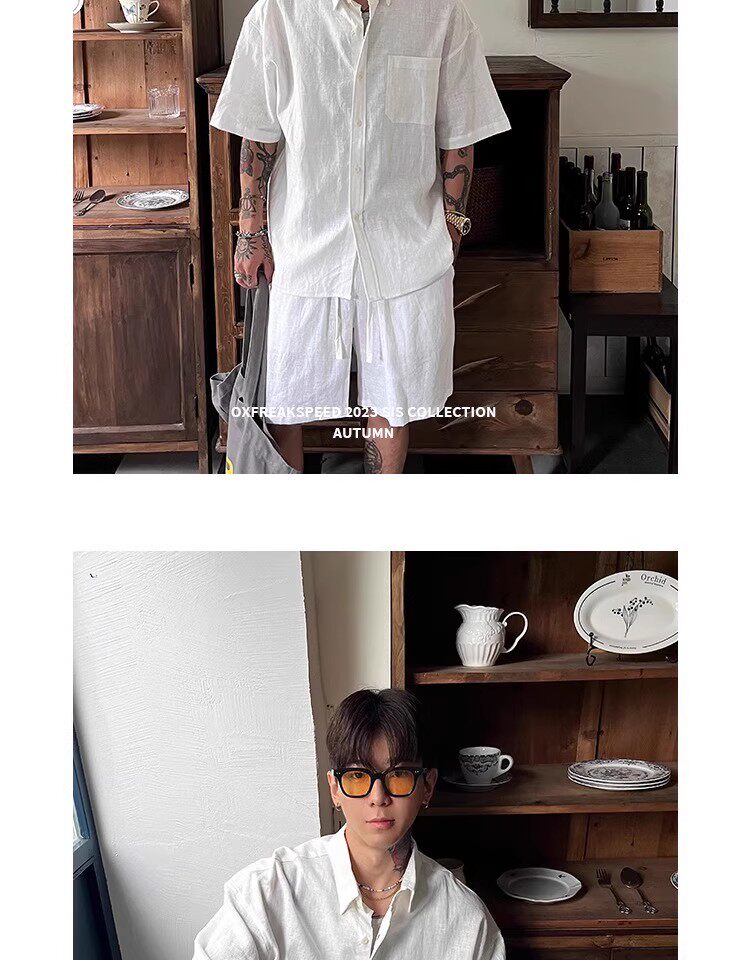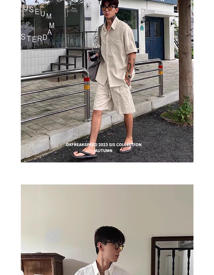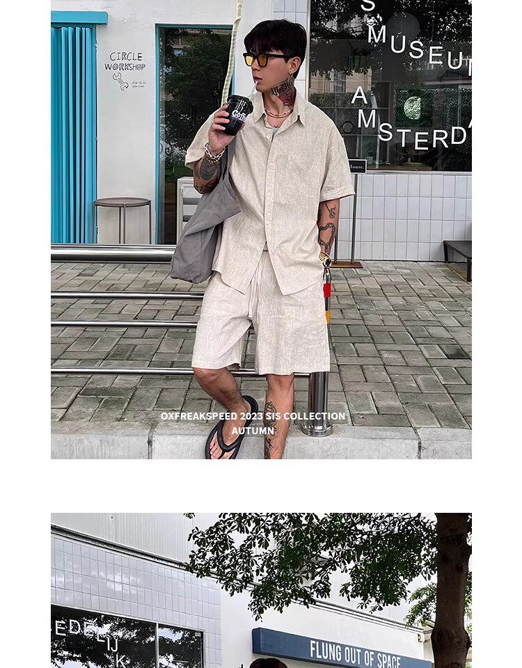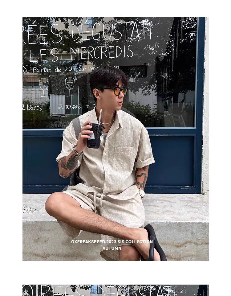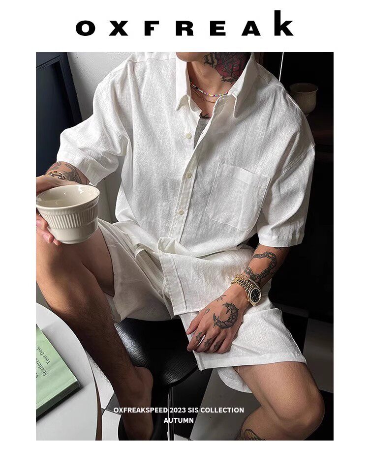 Oxfreak'Old Money Holiday' Cotton and Linen Blend Casual Suit for Men, Summer Thin Short-Sleeved Loose Shorts