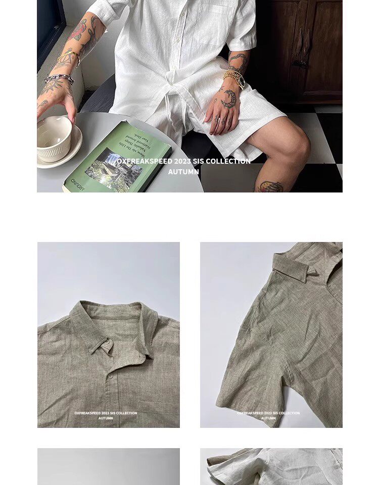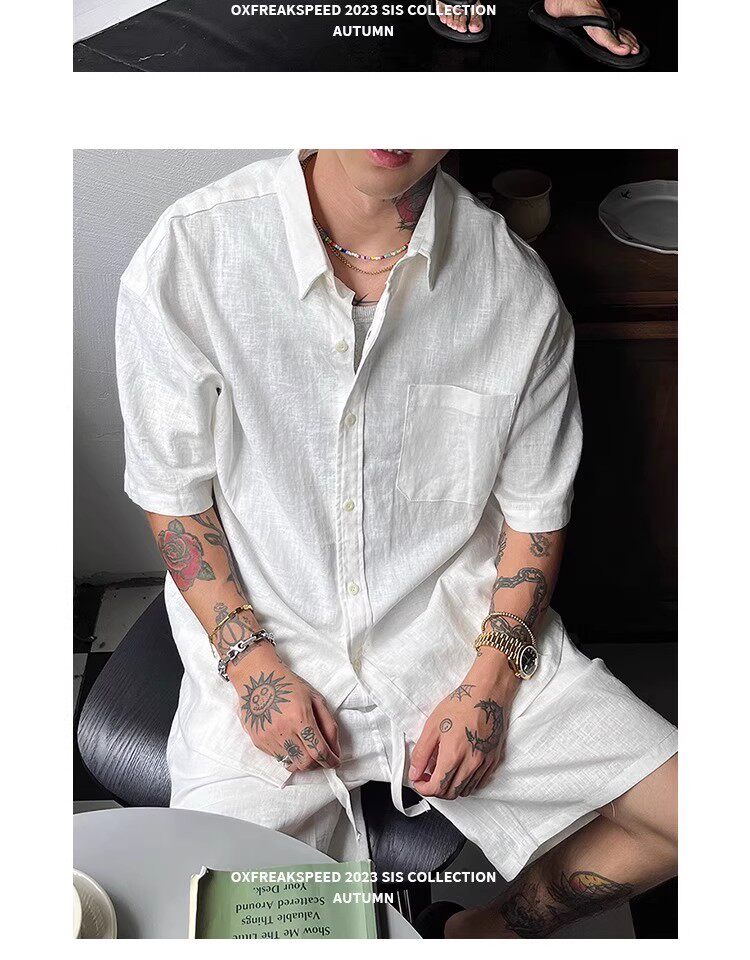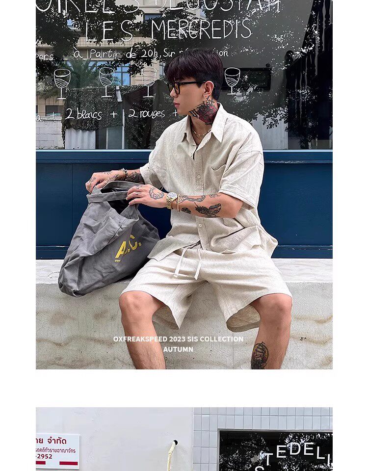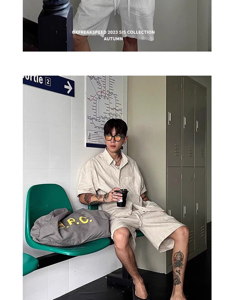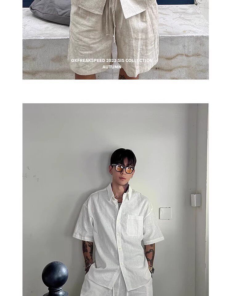 Oxfreak'Old Money Holiday' Cotton and Linen Blend Casual Suit for Men, Summer Thin Short-Sleeved Loose Shorts