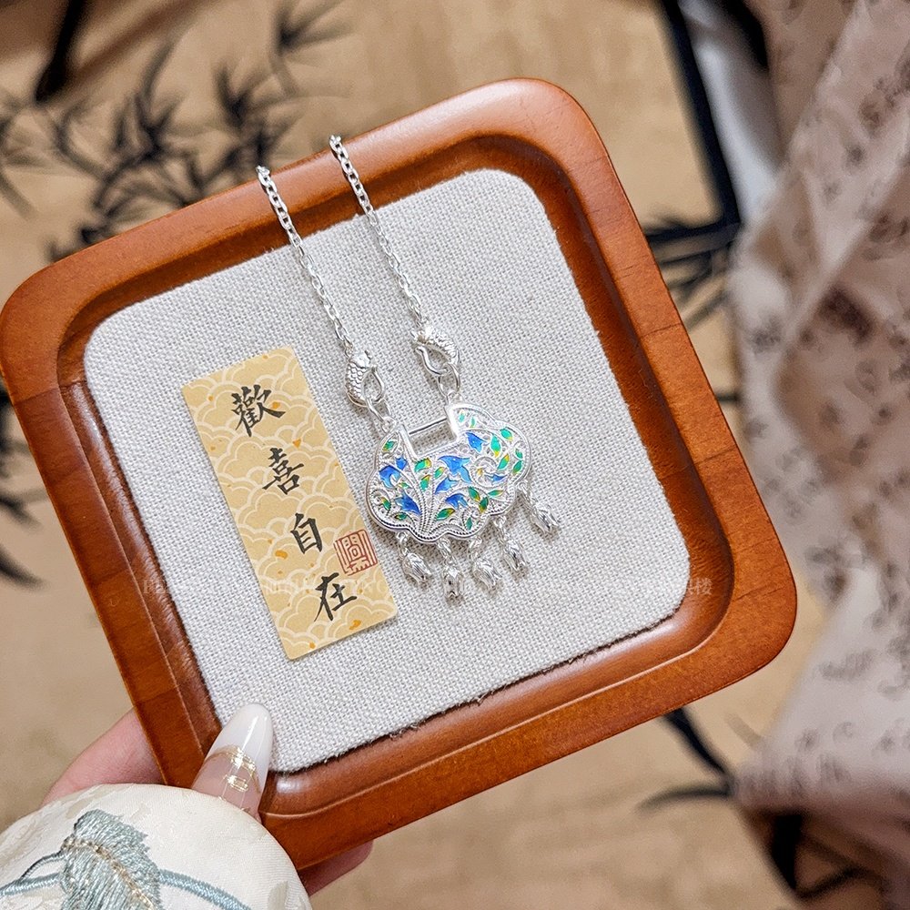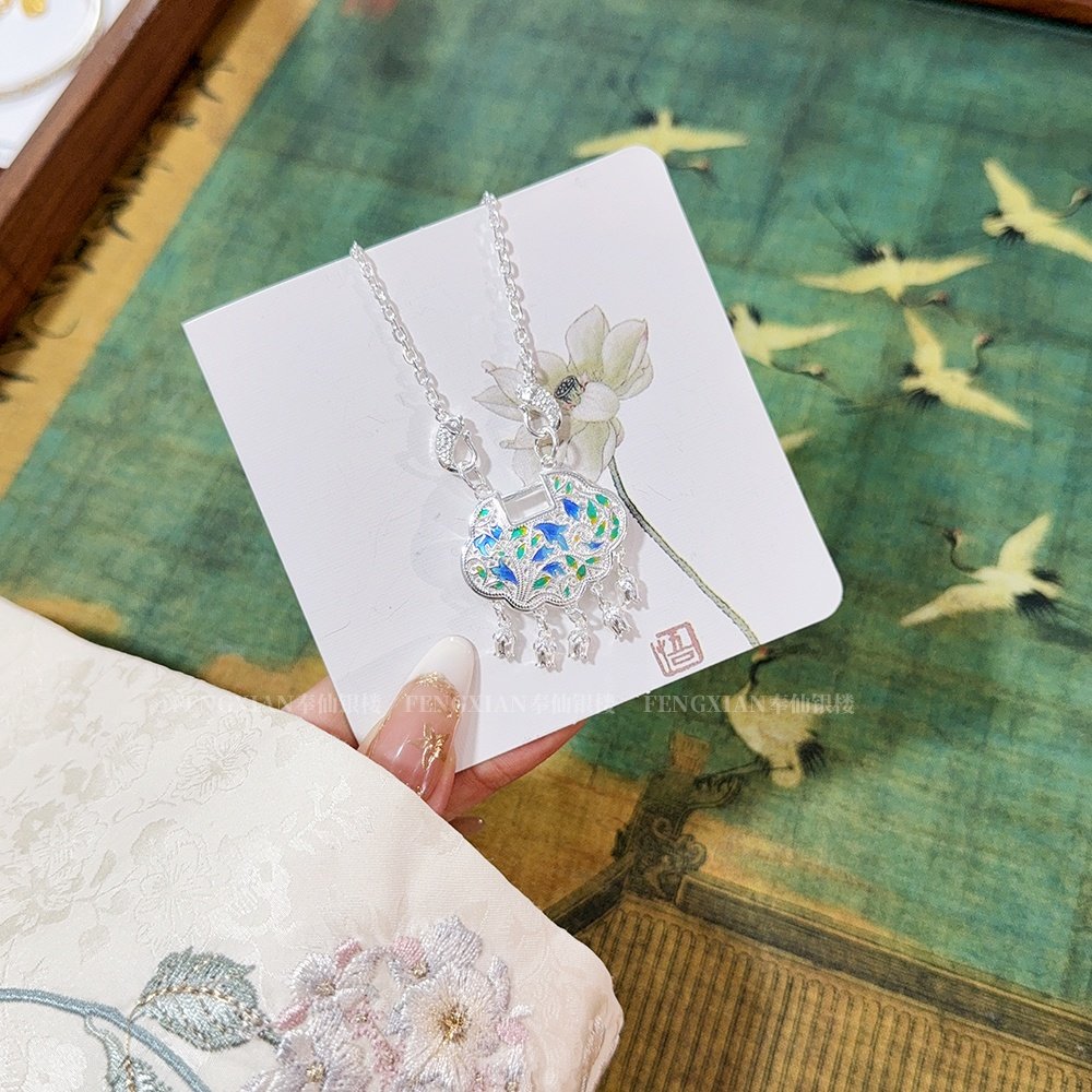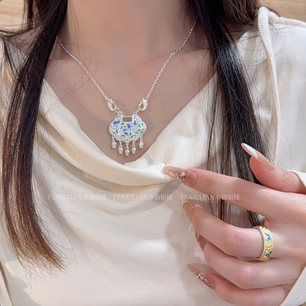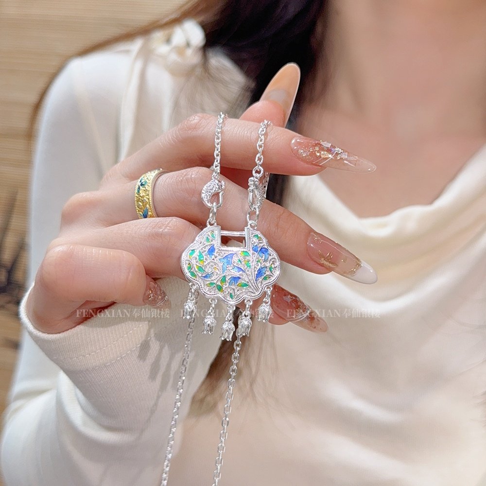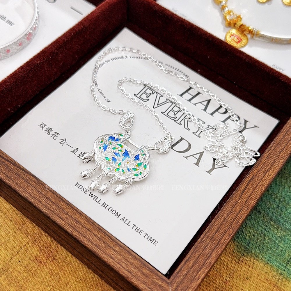 Yingluo Lock 999.9 Pure Silver Necklace Lily of the Valley Tassel Lock Pendant Set Chain Chinese Style New Chinese Style
