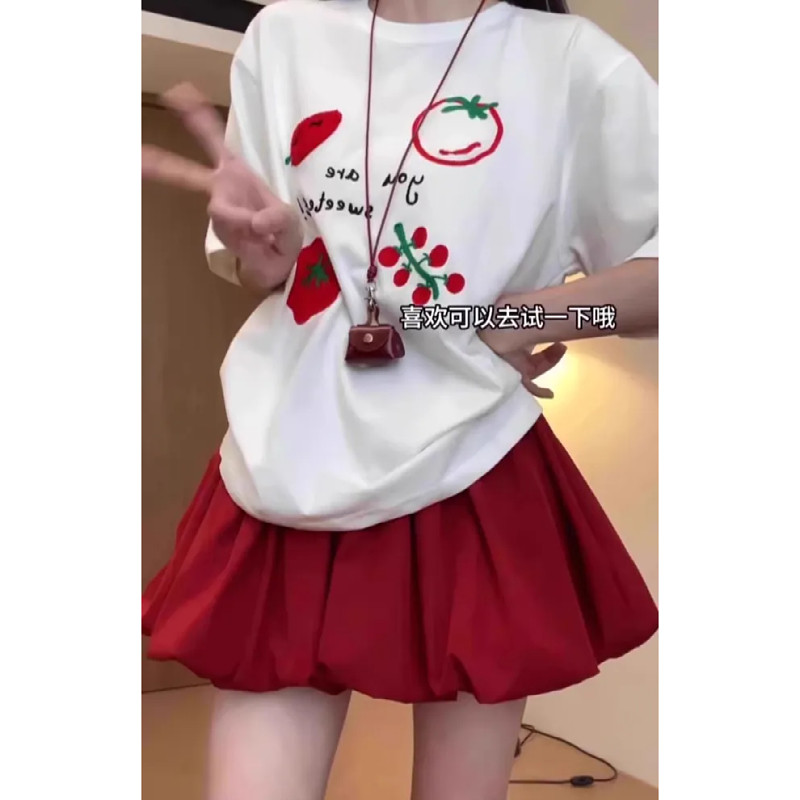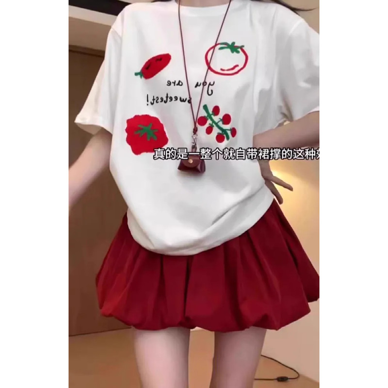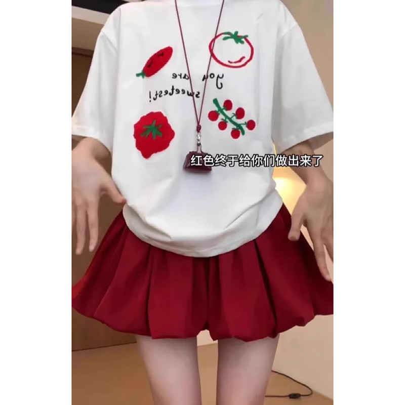 Plus Size Korean Style Red Cloud Pleated Skirt for Women, Summer Sweet High-Waisted A-Line Lantern Short Skirt