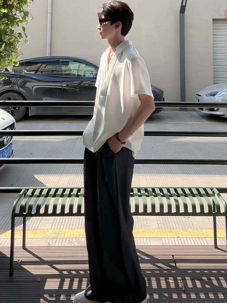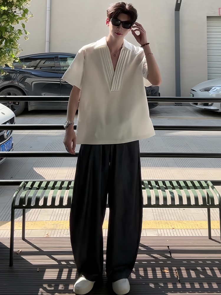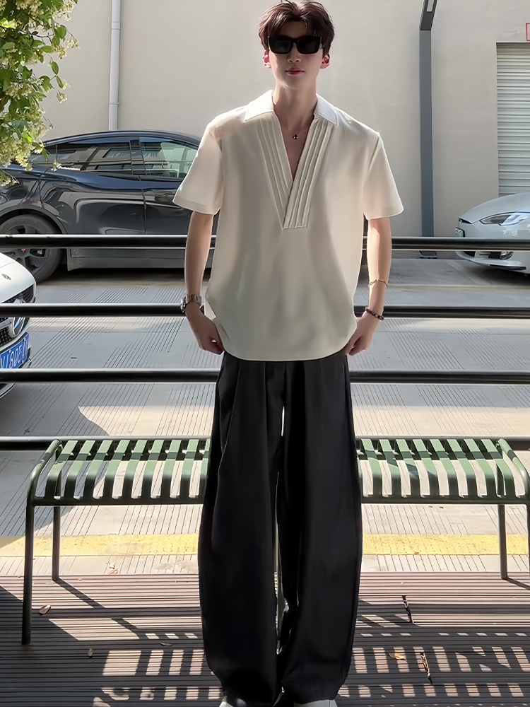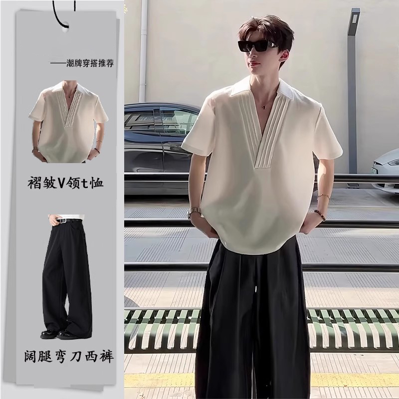 American-Style Pleated V-Neck Padded Shoulder Short-Sleeve T-Shirt with Drapey Scimitar Trousers Men's Suit Summer Cool and Stylish Outfit Complete Set