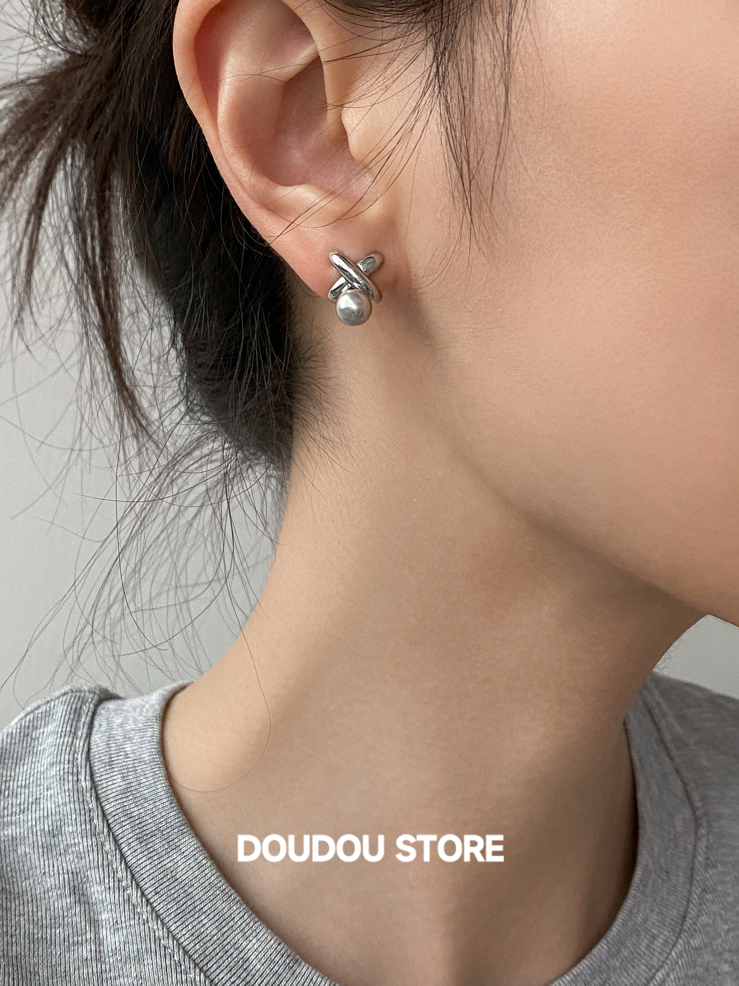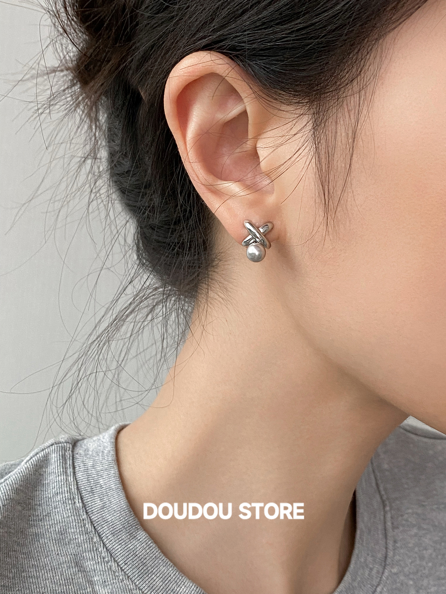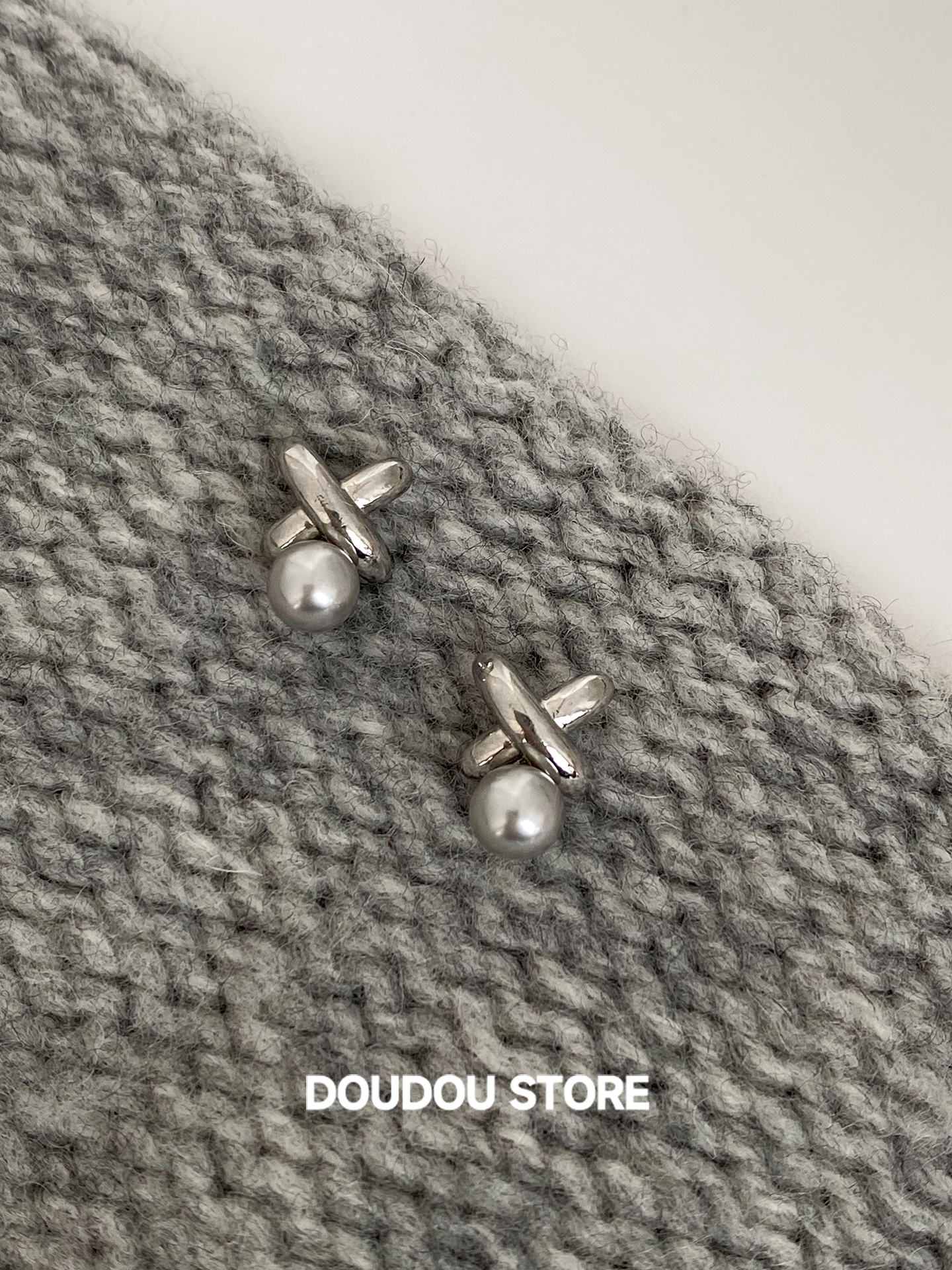 Doudoustore925 Silver Needle Geometric Cross X-Shaped Cool Gray Pearl Earrings for Women Geometric Line Earrings