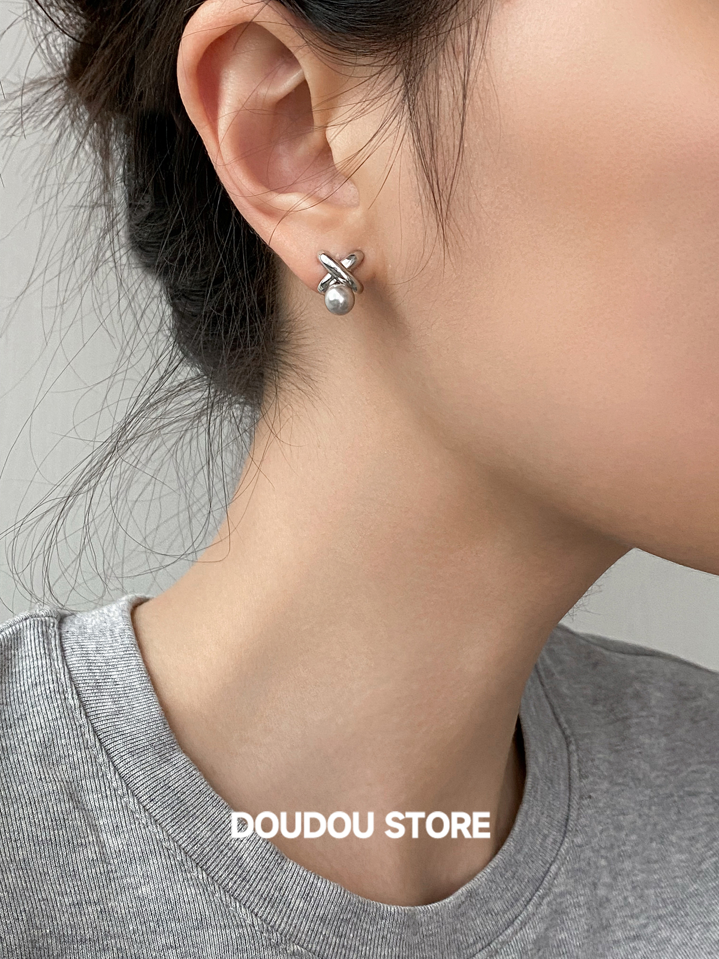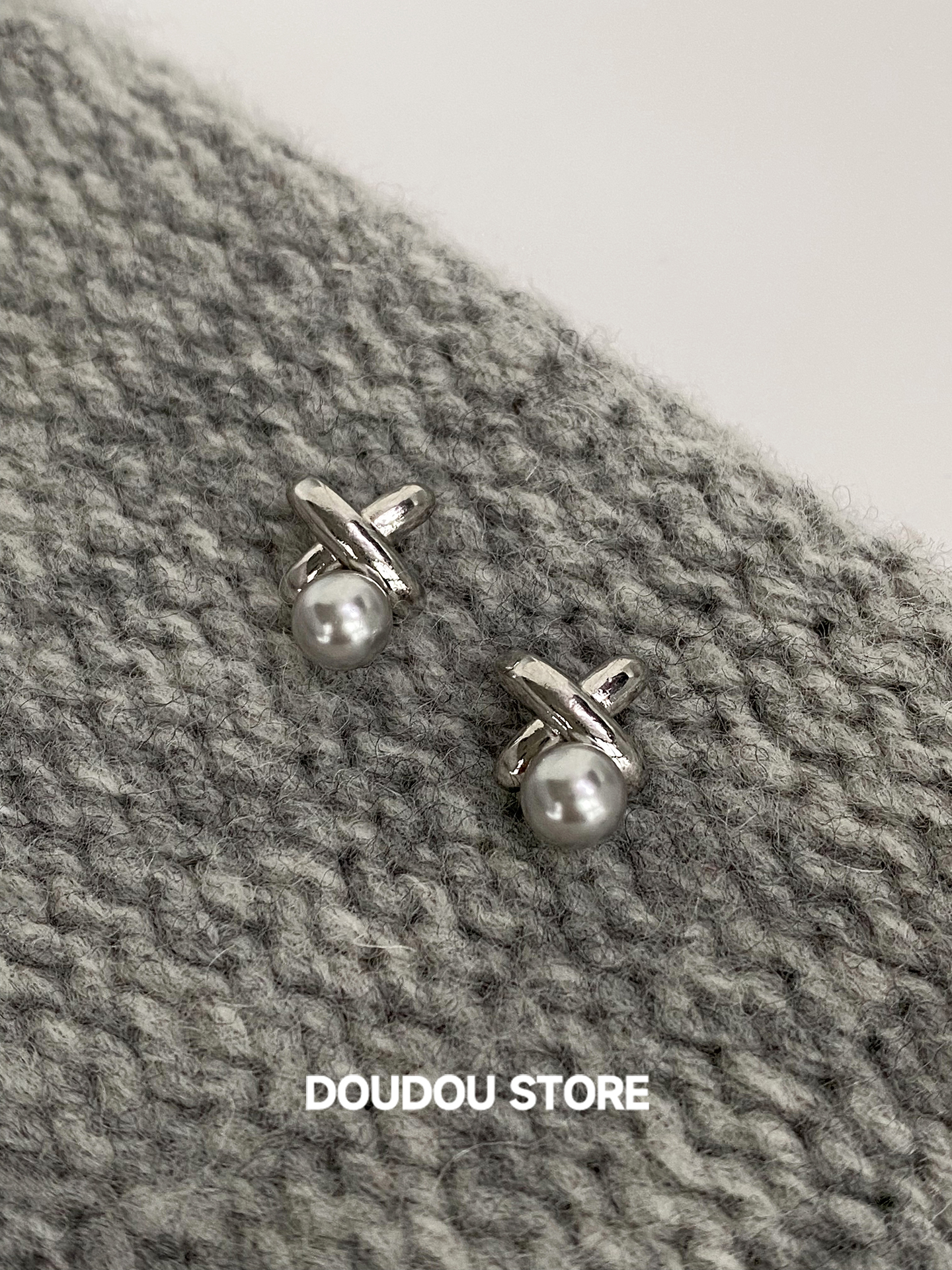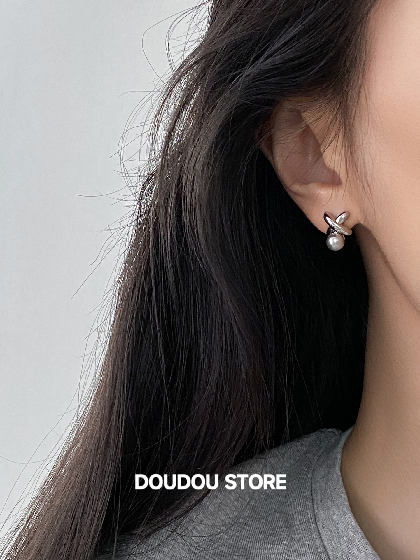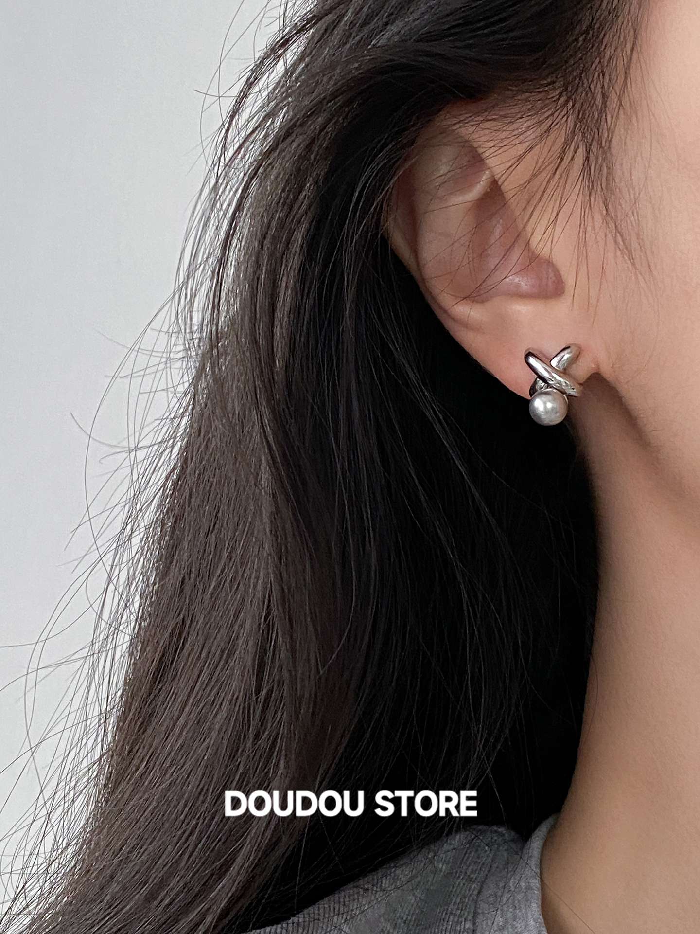 Doudoustore925 Silver Needle Geometric Cross X-Shaped Cool Gray Pearl Earrings for Women Geometric Line Earrings