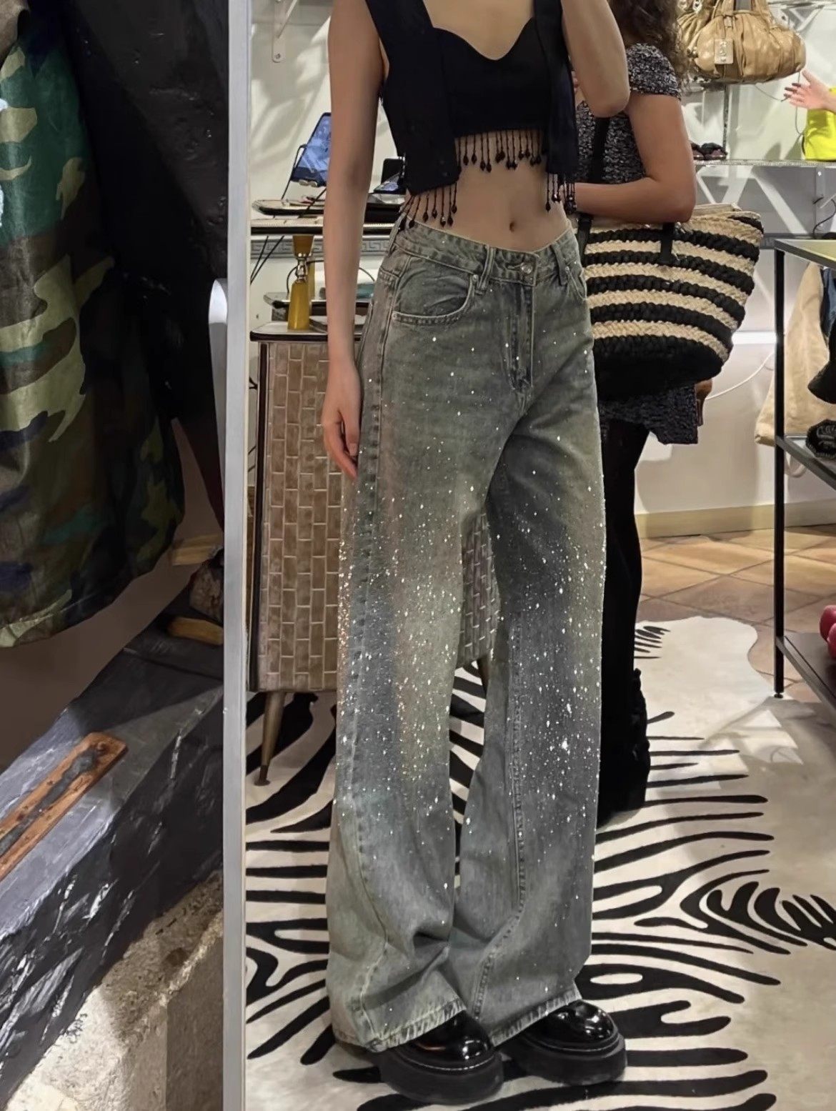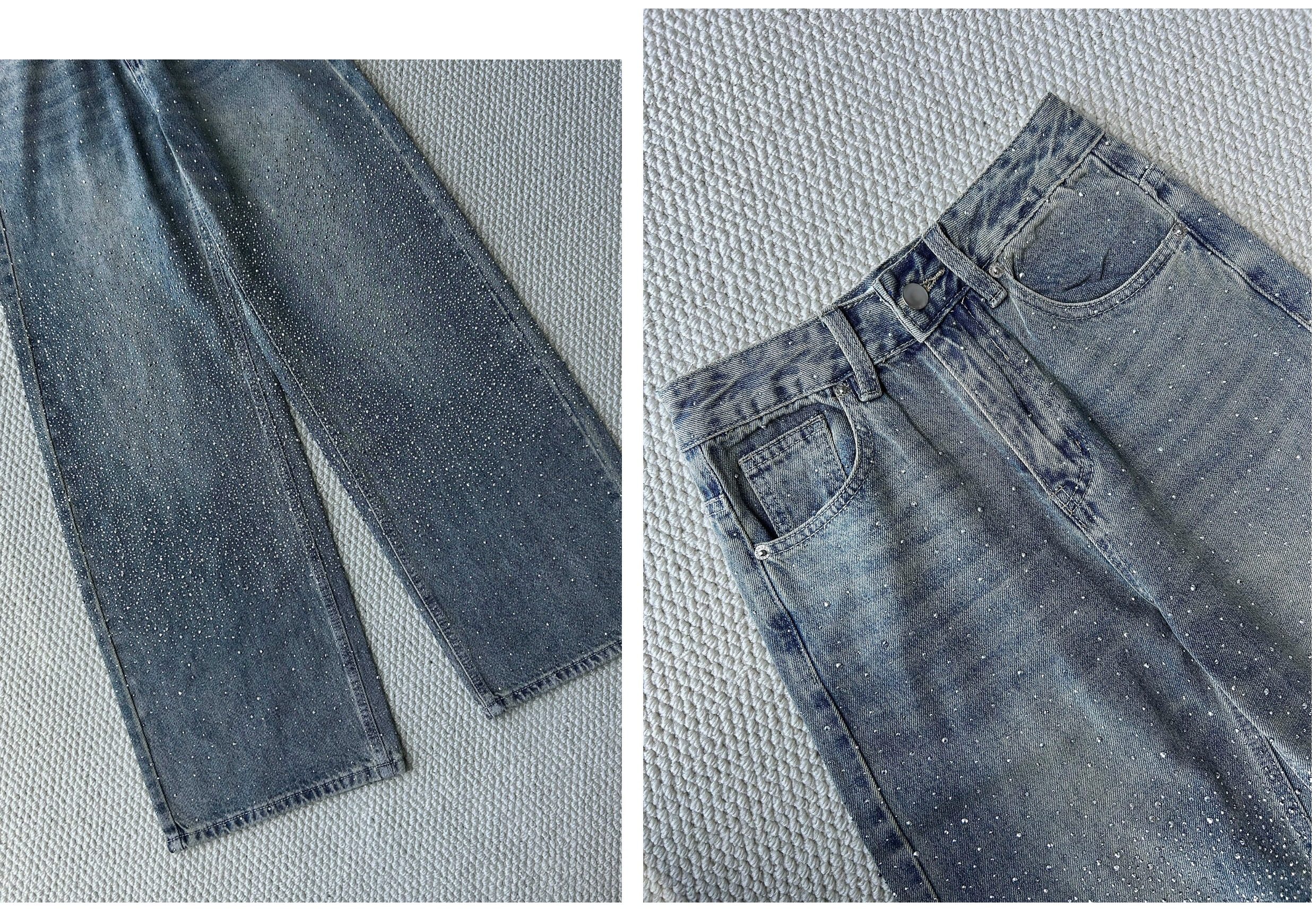 Halfmood25Ss Dazzling Paris Half-Diamond Design Niche Shiny Diamond Heavy-Duty Loose Wide-Leg Jeans for Women