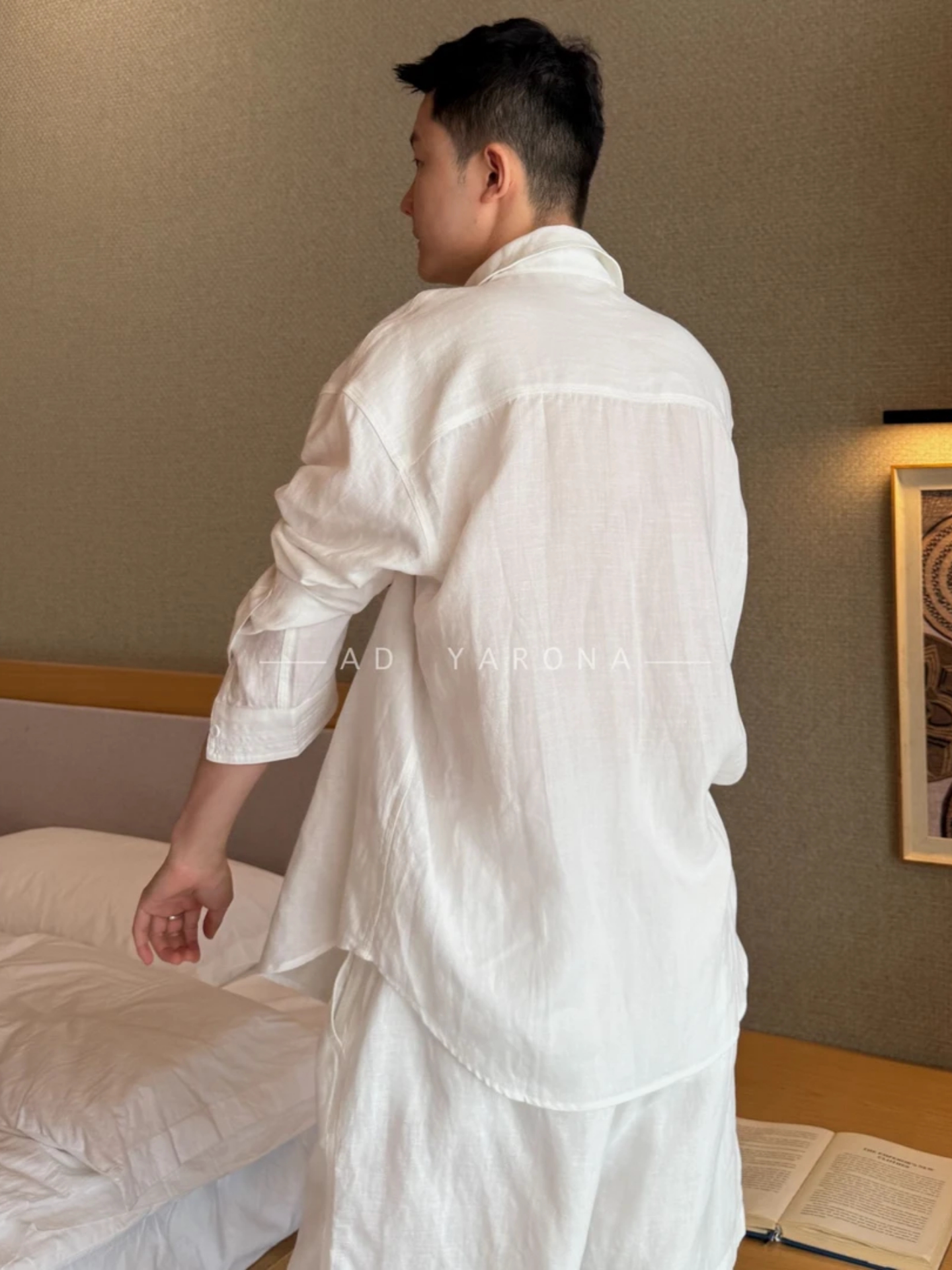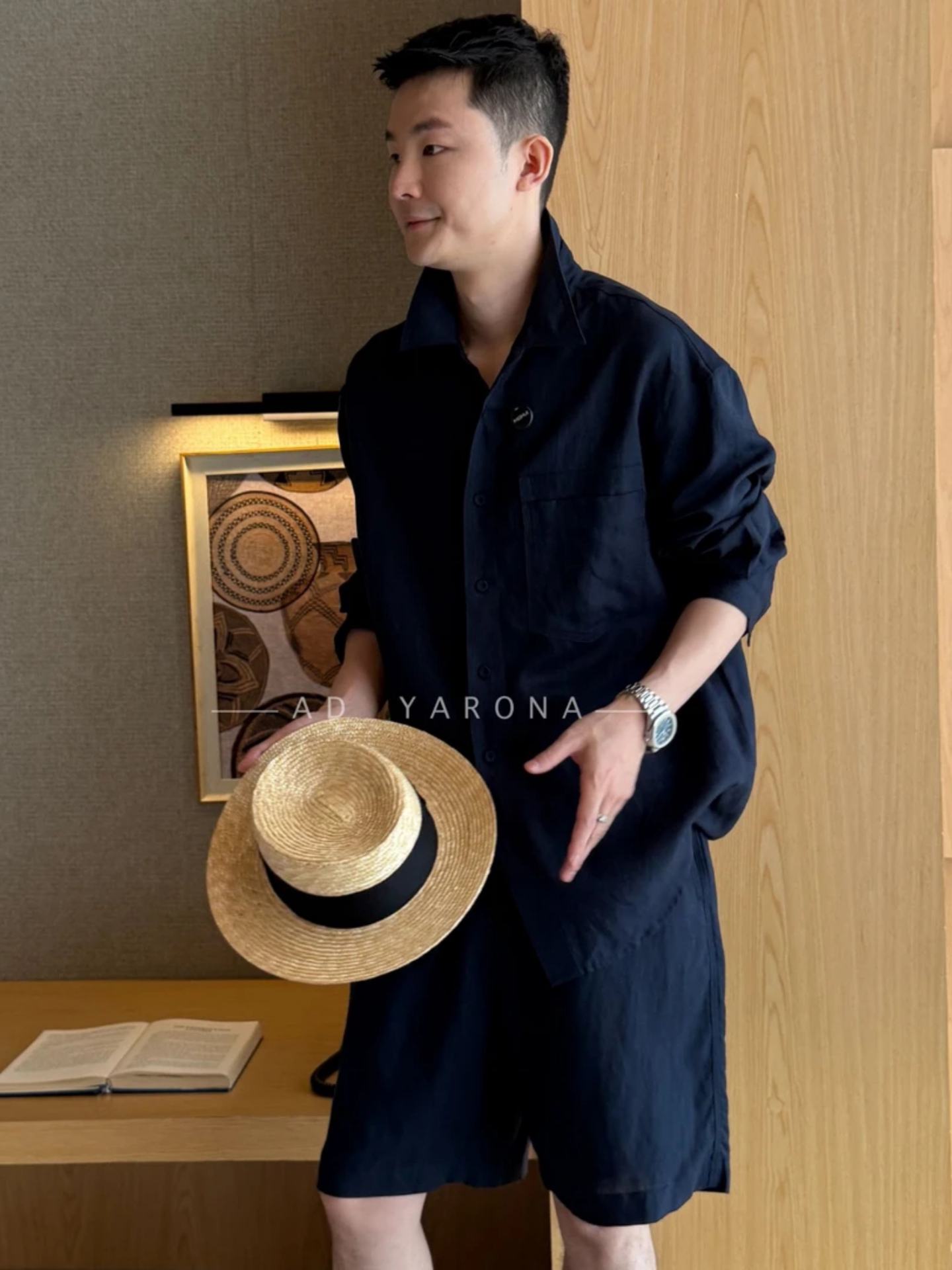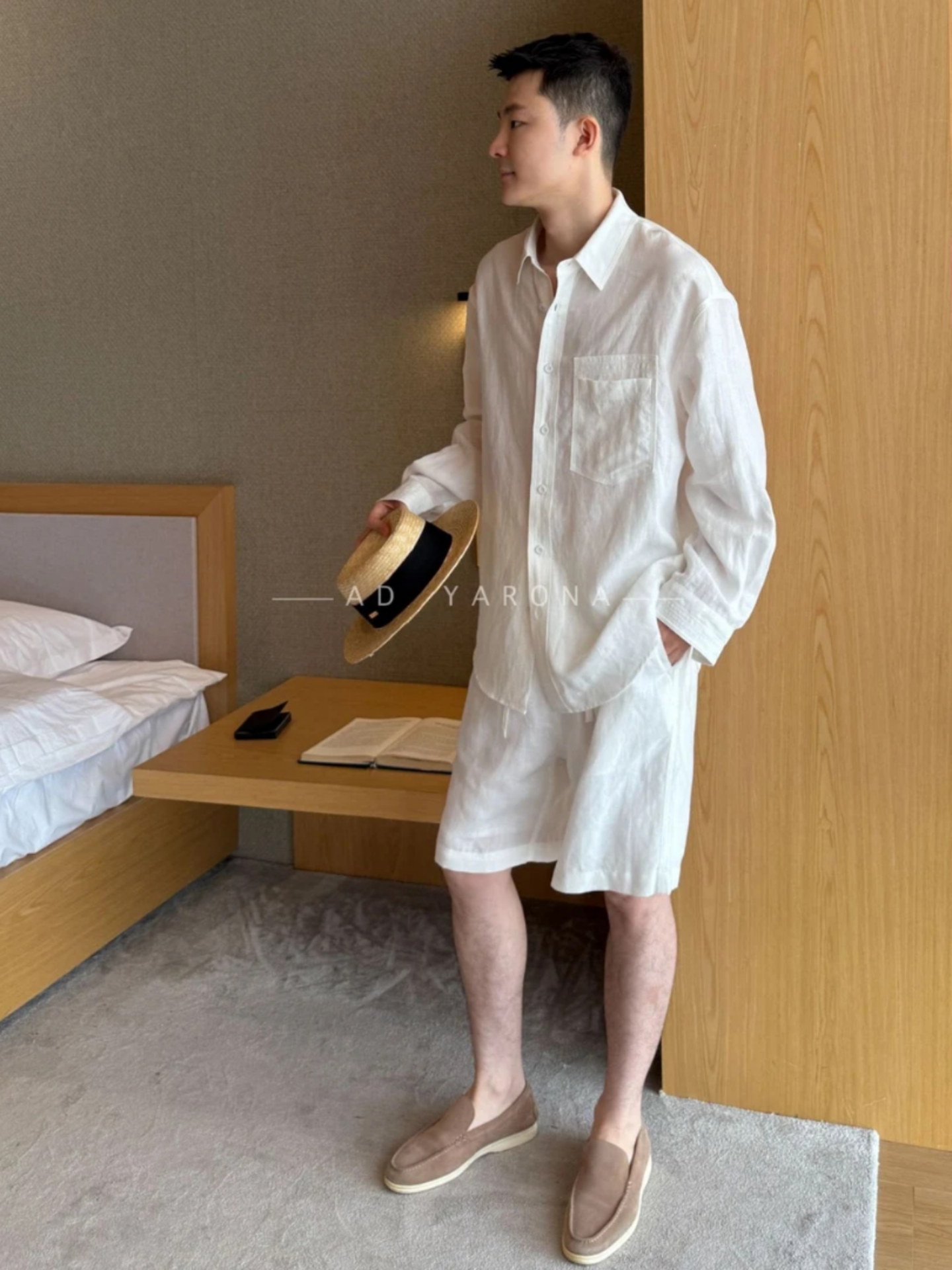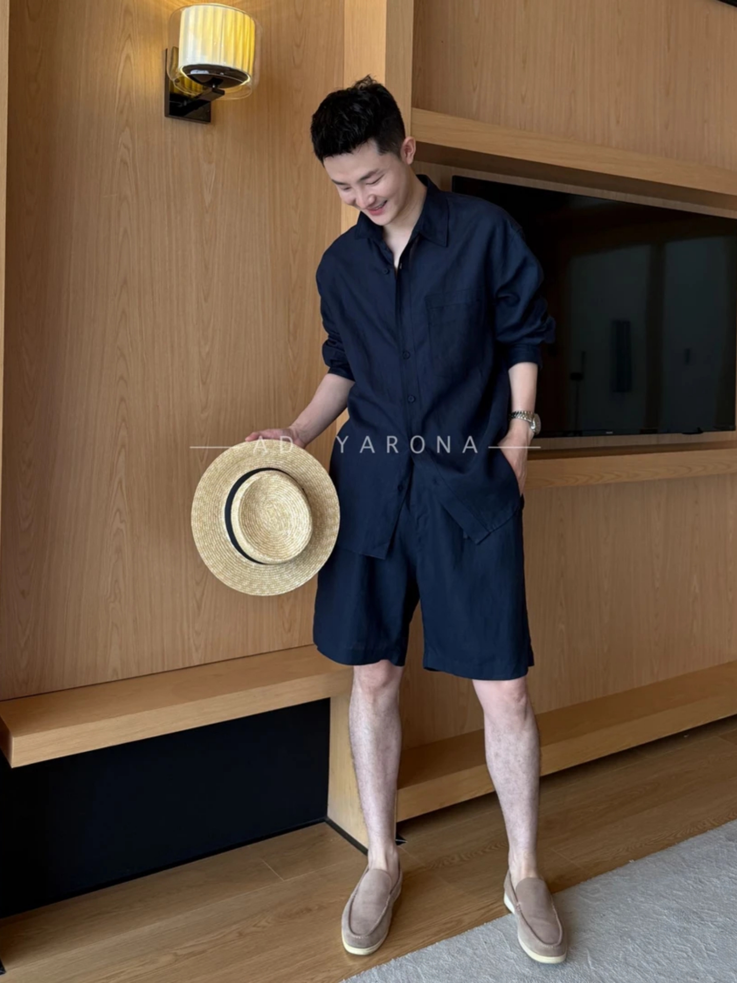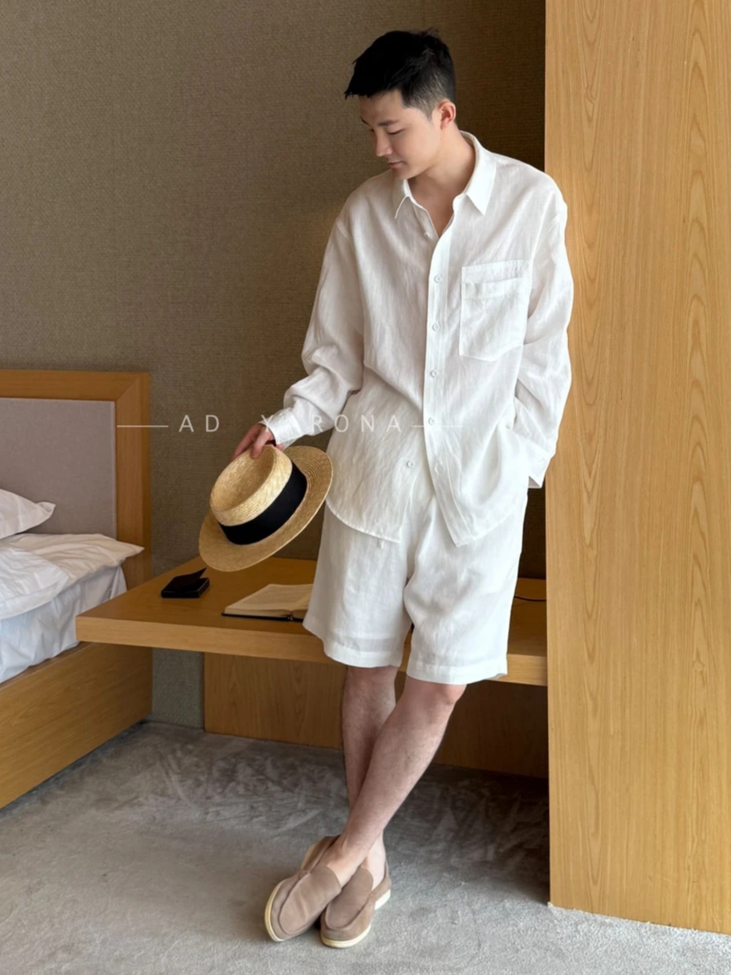 Summer New Men's Linen Suit, Smooth and Casual, Stylish and Versatile, Solid Color Simple Shirt and Shorts Set