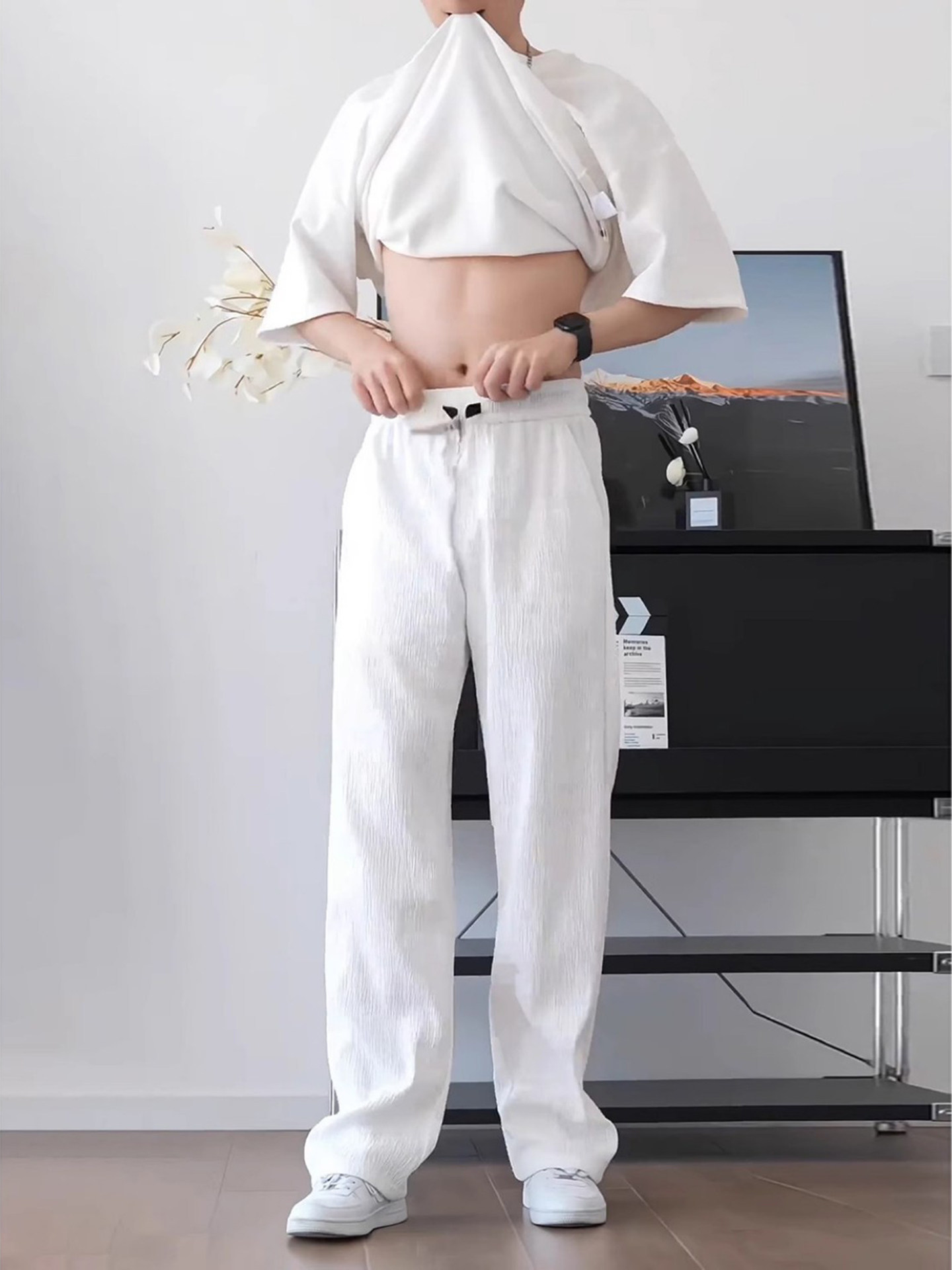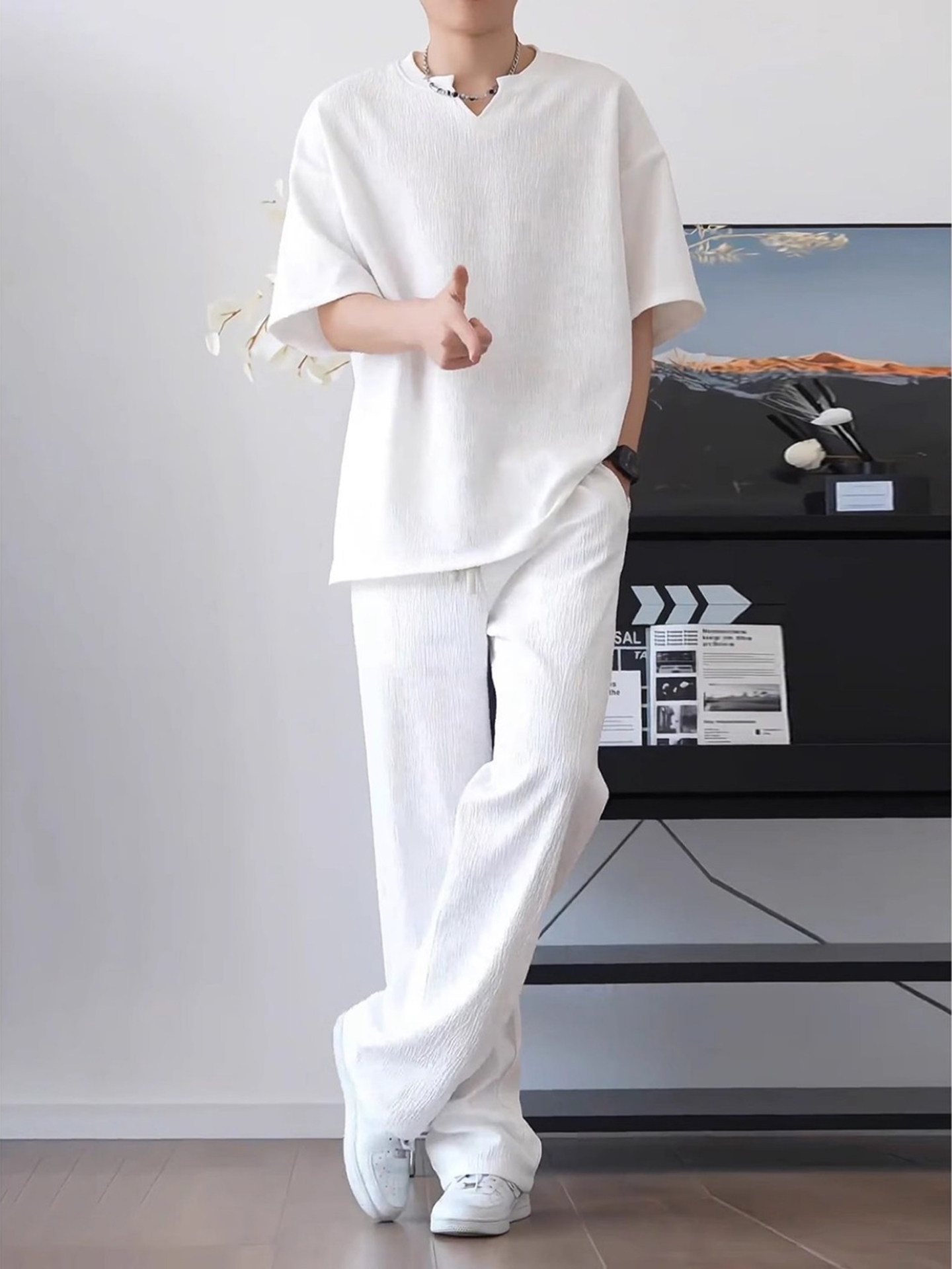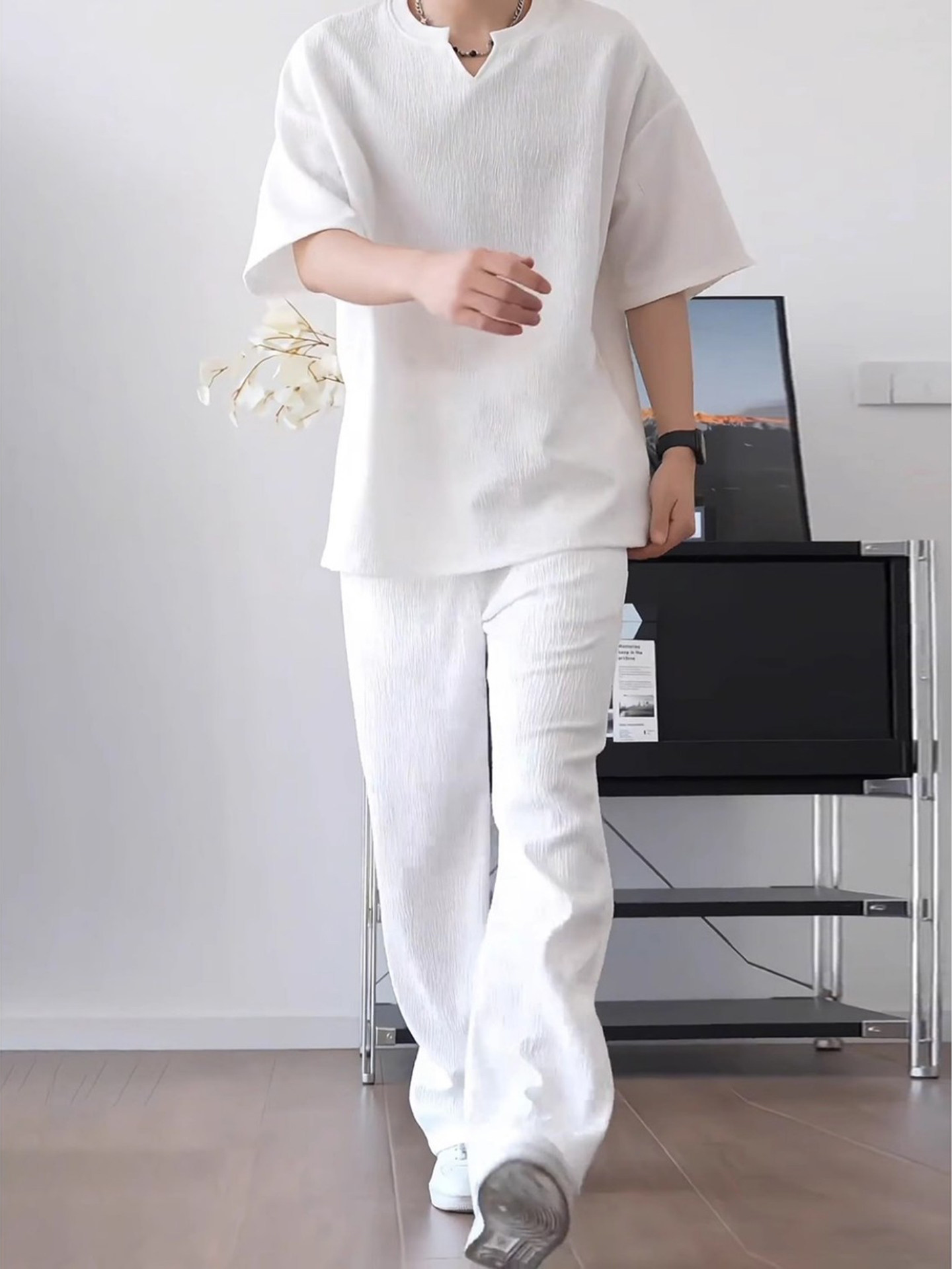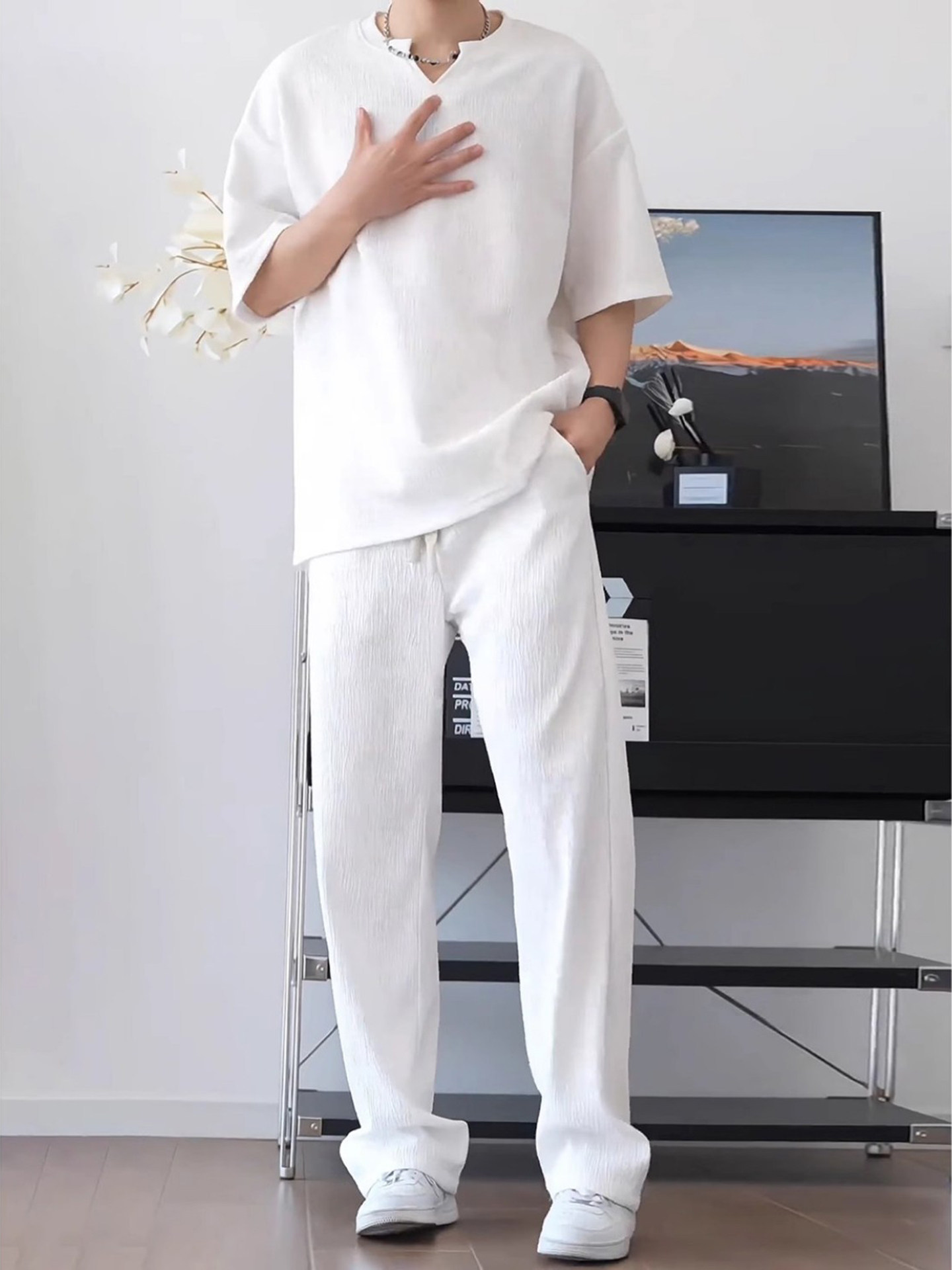Summer Textured Ice Silk Quick-Drying Short-Sleeved T-Shirt Set for Men, with a Draping, High-End Feel, Casual Pants Two-Piece Set