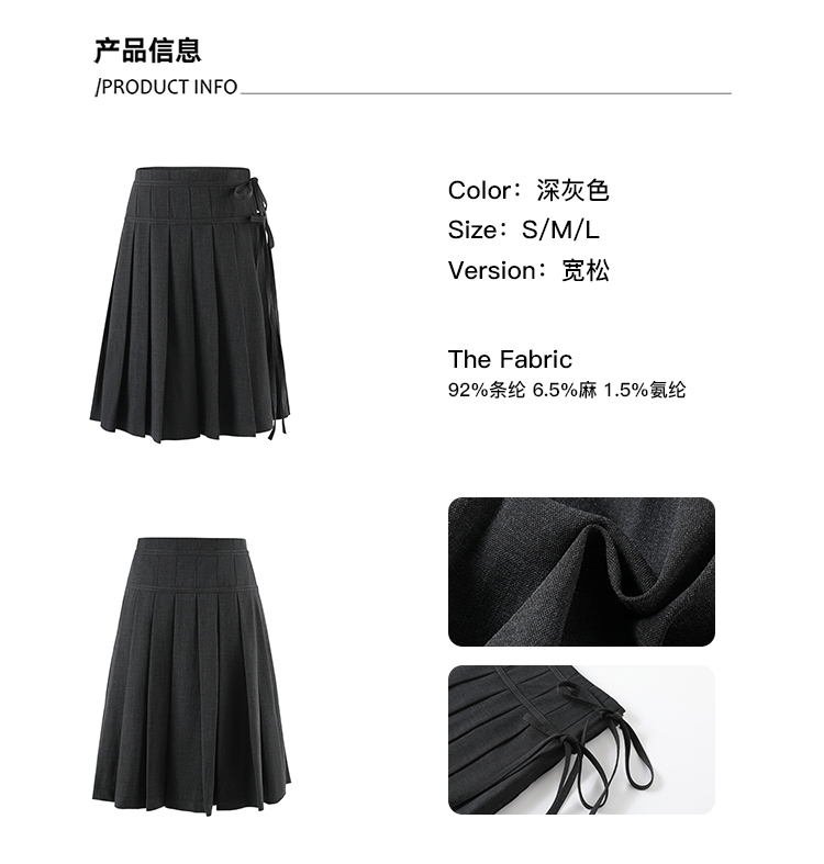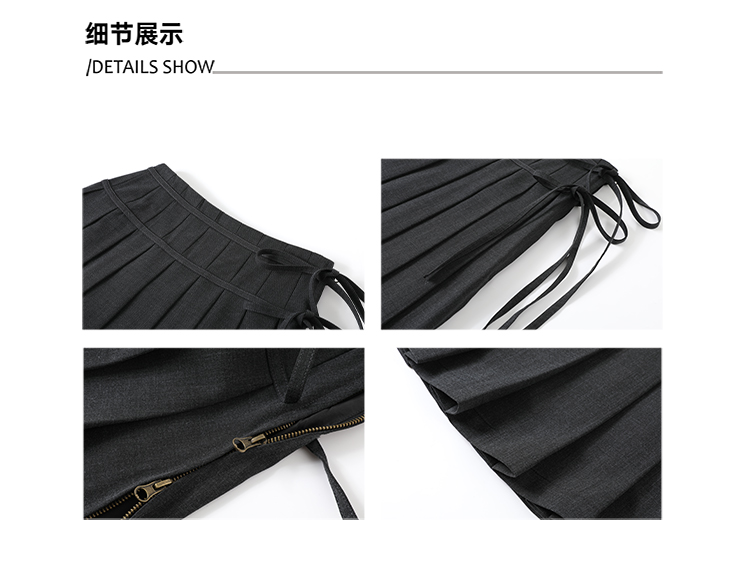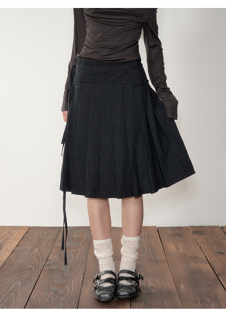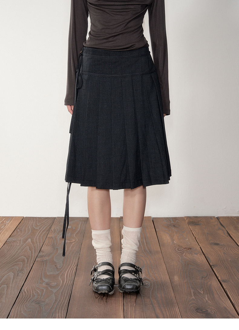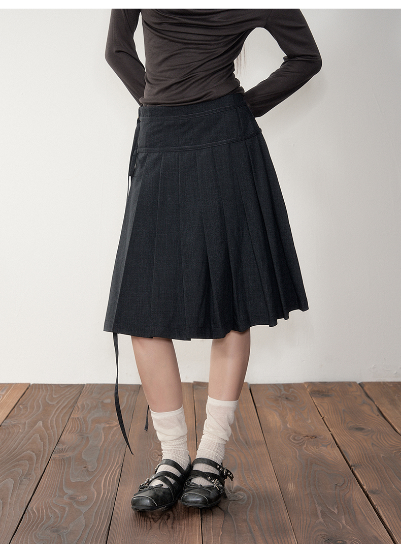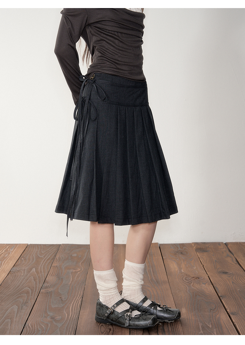 Soote Season Original Korean-Style Dark Gray Preppy Lace-Up Mid-Length Skirt Slim-Fit Pleated Skirt