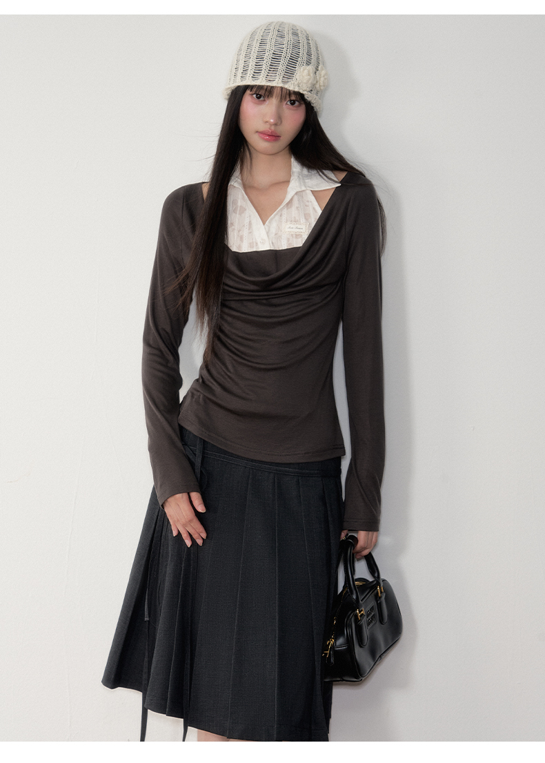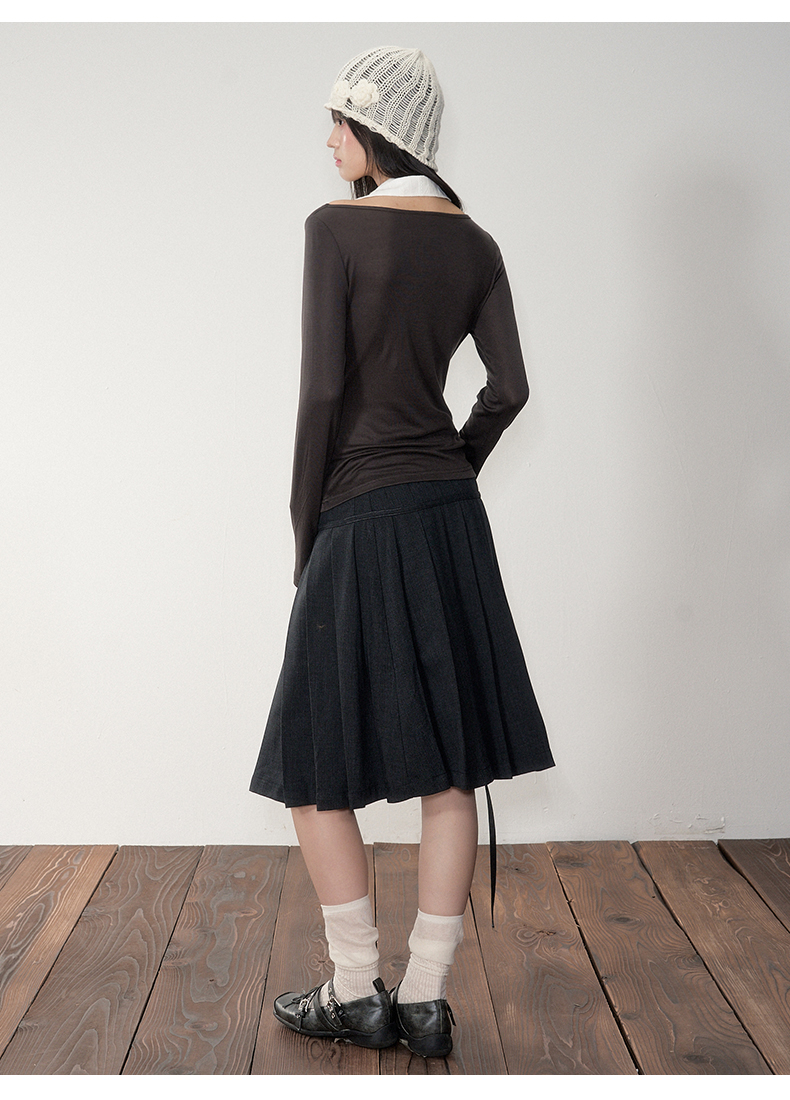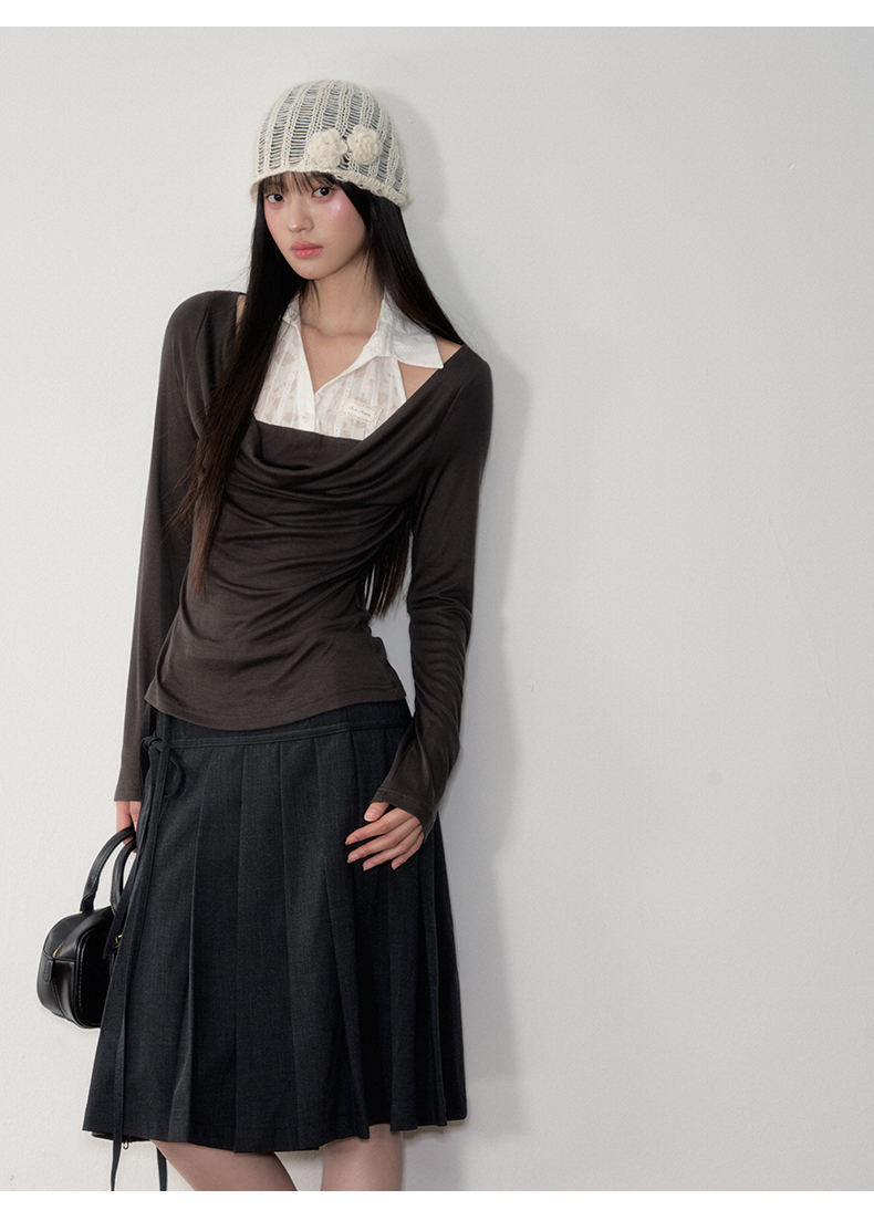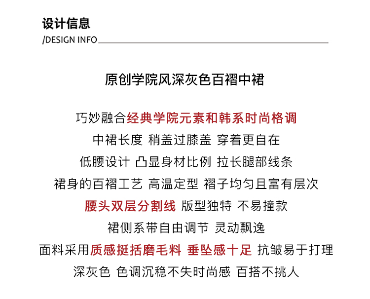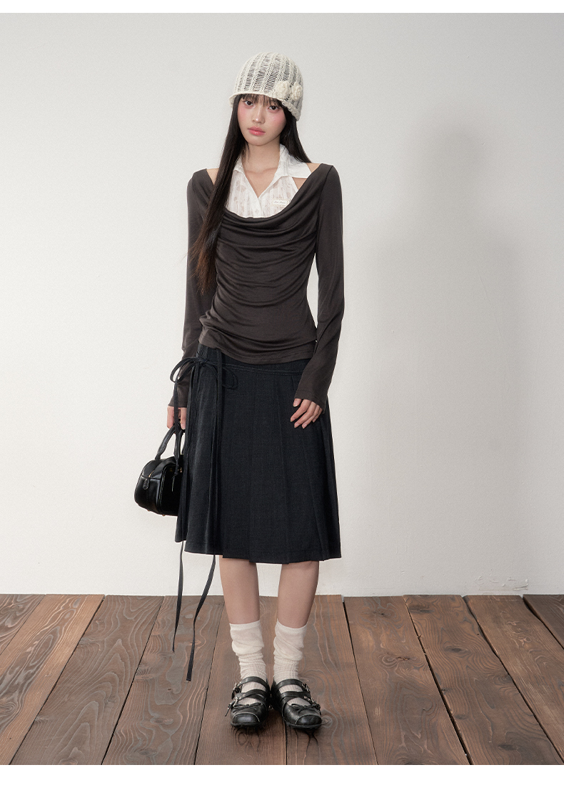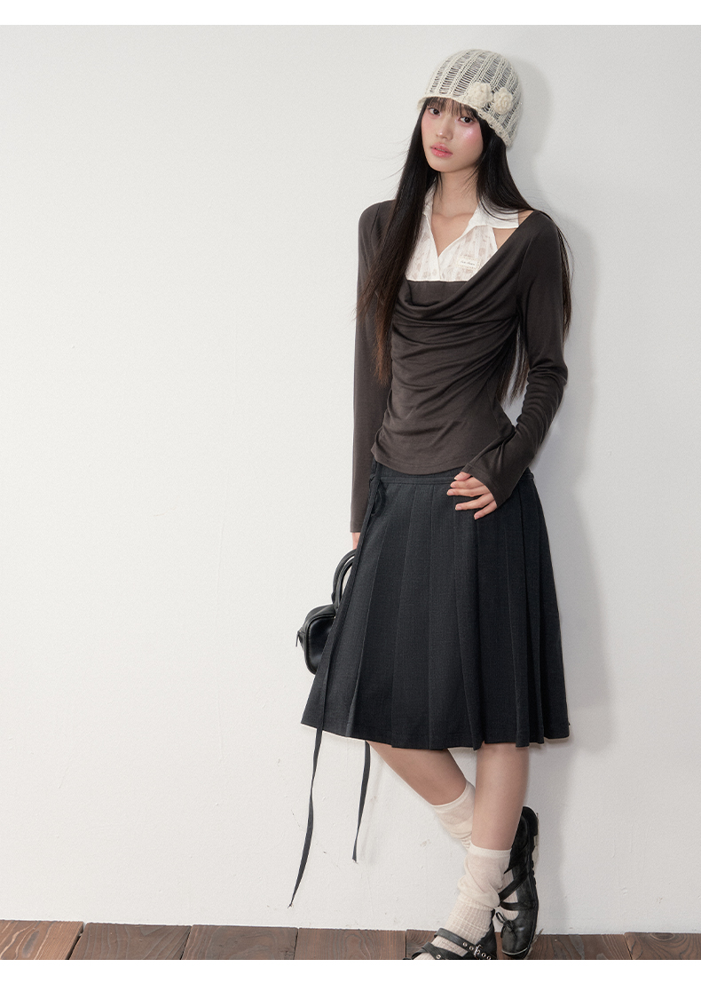Soote Season Original Korean-Style Dark Gray Preppy Lace-Up Mid-Length Skirt Slim-Fit Pleated Skirt