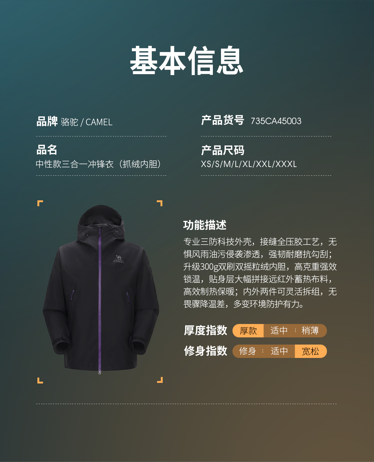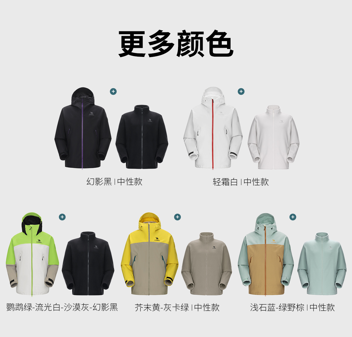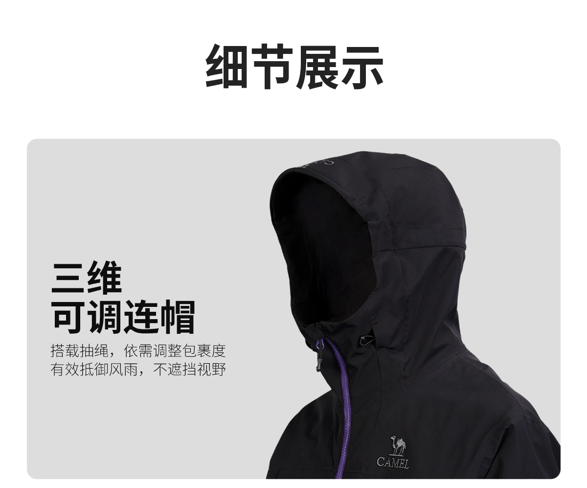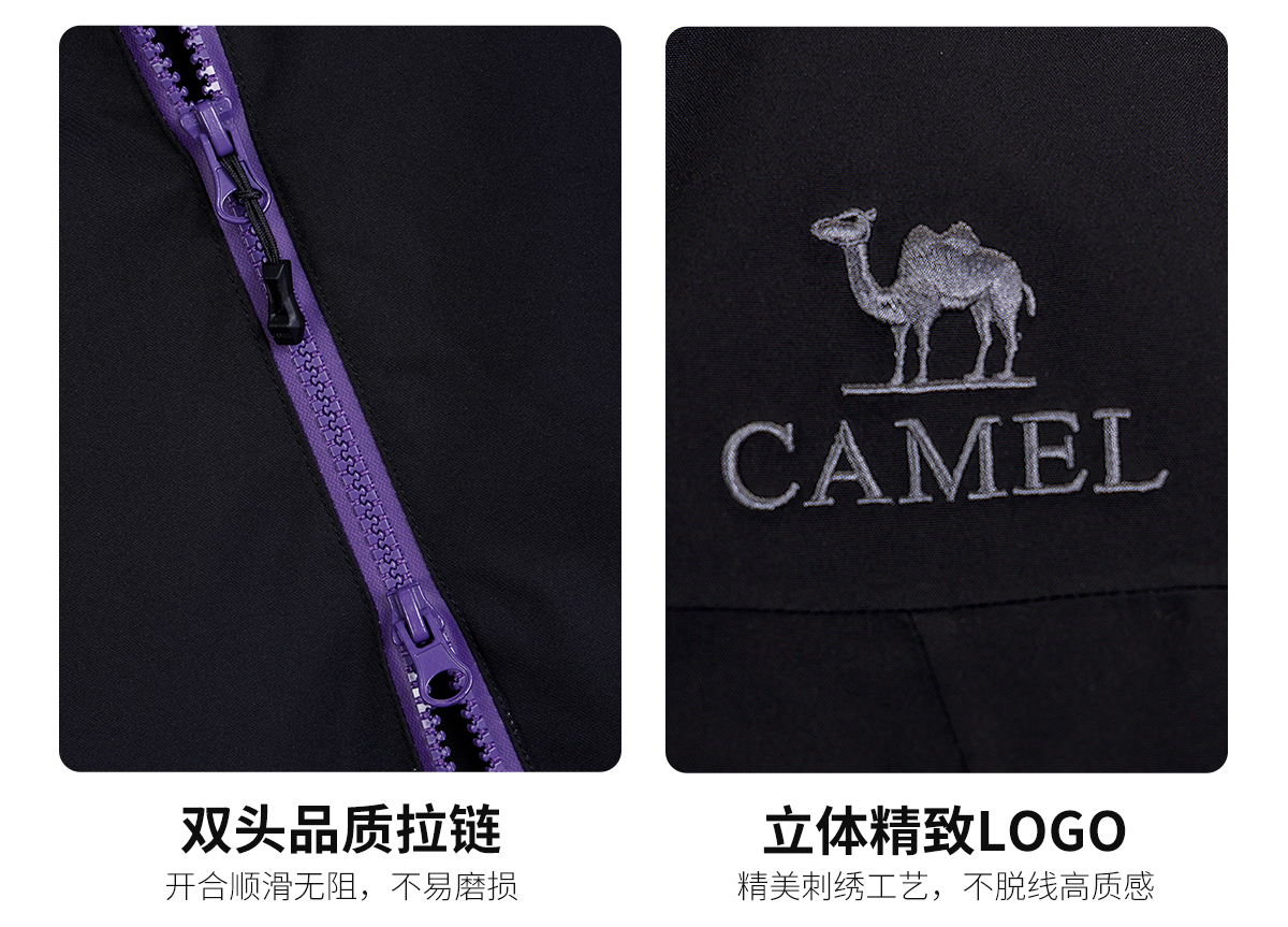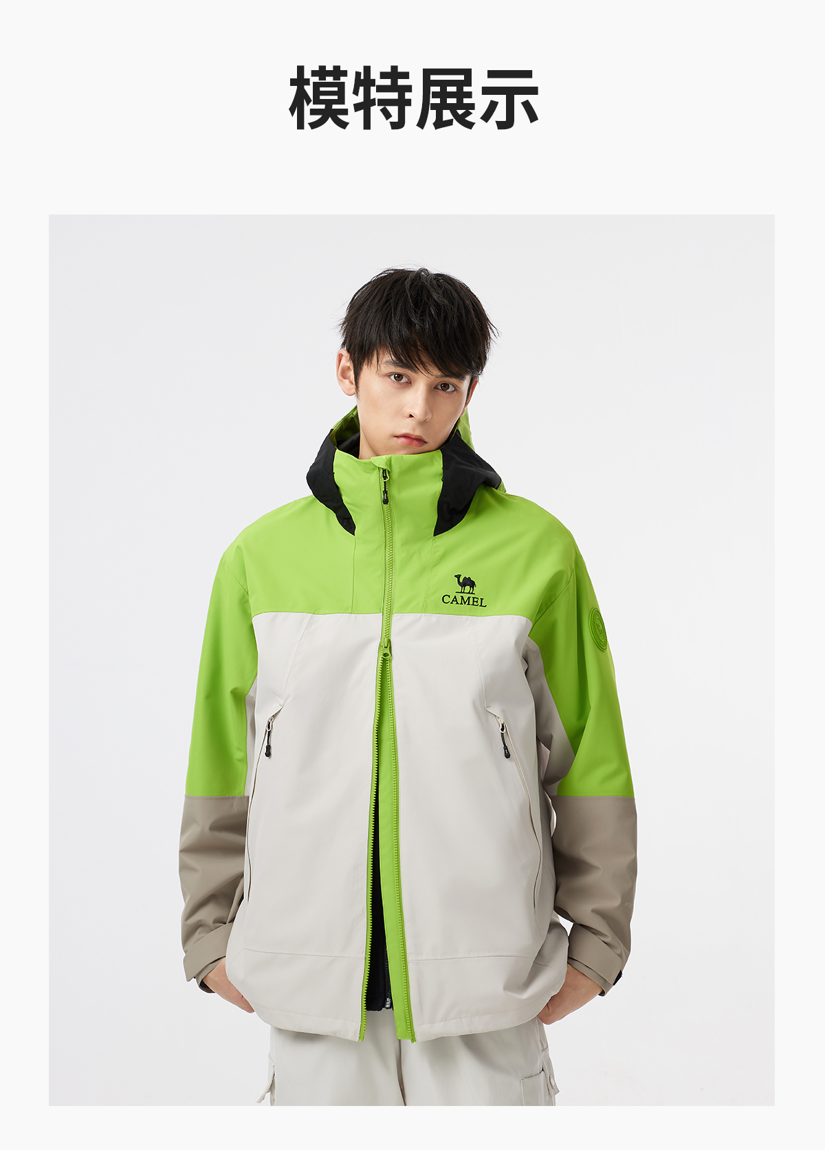 是采用三点式链接式设计,即外壳和内胆无内侧拉链链接,仅后领处及左右袖口处连接,适合户外游玩灵活穿搭。骆驼粉丝们,介意慎拍,祝骆驼粉丝们购物愉快!~