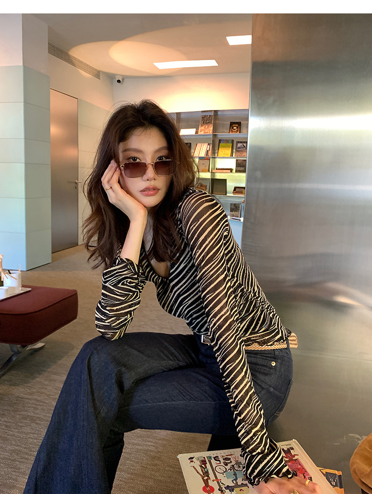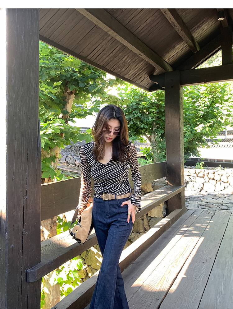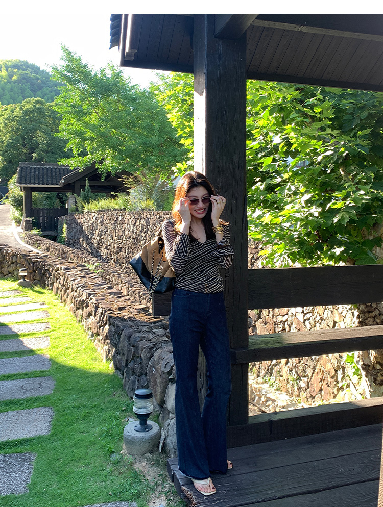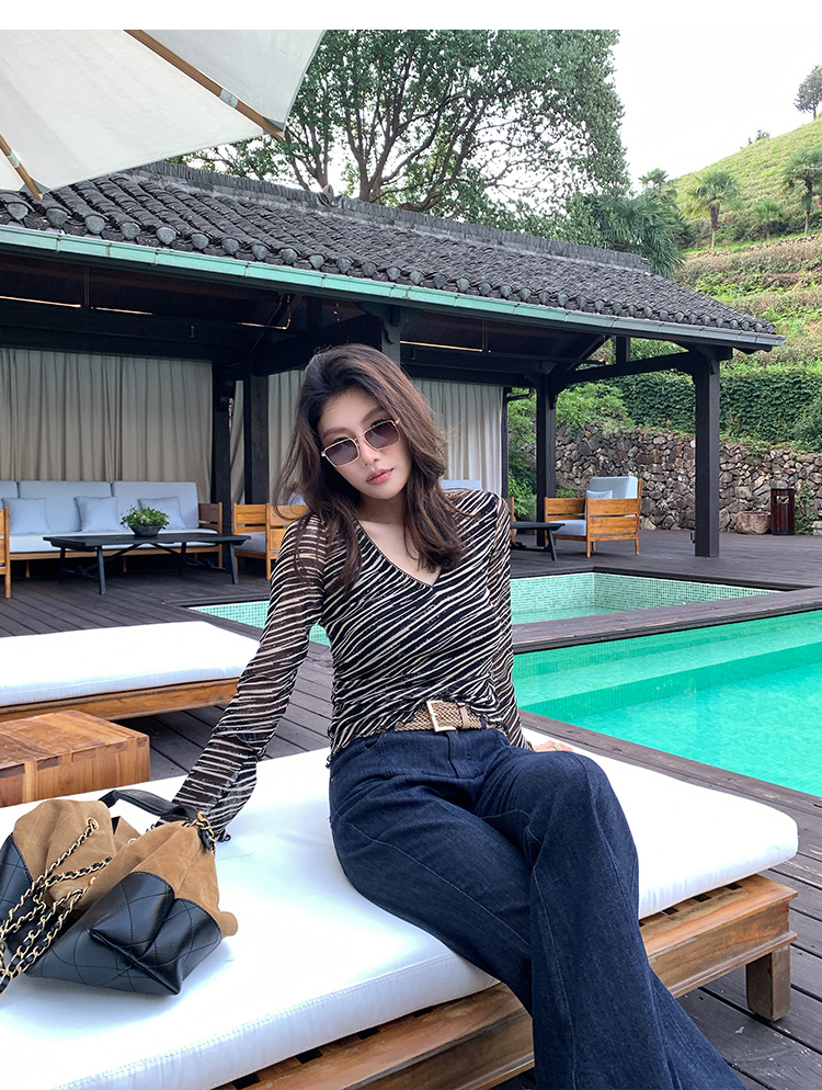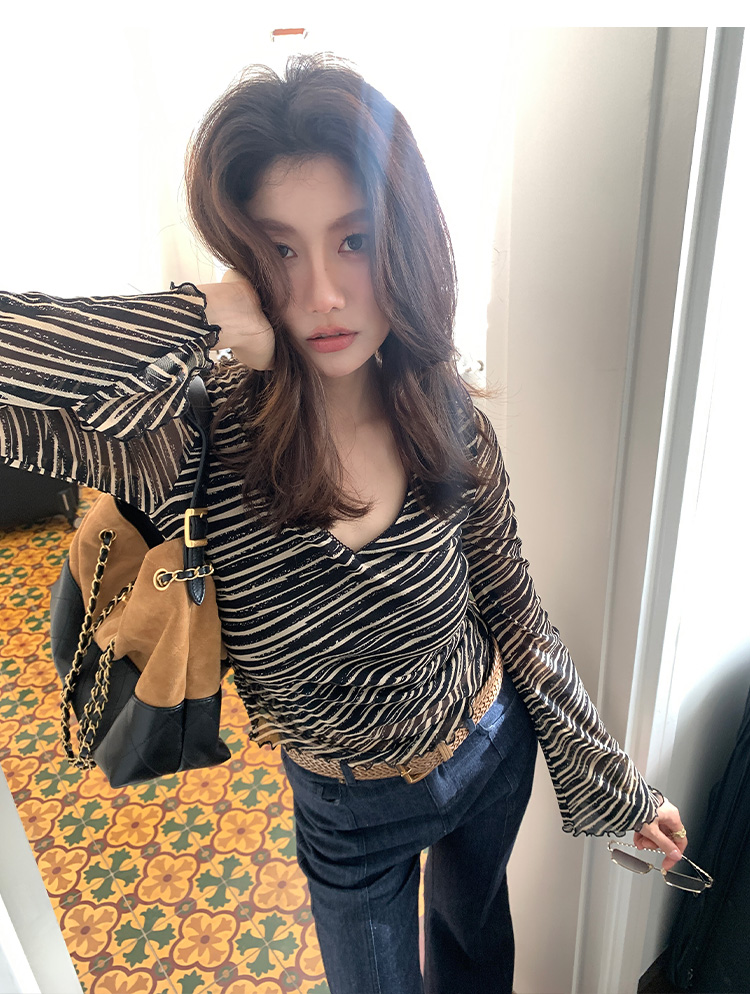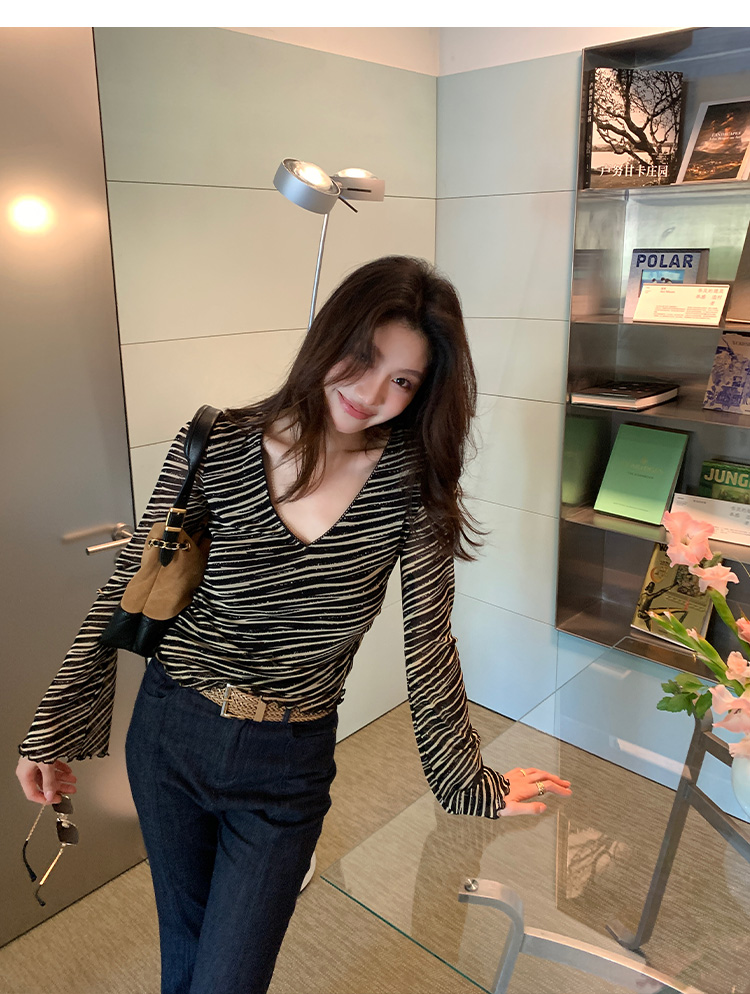 Long-Sleeved Slim-Fit Zebra-Striped V-Neck T-Shirt for Women, Autumn Vintage Design Base Shirt Top J606