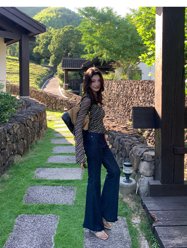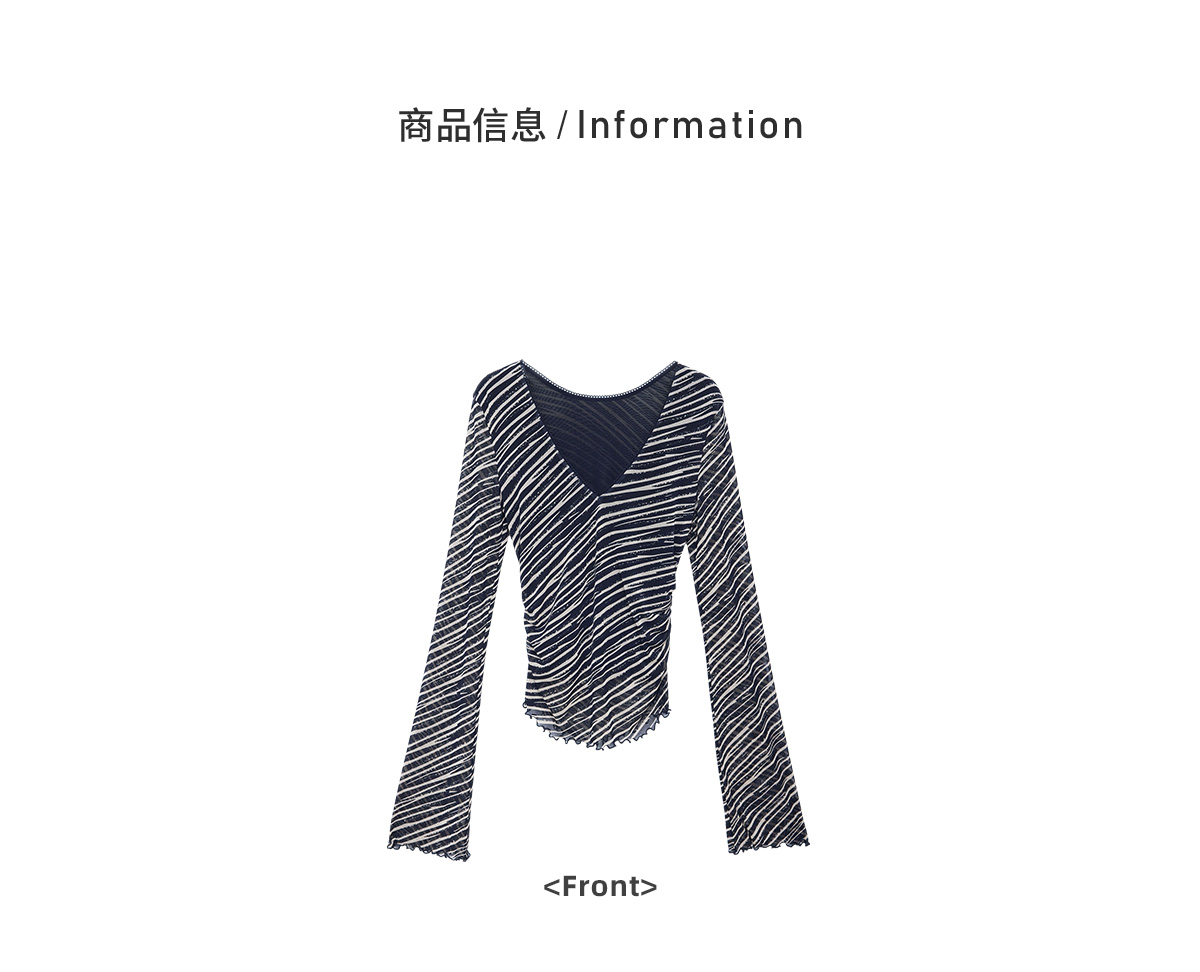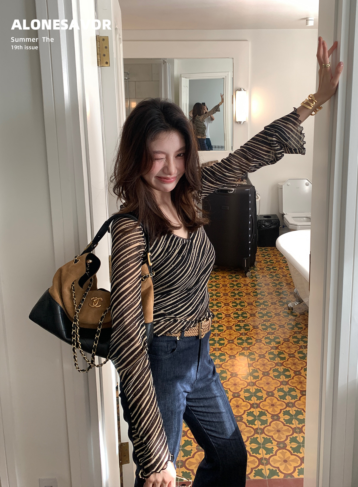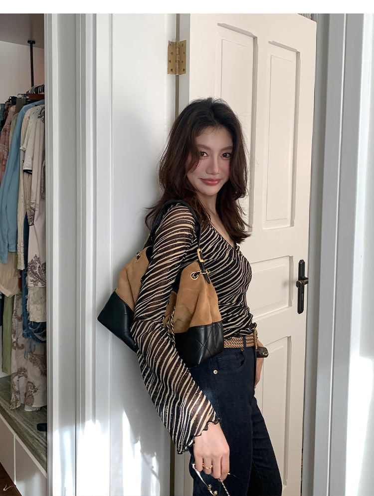 Long-Sleeved Slim-Fit Zebra-Striped V-Neck T-Shirt for Women, Autumn Vintage Design Base Shirt Top J606