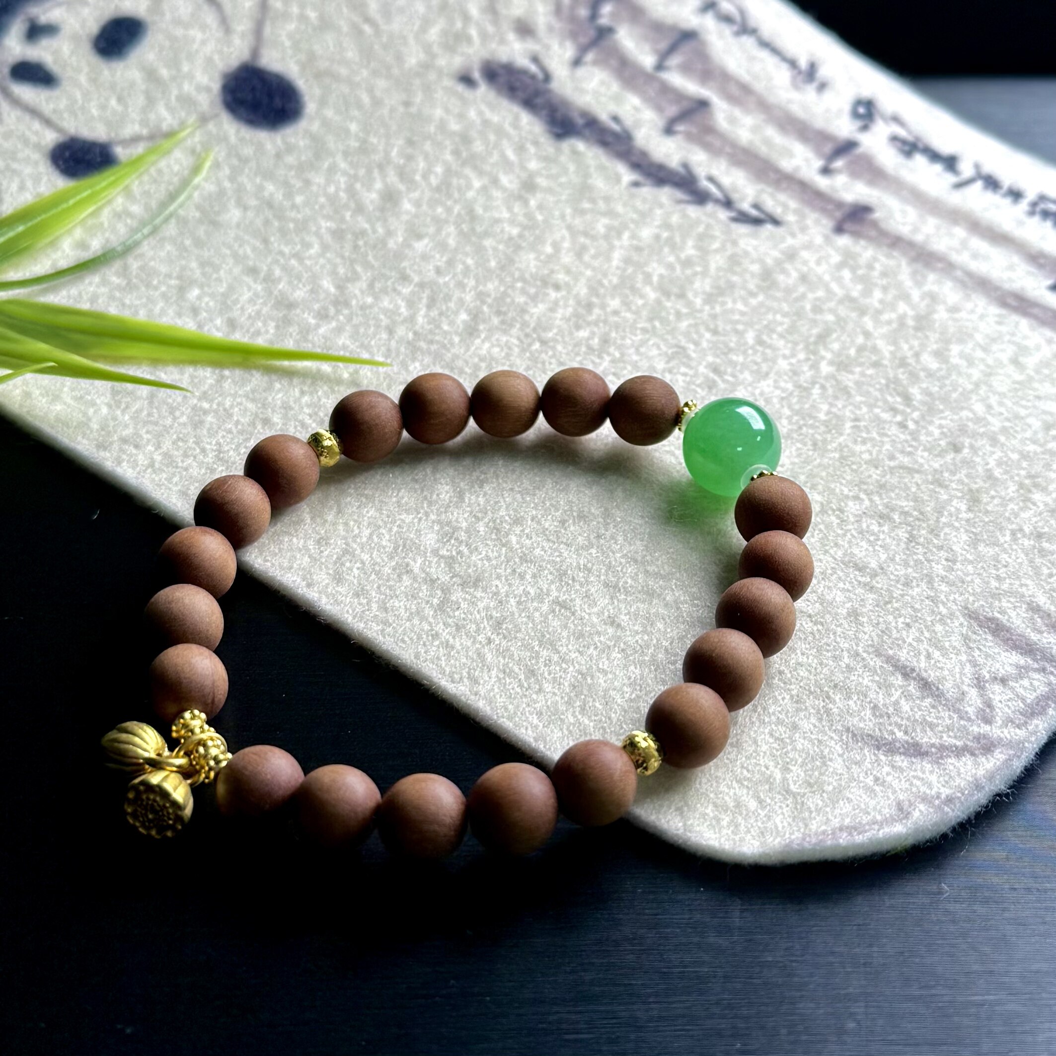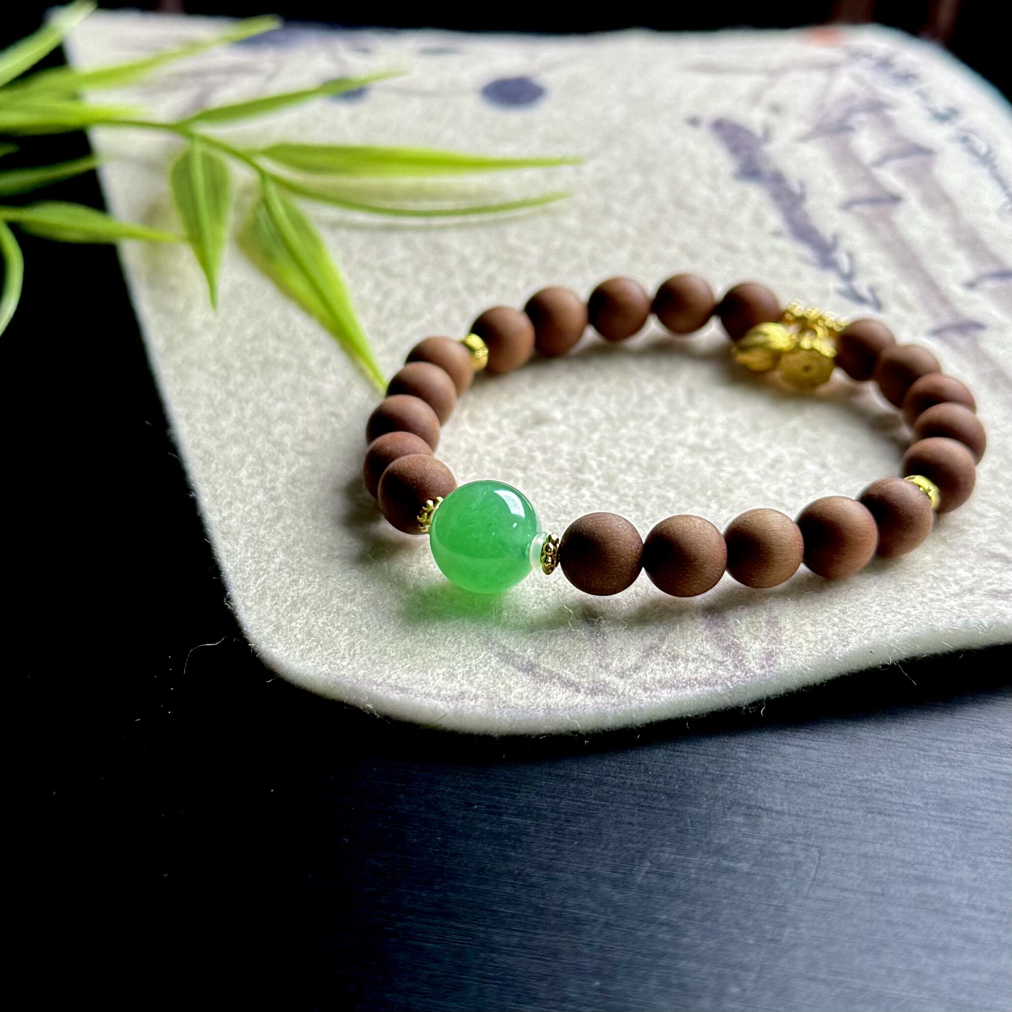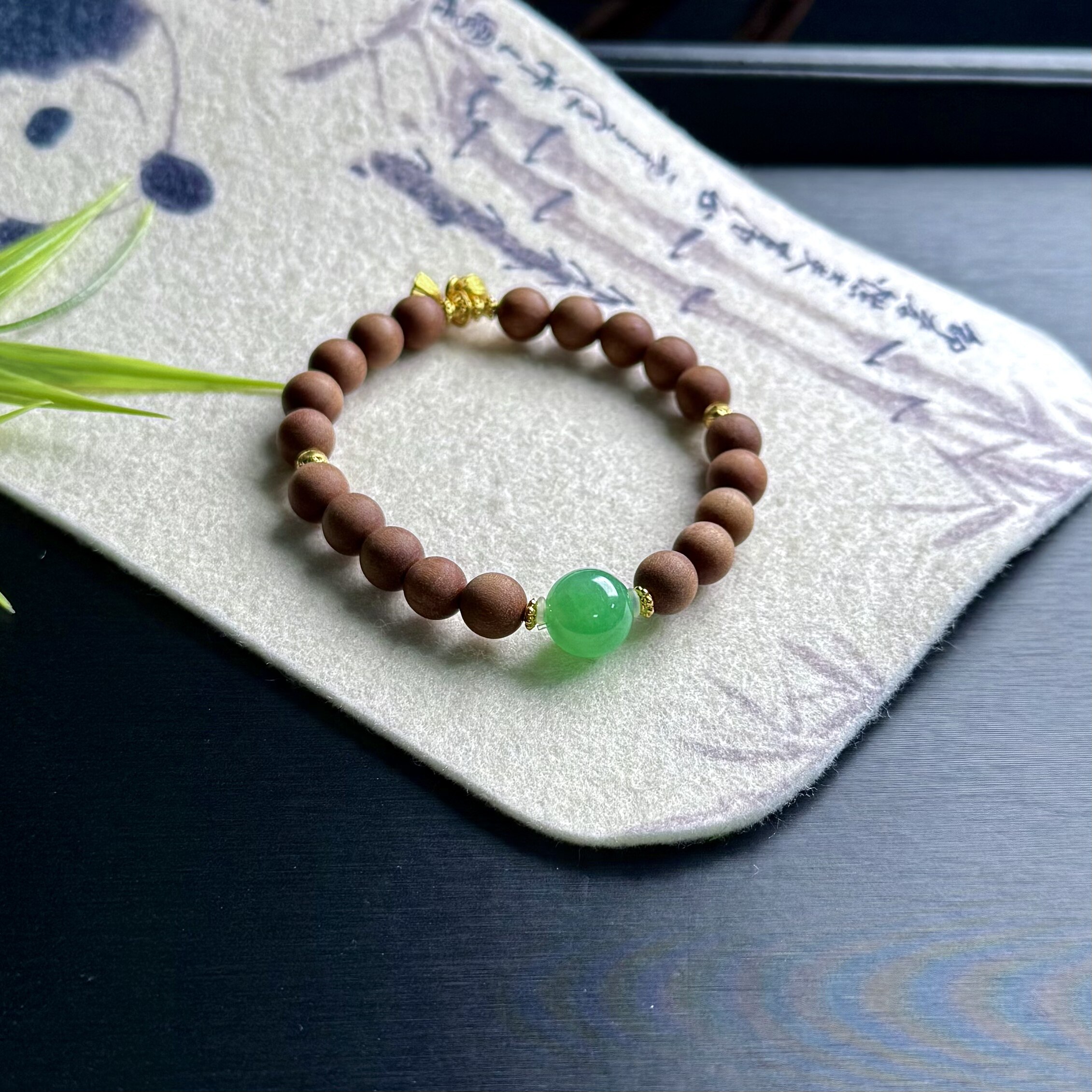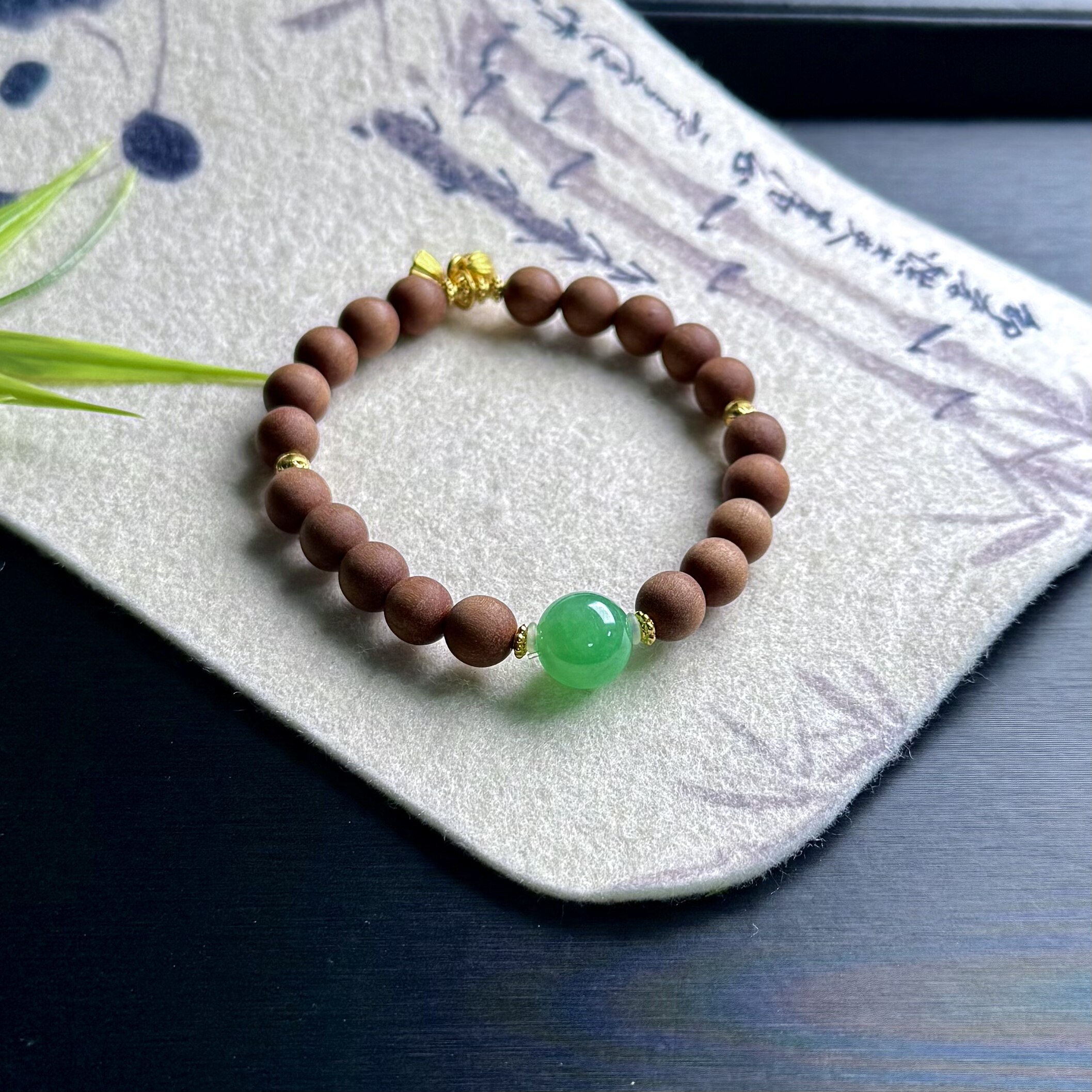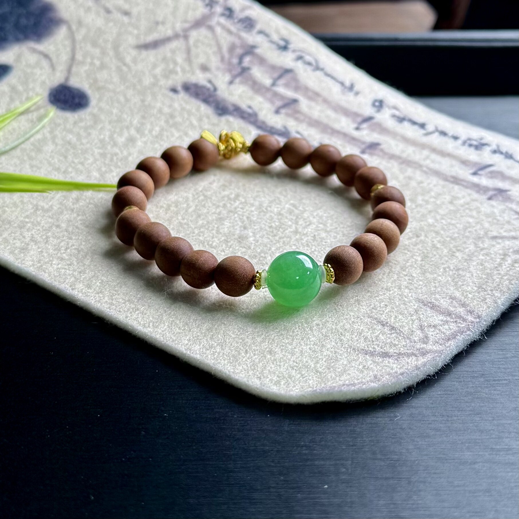 Qimei Jade Round Beads Burmese Natural Grade a Jade Ice Sun Green Pure Gold Wooden Bracelet
