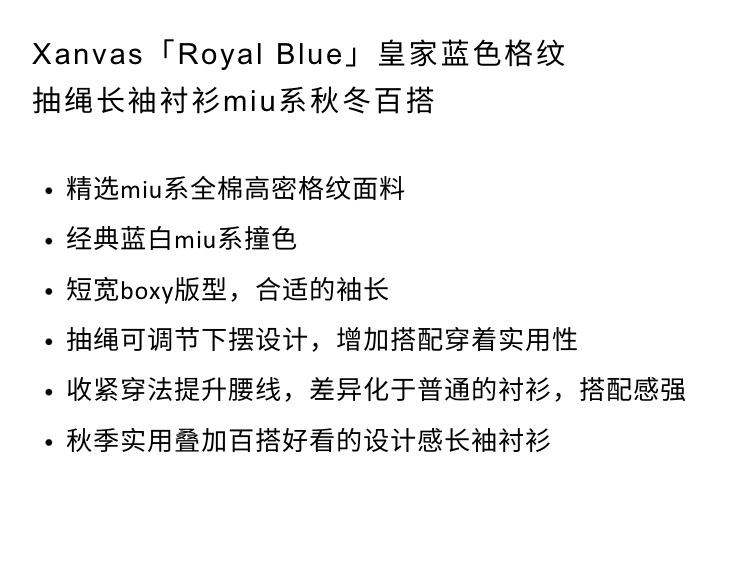 Xanvas [Original Authentic] Royal Blue Plaid Drawstring Long Sleeve Shirt Miu Series Autumn/Winter Versatile