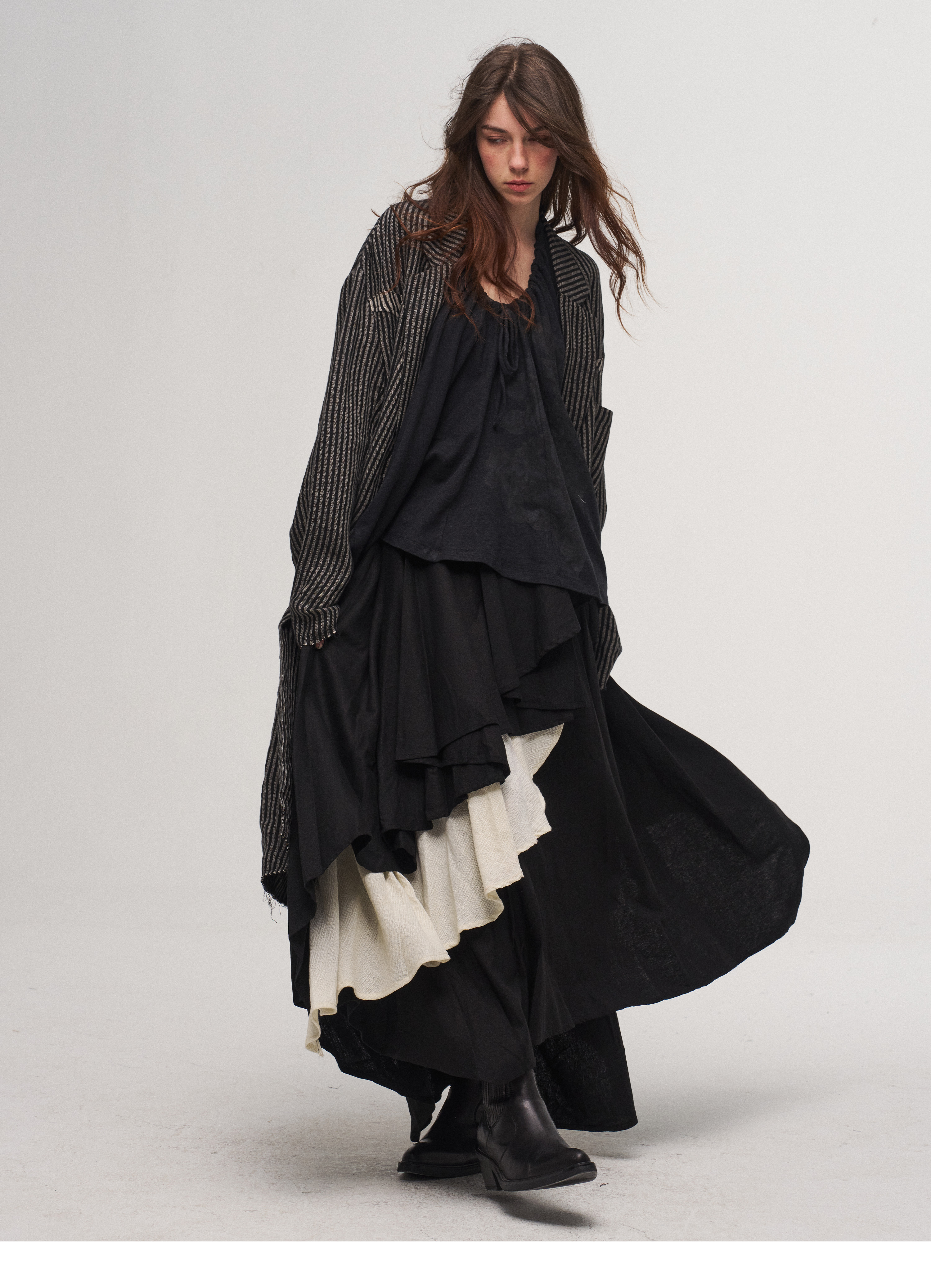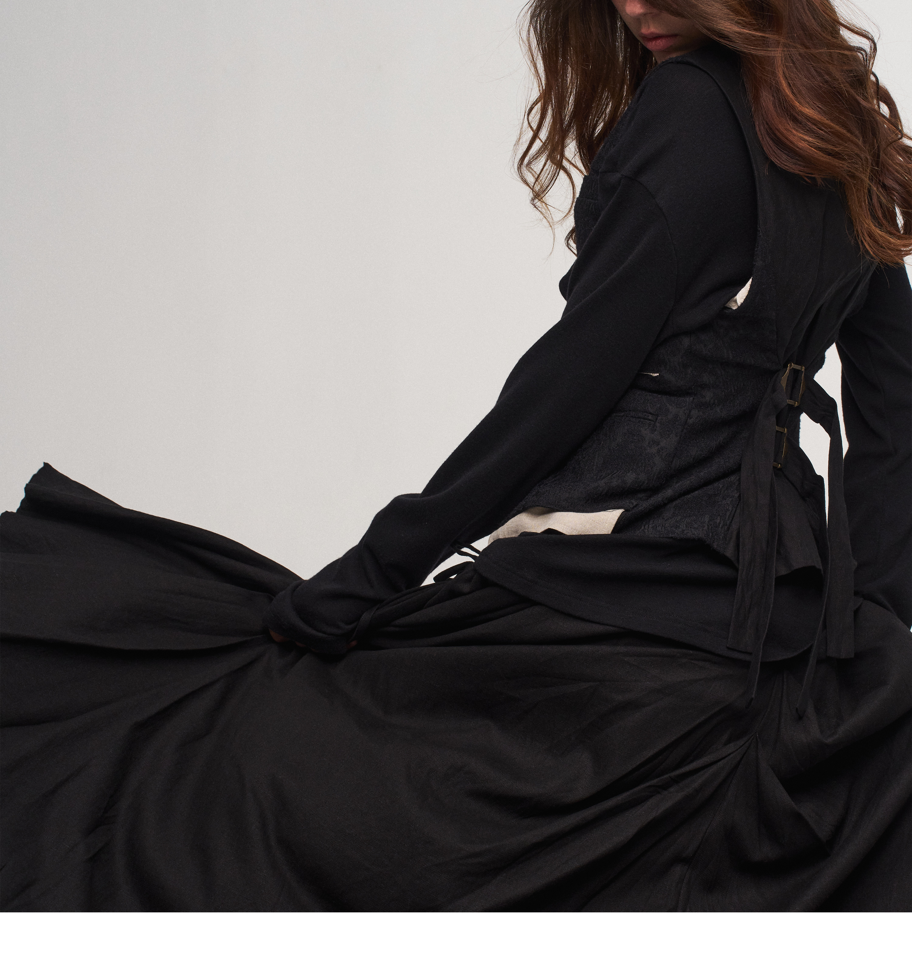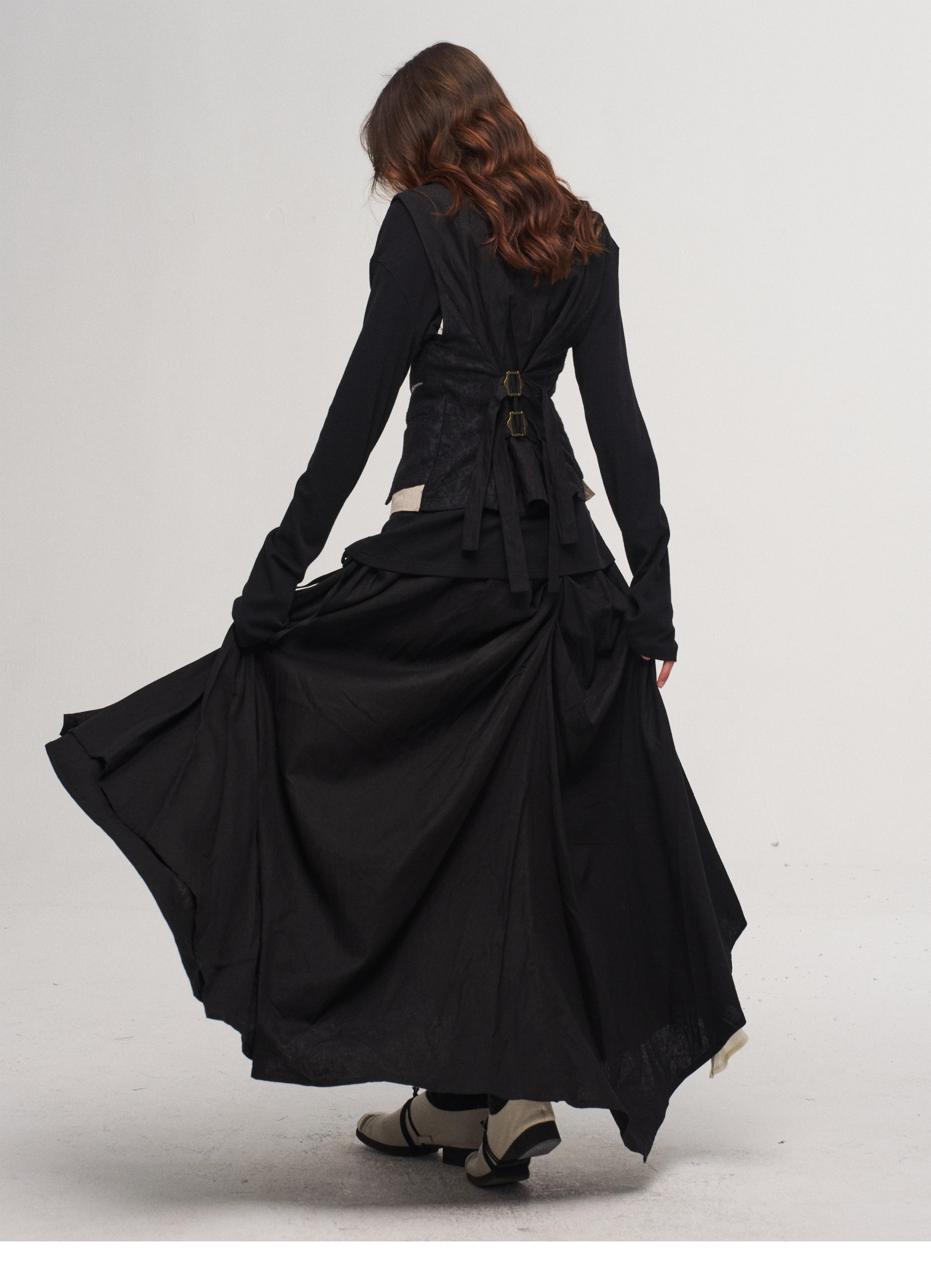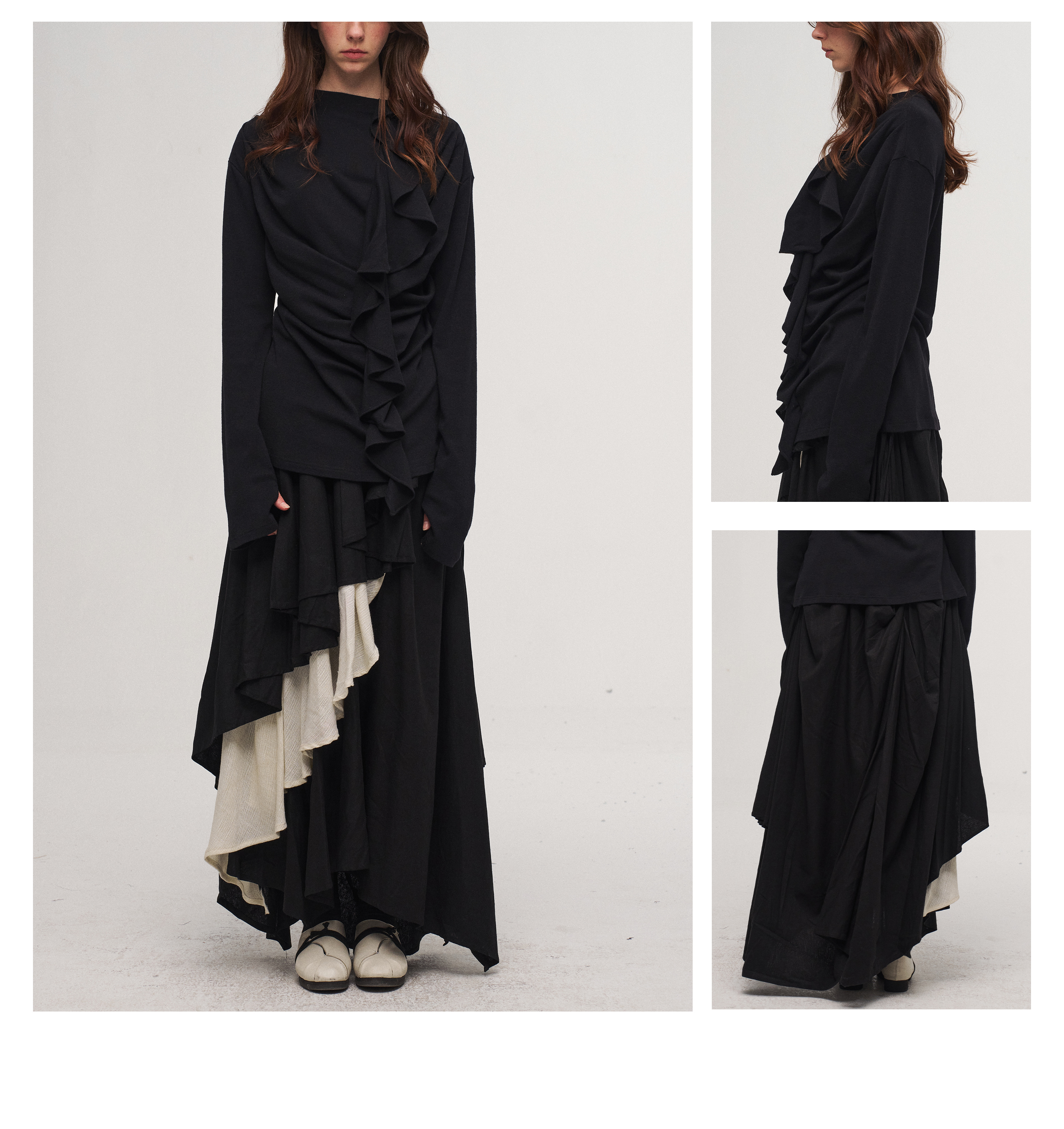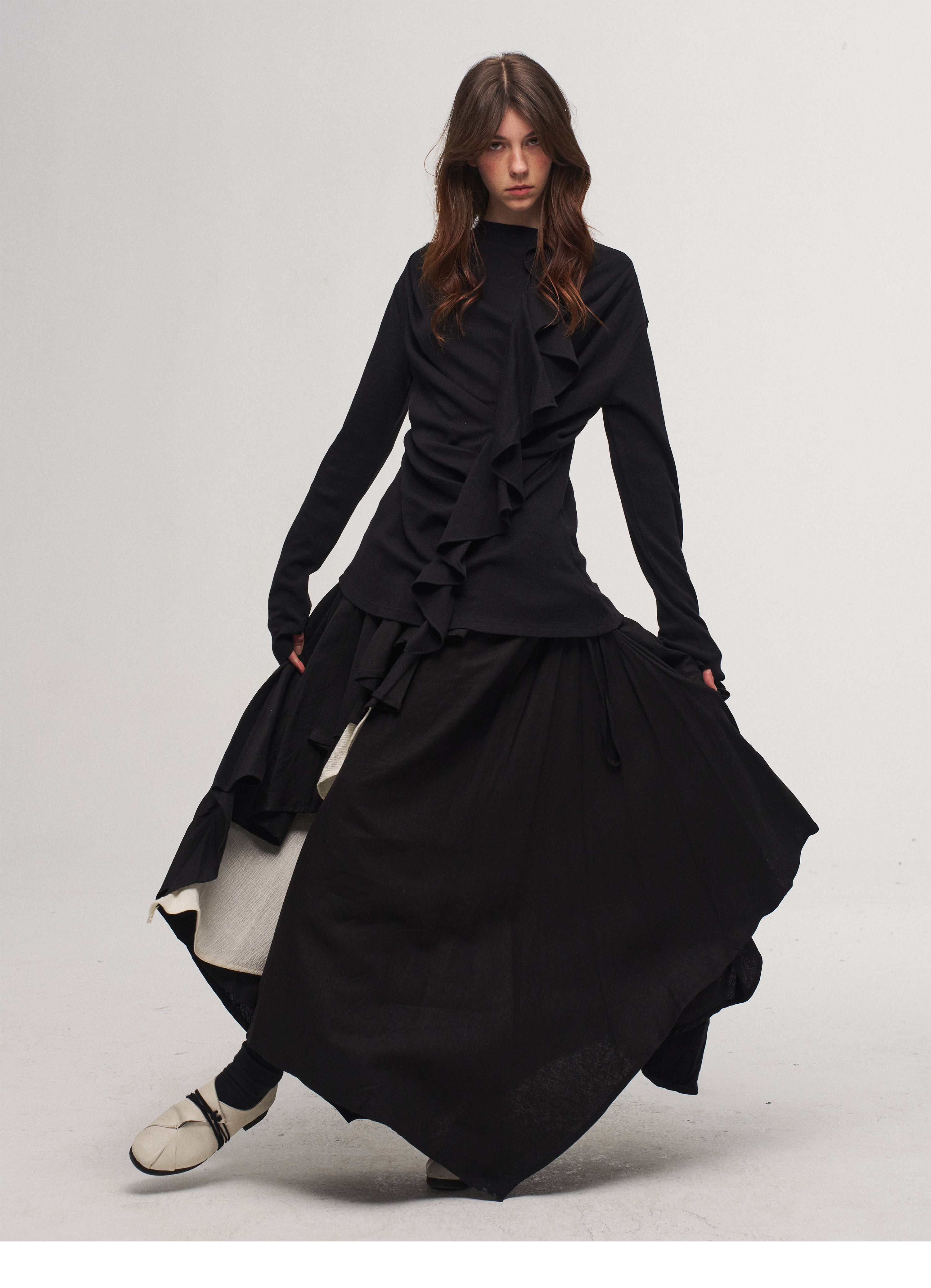 「凌雅Ilnya」差池_黑 千褶垂坠长裙 亚麻混纺重磅不规则裙