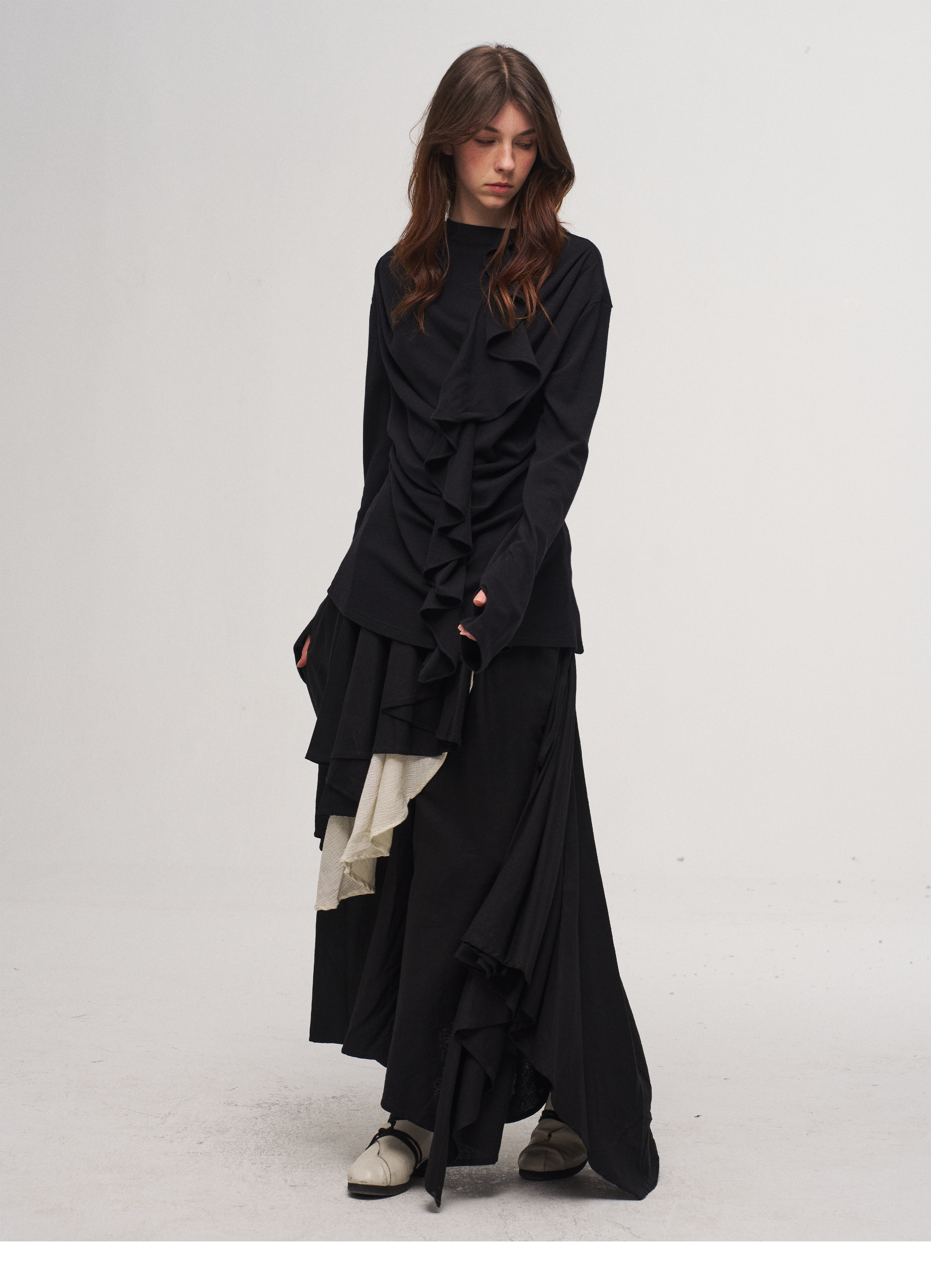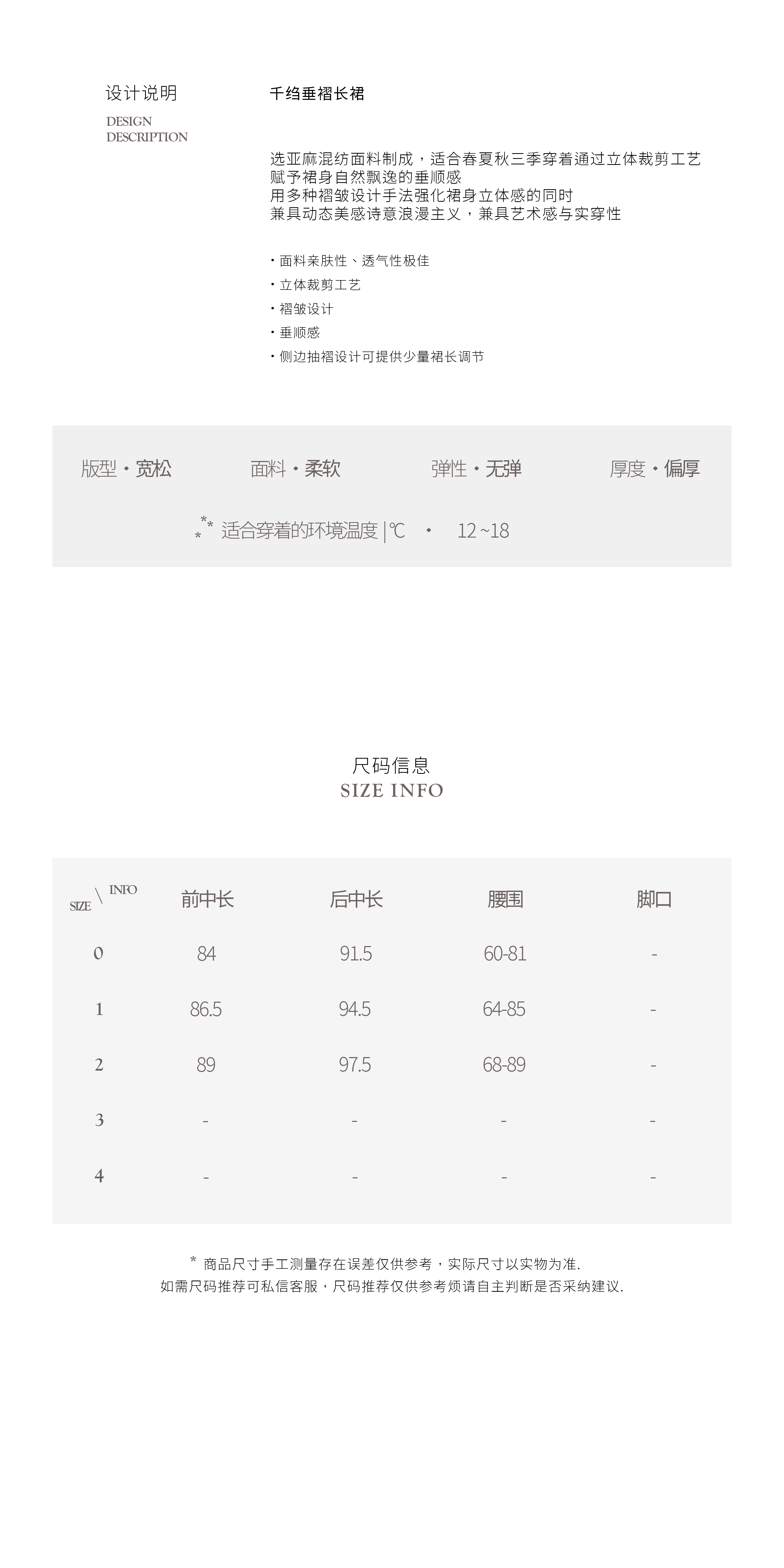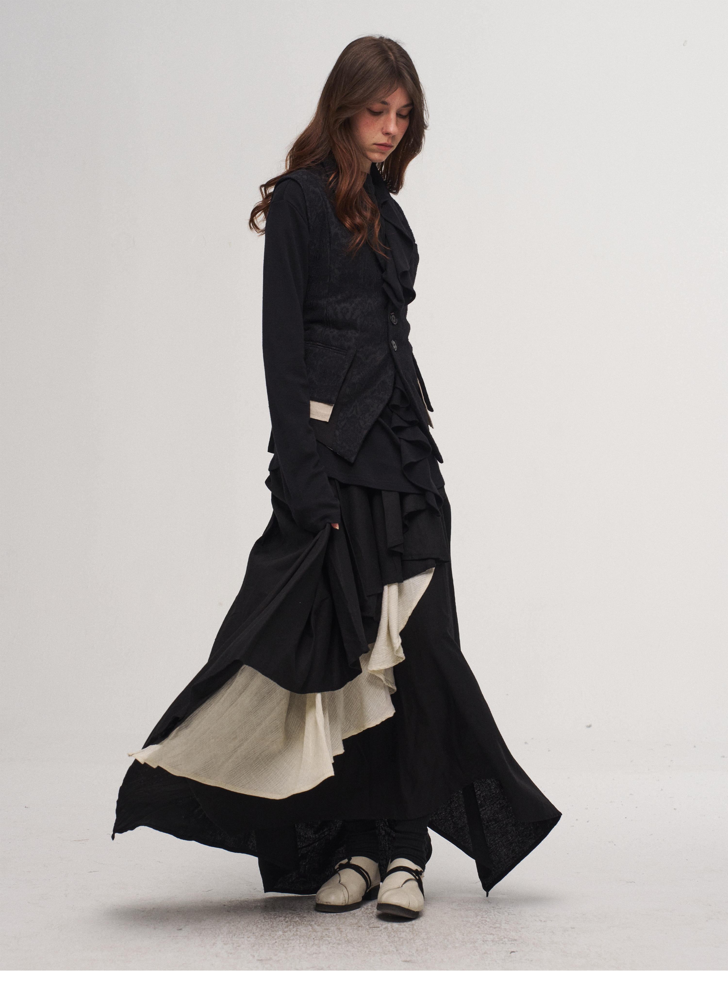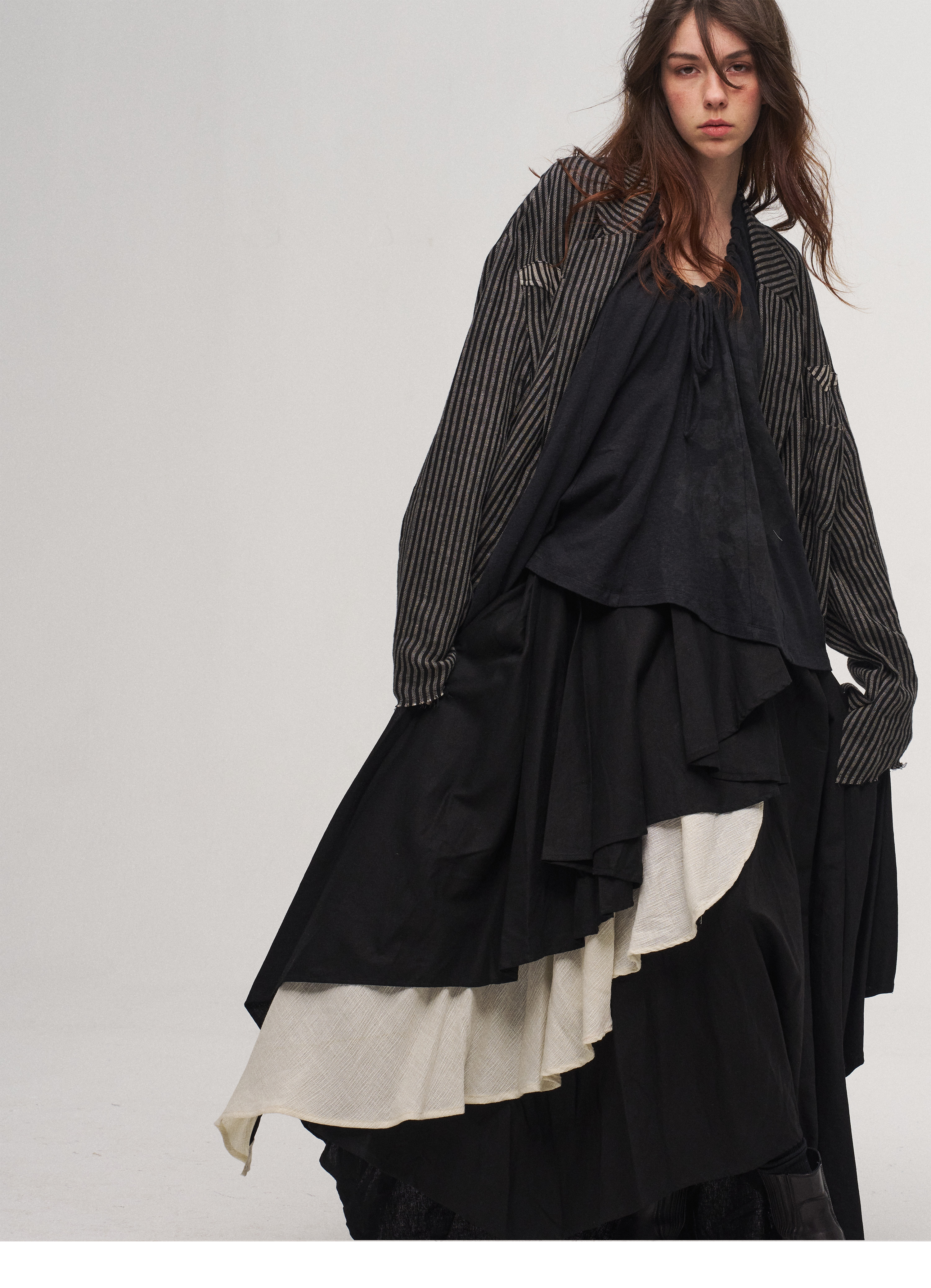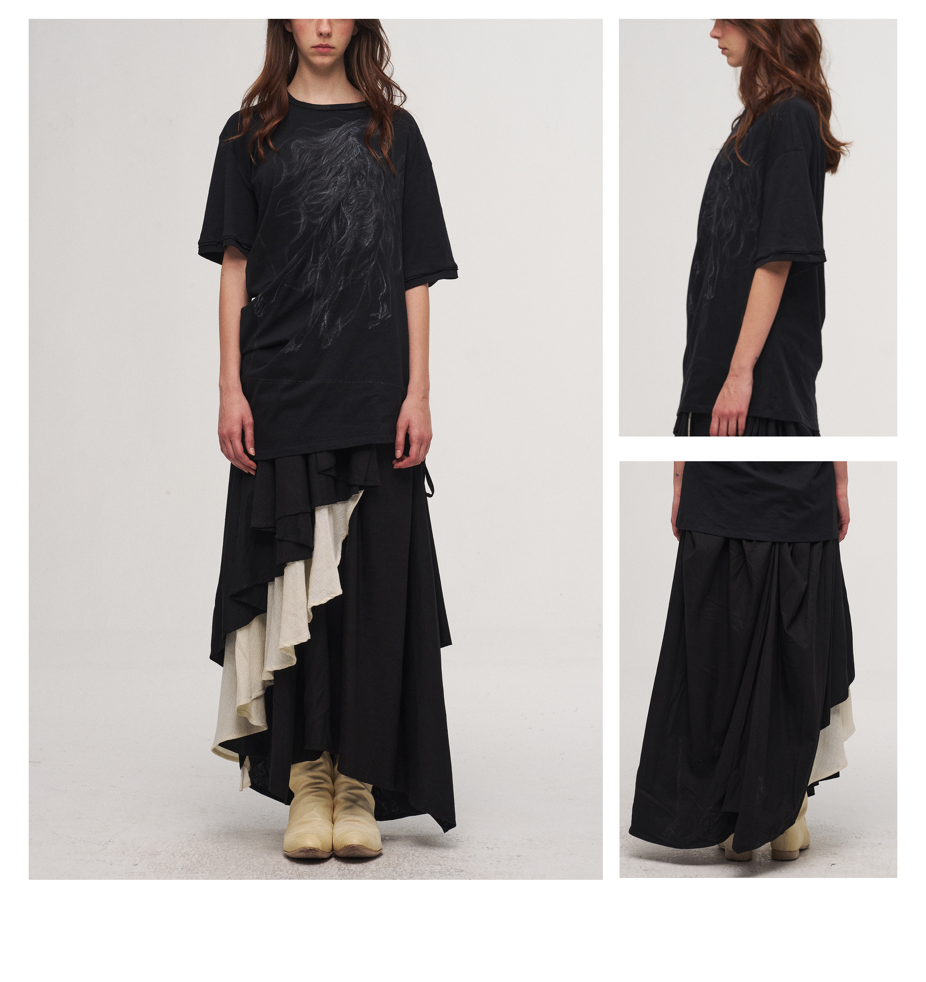 「凌雅Ilnya」差池_黑 千褶垂坠长裙 亚麻混纺重磅不规则裙