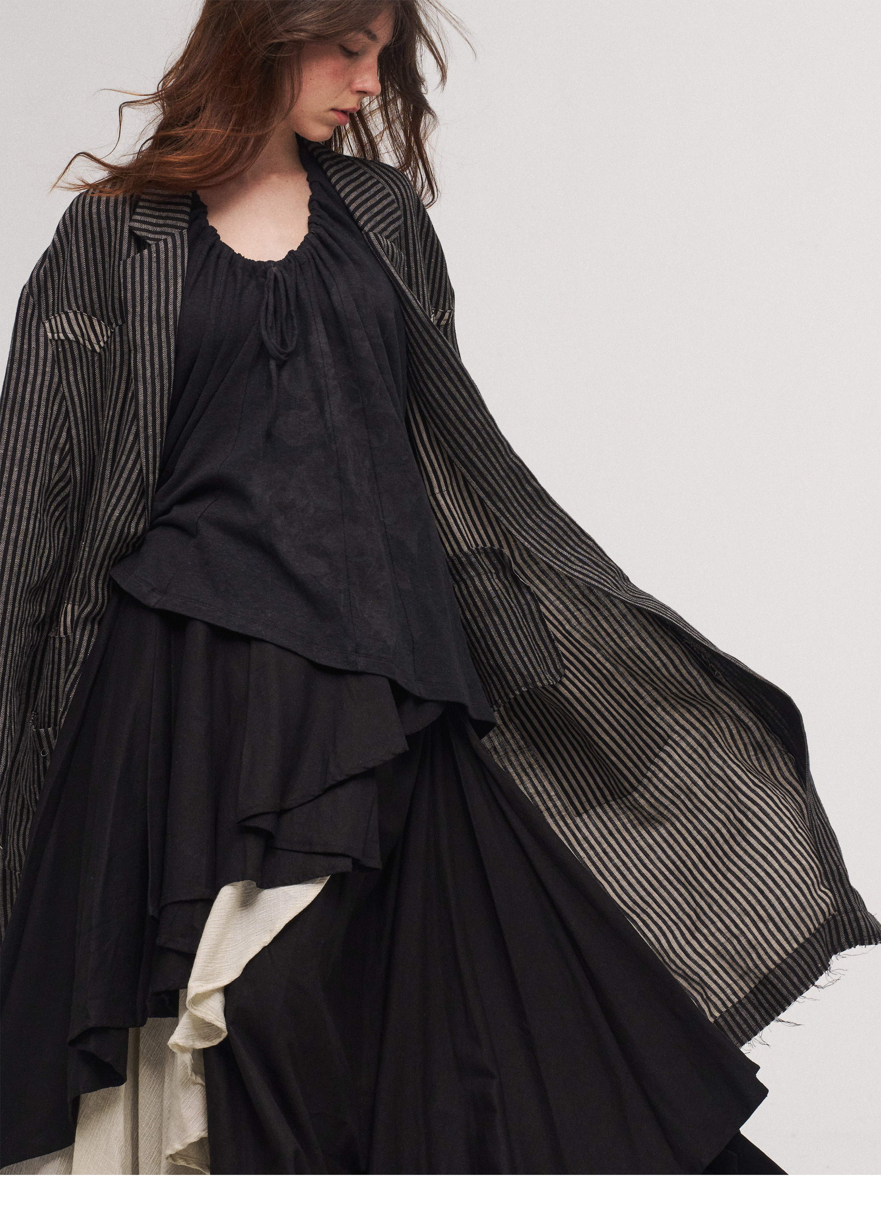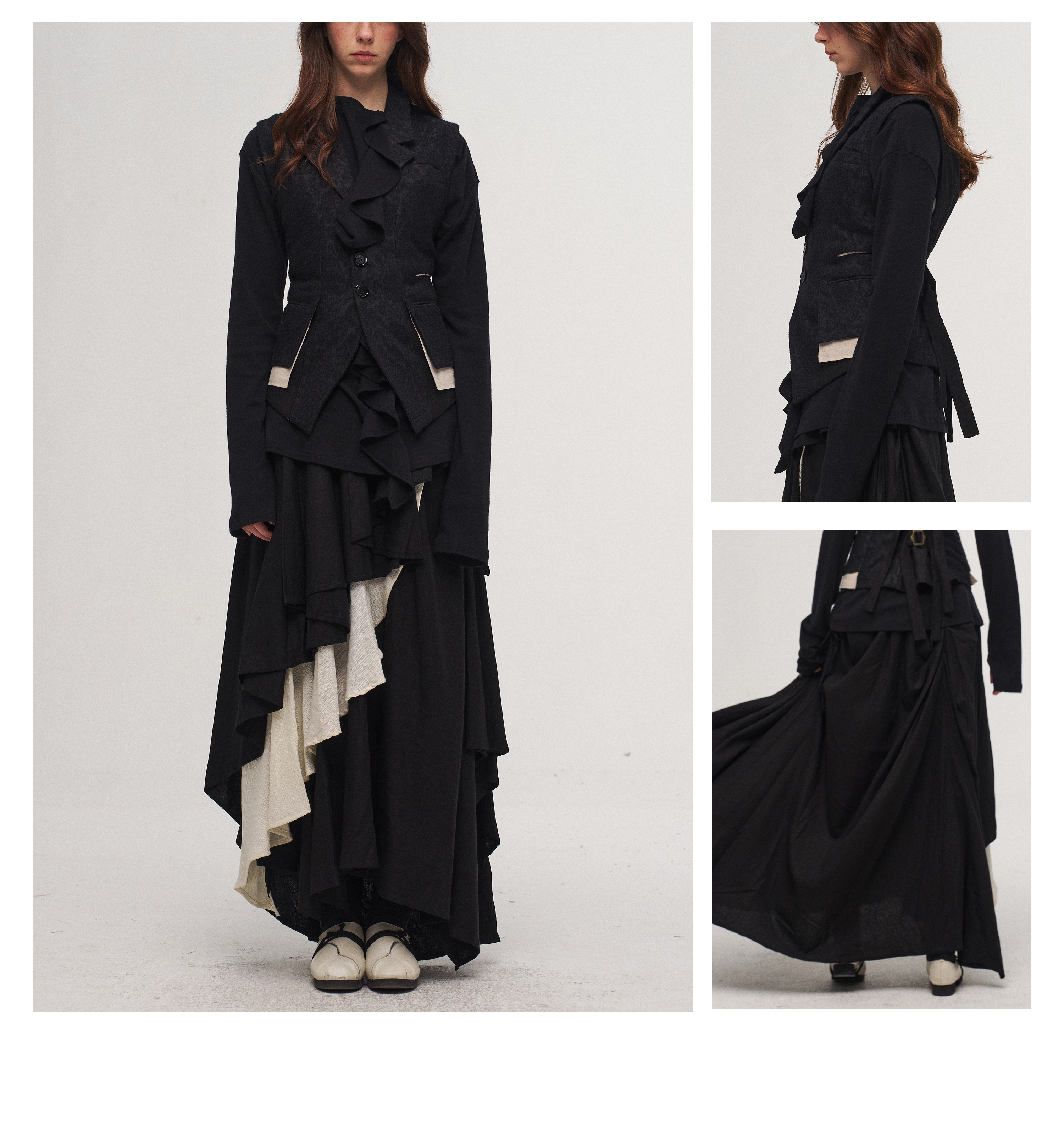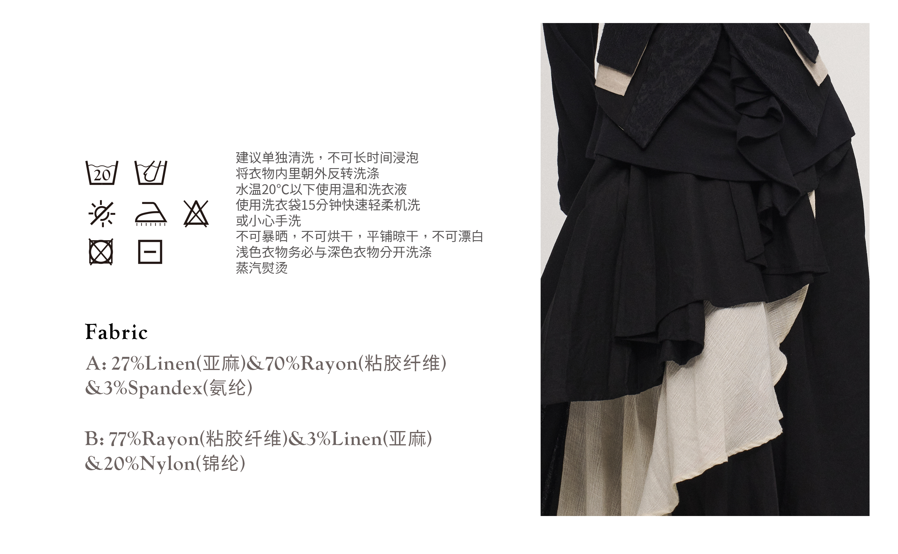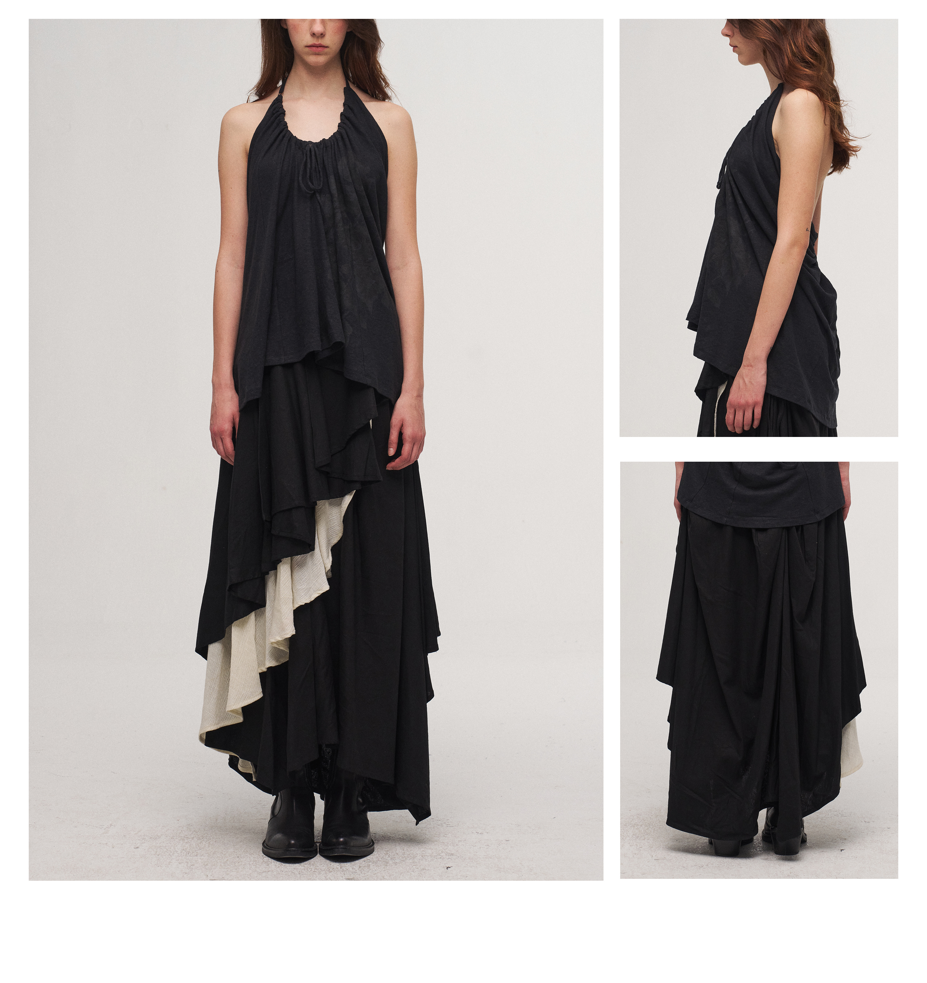 「凌雅Ilnya」差池_黑 千褶垂坠长裙 亚麻混纺重磅不规则裙