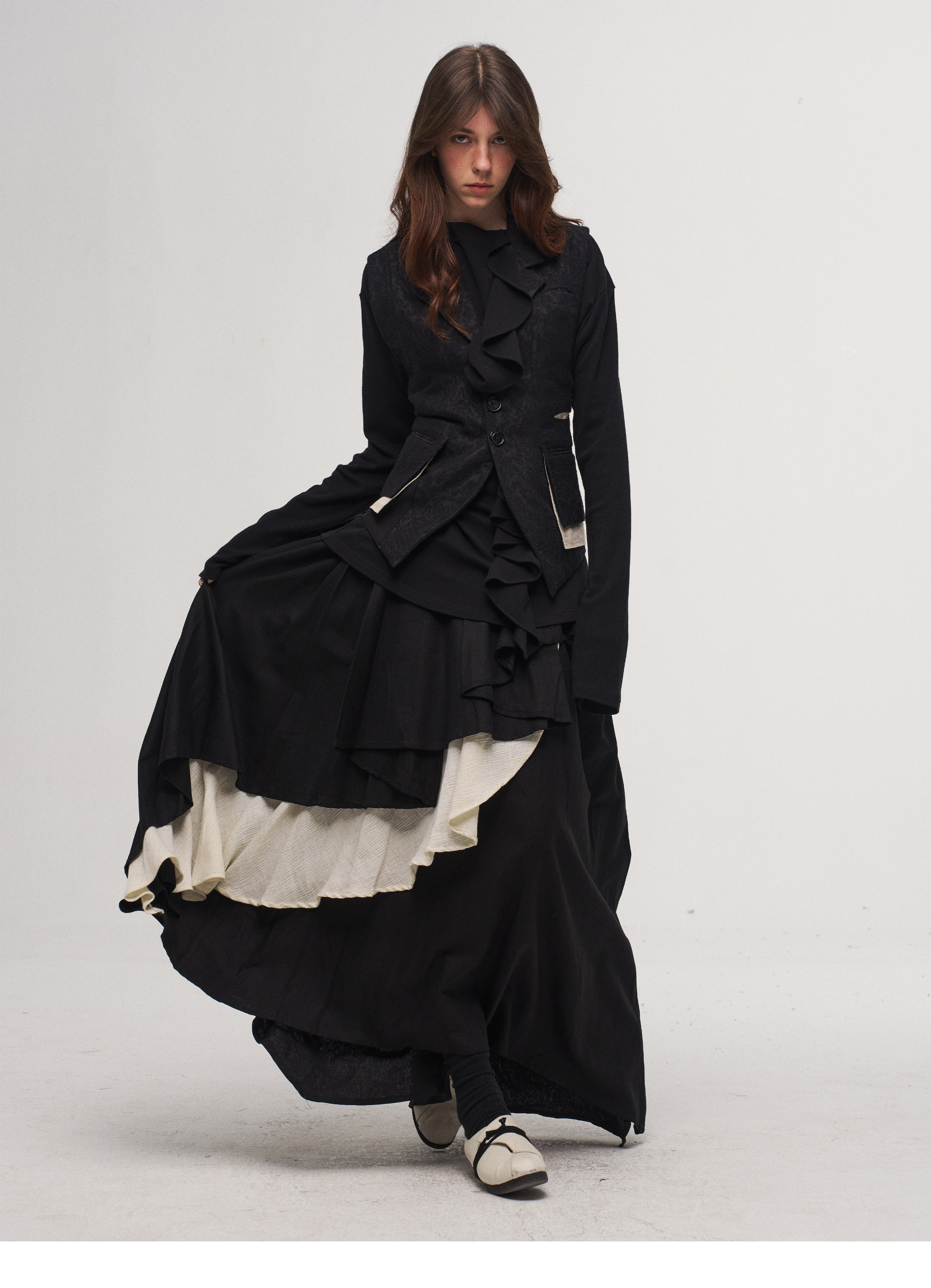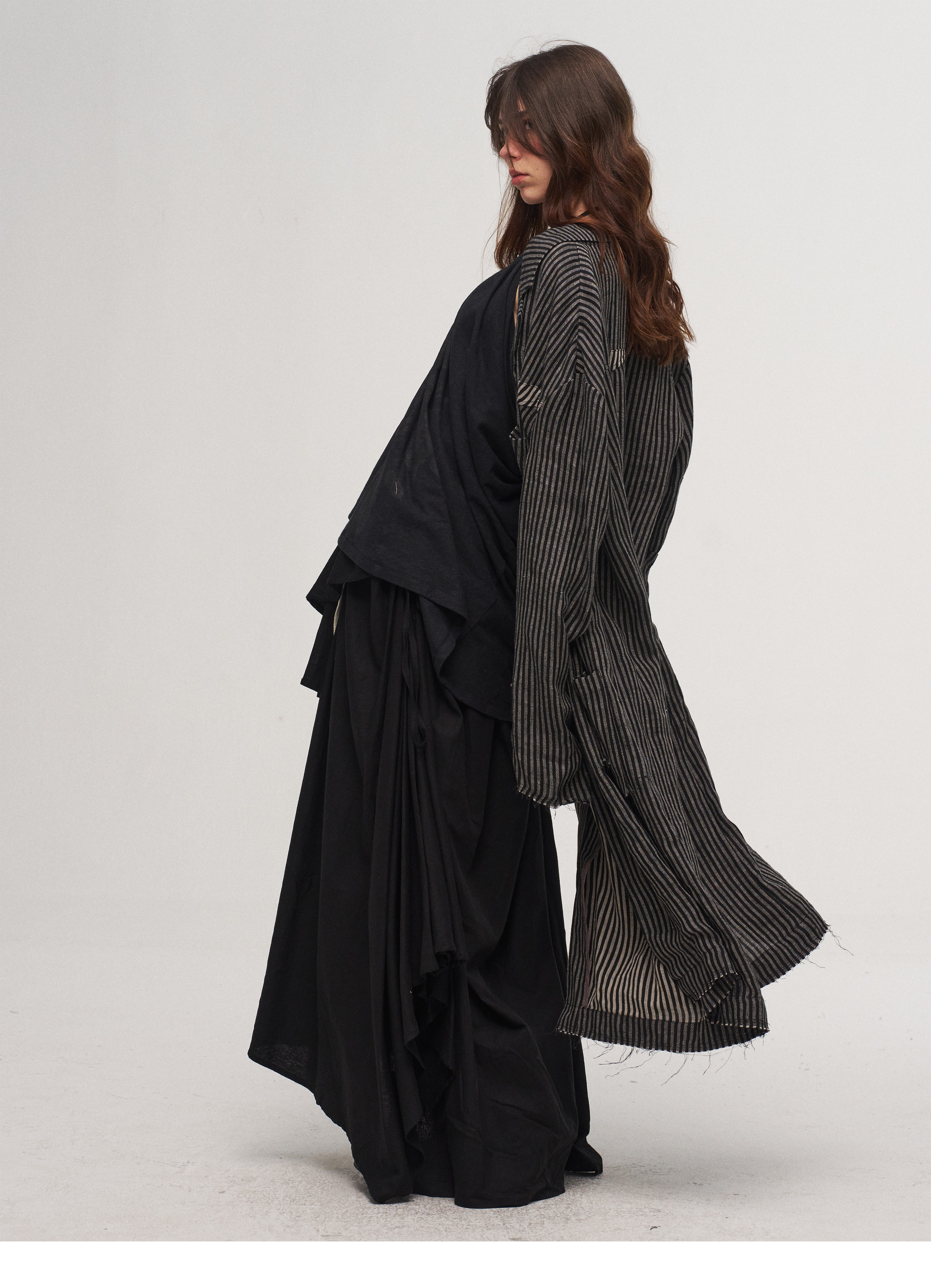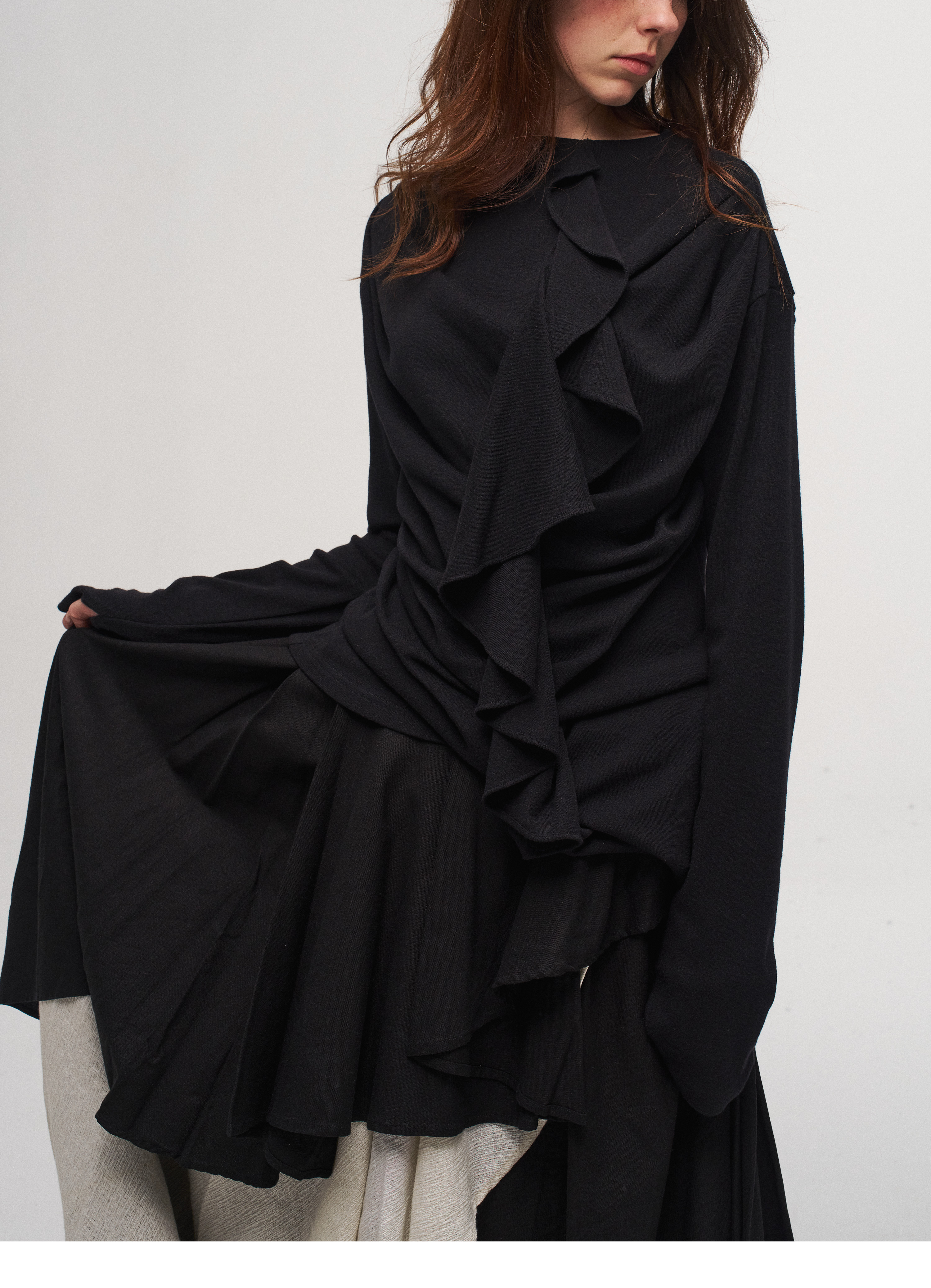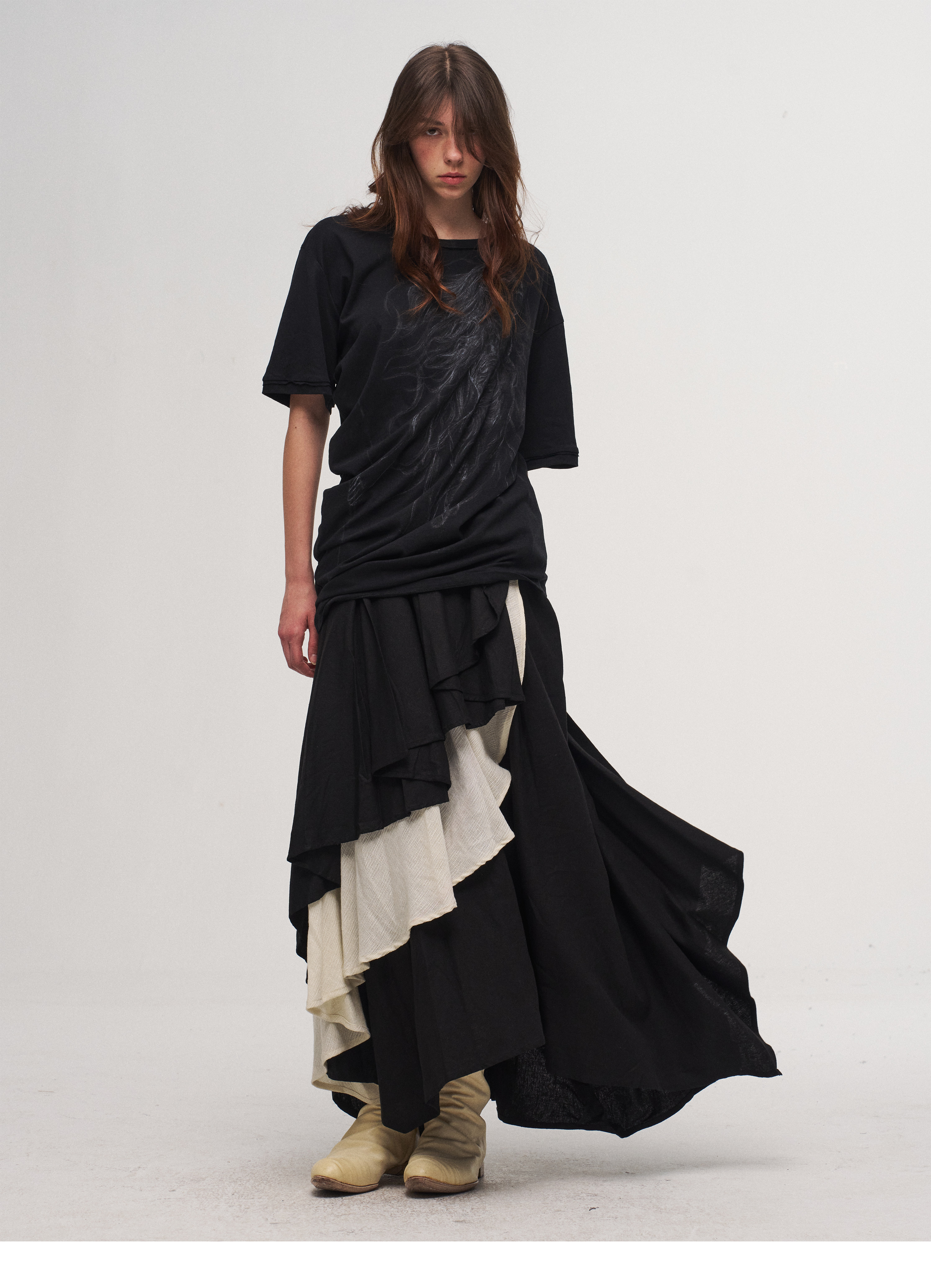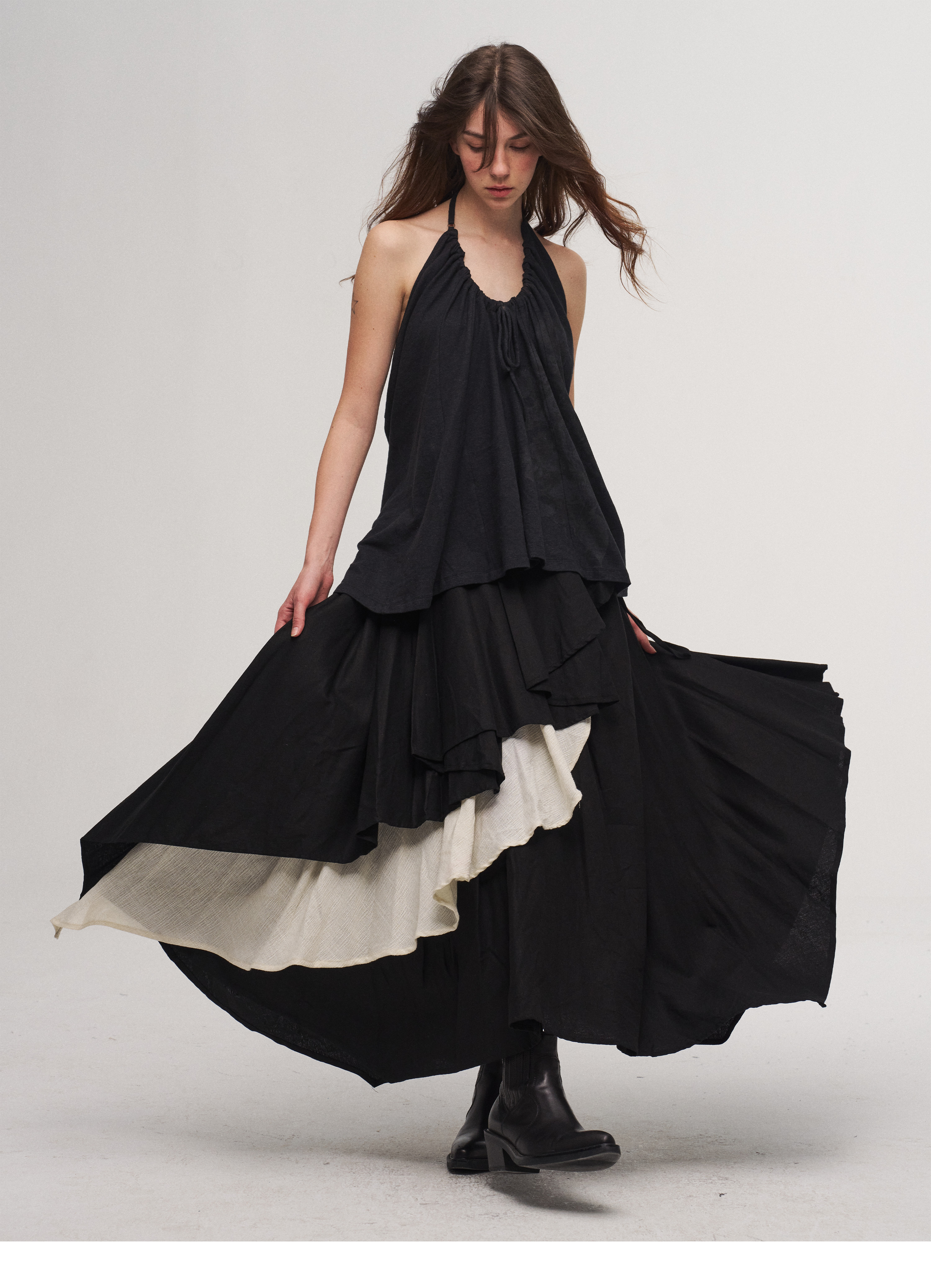 「凌雅Ilnya」差池_黑 千褶垂坠长裙 亚麻混纺重磅不规则裙