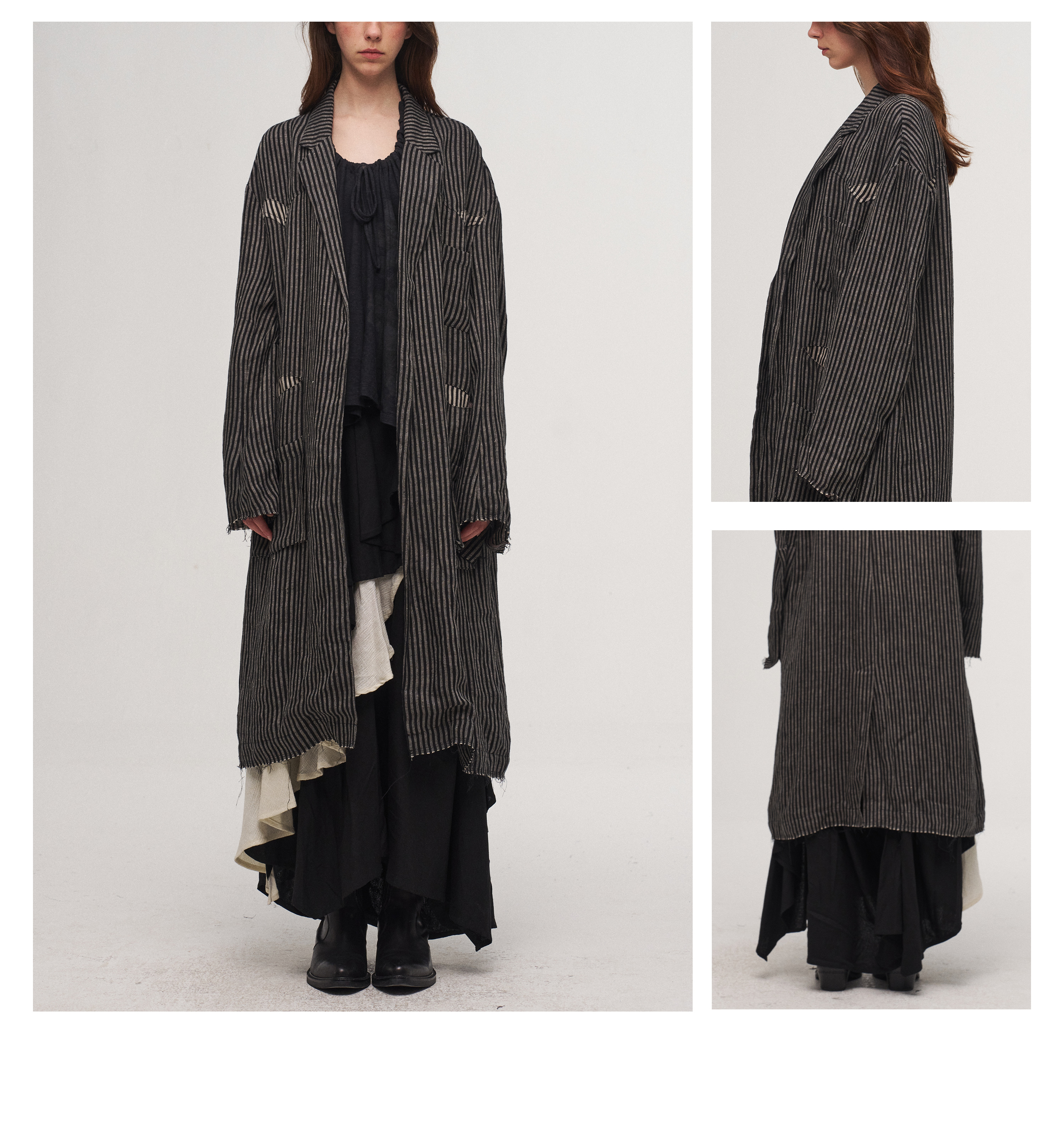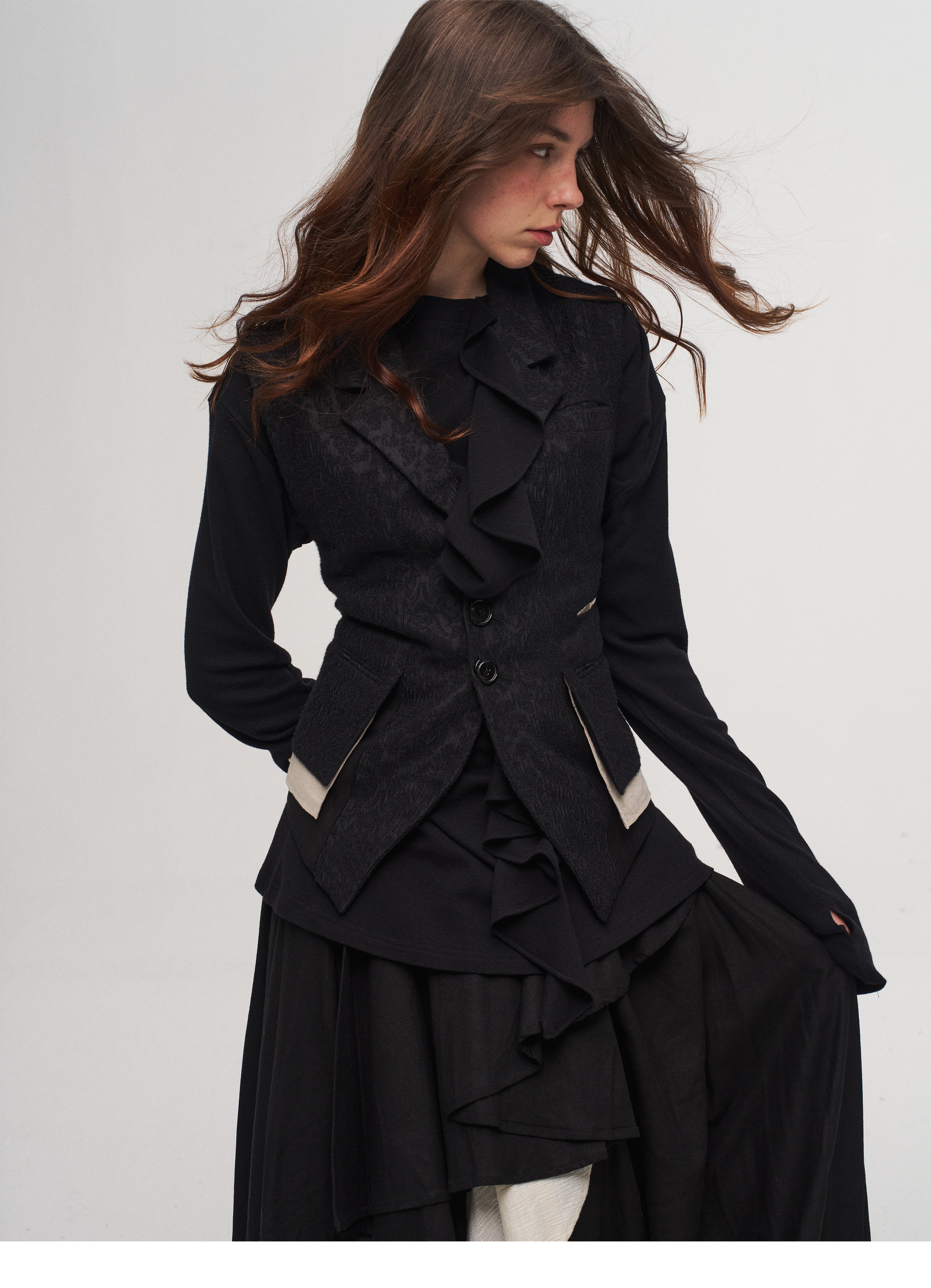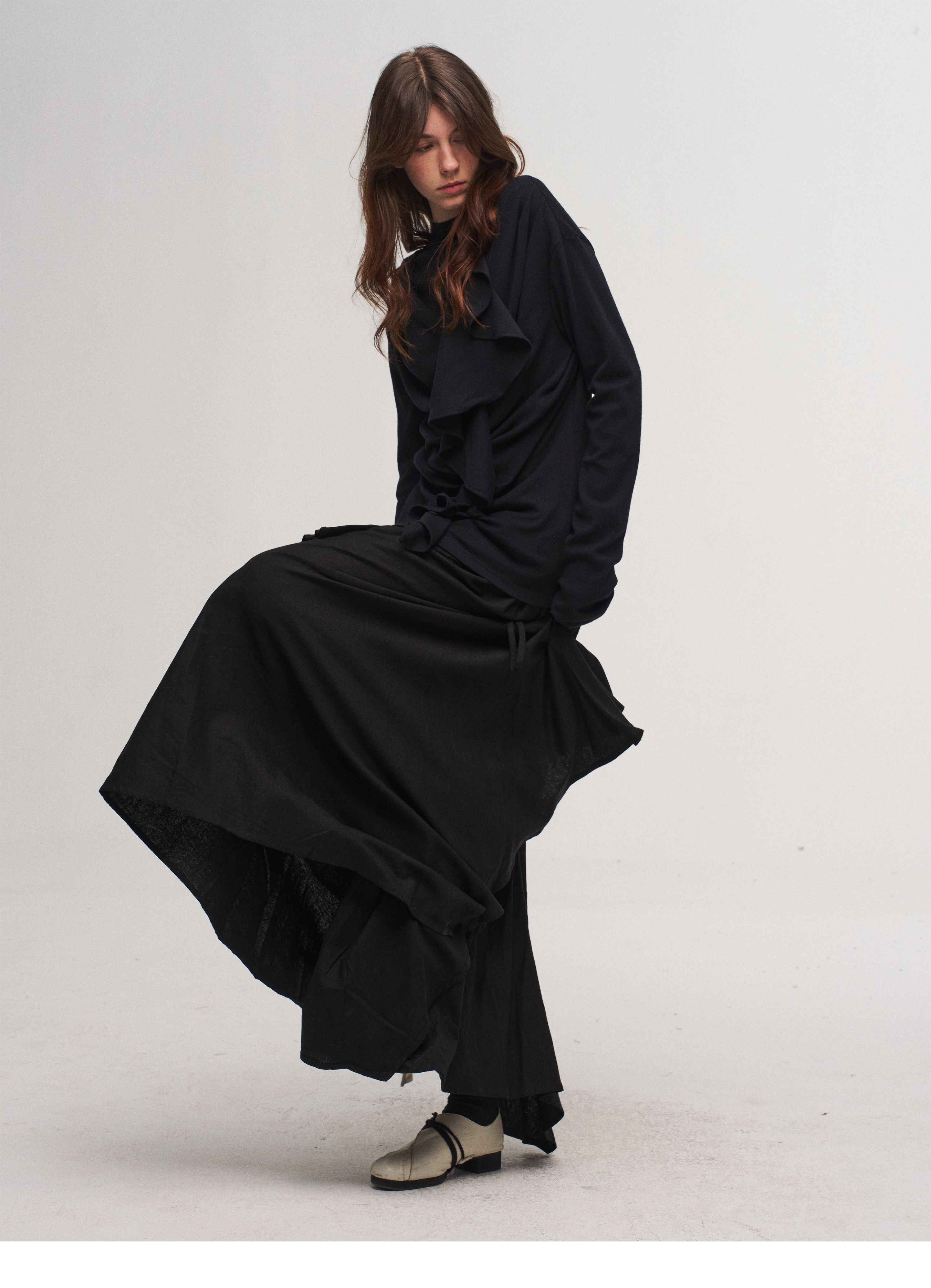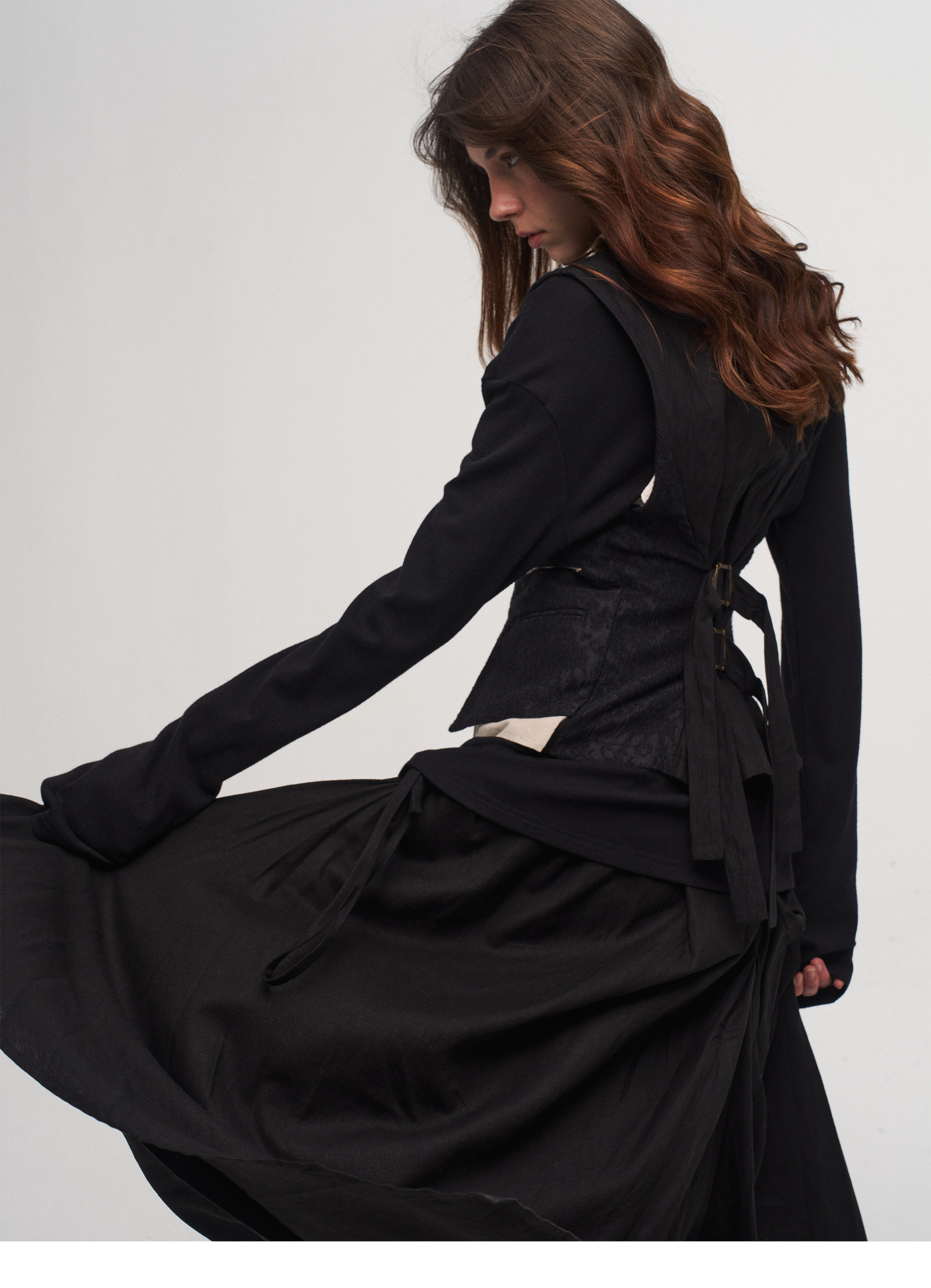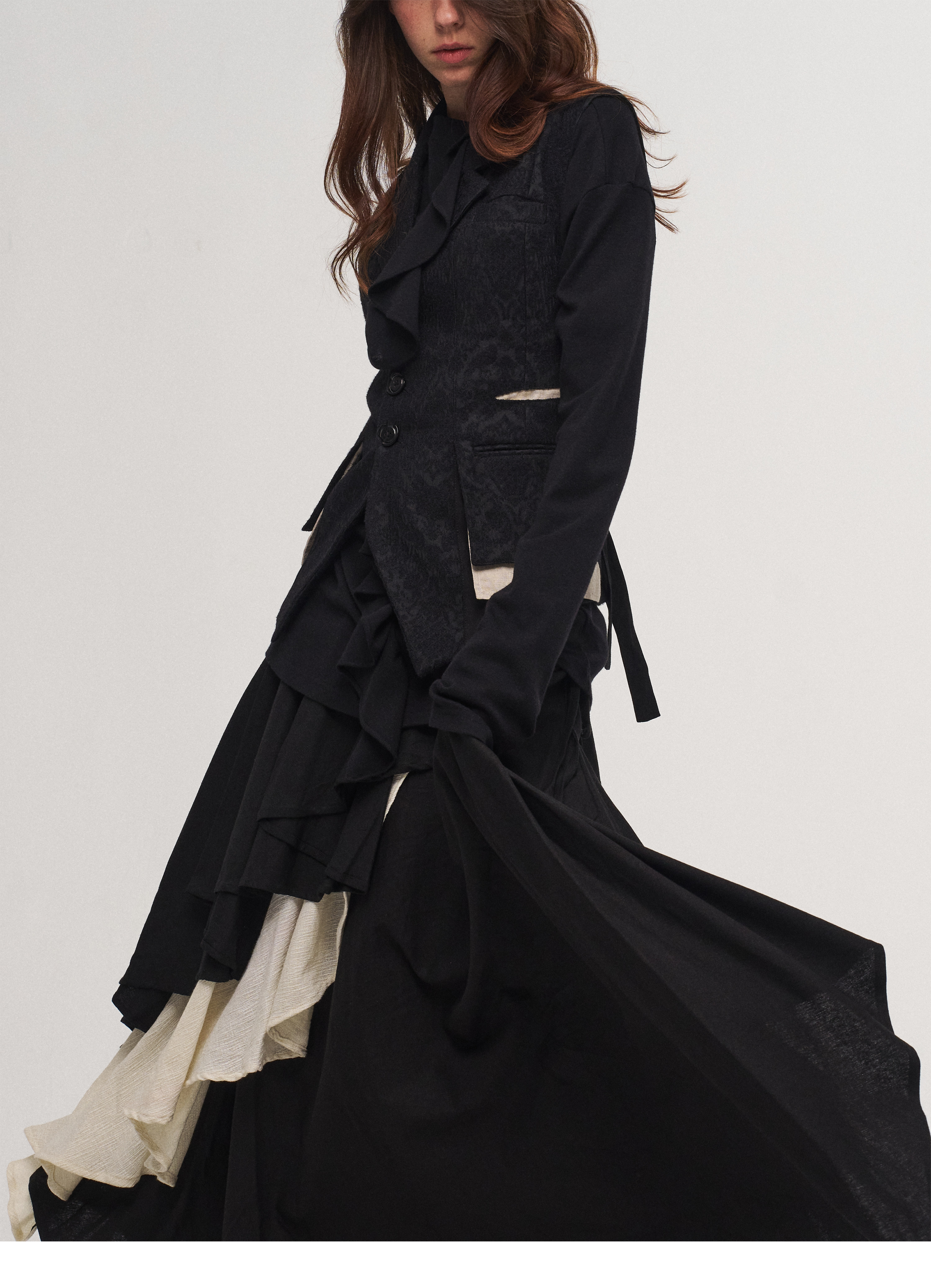 「凌雅Ilnya」差池_黑 千褶垂坠长裙 亚麻混纺重磅不规则裙